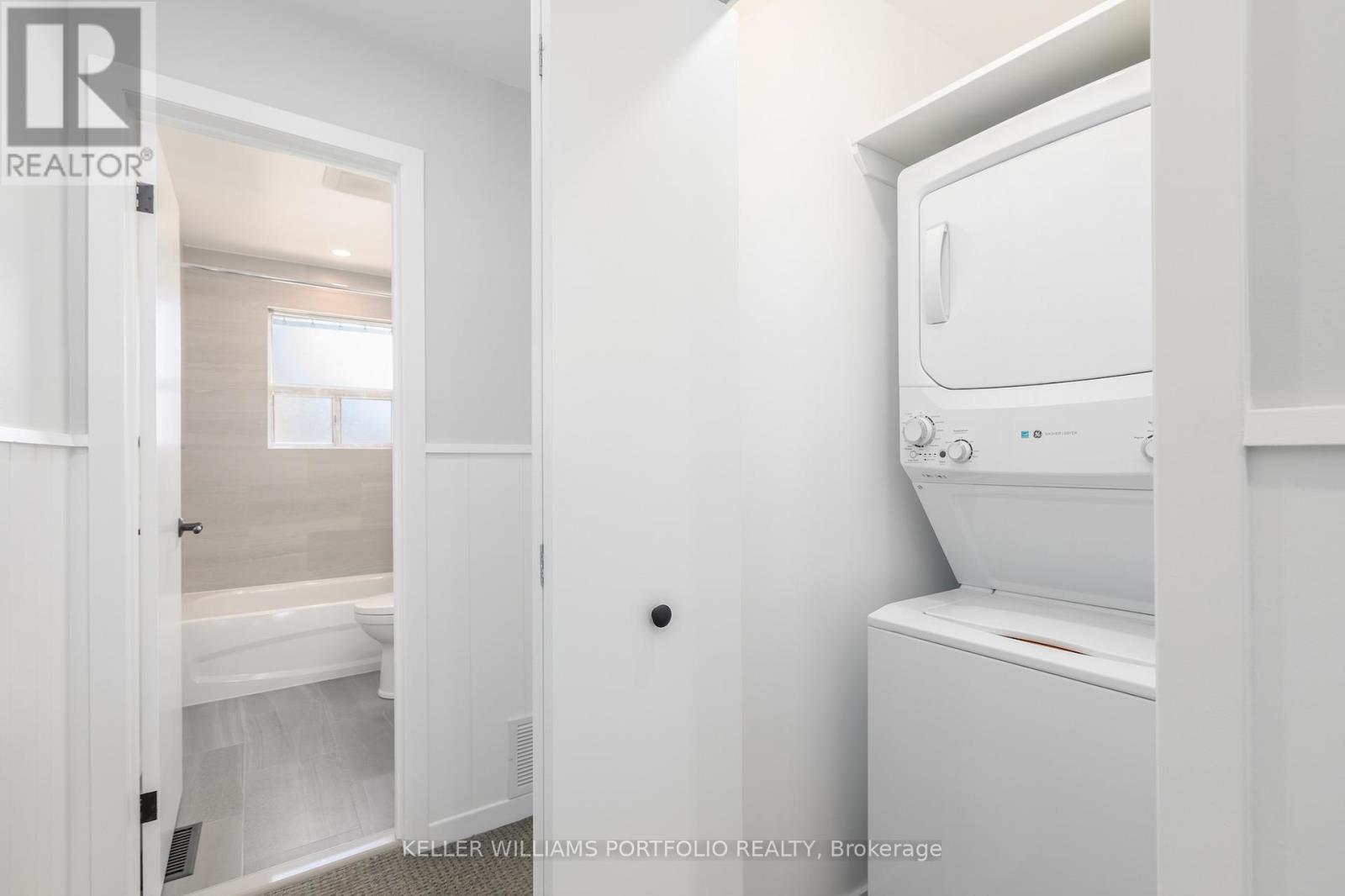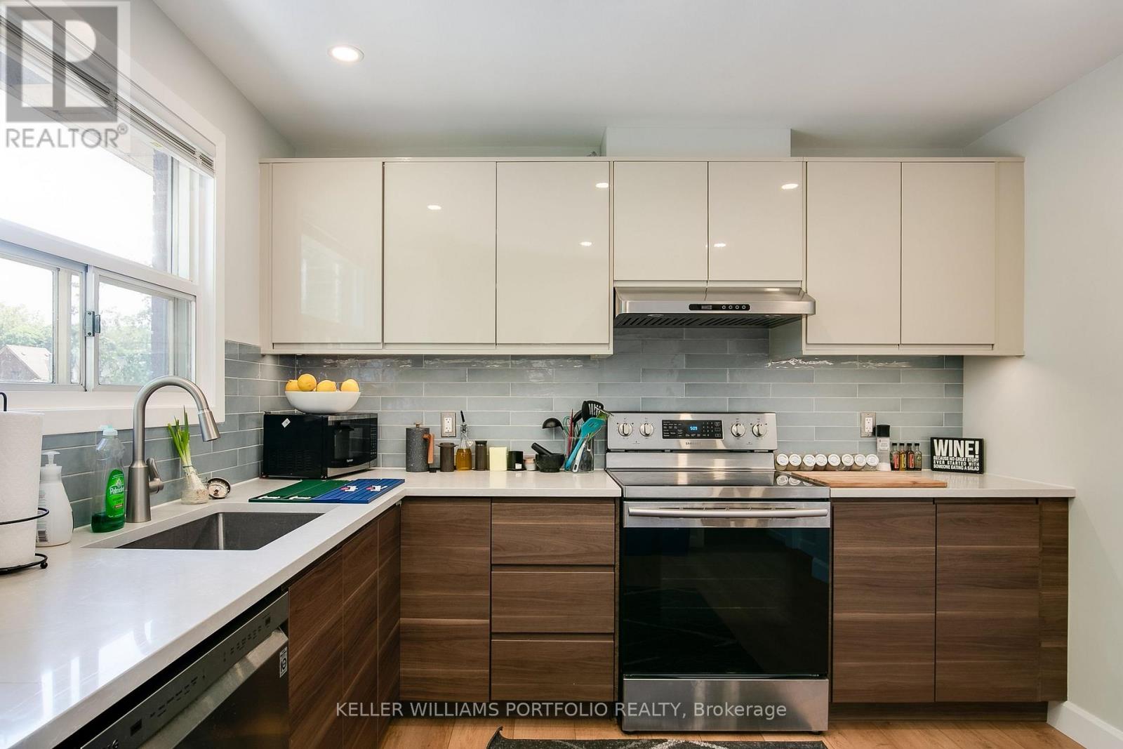 Sunny, spacious, and beautifully renovated, this top-floor 2-bedroom apartment offers ~970 sq ft of thoughtfully designed living in one of Toronto's most vibrant west-end neighbourhoods. With windows on the south, east, and west exposures, the space is filled with natural light throughout the day, creating a warm and inviting atmosphere that truly feels like home. The 2022 renovation was completed with care and quality in mind, featuring a stylish eat-in kitchen with quartz countertops, full-size stainless steel appliances (including dishwasher), and excellent storage. The bright living room opens onto a private west-facing balcony overlooking green space-perfect for unwinding at the end of the day. Two well-proportioned bedrooms with generous closets, a fully updated 4-piece bathroom, and a full-size ensuite washer/dryer add to the home's comfort and convenience. Tucked away on a quiet residential street just north of Queen, you're steps to the best of Roncesvalles, Parkdale, and West Queen West-cafés, restaurants, local grocers, parks, and transit all within easy reach. A rare opportunity to live in a well-maintained, peaceful home within a friendly and respectful community. (id:50787)