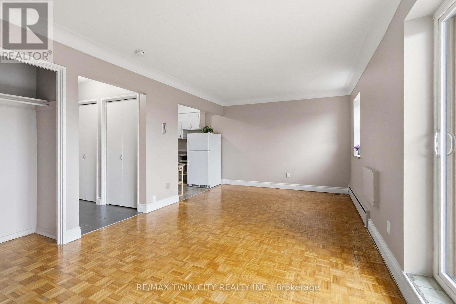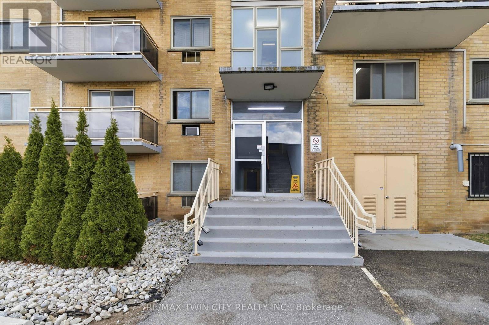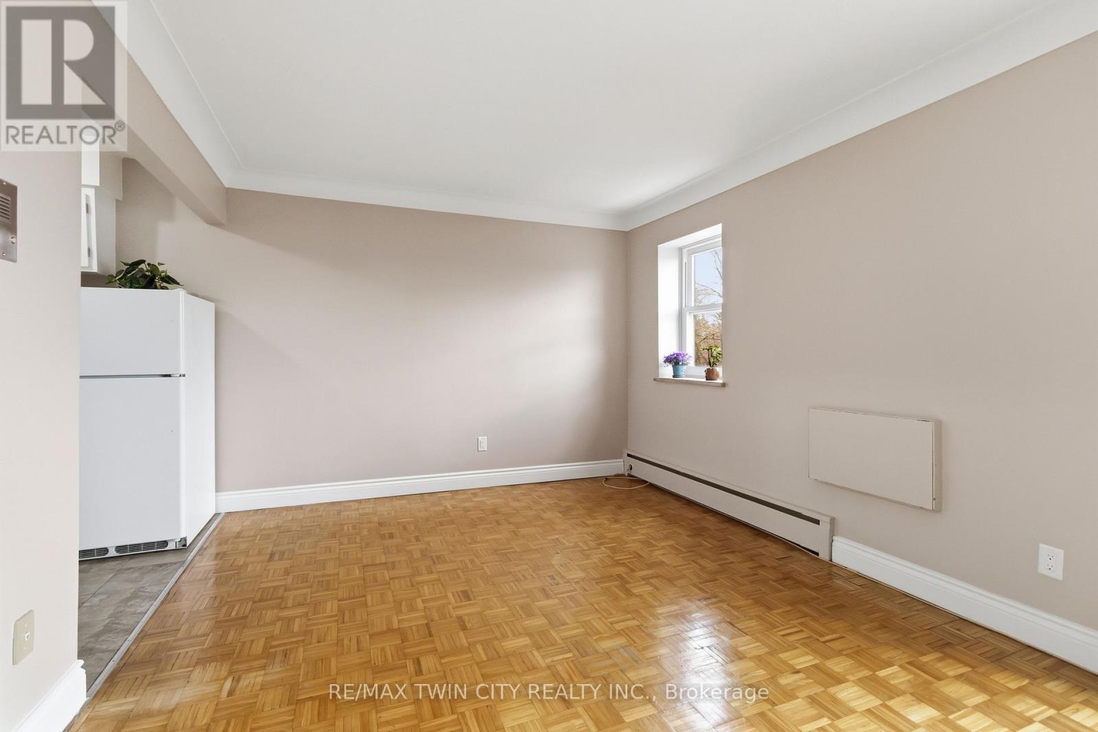 Opportunity knocks! Simplify your life and save some money in this great bachelor condo in fantastic location! Welcome home to Camelot Towers in desirable Terrace Hill. Lovely unit in quiet, friendly, well maintained building. Carpet-free unit has gleaming hardwood parquet & ceramic floors. Freshly painted throughout. Kitchen has new counter-top, new 1-1/2 sink & taps. Solid, retro-styled kitchen cabinets. Includes fridge, stove & carts. Updated 4-pc bathroom with freshly reglazed tub. 4 roomy closets plus Locker #11 for loads of storage. Balcony with roof-top view on quiet, east side of the building. Glorious morning sunshine is absolutely delicious when it streams into this unit, and afternoon shade means it won't overheat in the summer. Unit has charm and character of wide baseboards, & original plaster moldings & hand-swirled ceiling when plaster-work was an art. Building has a newer elevator, and all units were refurbished with vinyl windows, patio doors and balconies with glass balustrades. Party room, common laundry room and secured entrance (with electronic entry fob). Designated parking spot. Prime location is situated just steps from Metro grocery store & bus stop and has a great walkability score. Close to Brantford General Hospital, library, bank, dentists, restaurants, churches, shopping, Hwy 403. Ample visitor parking. Condo fees include heat & water. This unit boasts some of the lowest condo fees and property taxes in the city. Great opportunity for a first-time buyer wanting to get into the market, or a wonderful investment for parents sending their young person off to university, or just great timing for someone retired that wants to downsize and have easy access to grocery shopping. Owner is also willing to hold the mortgage for qualified buyer (which means no CMHC fees). Quick closing is available. (id:50787)