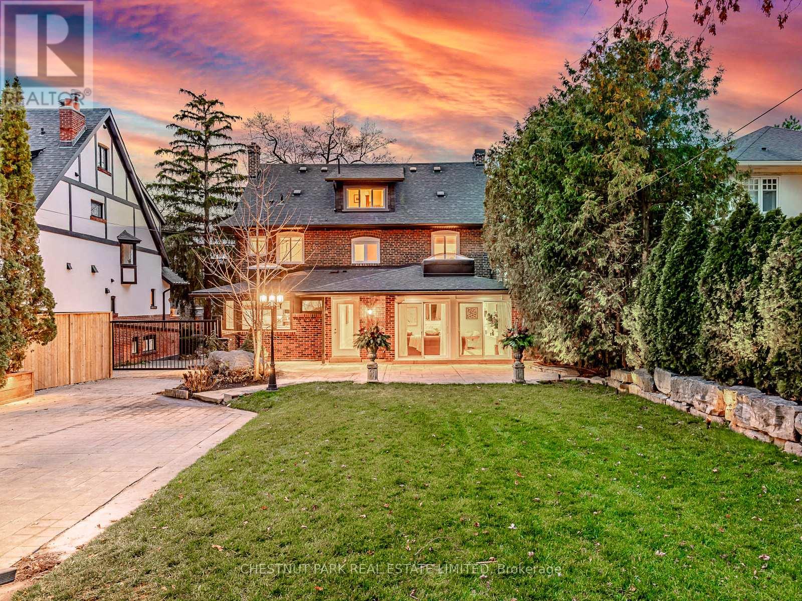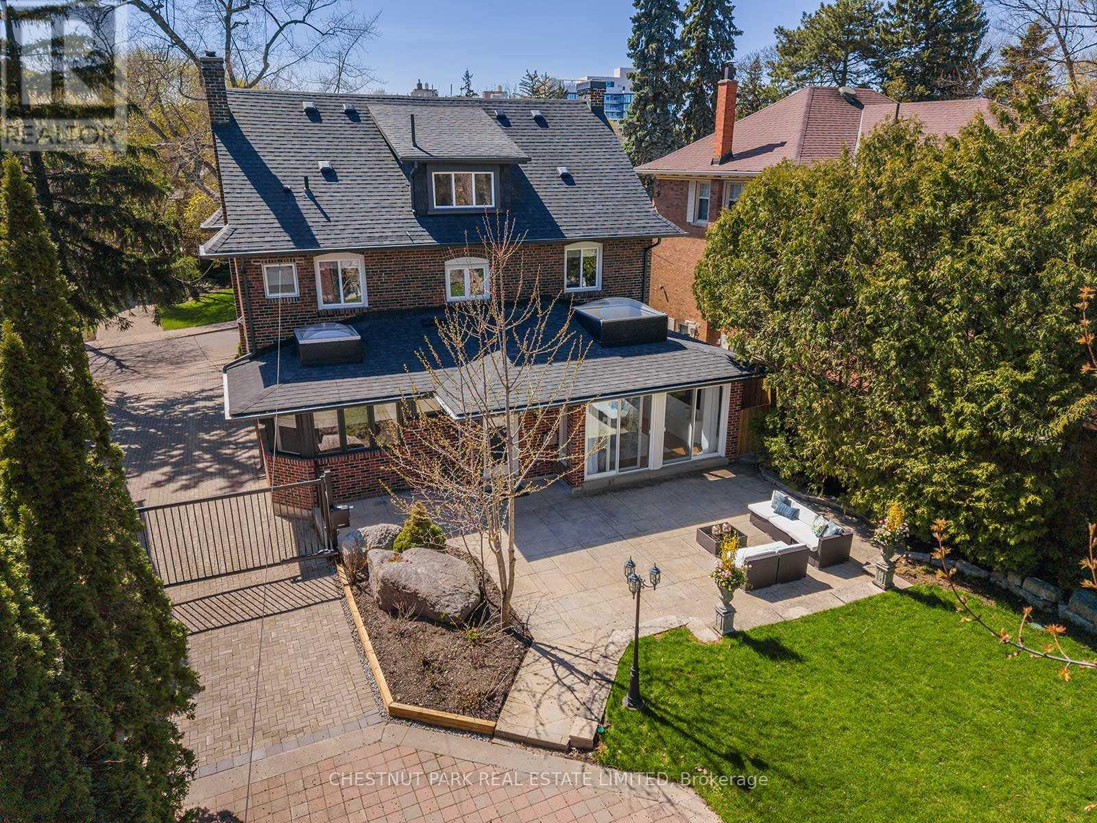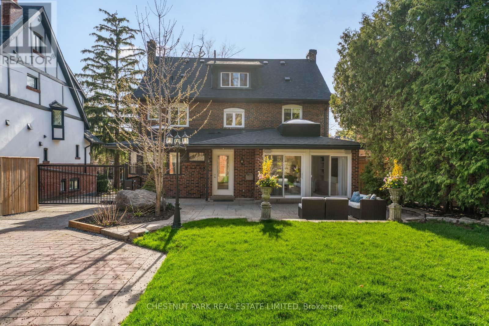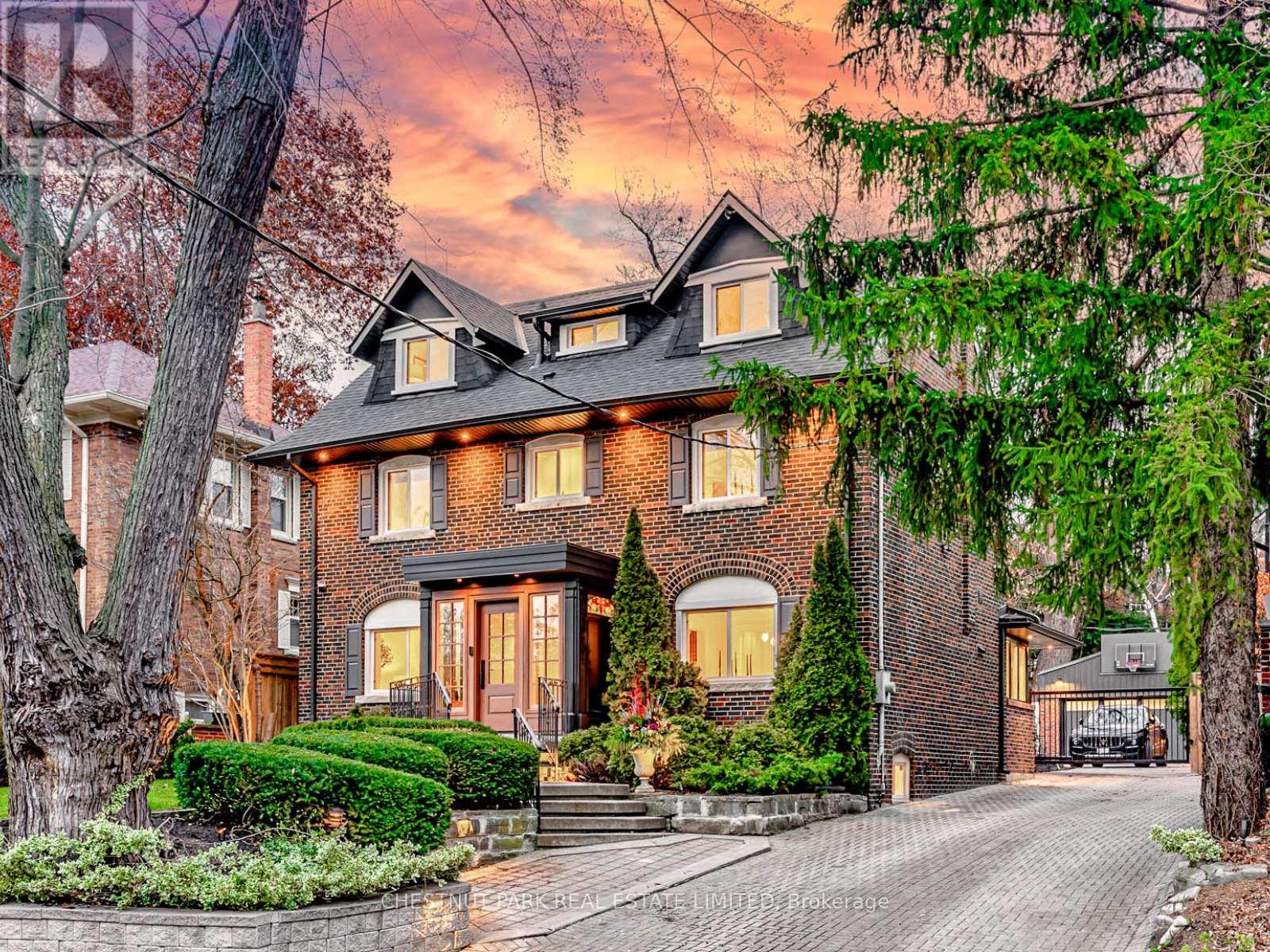 Situated on the best block of Weybourne Crescent, one of Lawrence Park's most coveted streets, this award-winning Georgian home blends timeless charm with modern family comfort. The manicured front yard frames a warm red-and-brown brick façade with a classic portico and beautiful dormers. Inside, a generous foyer with designer black natural stone heated floors, panelled designer closet, and a skylight sets an elegant tone. To the right, the formal dining room with a large window and designer chandelier flows naturally into the sun-filled kitchen, featuring refined finishes and a breakfast nook wrapped in curved windows overlooking the private backyard. The centre hall leads to a practical mudroom in the rear of the home with heated tiled flooring and a thoughtfully placed powder room also with heated floor. To the left of the main entrance sits the spacious formal living room with a gas fireplace connecting to an inviting family room with a custom media wall, arched built-in shelving, a large skylight, and floor-to-ceiling windows opening to the backyard oasis. Throughout the home, engineered white oak floors, pot lights, and integrated speakers elevate every space. The second floor offers a bright primary suite with an updated ensuite and walk-in closet, alongside two additional bedrooms and a convenient laundry closet. The third floor provides two more large bedrooms with built-ins and windows. Lower level extends the living space with two versatile rooms, a modern bath, a large laundry room, and a tidy utility room. Outdoor living shines with landscape lighting, smart irrigation, outdoor speakers, and rare parking for up to nine cars, including a two-car detached garage behind a Metal remote-controlled gate. Steps to Lawrence Station, Yonge Street, parks, and top schools, including TFS, Crescent, and Havergal, this turn-key residence offers exceptional lifestyle, location, and charm in one of Toronto's most sought-after neighbourhoods. (id:50787)