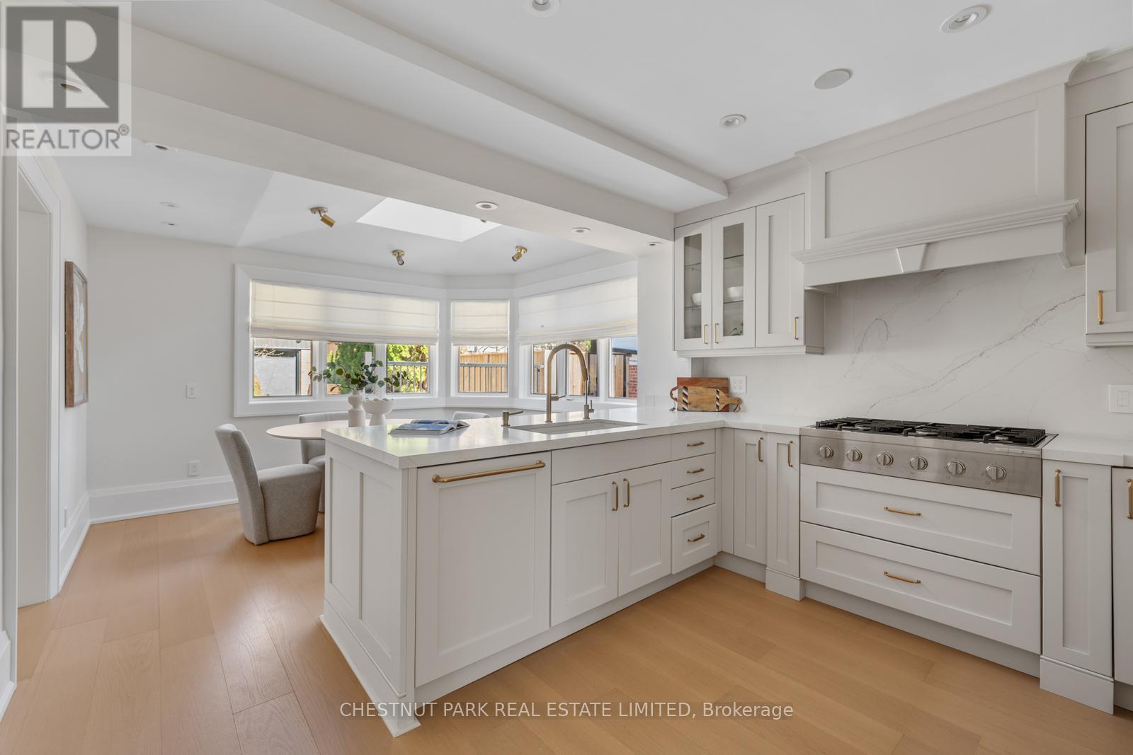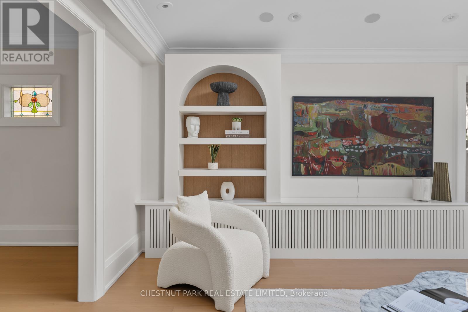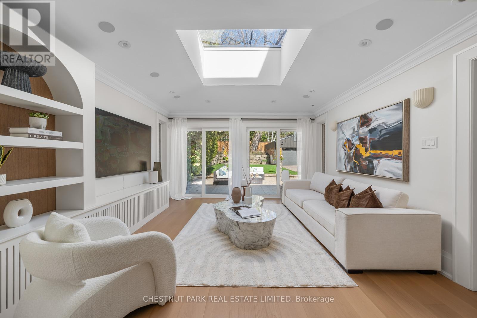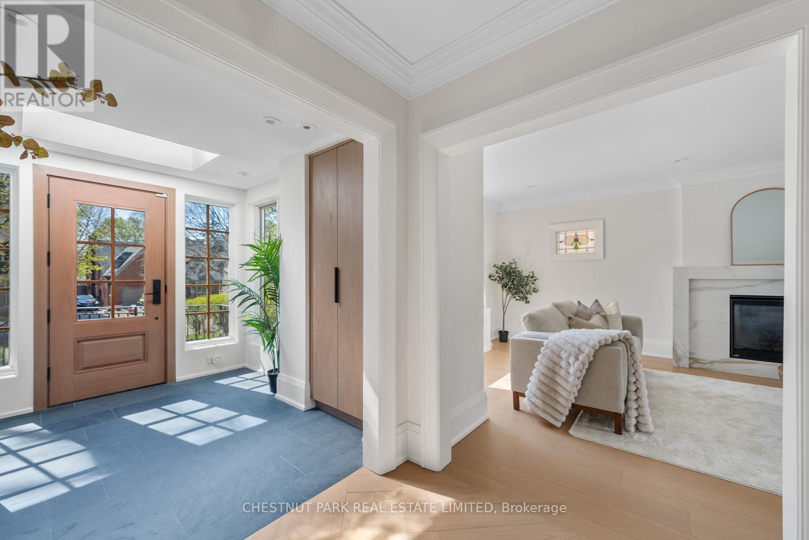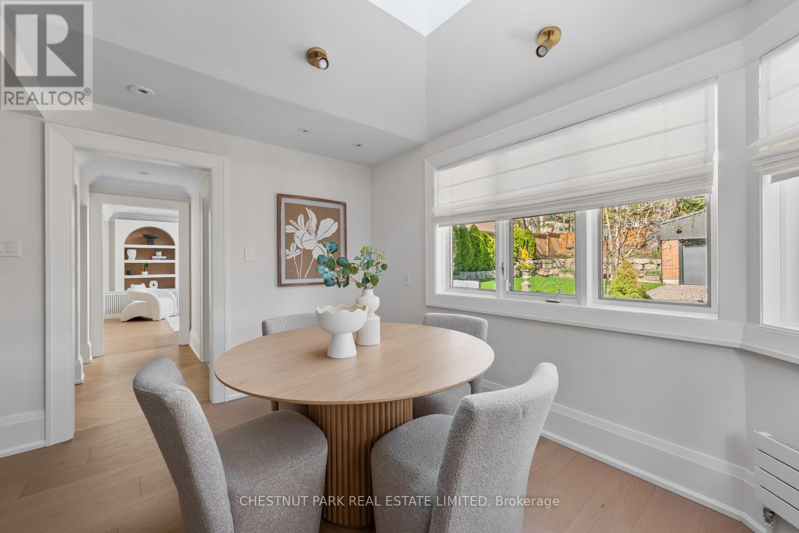Situated on the best block of Weybourne Crescent, one of Lawrence Park's most coveted streets, this award-winning Georgian home blends timeless charm with modern family comfort. The manicured front yard frames a warm red-and-brown brick façade with a classic portico and beautiful dormers. Inside, a generous foyer with designer black natural stone heated floors, panelled designer closet, and a skylight sets an elegant tone. To the right, the formal dining room with a large window and designer chandelier flows naturally into the sun-filled kitchen, featuring refined finishes and a breakfast nook wrapped in curved windows overlooking the private backyard. The centre hall leads to a practical mudroom in the rear of the home with heated tiled flooring and a thoughtfully placed powder room also with heated floor. To the left of the main entrance sits the spacious formal living room with a gas fireplace connecting to an inviting family room with a custom media wall, arched built-in shelving, a large skylight, and floor-to-ceiling windows opening to the backyard oasis. Throughout the home, engineered white oak floors, pot lights, and integrated speakers elevate every space. The second floor offers a bright primary suite with an updated ensuite and walk-in closet, alongside two additional bedrooms and a convenient laundry closet. The third floor provides two more large bedrooms with built-ins and windows. Lower level extends the living space with two versatile rooms, a modern bath, a large laundry room, and a tidy utility room. Outdoor living shines with landscape lighting, smart irrigation, outdoor speakers, and rare parking for up to nine cars, including a two-car detached garage behind a Metal remote-controlled gate. Steps to Lawrence Station, Yonge Street, parks, and top schools, including TFS, Crescent, and Havergal, this turn-key residence offers exceptional lifestyle, location, and charm in one of Toronto's most sought-after neighbourhoods. (id:50787)