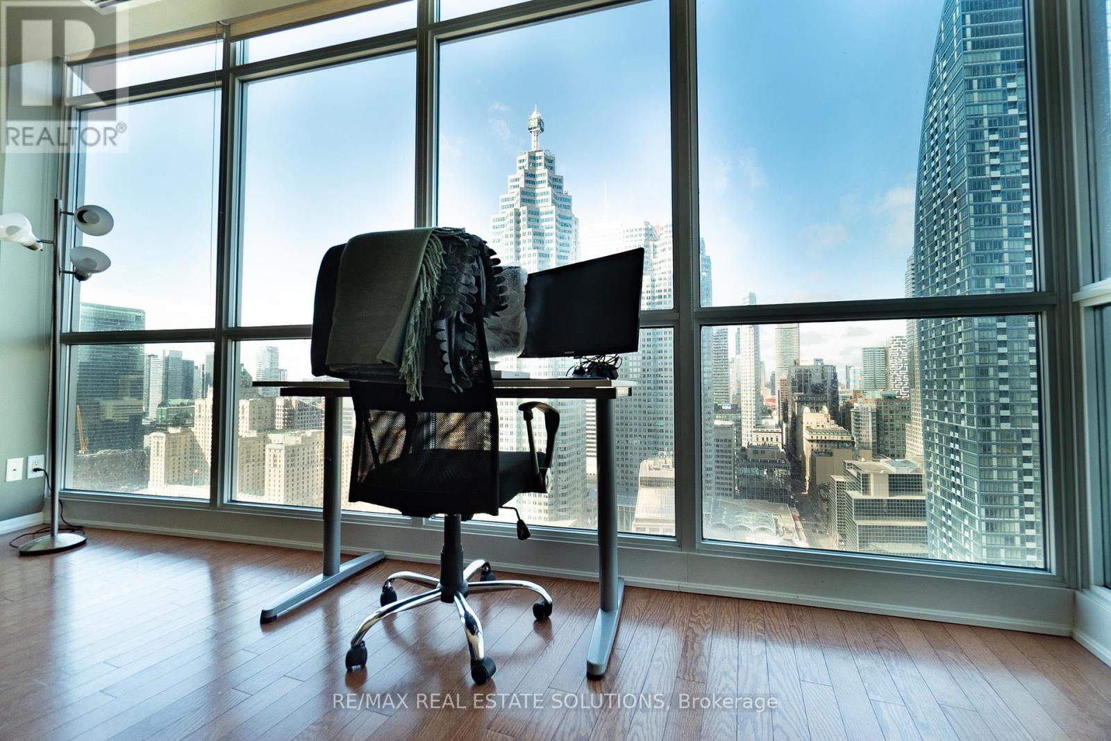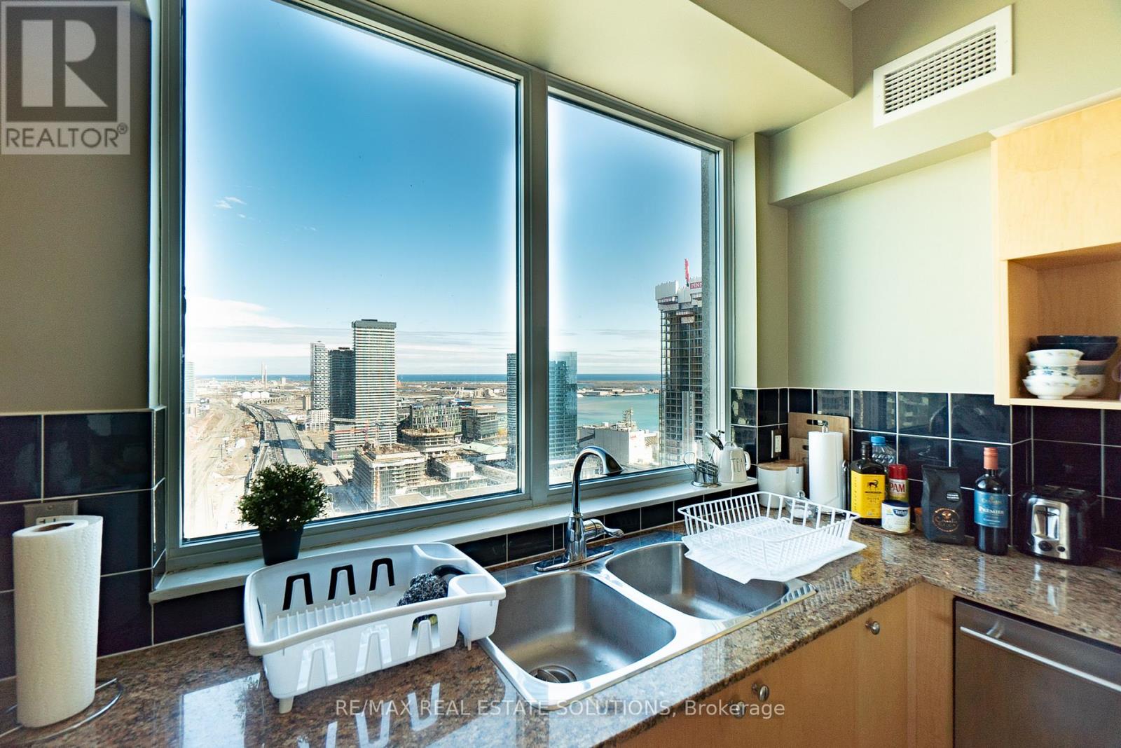 Welcome to 18 Yonge! Available May 1st with parking and locker included. This spectacular corner suite offers unobstructed views of the city skyline and Lake Ontario. The bright and spacious 2 bedroom, 2 bathroom residence features 9-foot ceilings and floor-to-ceiling windows with upgraded UV-protective roller blinds, filling the space with natural light while showcasing the incredible views. The elegant interior includes oak hardwood floors and a modern kitchen with granite countertops and upgraded appliances, while the primary bedroom features a spa-like marble ensuite. Enjoy your private balcony overlooking the vibrant downtown core. Residents have access to exceptional building amenities including a 24-hour concierge, fitness centre, indoor pool, sauna, party room, and rooftop deck with garden. Ideally located steps to Union Station, Scotiabank Arena, the Financial District, and the Harbourfront, offering the ultimate downtown Toronto lifestyle. (id:50787)