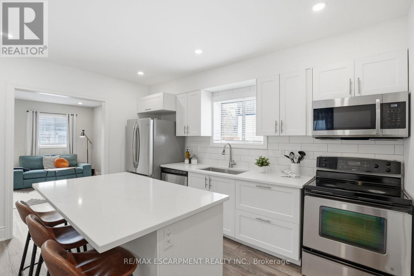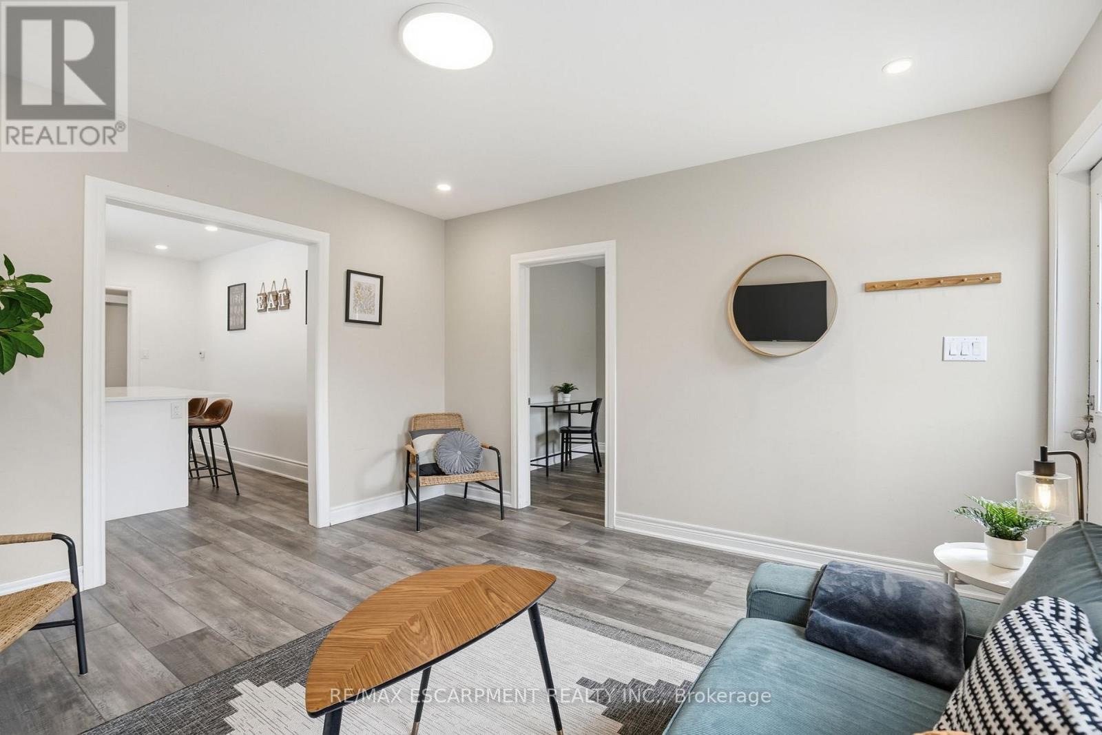 Completely remodelled brick bungalow in the sought-after Kirkendall neighbourhood, just a 2-minute walk to Locke Street. Enjoy boutique shops, cafés, and top-rated restaurants right at your doorstep. This versatile property offers a main home plus an in-law suite with an optional separate entrance. The main floor features luxury vinyl plank flooring throughout and a sun-filled living room. An optional bedroom or home office is tucked just off the main space, ideal for privacy and separation from the other two bedrooms. The bright white eat-in kitchen is complete with stainless steel appliances, a large island, and quartz countertops. A stylish 4-piece bathroom and convenient main floor laundry complete this level. The modern lower-level suite includes 1 spacious bedroom with room for an art easel, yoga space, or a comfortable work-from-home setup. A full kitchen, dining area, and separate laundry room make it ideal for rental income, house hacking, or multi-generational living. Updates include 2024 roof shingles and fresh paint throughout. The fully fenced, low-maintenance yard offers privacy and space to relax or entertain. Detached garage plus 2-car driveway parking is very rare for this location. Located in a vibrant, walkable neighbourhood just steps to Locke Street, with local favourites like CIMA Enoteca, Donut Monster, Bardo, and The Gym on Locke nearby, plus a popular dog park! Additional amenities are just minutes away, including McMaster University (9 min), Waterdown (9 min), Ancaster Meadowlands (13 min), and Burlington (15 min). Set on a quiet, tree-lined street surrounded by charming century homes, with quick highway access and close proximity to downtown. A rare opportunity to own a turnkey home in one of Hamilton's most walkable and vibrant communities. (id:50787)