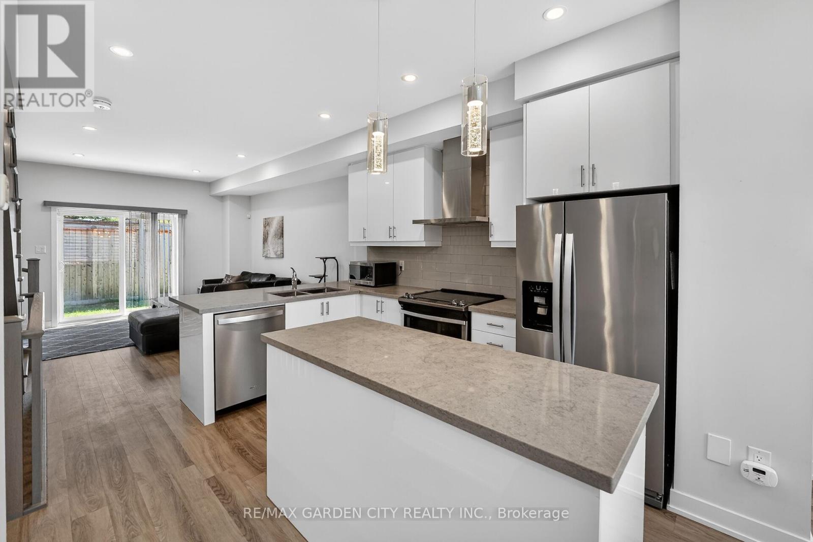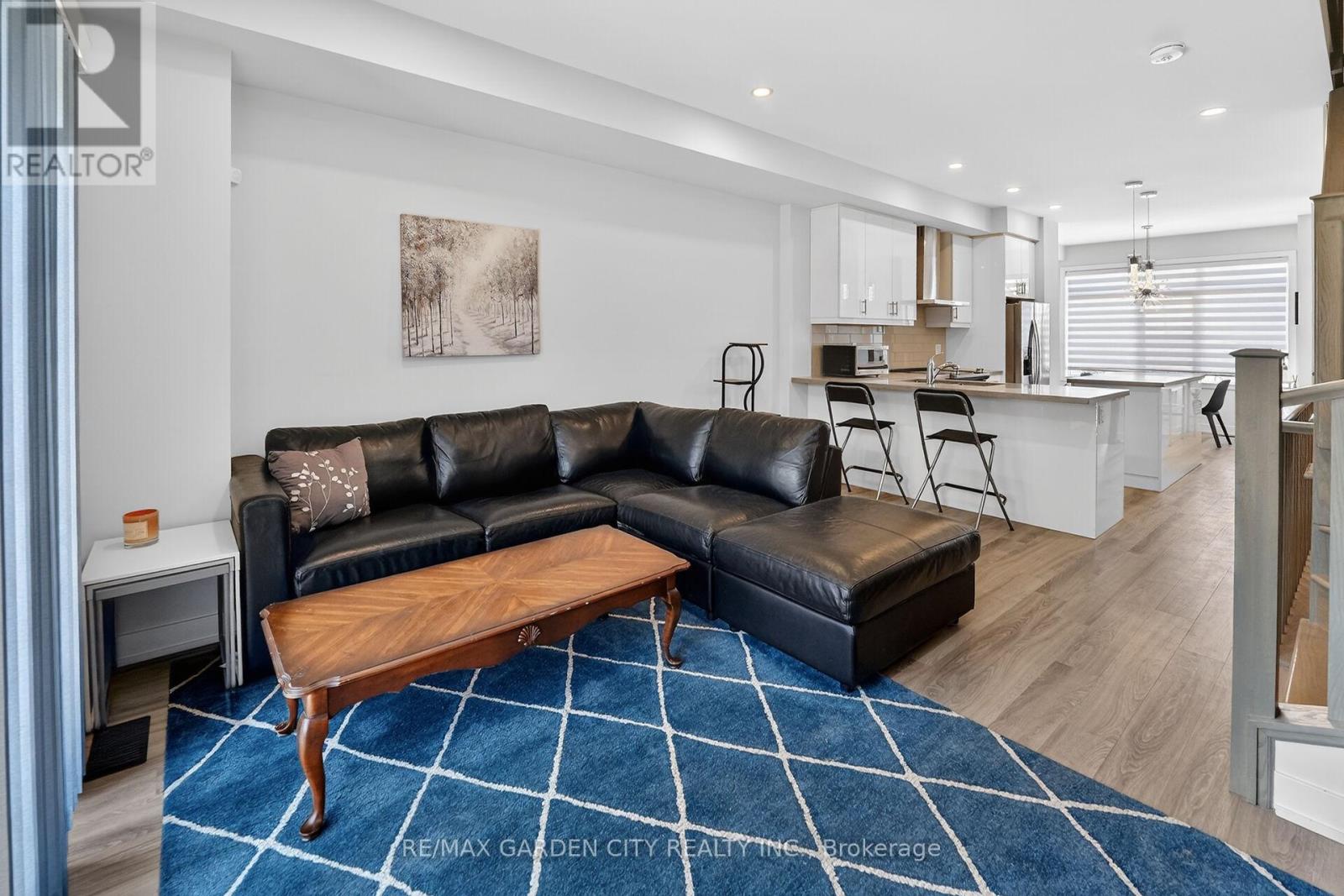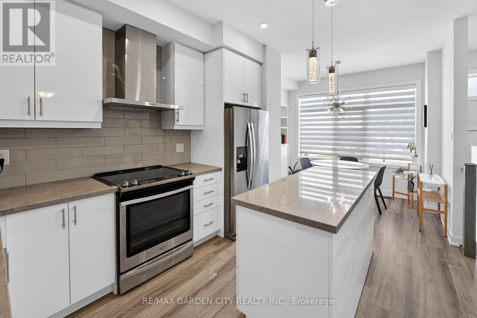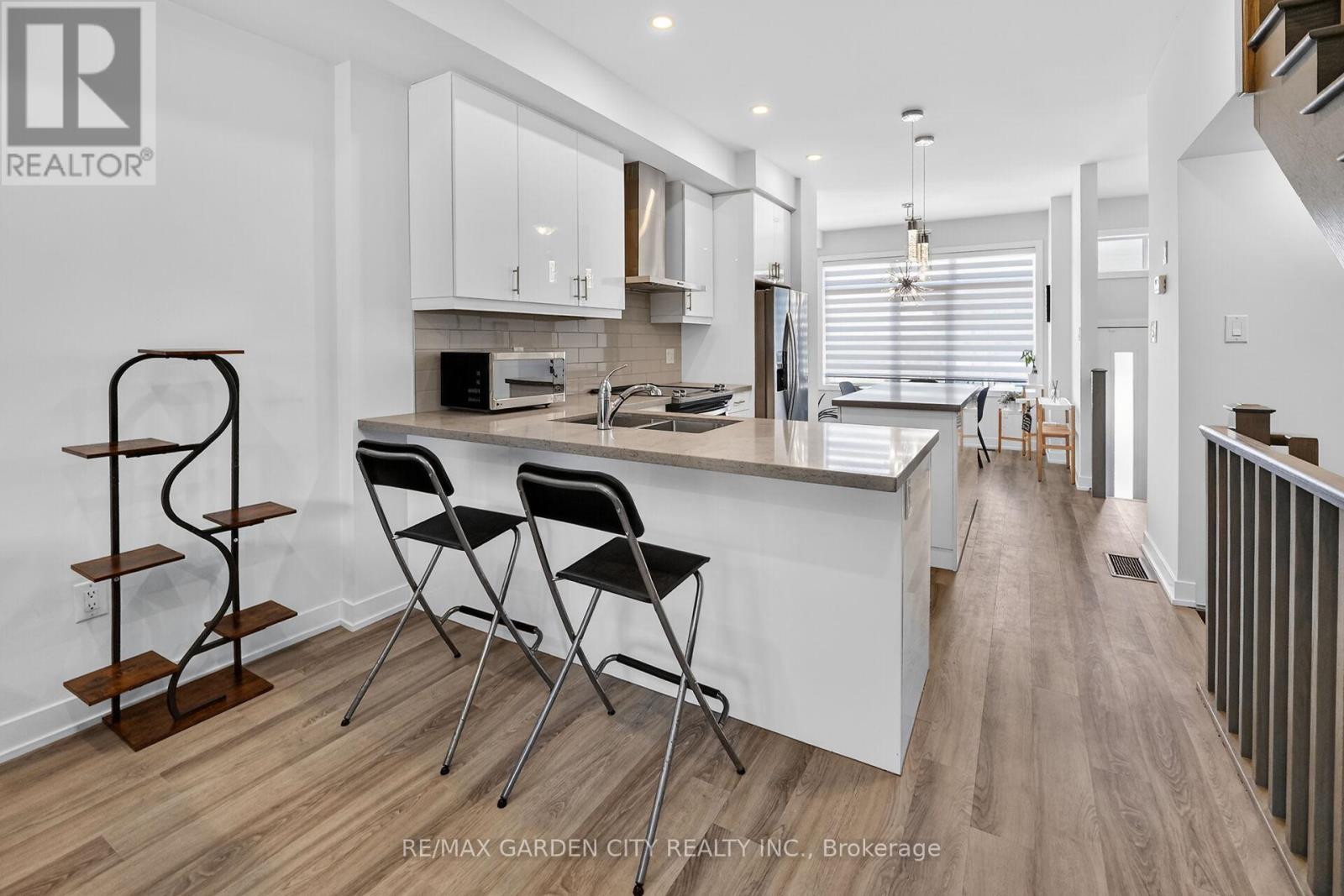 This stunning, move-in-ready 3-storey townhome showcases modern design and high-end finishes throughout. The bright, open-concept main floor features 9-foot ceilings, oversized windows, and elegant pot lighting, creating an inviting space perfect for both everyday living and entertaining. The chef-inspired kitchen is a true highlight, complete with quartz countertops, an under-mount stainless steel sink, a stylish subway tile backsplash, under-cabinet lighting, a spacious island with breakfast bar, and brand-new stainless steel appliances. Upstairs, the spacious primary suite offers a rare and highly desirable private ensuite bath, while the home also includes an additional full bathroom and a convenient powder room-providing exceptional functionality for families and guests alike. Enjoy seamless indoor-outdoor living with a private main floor patio and a walk-out to the backyard-perfect for relaxing or hosting. All levels of this home feature carpet-free floors. With impressive curb appeal, the stucco and brick exterior is complemented by a single-car garage, private driveway, and visitor parking. Located near Ancaster's SmartCentres (Walmart, Longo's, GoodLife Fitness, Lowe's and more), and just minutes from parks, schools, and Hamilton Health Sciences. Commuters will love the easy highway access, while being only a 15-minute drive to McMaster University, Mohawk College, and Redeemer University. Public transit is also within walking distance. (id:50787)