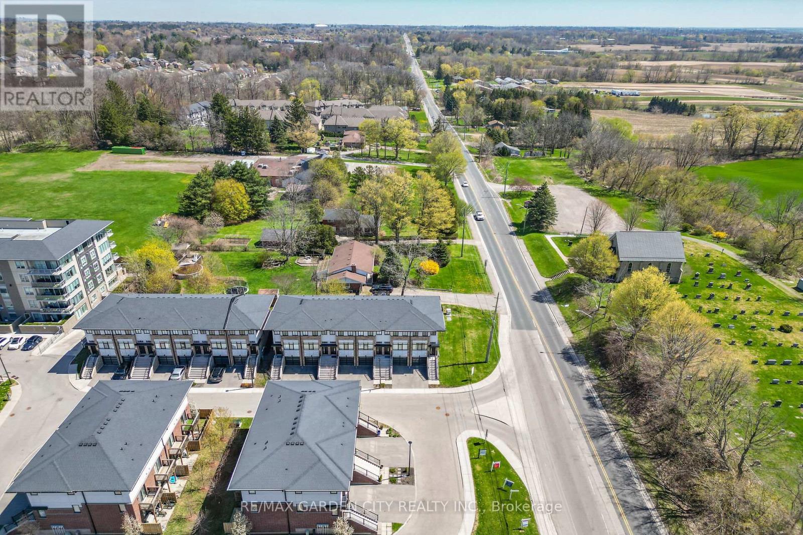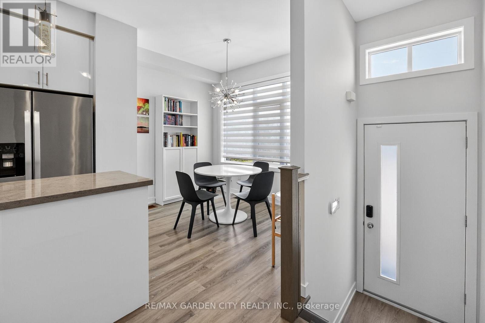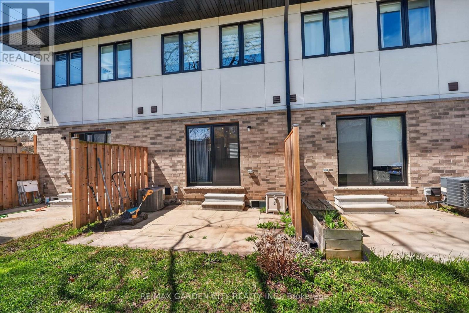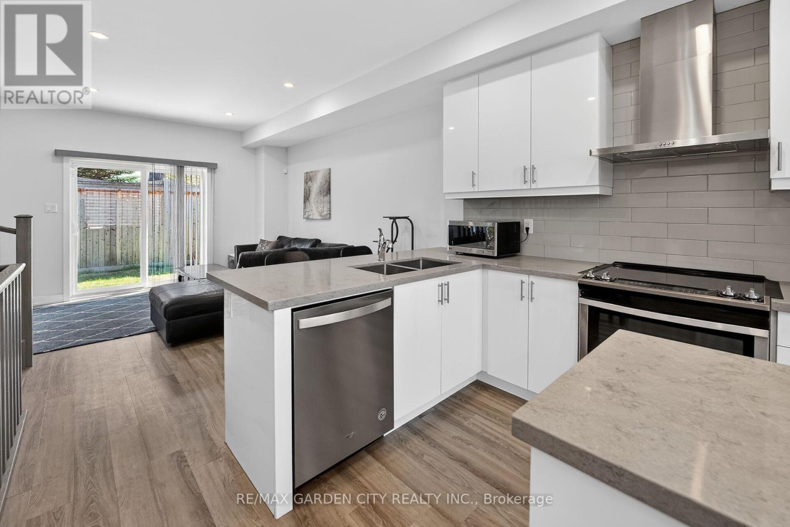 This stunning, move-in-ready 3-storey townhome showcases modern design and high-end finishes throughout. The bright, open-concept main floor features 9-foot ceilings, oversized windows, and elegant pot lighting, creating an inviting space perfect for both everyday living and entertaining. The chef-inspired kitchen is a true highlight, complete with quartz countertops, an under-mount stainless steel sink, a stylish subway tile backsplash, under-cabinet lighting, a spacious island with breakfast bar, and brand-new stainless steel appliances. Upstairs, the spacious primary suite offers a rare and highly desirable private ensuite bath, while the home also includes an additional full bathroom and a convenient powder room-providing exceptional functionality for families and guests alike. Enjoy seamless indoor-outdoor living with a private main floor patio and a walk-out to the backyard-perfect for relaxing or hosting. All levels of this home feature carpet-free floors. With impressive curb appeal, the stucco and brick exterior is complemented by a single-car garage, private driveway, and visitor parking. Located near Ancaster's SmartCentres (Walmart, Longo's, GoodLife Fitness, Lowe's and more), and just minutes from parks, schools, and Hamilton Health Sciences. Commuters will love the easy highway access, while being only a 15-minute drive to McMaster University, Mohawk College, and Redeemer University. Public transit is also within walking distance. (id:50787)