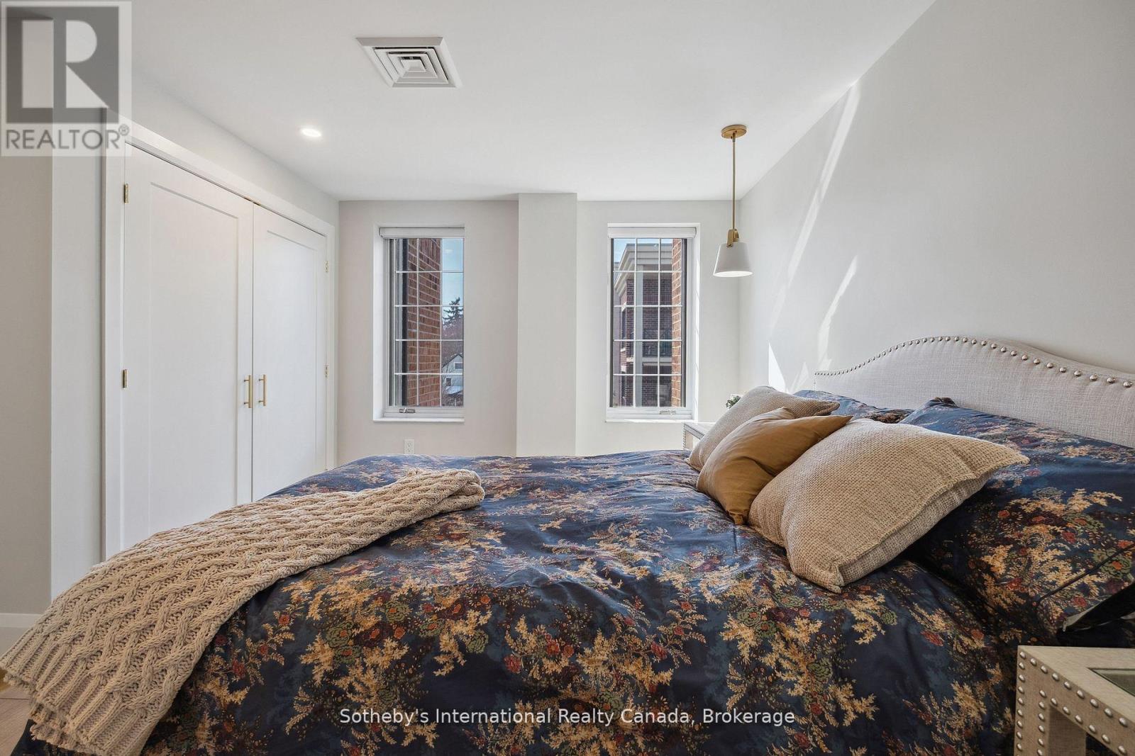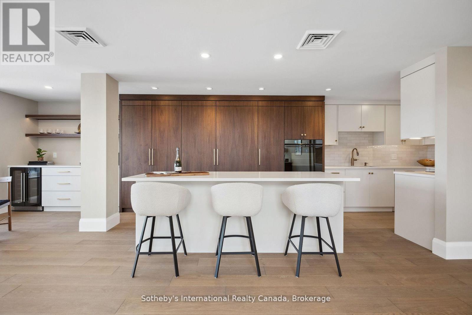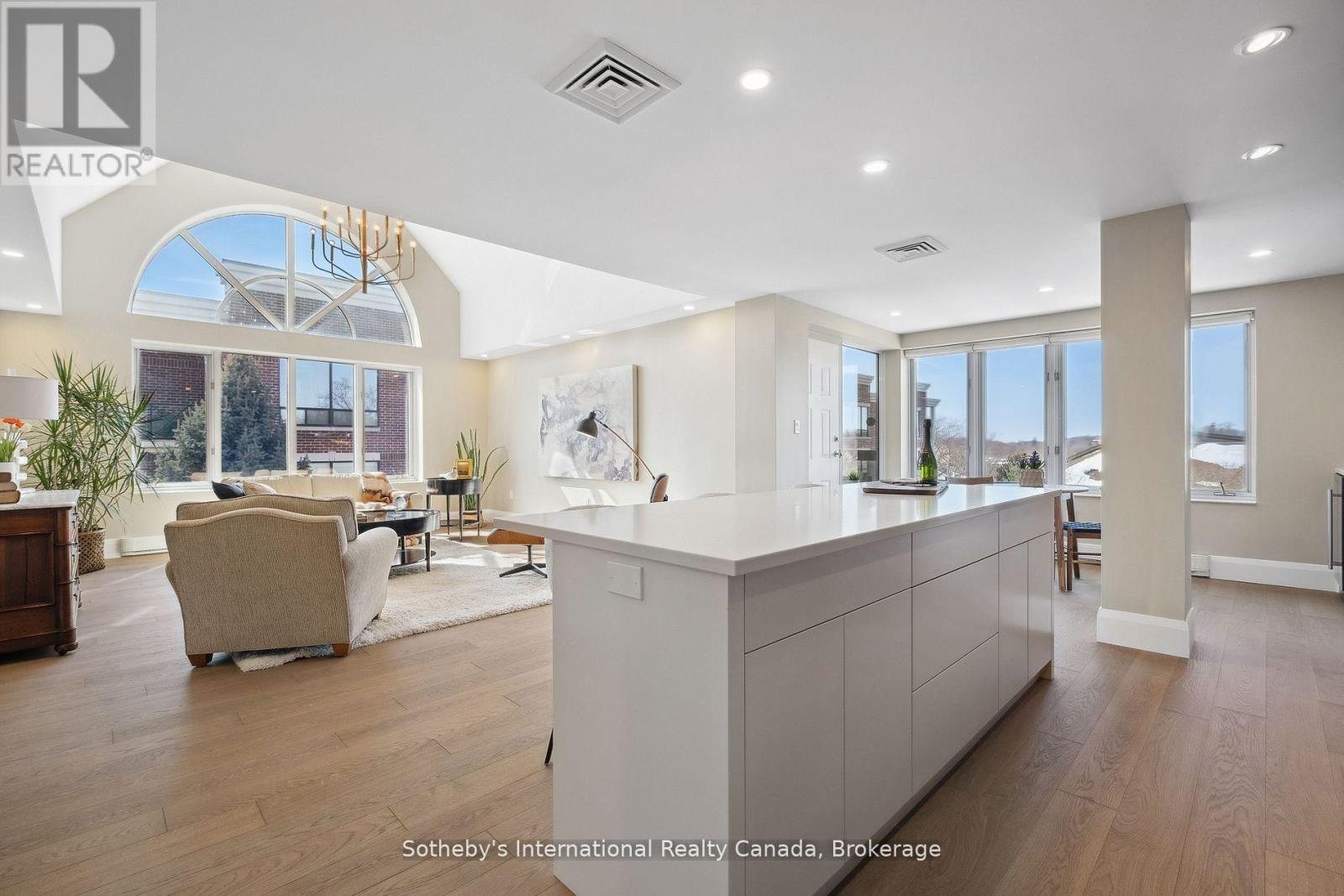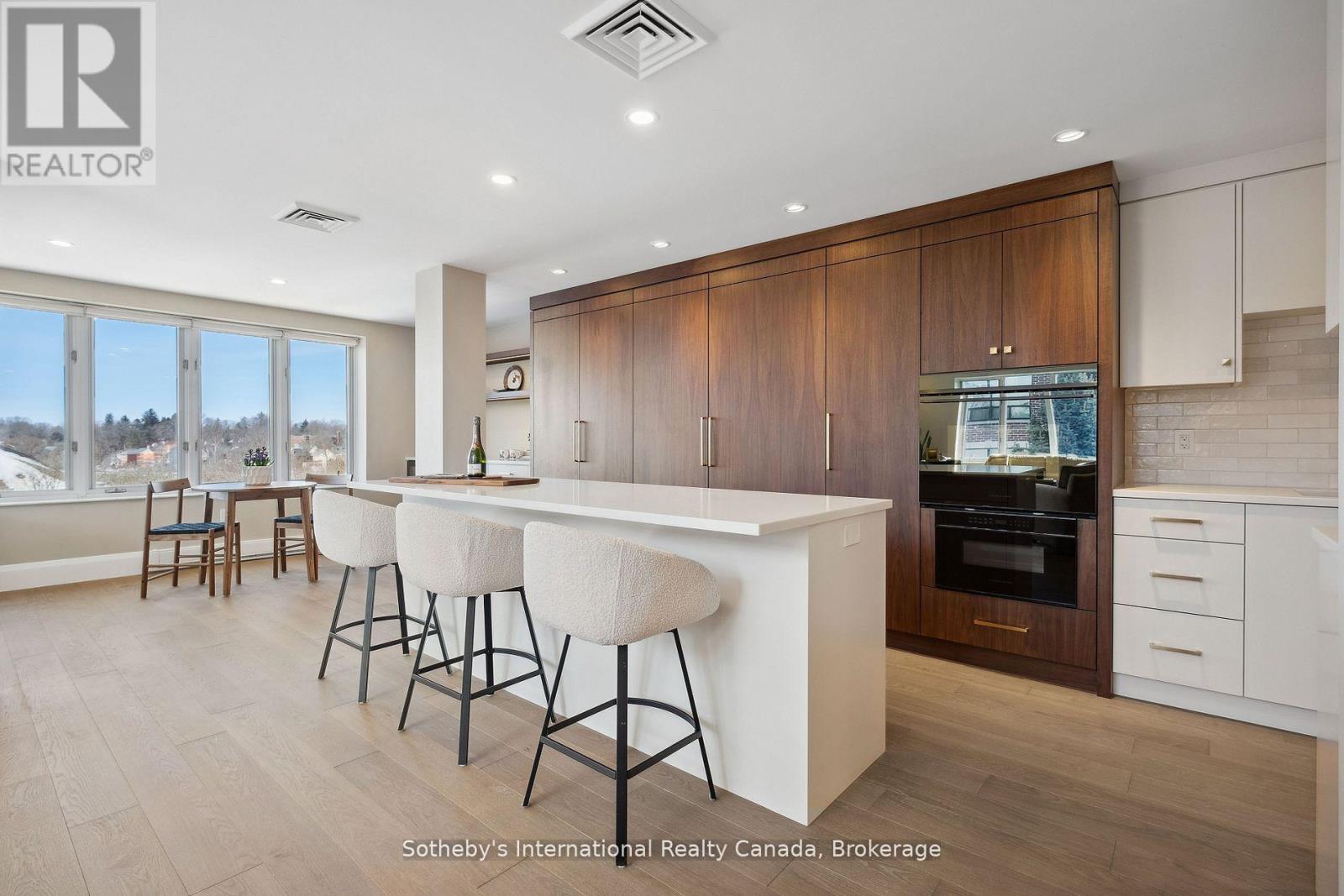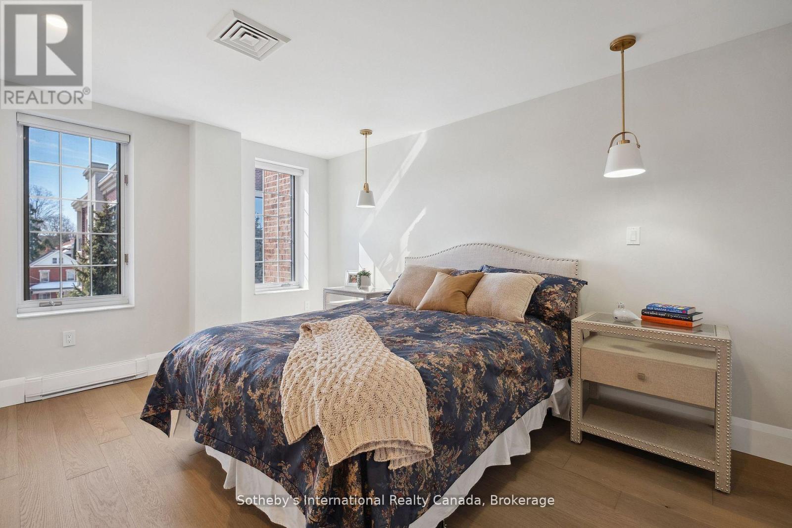 Perched above the picturesque Avon River, this spectacular penthouse at 30 Front Street isn't just a residence, it's a statement. A rare fusion of luxury, design, and location, this is where elevated living meets the cultural soul of Stratford. This one-of-a-kind suite redefines sophistication. Whether you're hosting champagne evenings on your private terrace or enjoying a quiet morning with theatre-district views, this penthouse is where your story unfolds and it's nothing short of extraordinary. Perfectly situated between the Festival and Tom Patterson theatres, this stunning top-corner unit offers an unbeatable location with southwest exposure, just steps from parks, restaurants, and all that downtown Stratford offers. This professionally redesigned residence at The Huntingdon boasts just over 1,500 sq. ft. of elegant living space with a smart, thoughtful layout. Featuring two spacious bedrooms with built-in closet systems, two full bathrooms with porcelain floors, and an inviting living room with vaulted ceilings, oversized windows, and a generous dining area, this suite is designed for comfort and style. A full wall of windows provides beautiful year-round views, while the large private corner terrace is perfect for morning coffee or evening cocktails. This floor plan includes added soundproofing, engineered European white oak flooring, and pot lights throughout. Custom walnut veneer cabinetry by Homestead Woodworking complements quartz countertops, a large island with extra storage, and top-tier integrated appliances: Fisher & Paykel wall oven, microwave, induction cooktop, and Bosch dishwasher. Includes deeded underground parking near the door and elevator, assigned locker, outdoor guest parking, controlled entry, visitor parking, and plans for EV charging. This pet-friendly, quiet building is home to professionals and theatre artists. Fully rebuilt with permits, this home offers a refined, maintenance-free lifestyle in Stratford's most desirable condo. (id:50787)