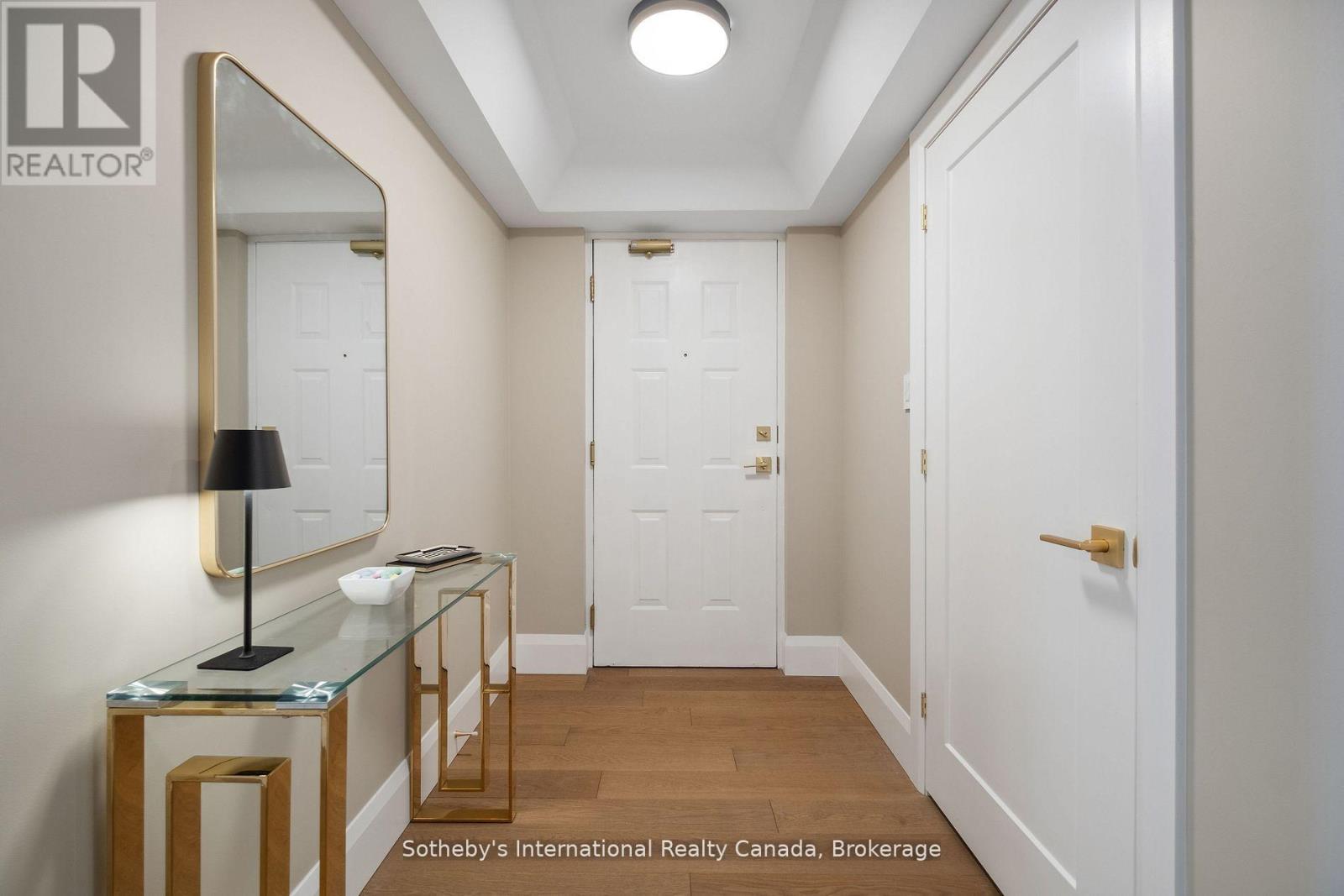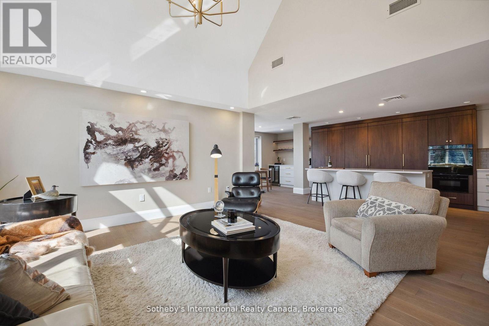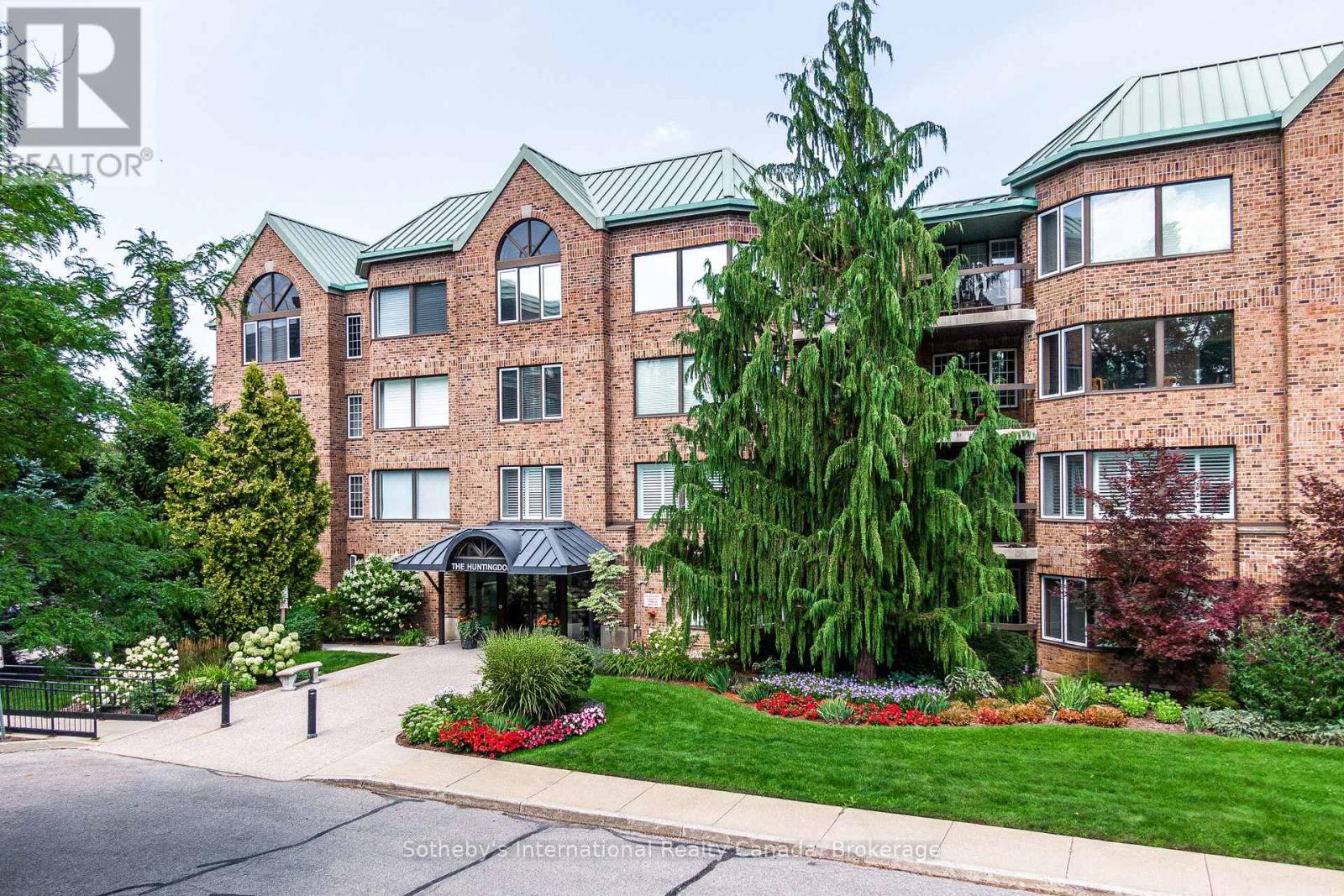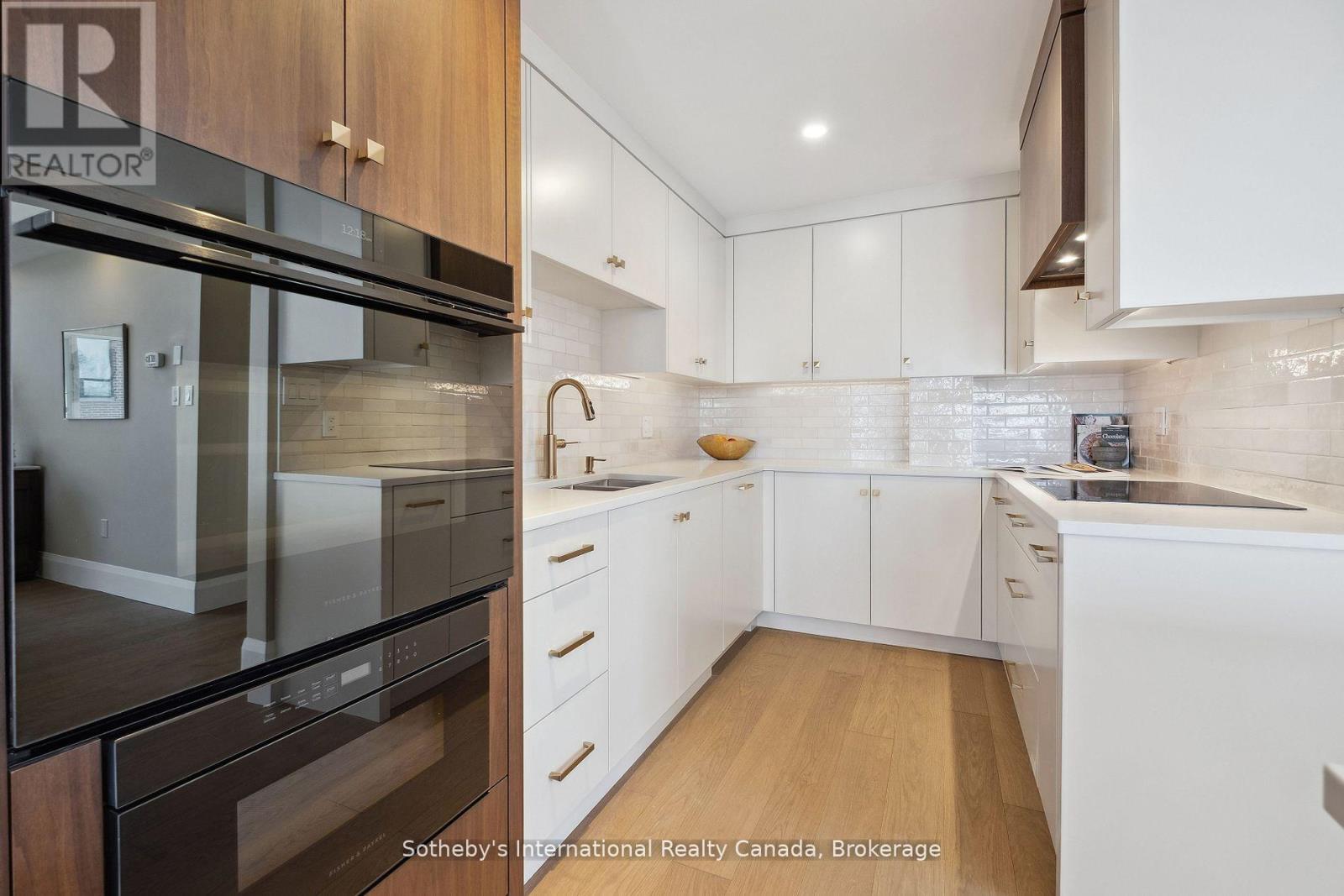Perched above the picturesque Avon River, this spectacular penthouse at 30 Front Street isn't just a residence, it's a statement. A rare fusion of luxury, design, and location, this is where elevated living meets the cultural soul of Stratford. This one-of-a-kind suite redefines sophistication. Whether you're hosting champagne evenings on your private terrace or enjoying a quiet morning with theatre-district views, this penthouse is where your story unfolds and it's nothing short of extraordinary. Perfectly situated between the Festival and Tom Patterson theatres, this stunning top-corner unit offers an unbeatable location with southwest exposure, just steps from parks, restaurants, and all that downtown Stratford offers. This professionally redesigned residence at The Huntingdon boasts just over 1,500 sq. ft. of elegant living space with a smart, thoughtful layout. Featuring two spacious bedrooms with built-in closet systems, two full bathrooms with porcelain floors, and an inviting living room with vaulted ceilings, oversized windows, and a generous dining area, this suite is designed for comfort and style. A full wall of windows provides beautiful year-round views, while the large private corner terrace is perfect for morning coffee or evening cocktails. This floor plan includes added soundproofing, engineered European white oak flooring, and pot lights throughout. Custom walnut veneer cabinetry by Homestead Woodworking complements quartz countertops, a large island with extra storage, and top-tier integrated appliances: Fisher & Paykel wall oven, microwave, induction cooktop, and Bosch dishwasher. Includes deeded underground parking near the door and elevator, assigned locker, outdoor guest parking, controlled entry, visitor parking, and plans for EV charging. This pet-friendly, quiet building is home to professionals and theatre artists. Fully rebuilt with permits, this home offers a refined, maintenance-free lifestyle in Stratford's most desirable condo. (id:50787)