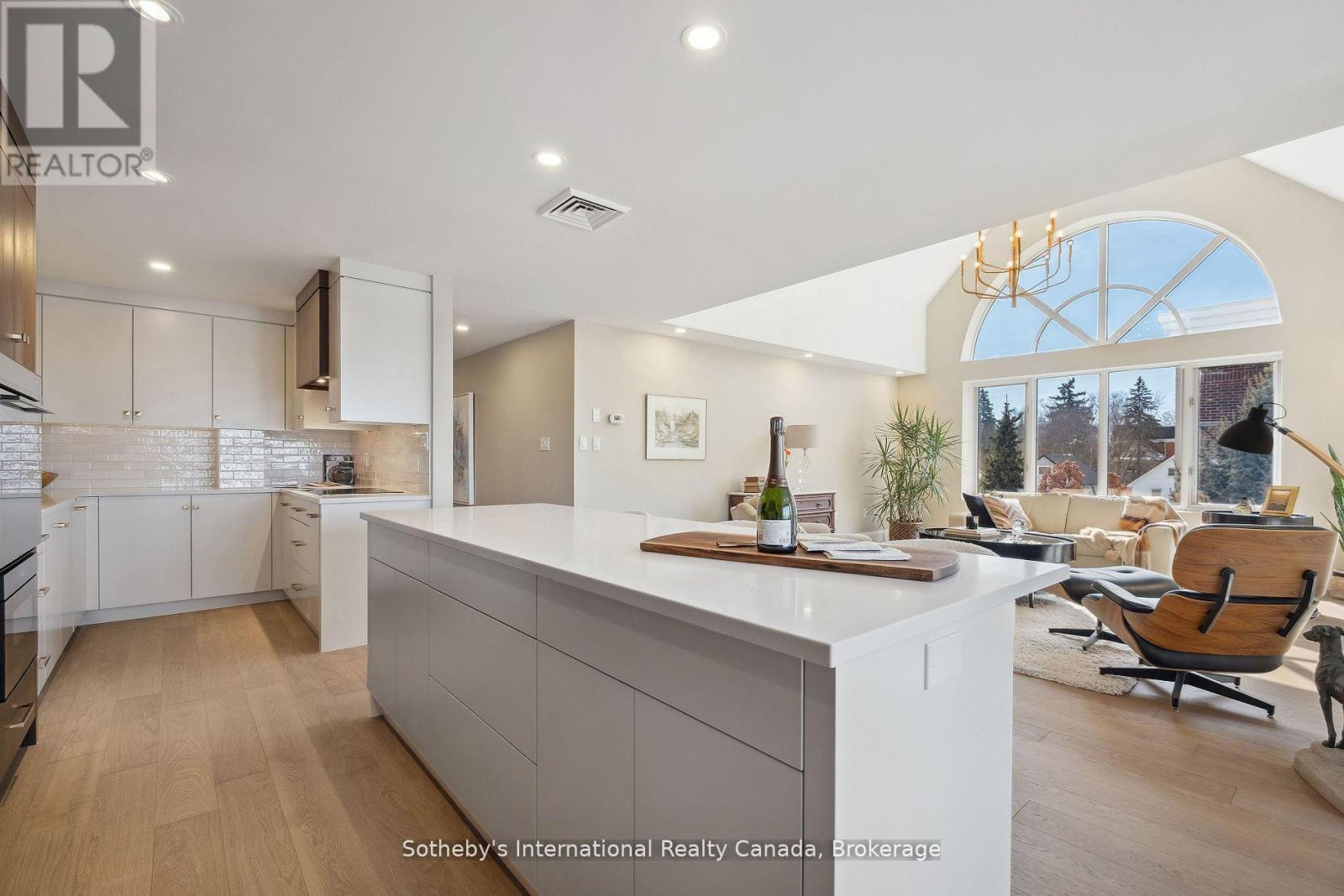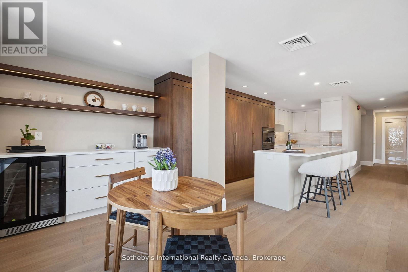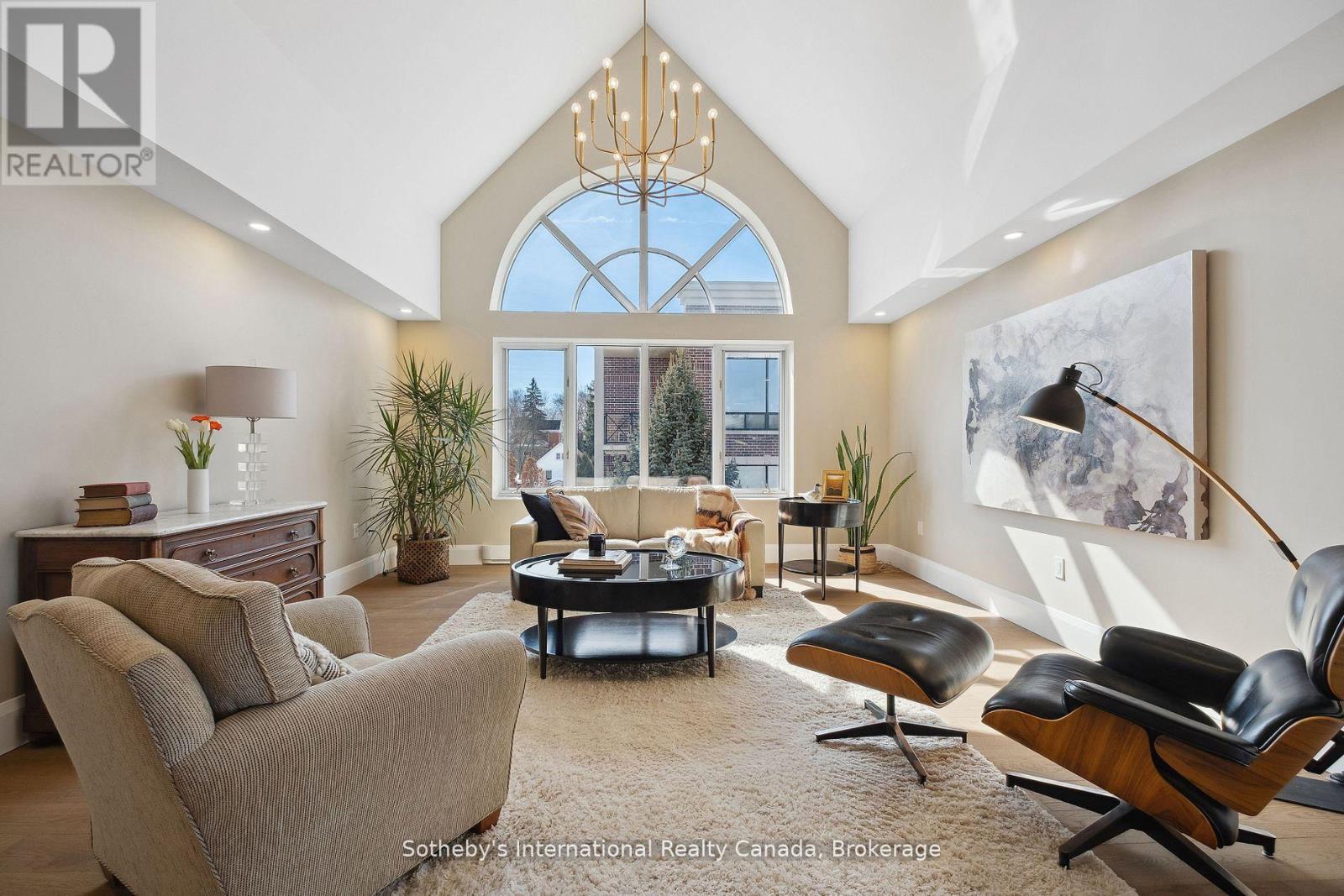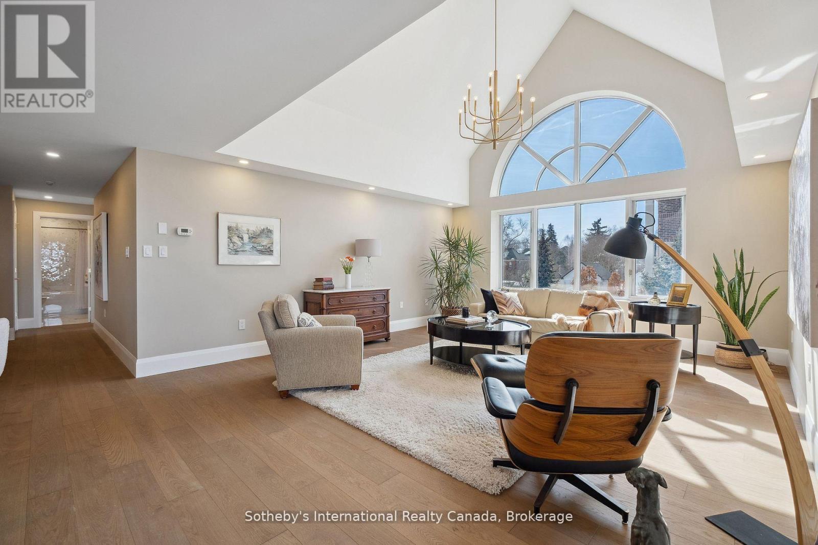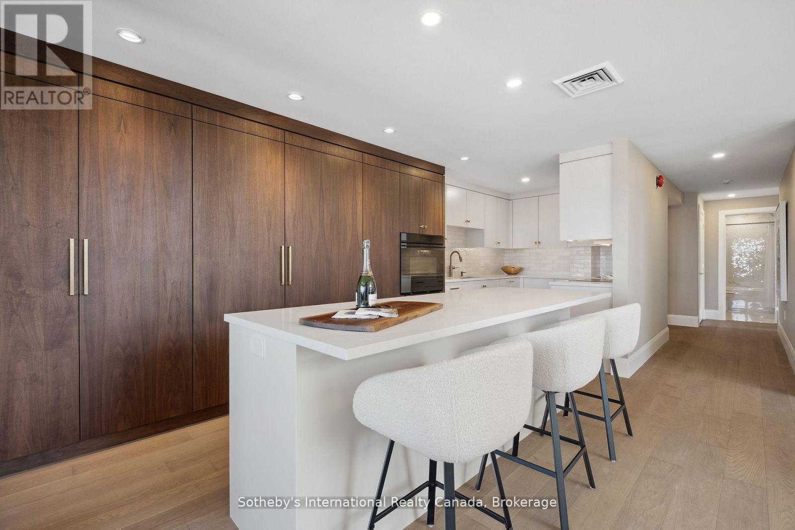Perched above the picturesque Avon River, this spectacular penthouse at 30 Front Street isn't just a residence, it's a statement. A rare fusion of luxury, design, and location, this is where elevated living meets the cultural soul of Stratford. This one-of-a-kind suite redefines sophistication. Whether you're hosting champagne evenings on your private terrace or enjoying a quiet morning with theatre-district views, this penthouse is where your story unfolds and it's nothing short of extraordinary. Perfectly situated between the Festival and Tom Patterson theatres, this stunning top-corner unit offers an unbeatable location with southwest exposure, just steps from parks, restaurants, and all that downtown Stratford offers. This professionally redesigned residence at The Huntingdon boasts just over 1,500 sq. ft. of elegant living space with a smart, thoughtful layout. Featuring two spacious bedrooms with built-in closet systems, two full bathrooms with porcelain floors, and an inviting living room with vaulted ceilings, oversized windows, and a generous dining area, this suite is designed for comfort and style. A full wall of windows provides beautiful year-round views, while the large private corner terrace is perfect for morning coffee or evening cocktails. This floor plan includes added soundproofing, engineered European white oak flooring, and pot lights throughout. Custom walnut veneer cabinetry by Homestead Woodworking complements quartz countertops, a large island with extra storage, and top-tier integrated appliances: Fisher & Paykel wall oven, microwave, induction cooktop, and Bosch dishwasher. Includes deeded underground parking near the door and elevator, assigned locker, outdoor guest parking, controlled entry, visitor parking, and plans for EV charging. This pet-friendly, quiet building is home to professionals and theatre artists. Fully rebuilt with permits, this home offers a refined, maintenance-free lifestyle in Stratford's most desirable condo. (id:50787)