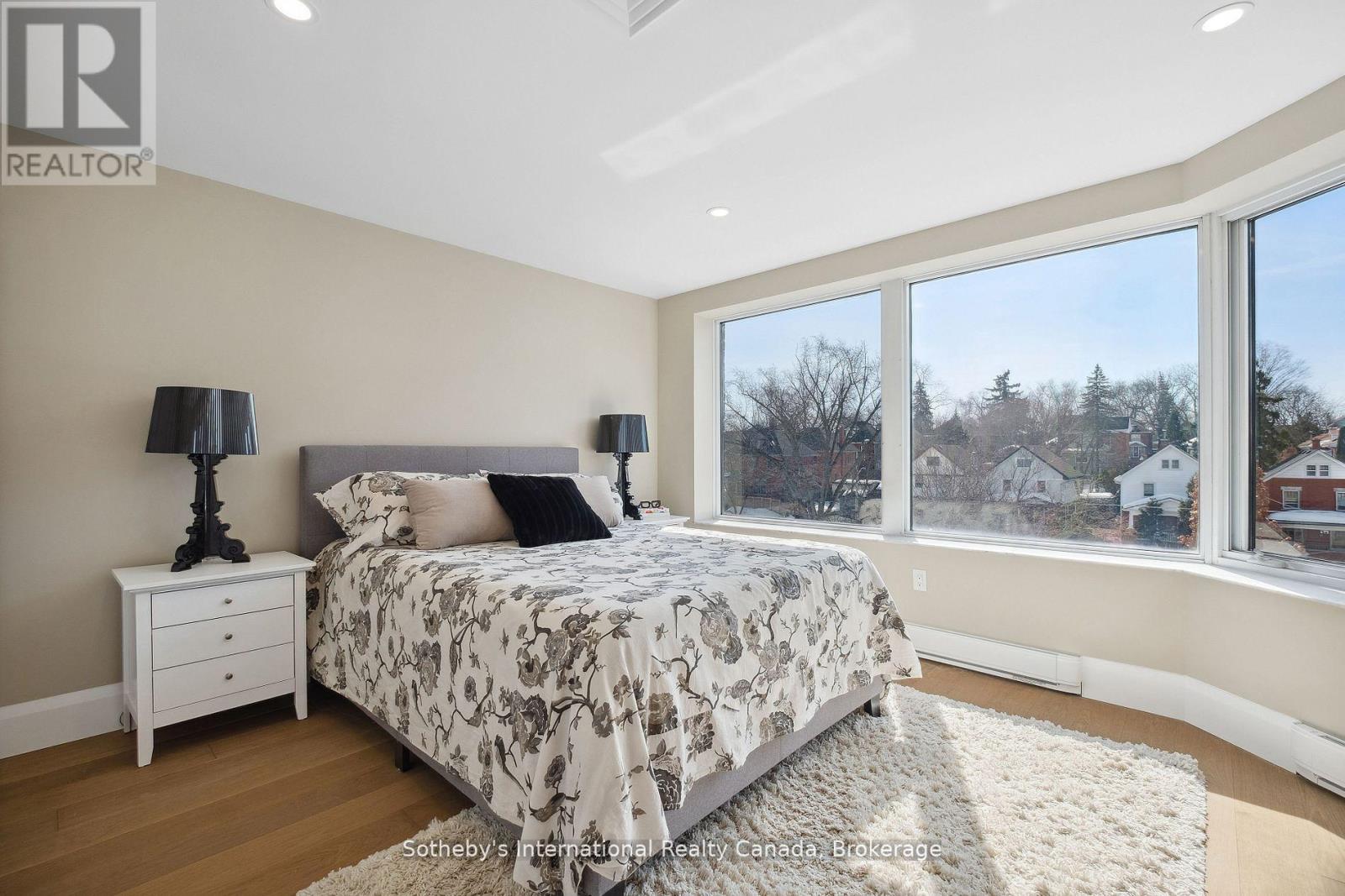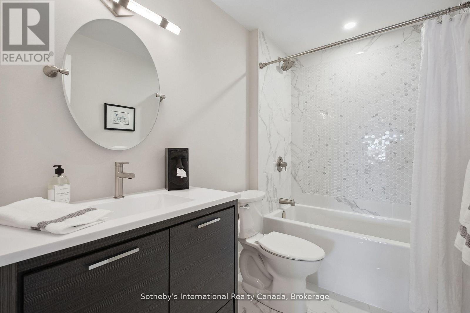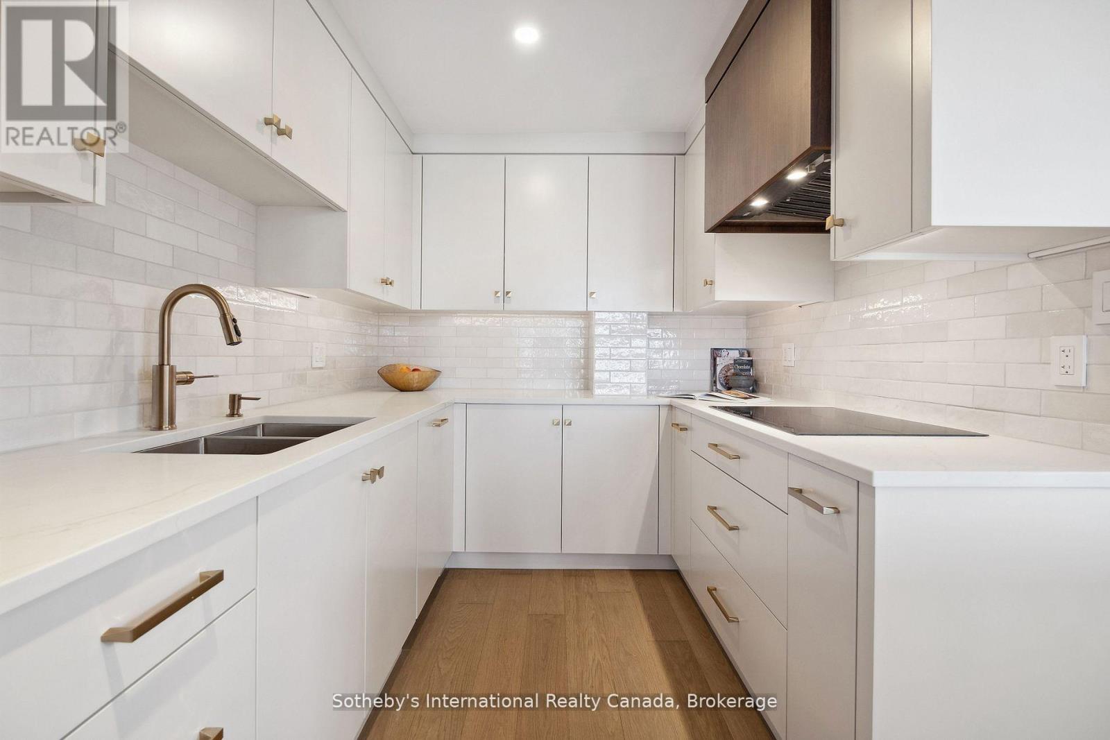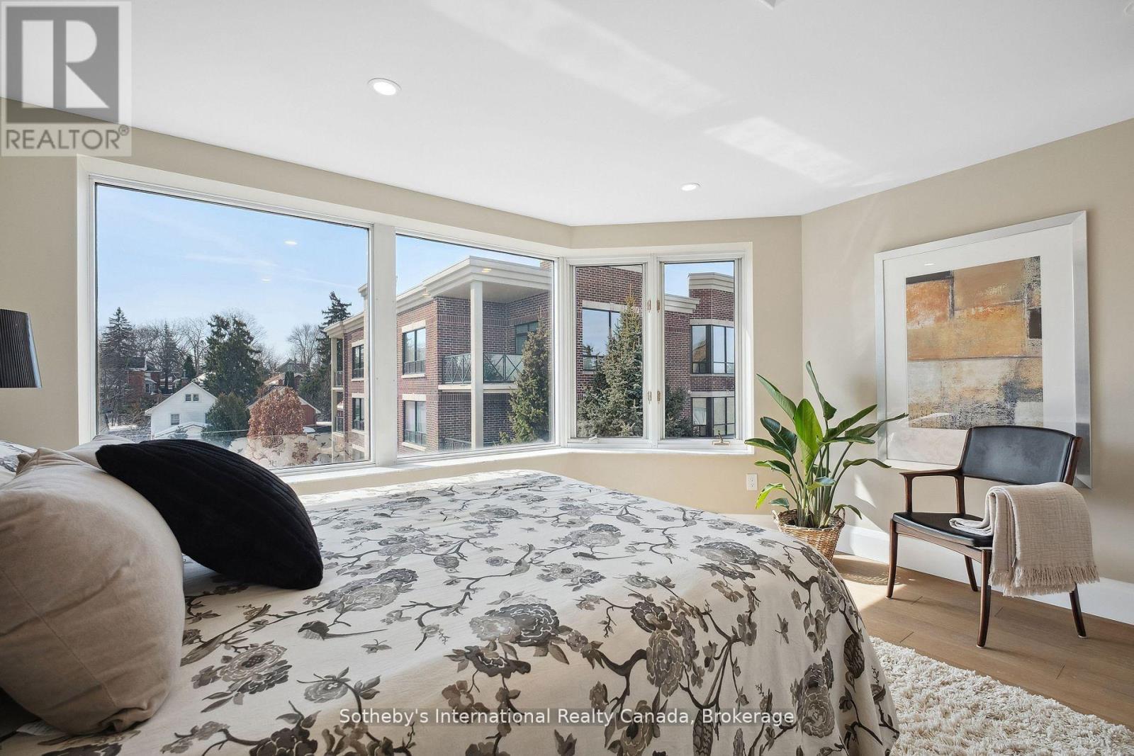 Perched above the picturesque Avon River, this spectacular penthouse at 30 Front Street isn't just a residence, it's a statement. A rare fusion of luxury, design, and location, this is where elevated living meets the cultural soul of Stratford. This one-of-a-kind suite redefines sophistication. Whether you're hosting champagne evenings on your private terrace or enjoying a quiet morning with theatre-district views, this penthouse is where your story unfolds and it's nothing short of extraordinary. Perfectly situated between the Festival and Tom Patterson theatres, this stunning top-corner unit offers an unbeatable location with southwest exposure, just steps from parks, restaurants, and all that downtown Stratford offers. This professionally redesigned residence at The Huntingdon boasts just over 1,500 sq. ft. of elegant living space with a smart, thoughtful layout. Featuring two spacious bedrooms with built-in closet systems, two full bathrooms with porcelain floors, and an inviting living room with vaulted ceilings, oversized windows, and a generous dining area, this suite is designed for comfort and style. A full wall of windows provides beautiful year-round views, while the large private corner terrace is perfect for morning coffee or evening cocktails. This floor plan includes added soundproofing, engineered European white oak flooring, and pot lights throughout. Custom walnut veneer cabinetry by Homestead Woodworking complements quartz countertops, a large island with extra storage, and top-tier integrated appliances: Fisher & Paykel wall oven, microwave, induction cooktop, and Bosch dishwasher. Includes deeded underground parking near the door and elevator, assigned locker, outdoor guest parking, controlled entry, visitor parking, and plans for EV charging. This pet-friendly, quiet building is home to professionals and theatre artists. Fully rebuilt with permits, this home offers a refined, maintenance-free lifestyle in Stratford's most desirable condo. (id:50787)