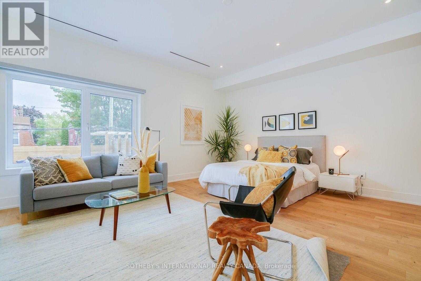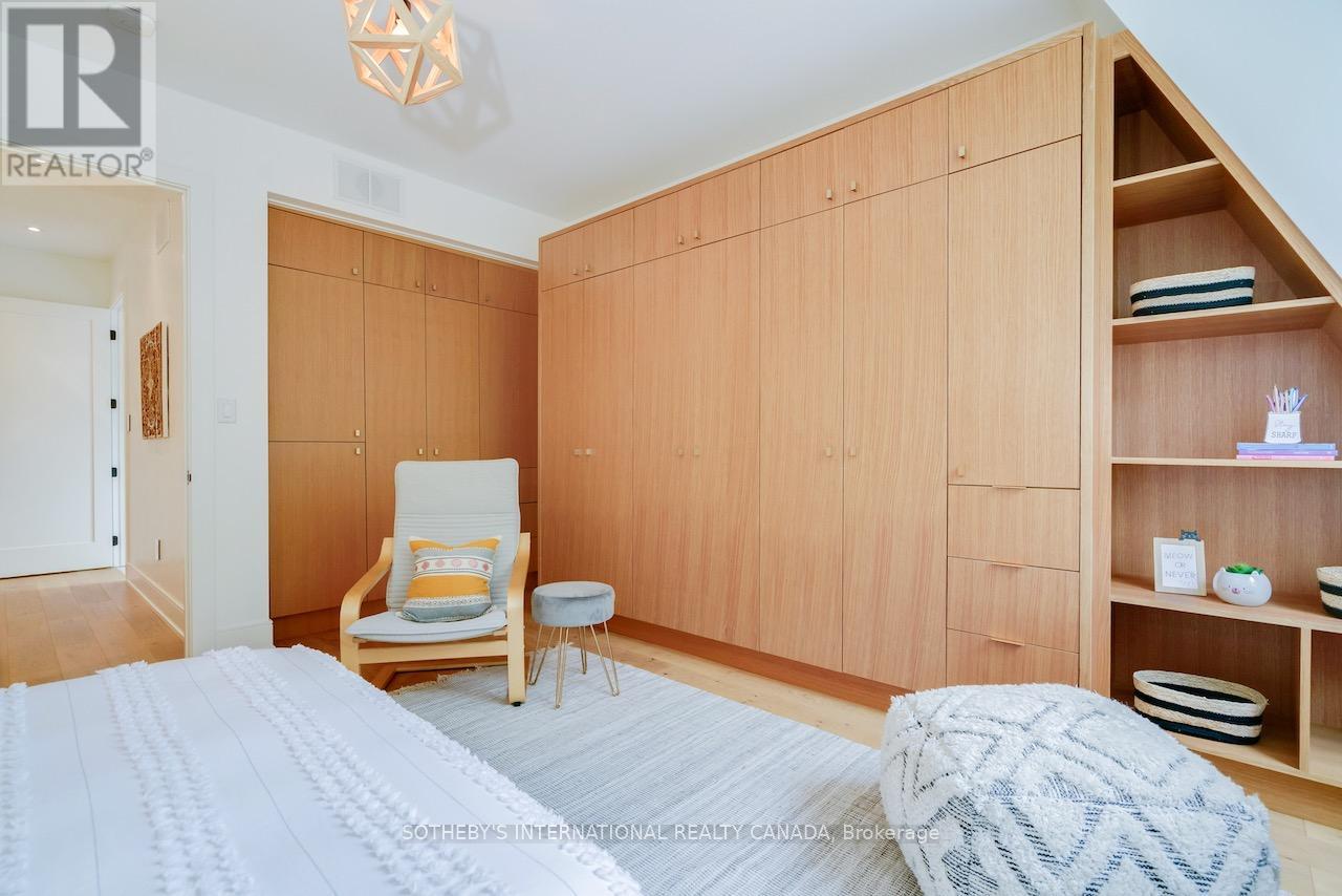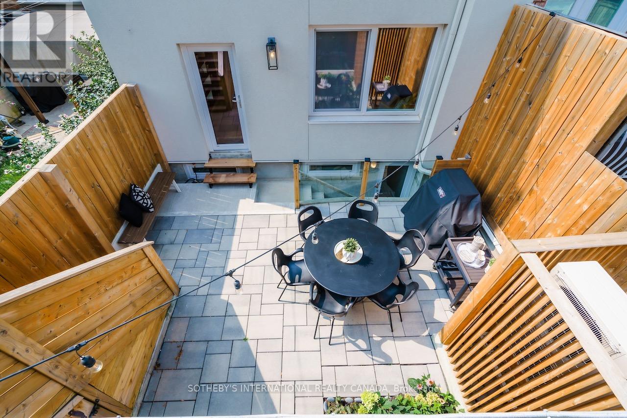 A rare Certified Passive Home in Queen West, this modern masterpiece is designed for both style and sustainability. Purpose-built to meet rigorous energy-efficiency standards, this ultra-low-cost home offers over 3,000 sq ft of above-ground living space, where sleek finishes and thoughtful details define an elevated urban lifestyle. The main floor welcomes you to a bright, open-concept layout featuring wide-plank hardwood floors, a statement staircase with glass railings, custom oak cabinetry, and designer LED lighting throughout. The chef's kitchen is a true showstopper complete with integrated high-end appliances, stone countertops, dramatic backsplash, and an oversized island with seating. The adjoining family room offers a seamless indoor-outdoor connection with a walkout to the private back patio. Upstairs, soaring 9ft ceilings enhance the sense of space and light. The serene primary suite features a walk-through closet with built-ins, a spa-like 4-pc ensuite, and large windows overlooking a private terrace. This level also includes a second bedroom with its own ensuite and a full laundry room. The third floor offers a stunning secondary primary retreat with a luxurious 5-pc ensuite featuring a soaker tub, extensive closet space, and direct access to a private rooftop deck. An additional large bedroom with generous storage completes this level. Bathrooms throughout are finished with premium fixtures by Gessi, Toto, and Nobili, complemented by floating vanities and wall-hung toilets. The lower level, with separate entrance, offers a spacious living and dining area, a 4-piece bath, and a generous bedroom-ideal for an in-law, guest, or nanny suite. A detached two-car garage wired for an EV charger and a rooftop terrace further enhance the outdoor lifestyle. Steps to the shops, cafes, and restaurants of Queen West and Ossington, and minutes to the future King-Liberty GO Station, this exceptional home delivers a rare blend of luxury, and urban convenience. (id:50787)