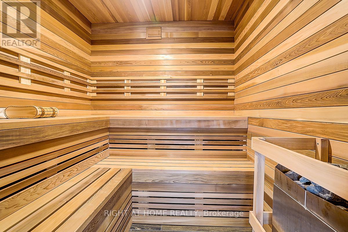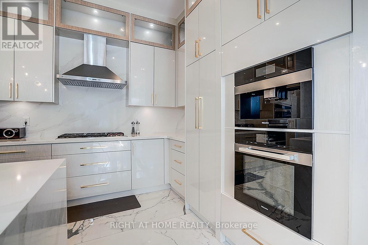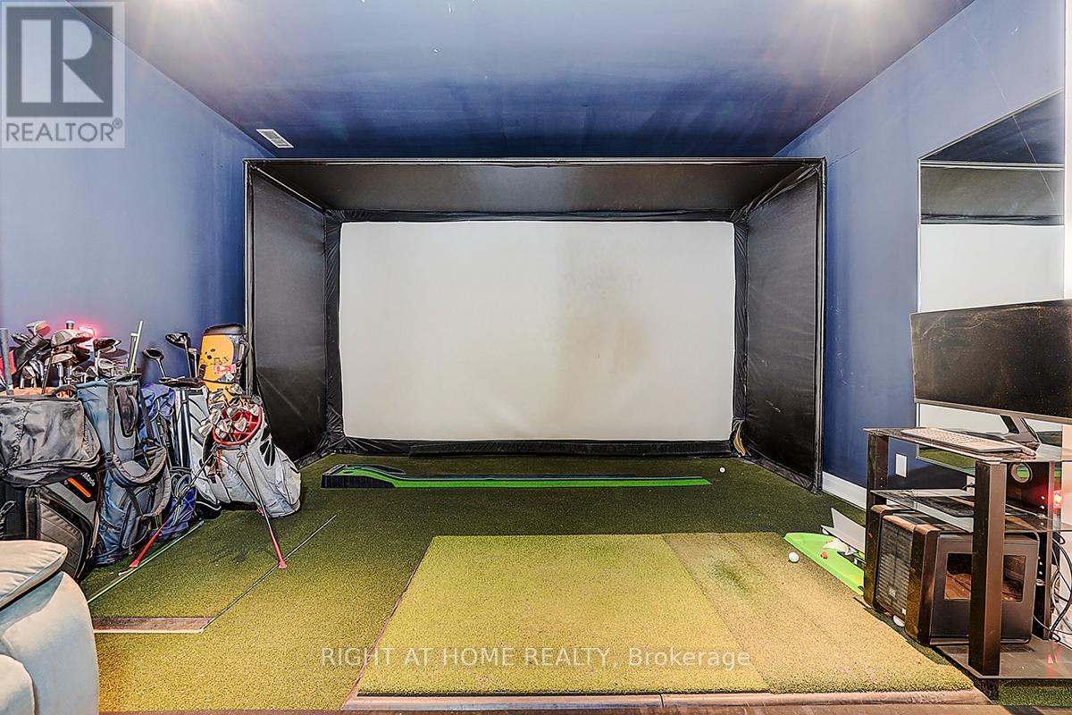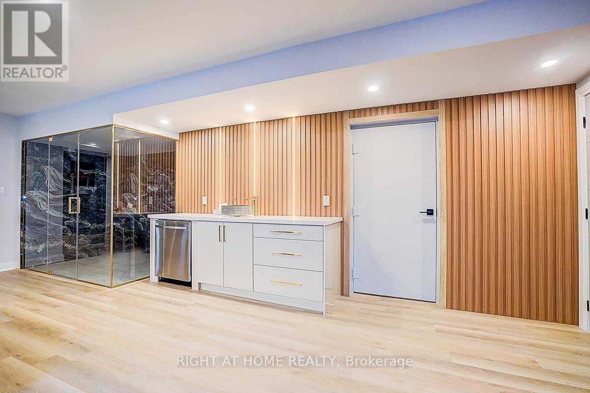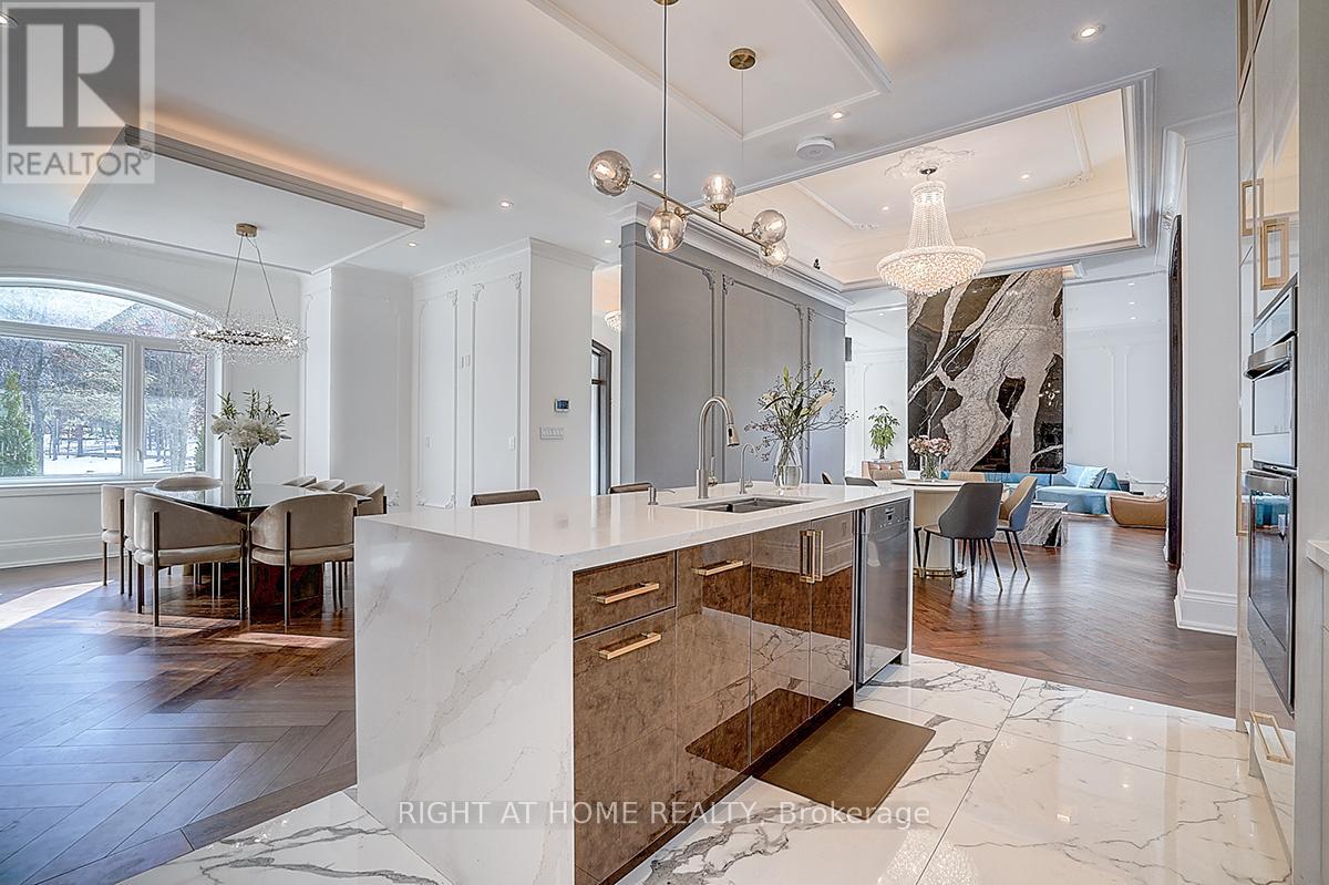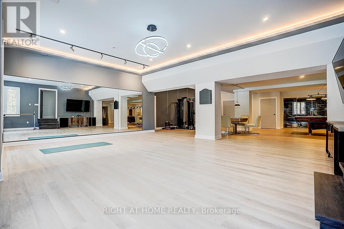Rare Modern French Luxury Bungalow Estate. A rare offering in today's market, this exceptional Modern French-inspired luxury bungalow redefines high-end living by seamlessly combining estate-level luxury with unparalleled everyday convenience-all on one expansive level. Set on a 2-acre private lot backing onto an endless forest, the home welcomes you with a crescent-shaped driveway and refined architectural detailing. Inside 12' ceiling (Main), solid walnut chevron flooring, custom plaster wall trims, medallion ceilings, and a dramatic floating marble TV and fireplace wall reflect timeless Modern French craftsmanship. The gourmet kitchen is fully equipped with elite appliances, including a 72" see-through Sub-Zero refrigerator and freezer, Wolf gas cooktop, and Miele built-in coffee machine, steam oven, and dishwasher-designed to elevate daily living hile supporting effortless entertaining. The main-level primary suite offers a true spa retreat, featuring a luxury ensuite bathroom with wet sauna, premium fixtures, and smart toilets that enhance comfort and hygiene throughout. An elegant entryway with floating custom cabinetry provides discreet and functional storage. What truly sets this bungalow apart is its fully developed 3,000-square-foot lower level, thoughtfully designed for both lifestyle and recreation. It includes a professional dance studio (10'), gym, walk-in temperature-controlled wine cellar, traditional wood sauna, snooker area, private Home Theater, and an additional ensuite bedroom-ensuring space for every passion without sacrificing main-floor convenience. The three-car garage features a golf simulator room and an upper loft offering exceptional flexibility. Outdoor living is elevated with a super-sized concrete rooftop deck, creating a four-season retreat surrounded by nature. An extended concrete driveway into the backyard further enhances functionality and scale. (id:50787)