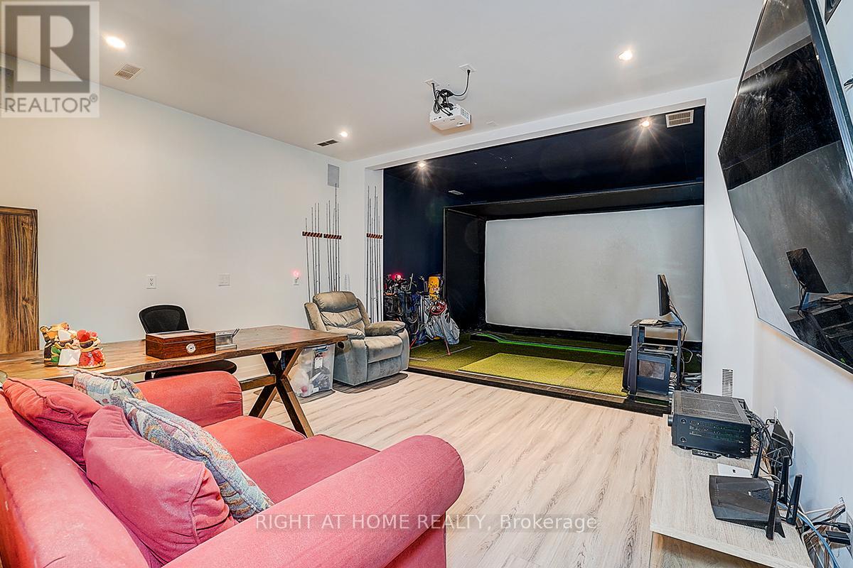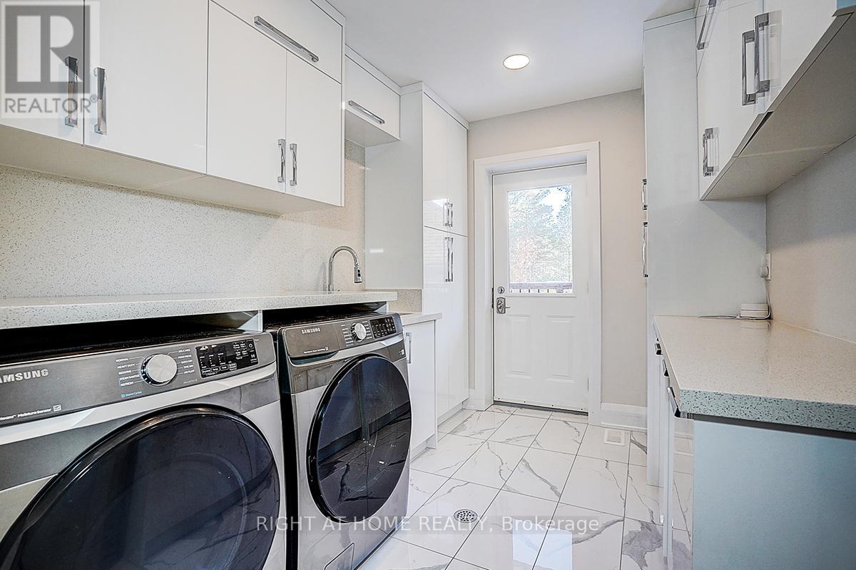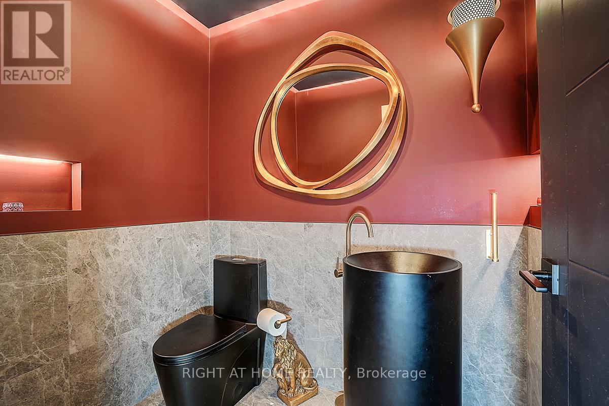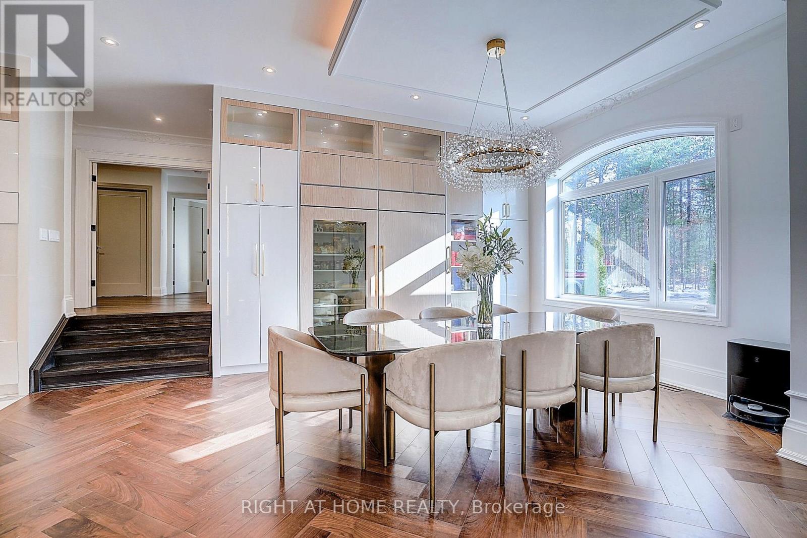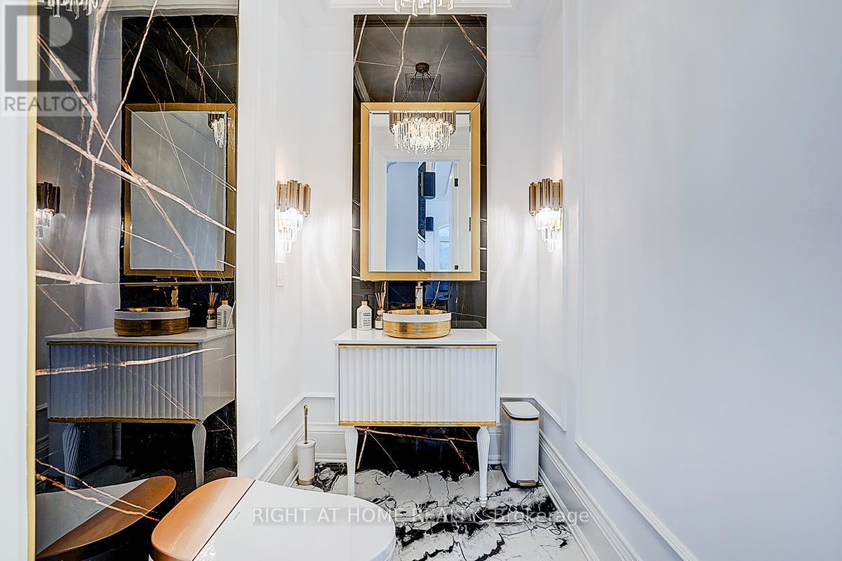 Rare Modern French Luxury Bungalow Estate. A rare offering in today's market, this exceptional Modern French-inspired luxury bungalow redefines high-end living by seamlessly combining estate-level luxury with unparalleled everyday convenience-all on one expansive level. Set on a 2-acre private lot backing onto an endless forest, the home welcomes you with a crescent-shaped driveway and refined architectural detailing. Inside 12' ceiling (Main), solid walnut chevron flooring, custom plaster wall trims, medallion ceilings, and a dramatic floating marble TV and fireplace wall reflect timeless Modern French craftsmanship. The gourmet kitchen is fully equipped with elite appliances, including a 72" see-through Sub-Zero refrigerator and freezer, Wolf gas cooktop, and Miele built-in coffee machine, steam oven, and dishwasher-designed to elevate daily living hile supporting effortless entertaining. The main-level primary suite offers a true spa retreat, featuring a luxury ensuite bathroom with wet sauna, premium fixtures, and smart toilets that enhance comfort and hygiene throughout. An elegant entryway with floating custom cabinetry provides discreet and functional storage. What truly sets this bungalow apart is its fully developed 3,000-square-foot lower level, thoughtfully designed for both lifestyle and recreation. It includes a professional dance studio (10'), gym, walk-in temperature-controlled wine cellar, traditional wood sauna, snooker area, private Home Theater, and an additional ensuite bedroom-ensuring space for every passion without sacrificing main-floor convenience. The three-car garage features a golf simulator room and an upper loft offering exceptional flexibility. Outdoor living is elevated with a super-sized concrete rooftop deck, creating a four-season retreat surrounded by nature. An extended concrete driveway into the backyard further enhances functionality and scale. (id:50787)
