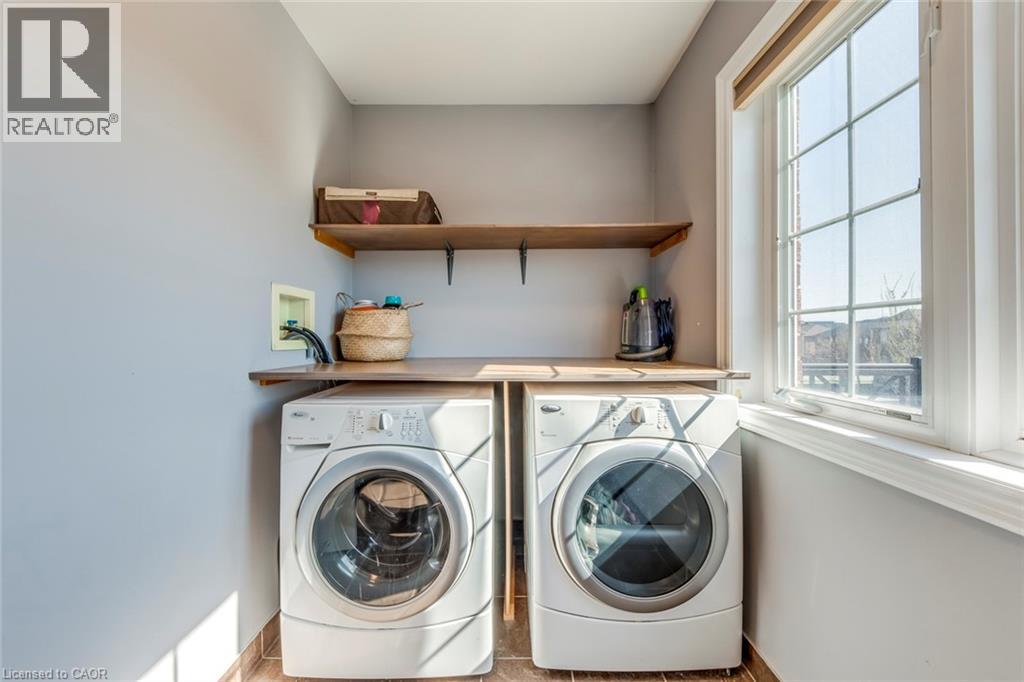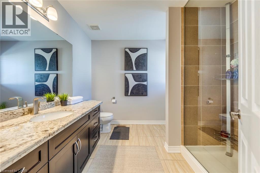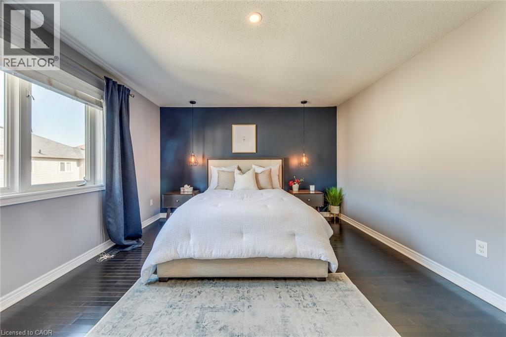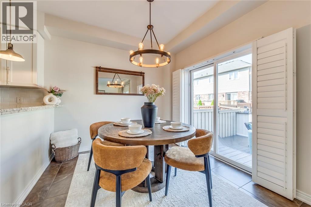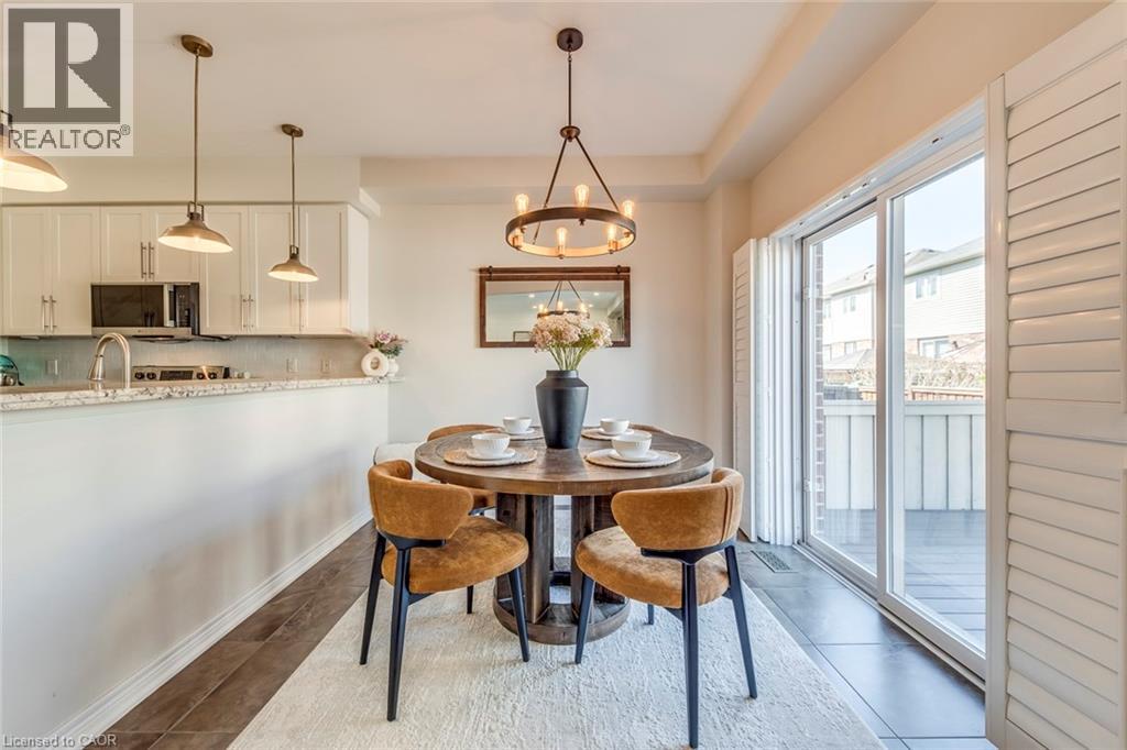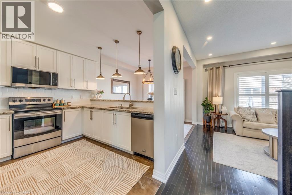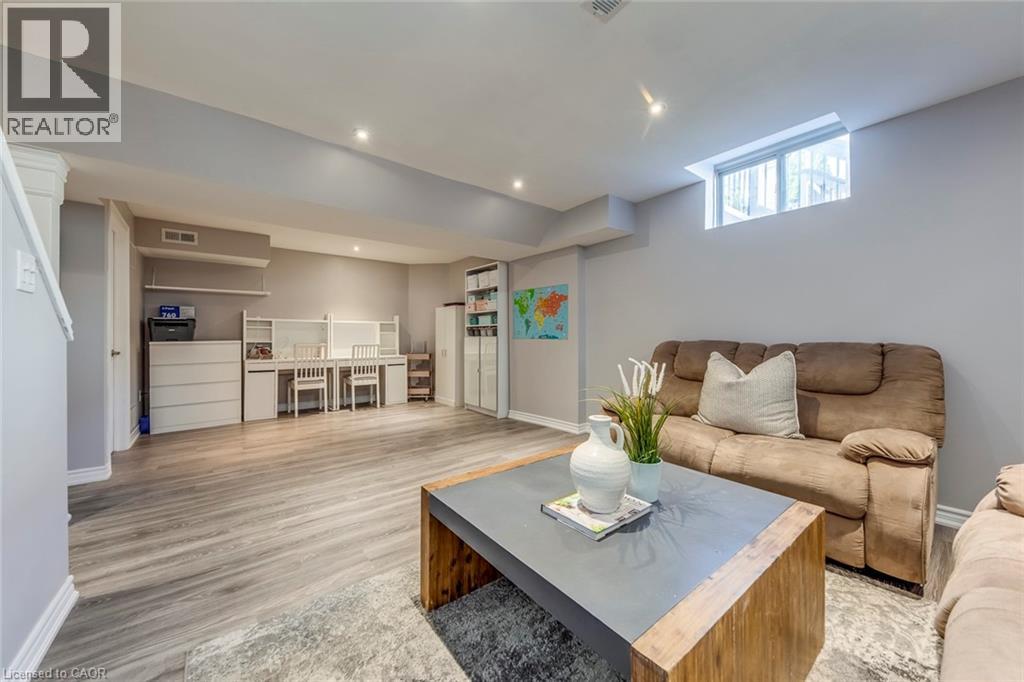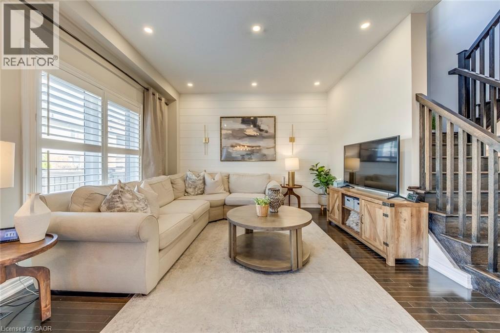 Welcome to this beautifully upgraded semi-detached home in Burlington's highly sought-after Alton Village-offering a perfect blend of modern style, functional layout, and move-in-ready comfort.Step inside to a bright and inviting main floor featuring 9-ft ceilings, rich hardwood flooring, and bright pot lighting. The open-concept living and dining area flows seamlessly into a spacious family room, creating an ideal setting for both everyday living and entertaining. The renovated kitchen (2020) is a standout, showcasing white cabinetry, granite countertops, modern backsplash, and expanded prep space, with a cozy breakfast area overlooking the backyard. Upstairs, you will find three generously sized bedrooms, including a spacious primary retreat complete with a walk-in closet with custom built-in cabinetry and private ensuite. Two additional bedrooms share a well-appointed main bath, while the convenient second-floor laundry room adds everyday practicality.The fully finished basement (freshly painted in 2026) offers excellent additional living space, including a large rec room, dedicated office (or potential 4th bedroom), and ample storage-perfect for growing families or those working from home.Exterior features include interlock landscaping in the front and backyard, a large low-maintenance yard, and a freshly stained deck (2025), ideal for outdoor entertaining.Additional upgrades include: solid oak staircase, upgraded bathroom vanities with granite counters, pot lights (2019), main floor repaint (2024), smart Ecobee thermostat, and updated fixtures throughout.Located close to top-rated schools, parks, shopping, and all amenities, this home offers exceptional value in one of Burlington's most desirable family-friendly communities. (id:50787)