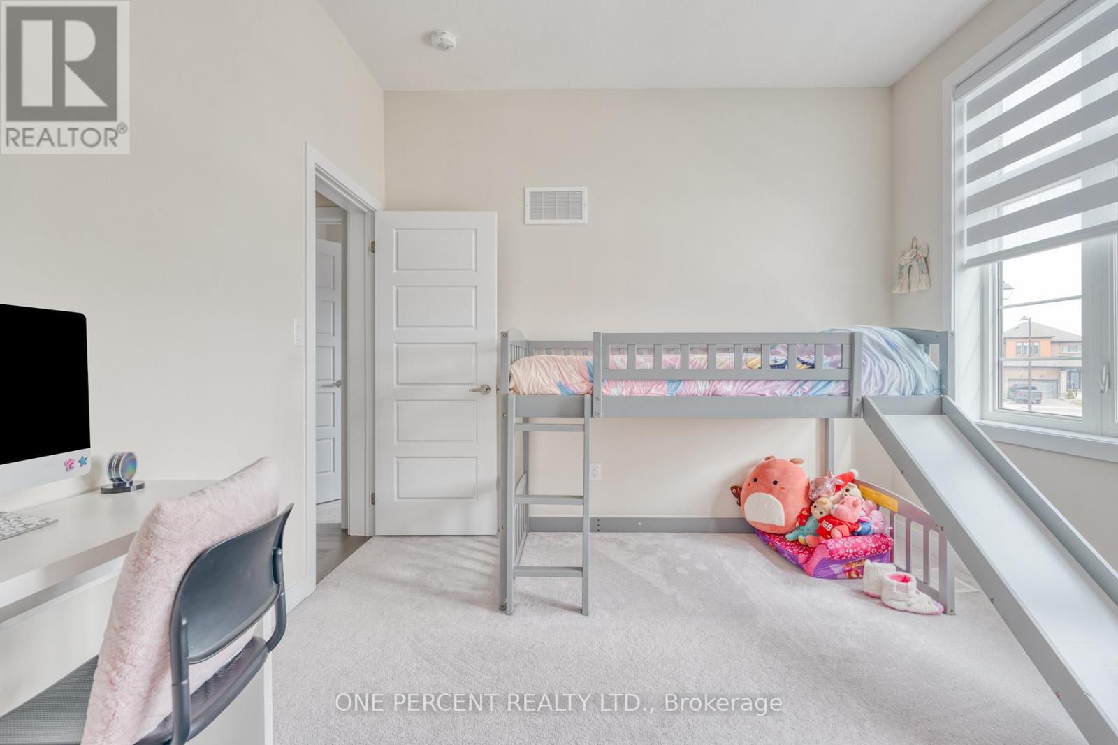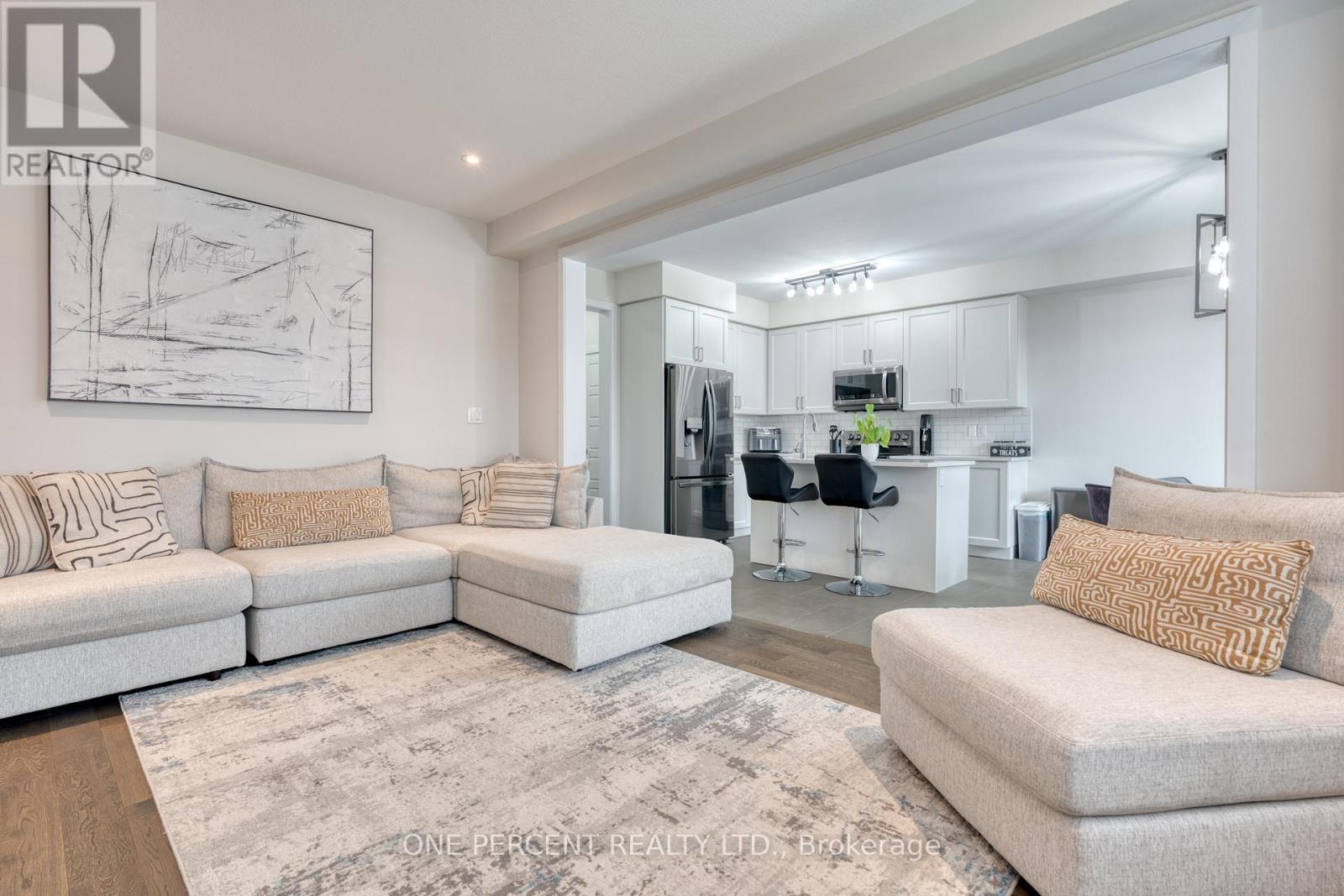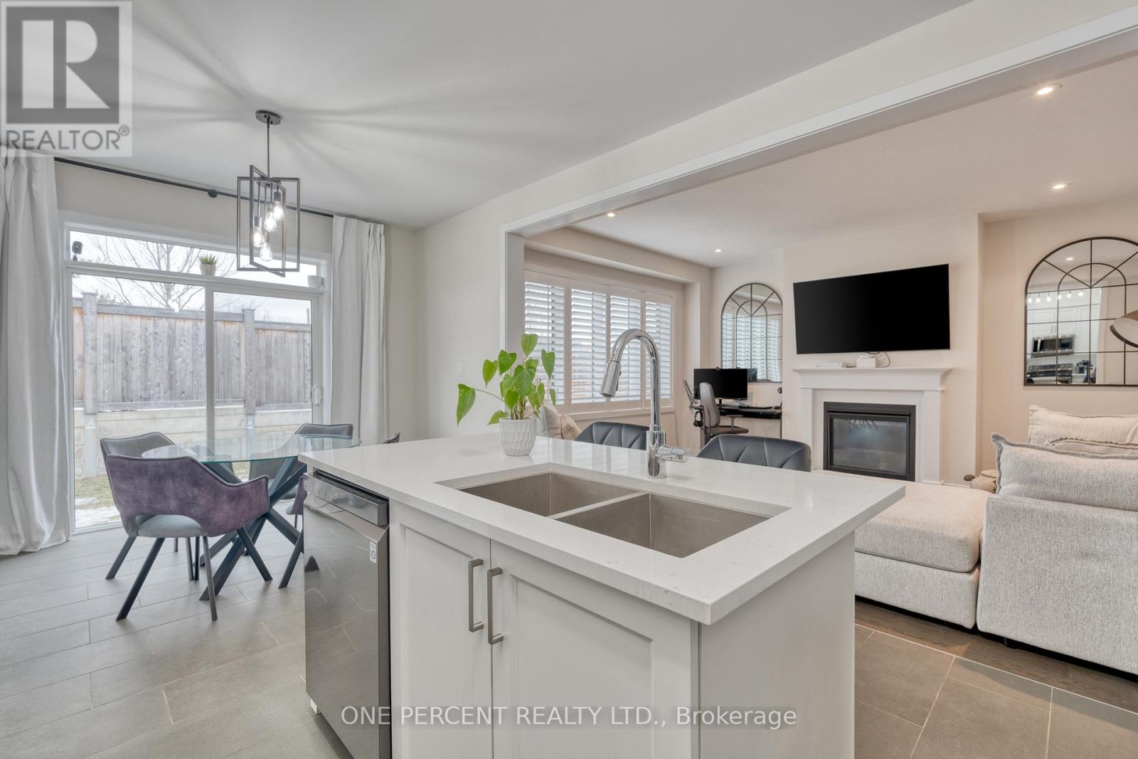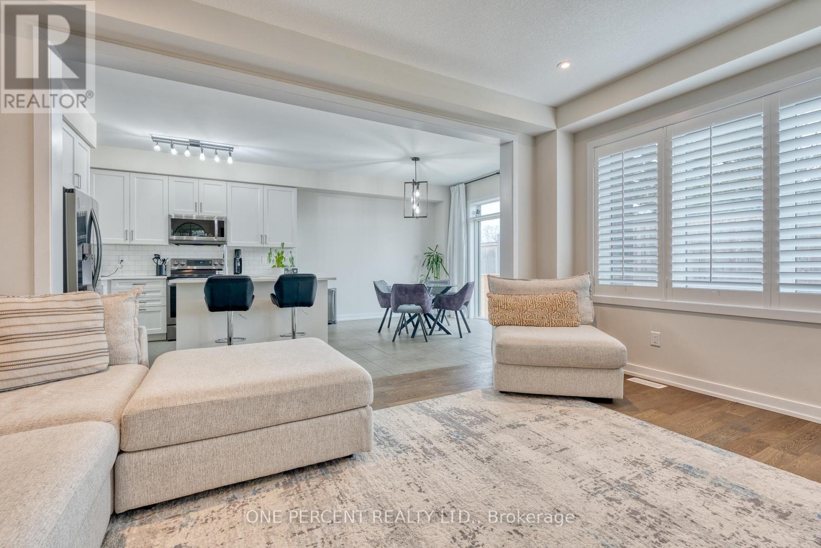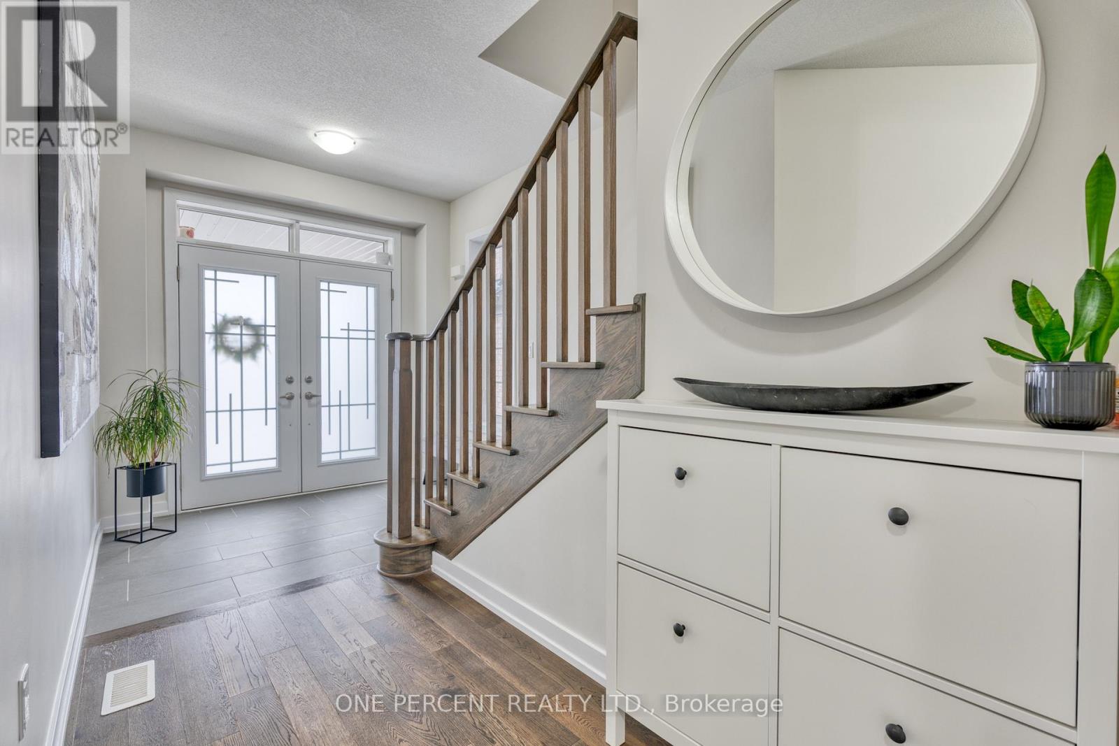 Situated in a quiet neighborhood near the Grand River, this 1,893 square foot home is less than two years old and has been well-maintained. The interior features nine-foot ceilings and hardwood flooring across the entire main level, complemented by a matching oak staircase. The kitchen is finished with quartz countertops, dark stainless steel appliances, and shaker cabinetry. In the adjacent great room, large picture windows with California shutters provide natural light, and a gas fireplace serves as a central point for the space. The second level includes four bedrooms and a dedicated laundry room for convenience. The primary suite serves as a quiet retreat, featuring a walk-in closet and an ensuite bathroom with a frameless glass shower. For those looking for additional space, the large basement remains unfinished and is ready for a personal layout or extra storage. The exterior includes an oversized garage and a driveway with space for three vehicles. This location offers a practical balance of nature and amenities, with easy access to the river trails as well as local schools, grocery stores, and medical services within the Caledonia community. (id:50787)