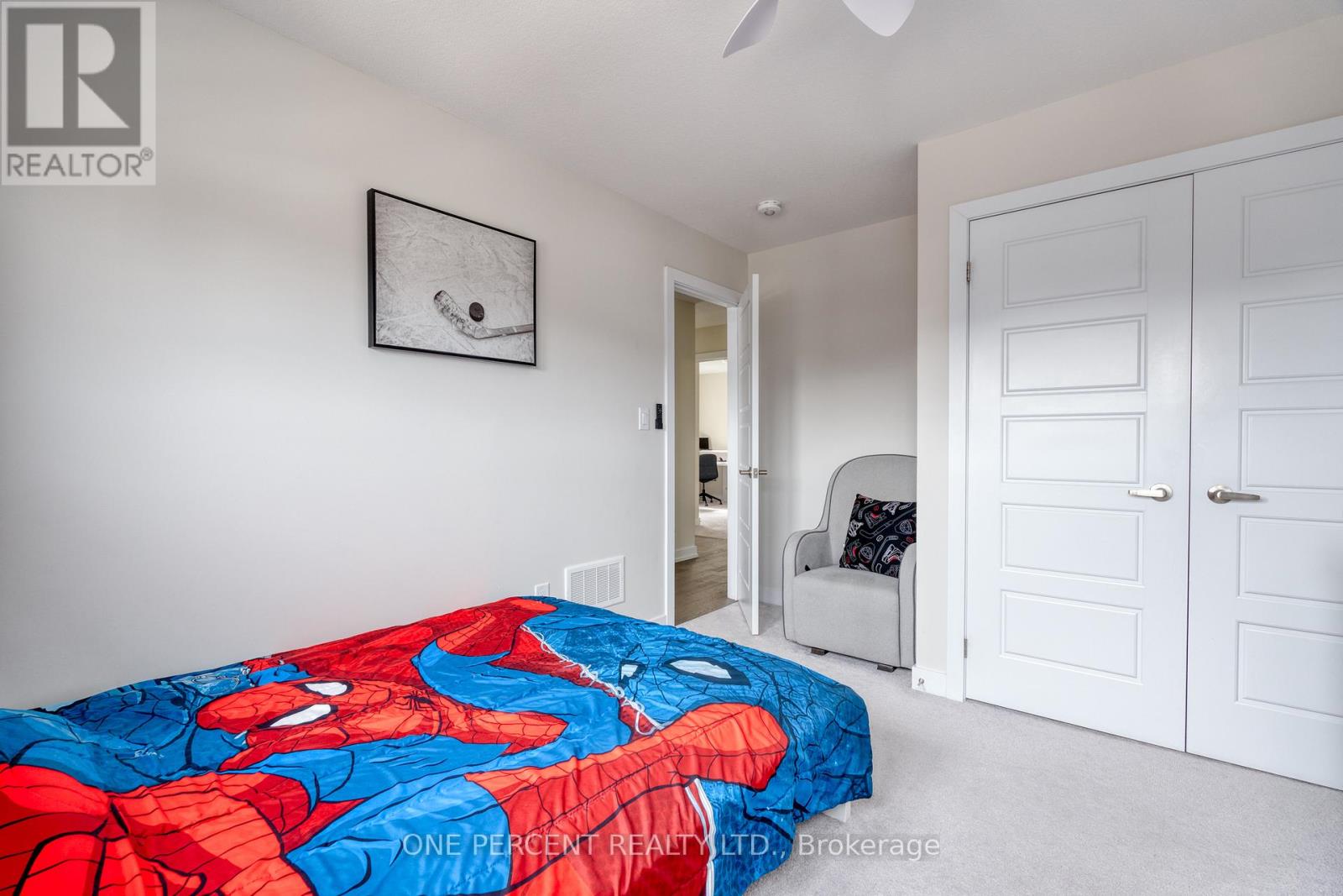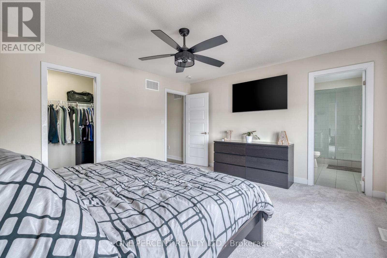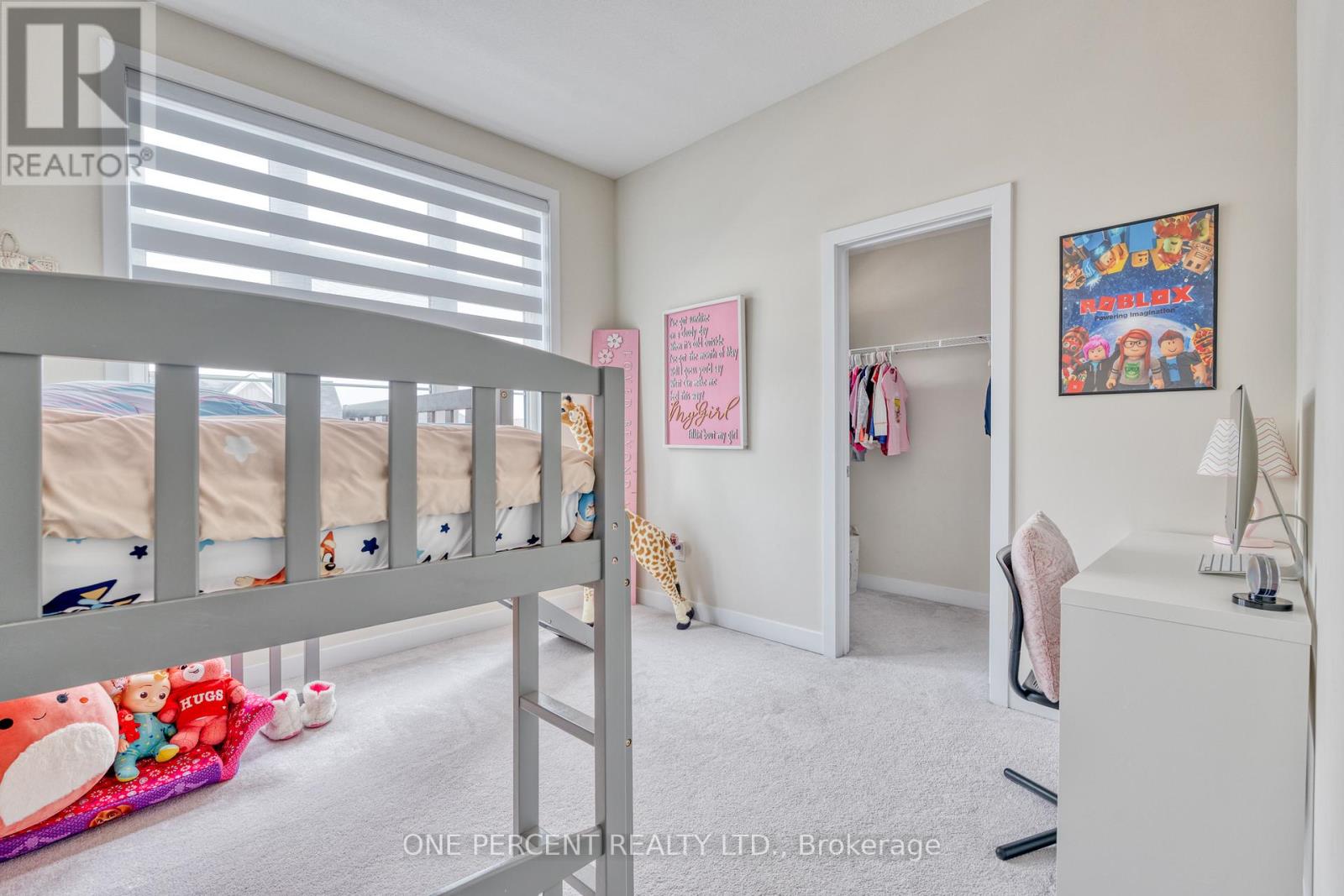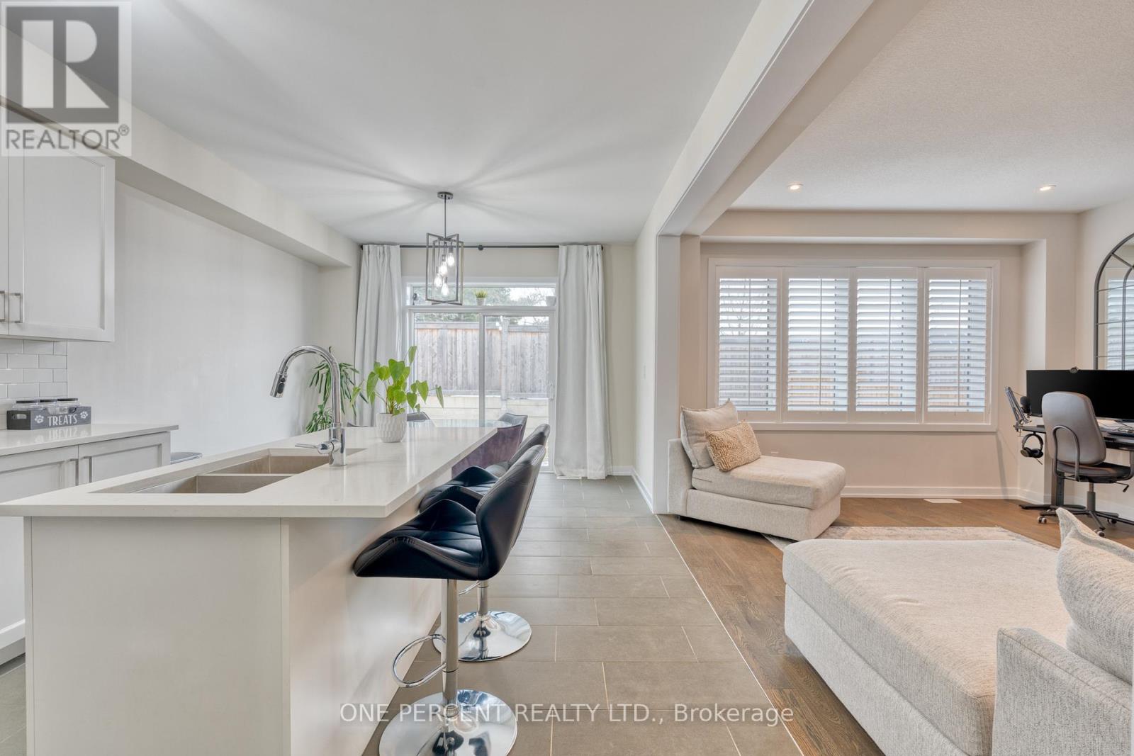 Situated in a quiet neighborhood near the Grand River, this 1,893 square foot home is less than two years old and has been well-maintained. The interior features nine-foot ceilings and hardwood flooring across the entire main level, complemented by a matching oak staircase. The kitchen is finished with quartz countertops, dark stainless steel appliances, and shaker cabinetry. In the adjacent great room, large picture windows with California shutters provide natural light, and a gas fireplace serves as a central point for the space. The second level includes four bedrooms and a dedicated laundry room for convenience. The primary suite serves as a quiet retreat, featuring a walk-in closet and an ensuite bathroom with a frameless glass shower. For those looking for additional space, the large basement remains unfinished and is ready for a personal layout or extra storage. The exterior includes an oversized garage and a driveway with space for three vehicles. This location offers a practical balance of nature and amenities, with easy access to the river trails as well as local schools, grocery stores, and medical services within the Caledonia community. (id:50787)