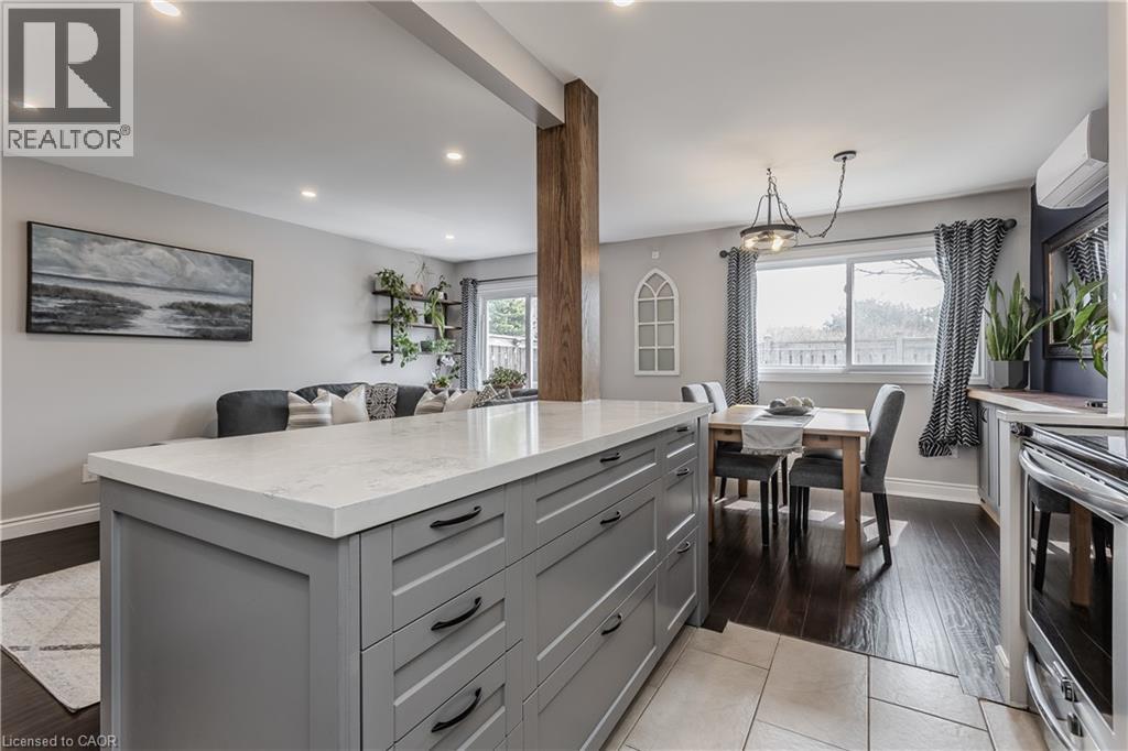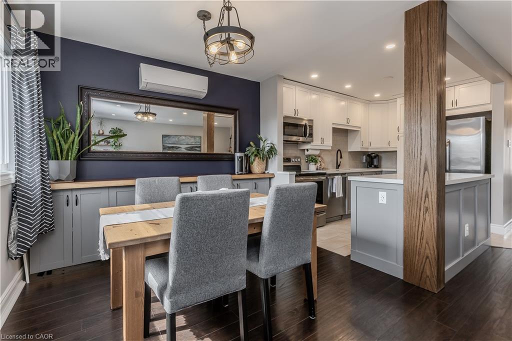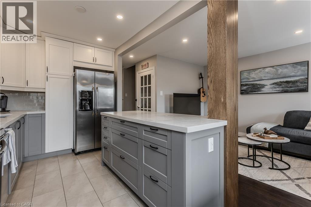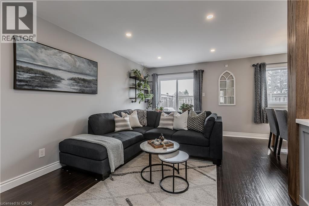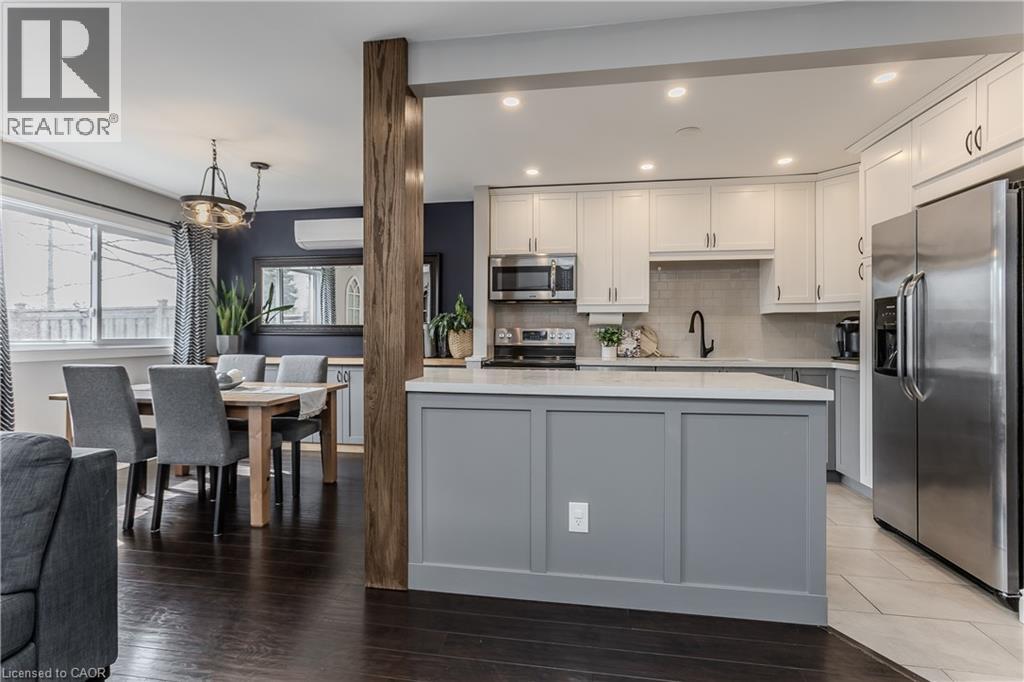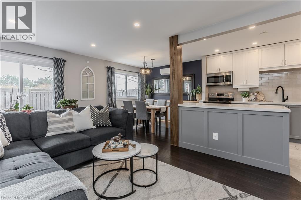 Welcome to this beautifully maintained townhouse condo, perfectly suited for growing families seeking comfort, style, and convenience. Nestled in a family-friendly neighbourhood just steps to everyday essentials and a short walk to the lake, this home offers the ideal blend of lifestyle and location. From the moment you arrive, the charming curb appeal sets the tone with a mature tree, interlock walkway, covered cedar wood porch-an inviting space to unwind, and new front door with premium retractable phantom screen (2019). The garage offers added convenience with bonus storage above. Inside, the main level showcases a bright, open-concept layout with wood/tile flooring throughout, skimmed ceiling and pot lights (2022) enhanced by smart switches. A welcoming foyer with wainscoting leads into the heart of the home. The fully renovated kitchen (2025) is a standout, featuring premium quartz countertops, centre island, custom cabinetry, subway tile backsplash, SS appliances, and a new Bosch dishwasher (2025), all accented by a warm white oak wood beam. The dining area includes a built-in credenza, while the living room offers a seamless walkout to the backyard-perfect for everyday living and entertaining. A convenient 2-piece powder room completes the main level. Upstairs, you'll find three generously sized bedrooms and a 4-piece main bathroom with an oversized vanity, providing plenty of space for the whole family. The fully finished lower level adds valuable living space with a spacious rec room, dedicated home office area, laundry, and ample storage area with built-in racks. Pot lights with smart switches are continued throughout. Step outside to a fully fenced backyard featuring a slate grey composite tile patio, awning, and green space for kids or pets to play. Additional perks include a fully updated HVAC system, with ductless units. A fantastic opportunity to enjoy turnkey living in a vibrant, family-oriented community close to shopping, parks, and more. (id:50787)