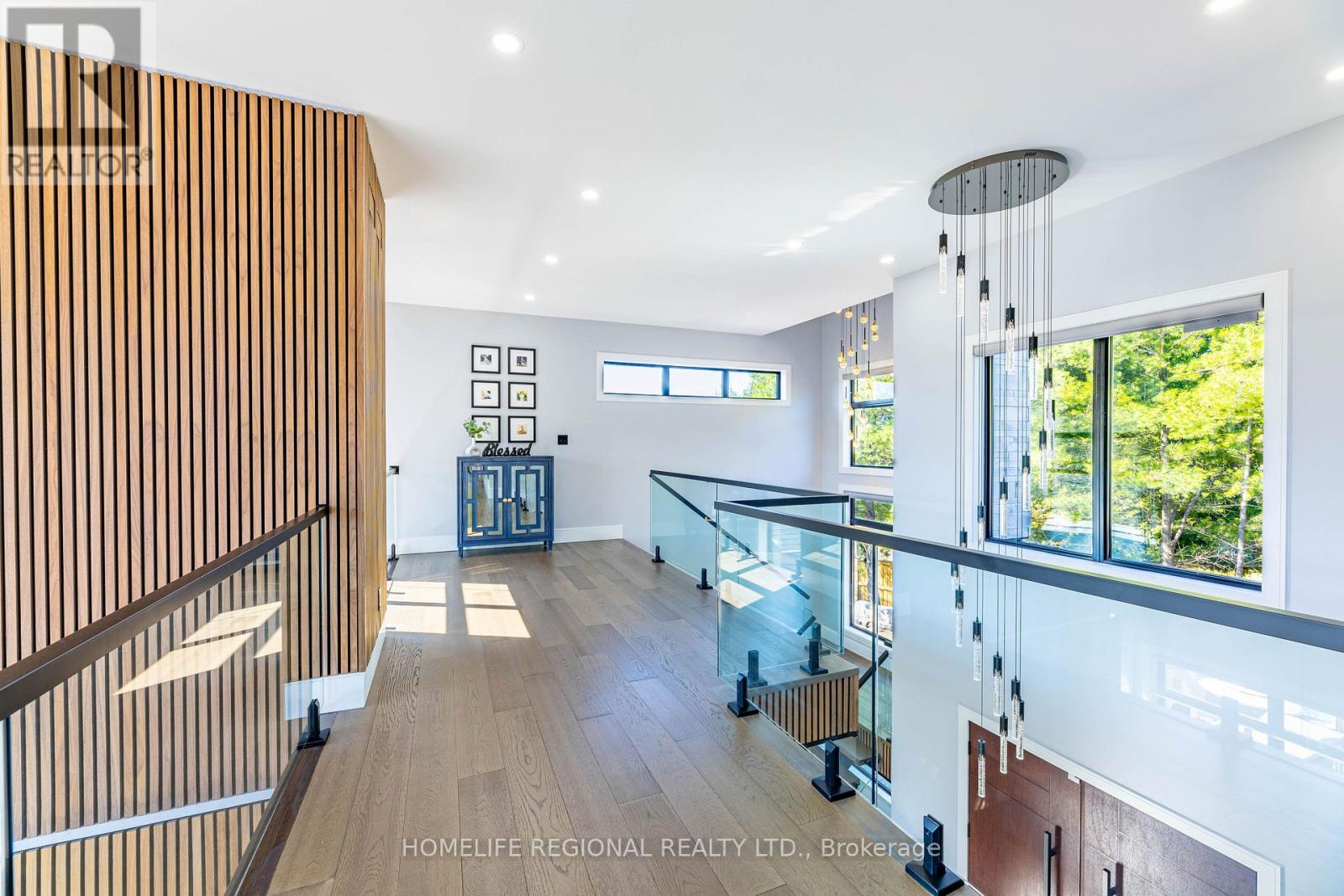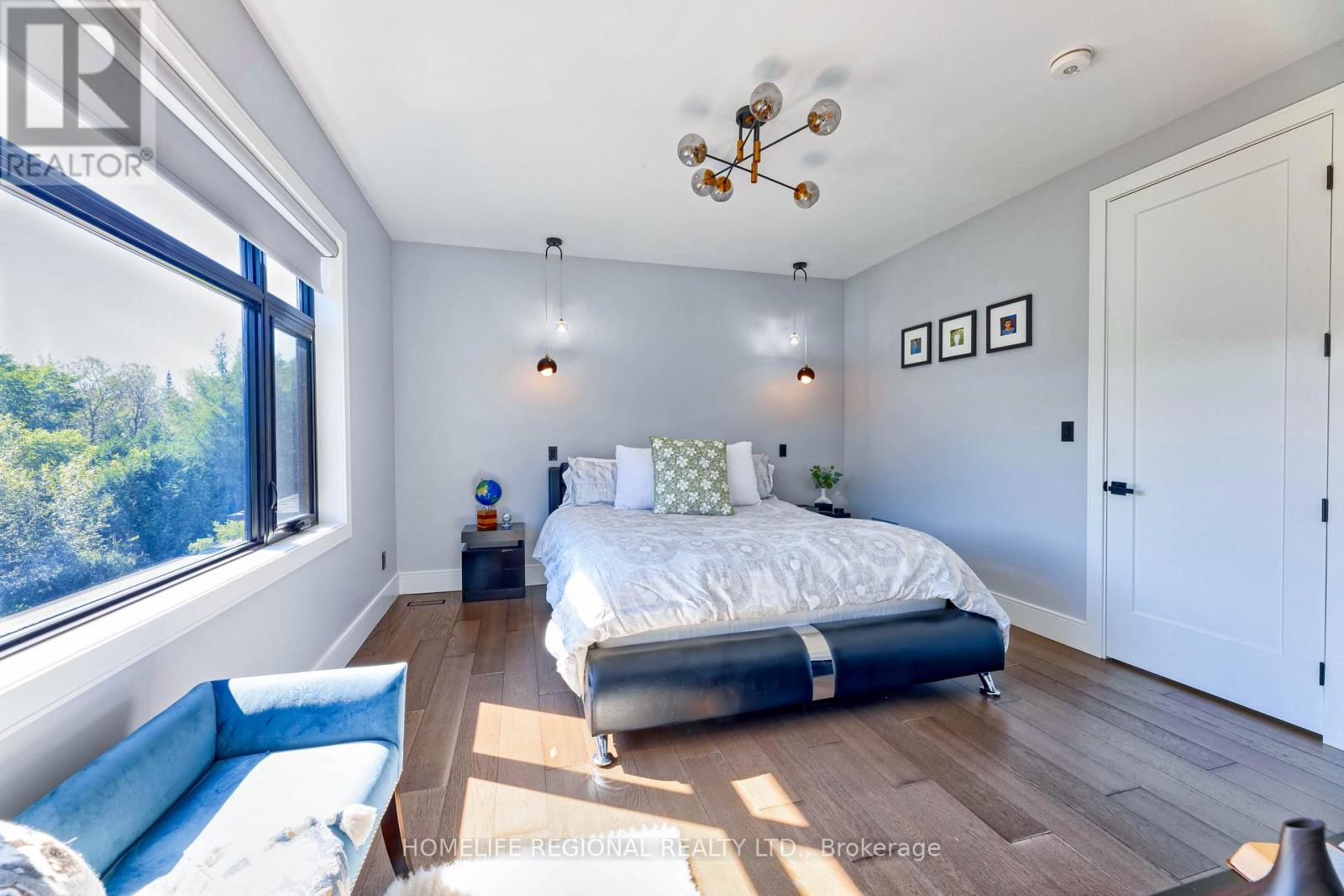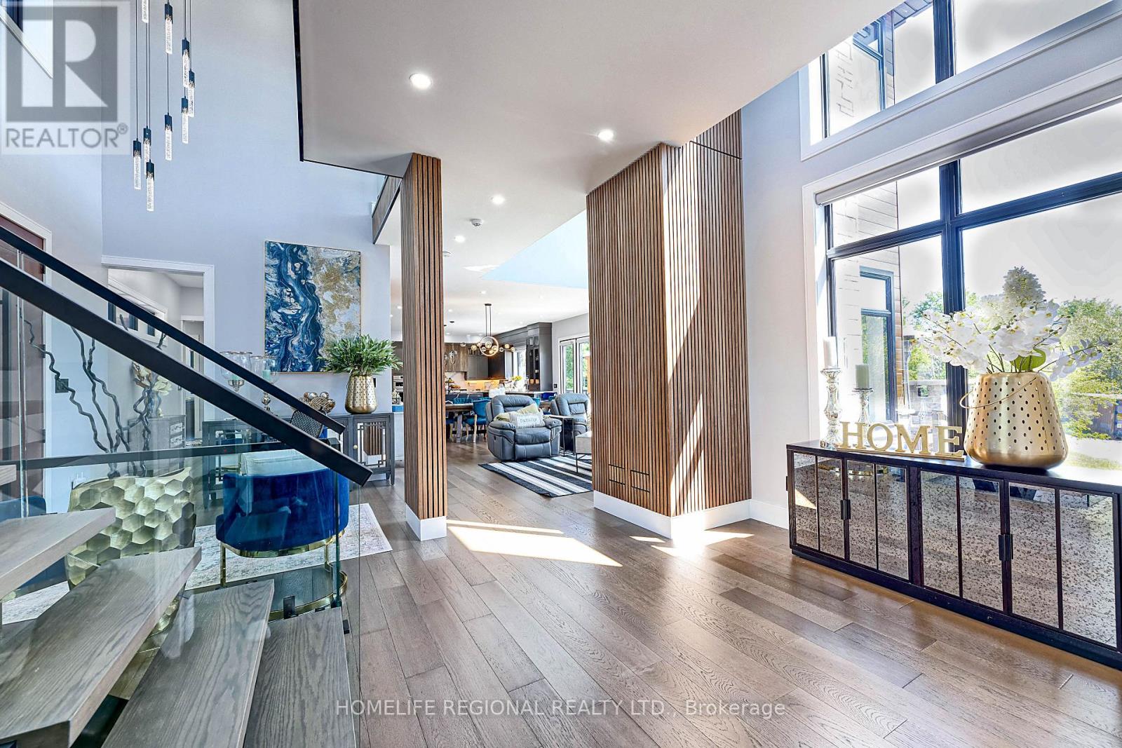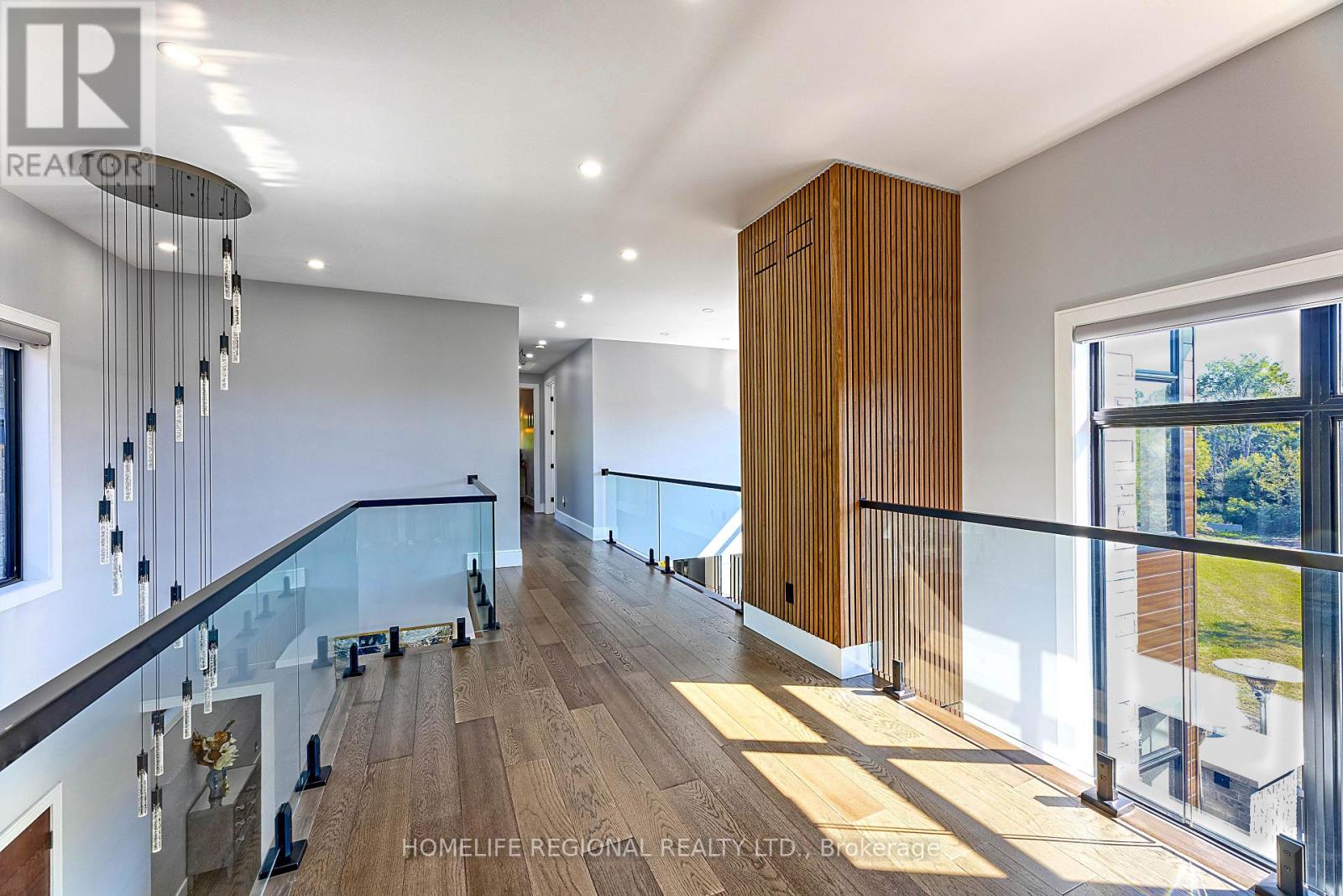 Welcome to 5329 First Line an architectural masterpiece nestled in nature, where luxury meets serenity. This exceptional property offers approximately 7,000 sq. ft. total of luxurious living space, and approximately 4111 sq. ft. above ground! Set on a quiet rural road and nestled on a breathtaking 10-acre lot, including 8 acres of pristine conservation land with walking trails. Featuring 4 spacious bedrooms and 5 bathrooms, each bedroom comes complete with its own walk-in closet and private ensuite bathroom, delivering comfort, privacy, and elegance at every turn. The open-concept main floor boasts soaring ceilings in the great room, a gourmet kitchen with an oversized waterfall island, walk-in pantry, and access to multiple decks perfect for seamless indoor-outdoor living. The fully finished lower level includes a stunning wet bar area with a built-in pizza oven and charcoal BBQ, plus a rough-in for a hot tub ideal for entertaining or relaxing in style. The oversized heated 3-car garage is equipped with Wi-Fi-enabled door openers, Massive 10x10 oversized garage doors, and roughed-in EV charging outlets. A short walk to the Eramosa River, great for fishing and exploring. This is a rare opportunity for the discerning buyer seeking a private, show-stopping home that combines luxury, functionality, and the beauty of nature. If you have been searching for something truly special, your search ends here. Please see attached for an unparalleled level of upgrades, features, and chattels too many to list. (id:50787)