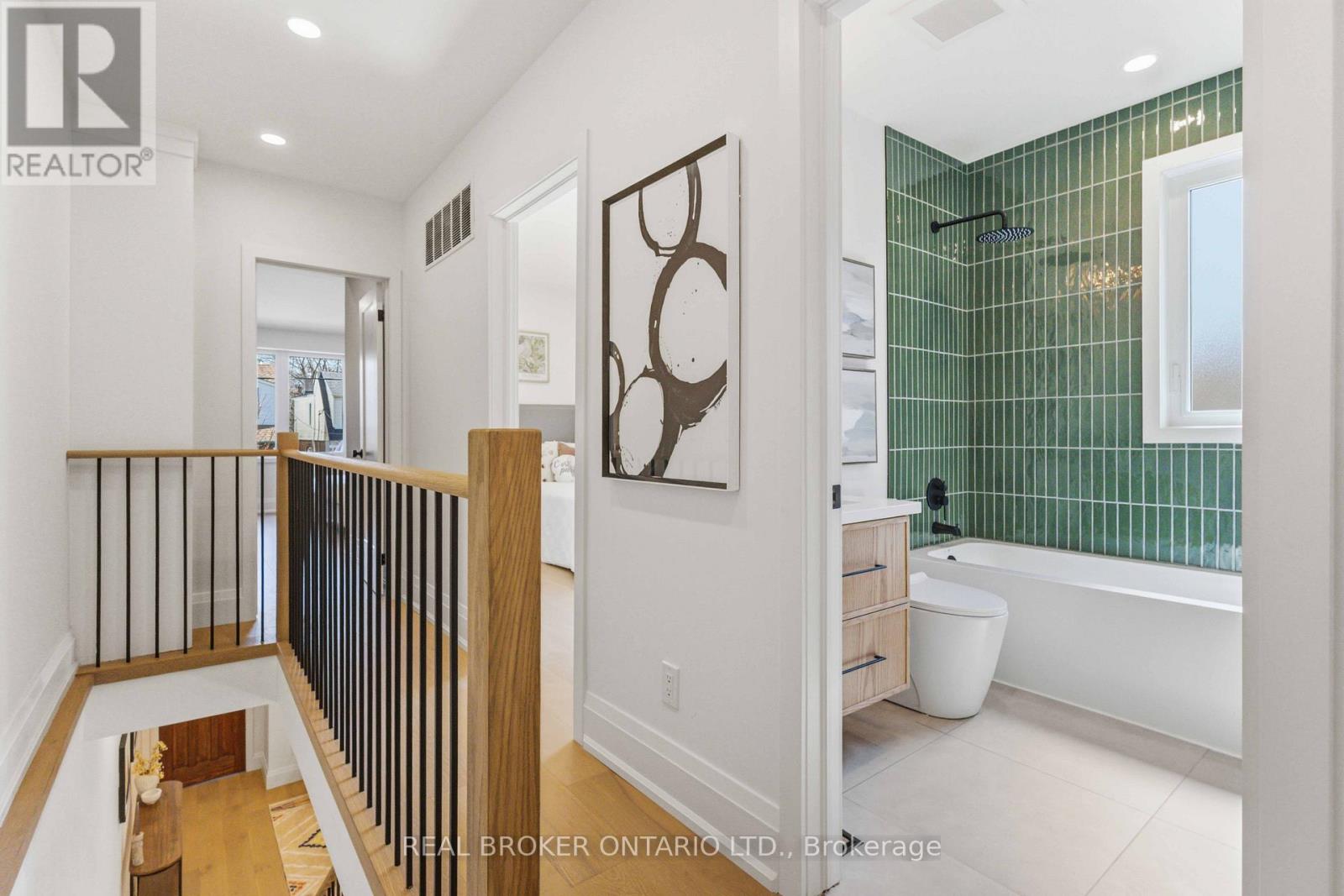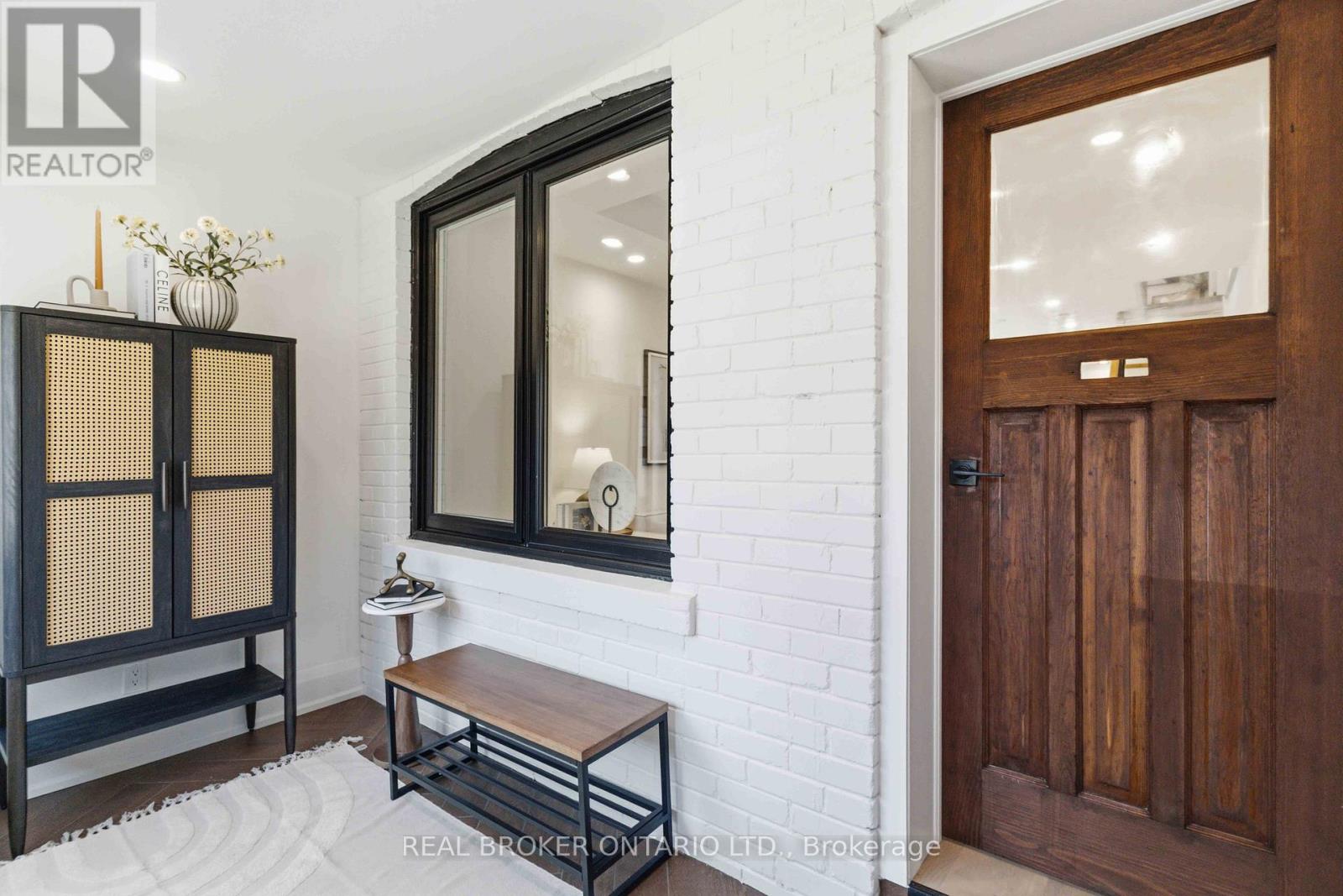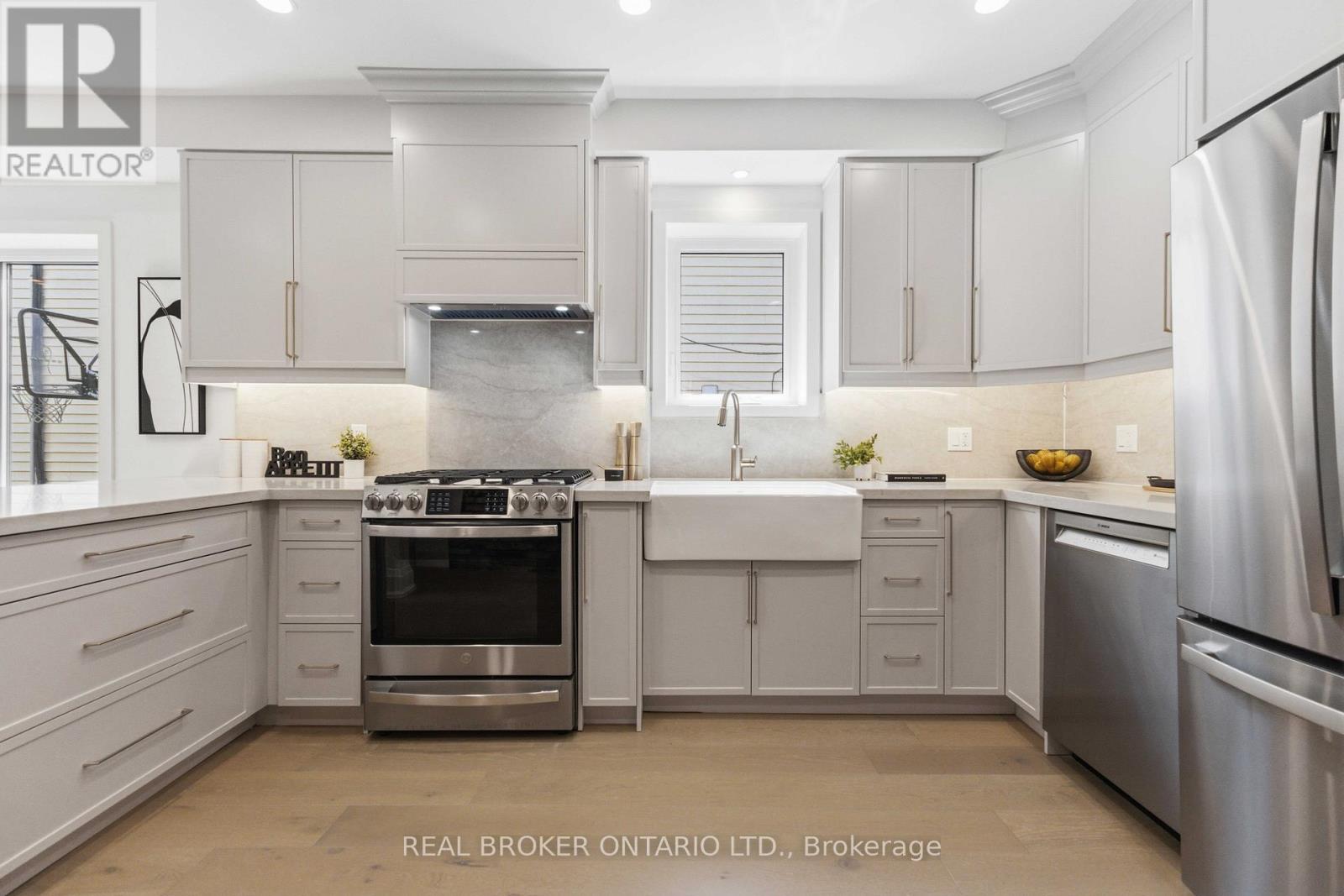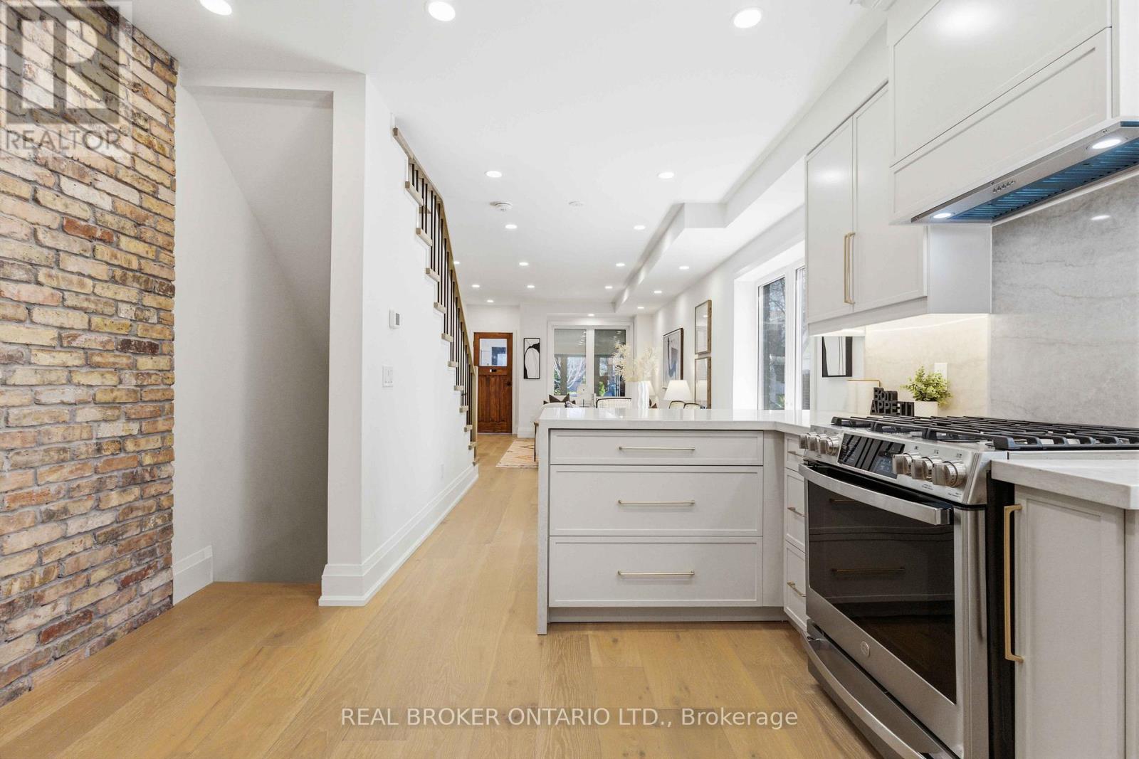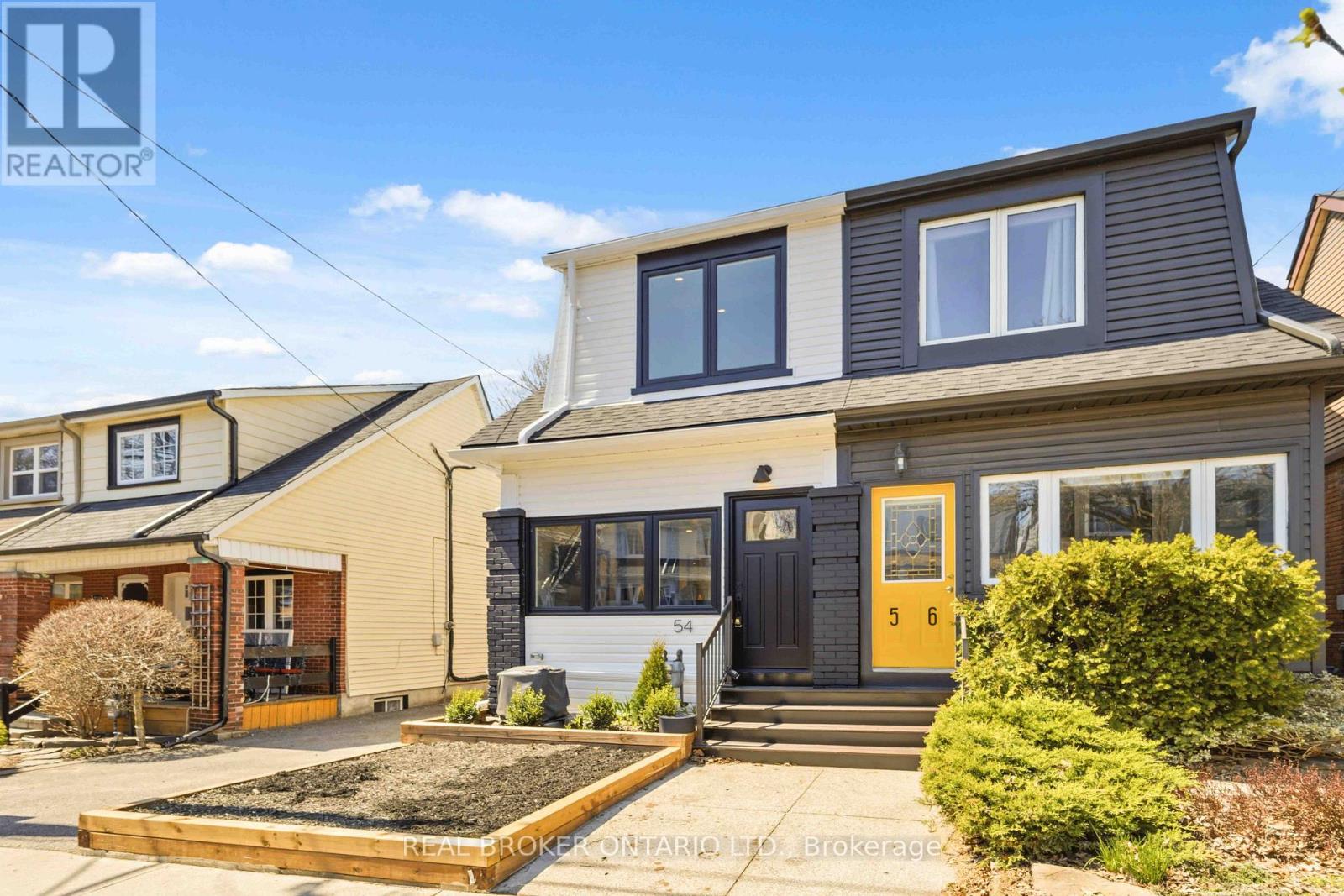 A fully renovated semi in the heart of East York, steps from East Lynn Park. From the enclosed front porch to the sun-filled open-concept main floor, 54 Moberly has been thoughtfully rebuilt to pair original character with modern comfort. The custom kitchen anchors the home with warm Taj Mahal quartz countertops, custom cabinetry, a deep farmhouse sink, gas range, and a French-door stainless fridge set against the exposed "Windy City" reclaimed brick wall. A breakfast bar with seating for three opens to a dining area for six, with oversized windows pulling natural light through the heart of the home. The adjacent living room wraps around an oak & metal picket staircase that's as much sculpture as function, and a tucked-away main-floor powder/main floor laundry room for modern day convenience. Upstairs, three well-proportioned bedrooms sit under a bright dormer roofline. The primary offers a serene, vaulted retreat with a custom built-in wardrobe wall and a quiet desk nook - ideal for working or getting ready for a night on the town. The main bath is a standout in hand-glazed emerald tile, matte black fixtures, and a deep soaker tub with rainfall shower. The lower level extends the living space with a comfortable family room, a play area for the kids, and a true spa-inspired bath - freestanding soaker, glass-enclosed shower, and warm wood-look tile throughout. A landscaped front garden, and a fully updated exterior complete the package. Life here is easy. East Lynn Park and its Thursday farmers' market sit at the end of the block, the Danforth's cafés, restaurants, and shops are moments away, and close subway access keep the downtown commute quick. Move-in ready in one of East York's most connected, community-minded pockets - come experience it in person. **RENOVATED WITH PERMITS*** for your peace of mind! (id:50787)
