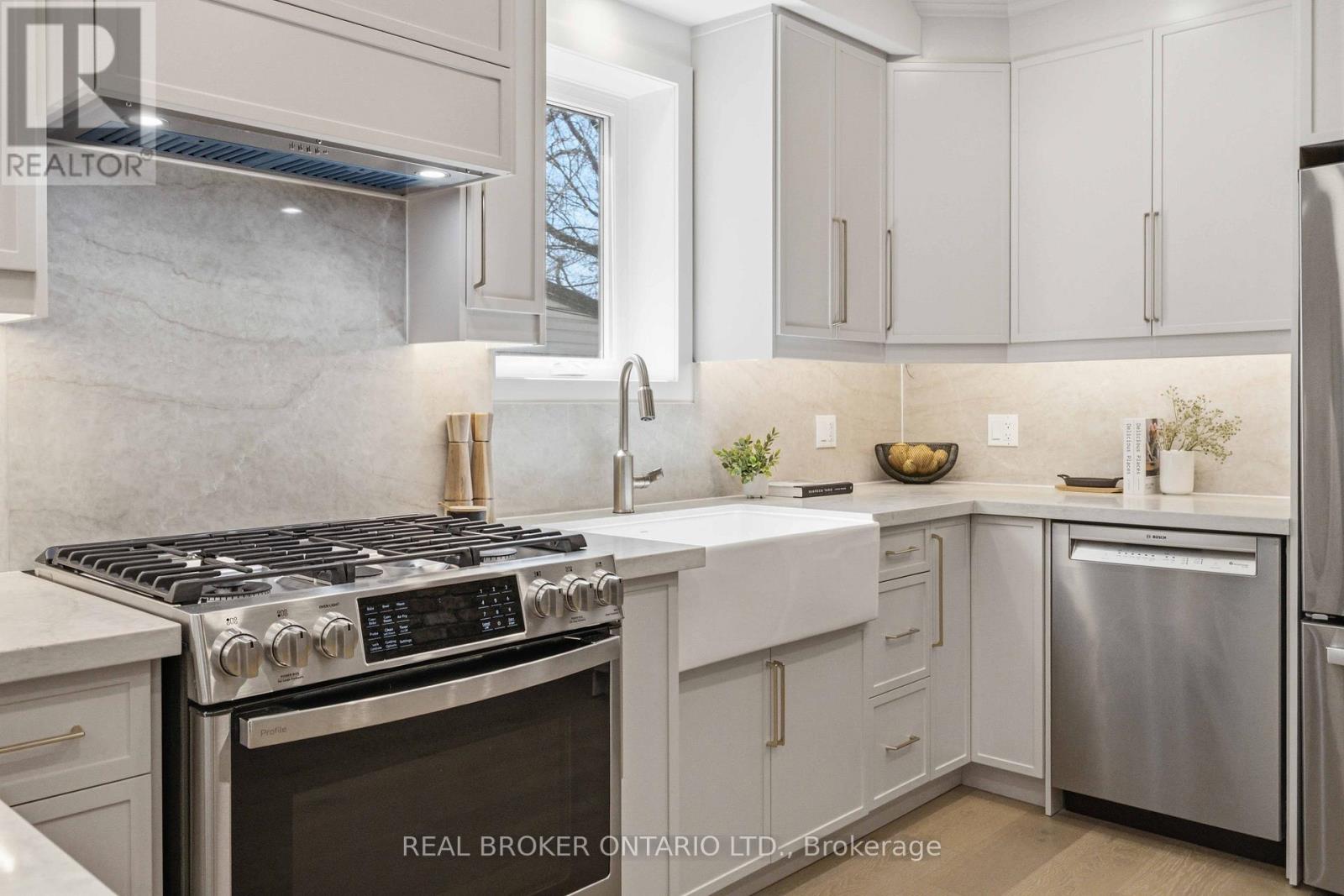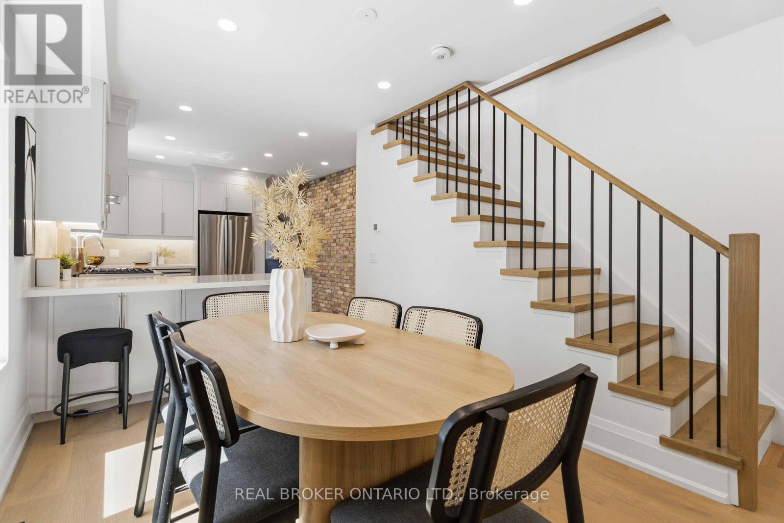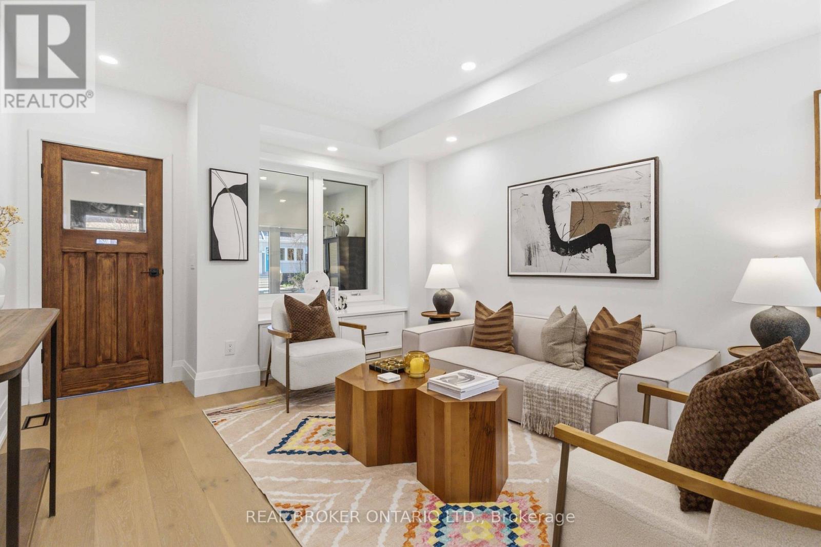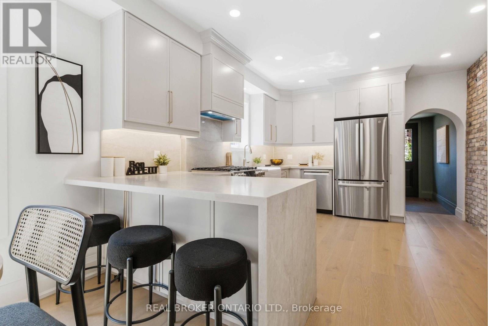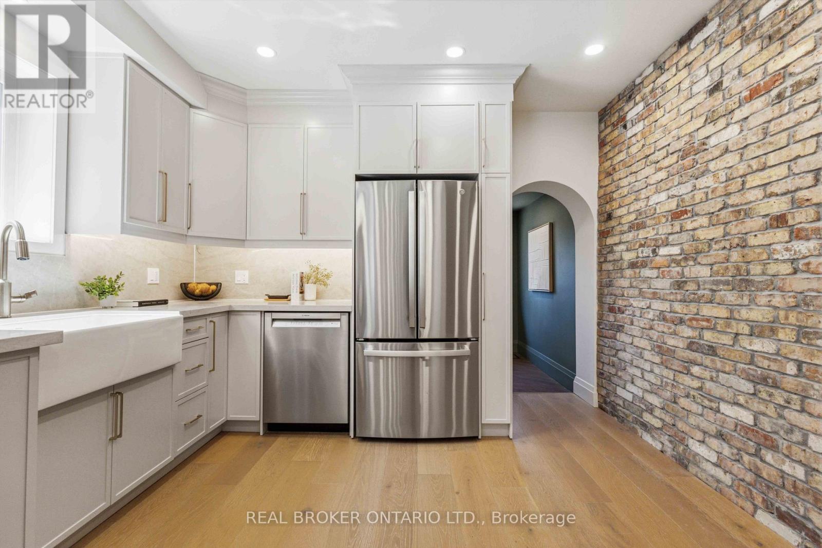 A fully renovated semi in the heart of East York, steps from East Lynn Park. From the enclosed front porch to the sun-filled open-concept main floor, 54 Moberly has been thoughtfully rebuilt to pair original character with modern comfort. The custom kitchen anchors the home with warm Taj Mahal quartz countertops, custom cabinetry, a deep farmhouse sink, gas range, and a French-door stainless fridge set against the exposed "Windy City" reclaimed brick wall. A breakfast bar with seating for three opens to a dining area for six, with oversized windows pulling natural light through the heart of the home. The adjacent living room wraps around an oak & metal picket staircase that's as much sculpture as function, and a tucked-away main-floor powder/main floor laundry room for modern day convenience. Upstairs, three well-proportioned bedrooms sit under a bright dormer roofline. The primary offers a serene, vaulted retreat with a custom built-in wardrobe wall and a quiet desk nook - ideal for working or getting ready for a night on the town. The main bath is a standout in hand-glazed emerald tile, matte black fixtures, and a deep soaker tub with rainfall shower. The lower level extends the living space with a comfortable family room, a play area for the kids, and a true spa-inspired bath - freestanding soaker, glass-enclosed shower, and warm wood-look tile throughout. A landscaped front garden, and a fully updated exterior complete the package. Life here is easy. East Lynn Park and its Thursday farmers' market sit at the end of the block, the Danforth's cafés, restaurants, and shops are moments away, and close subway access keep the downtown commute quick. Move-in ready in one of East York's most connected, community-minded pockets - come experience it in person. **RENOVATED WITH PERMITS*** for your peace of mind! (id:50787)