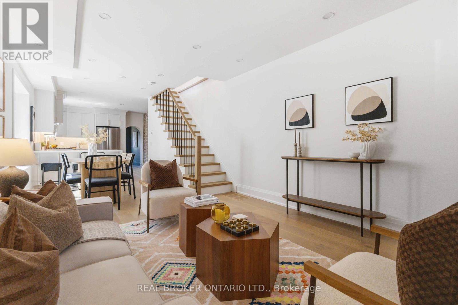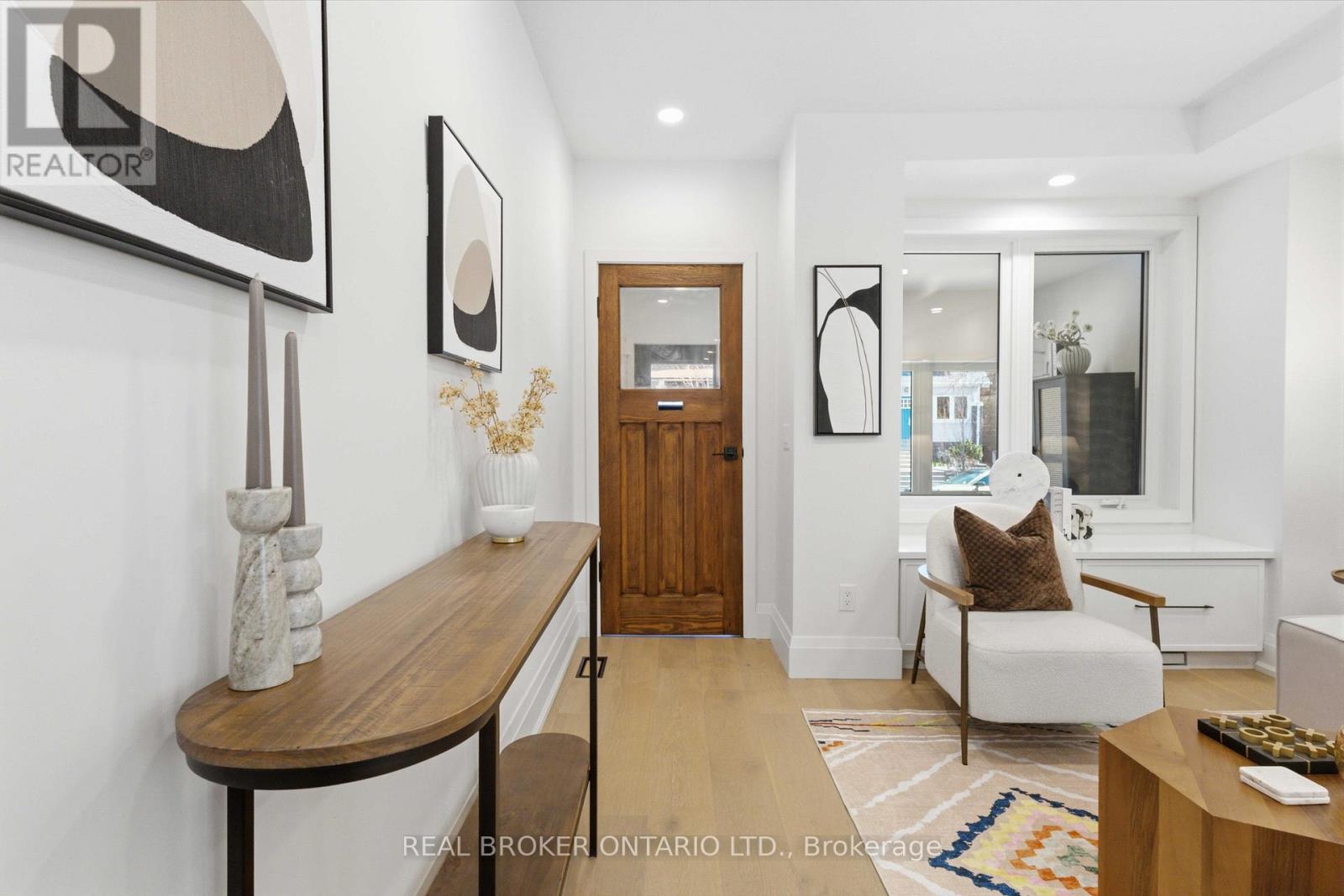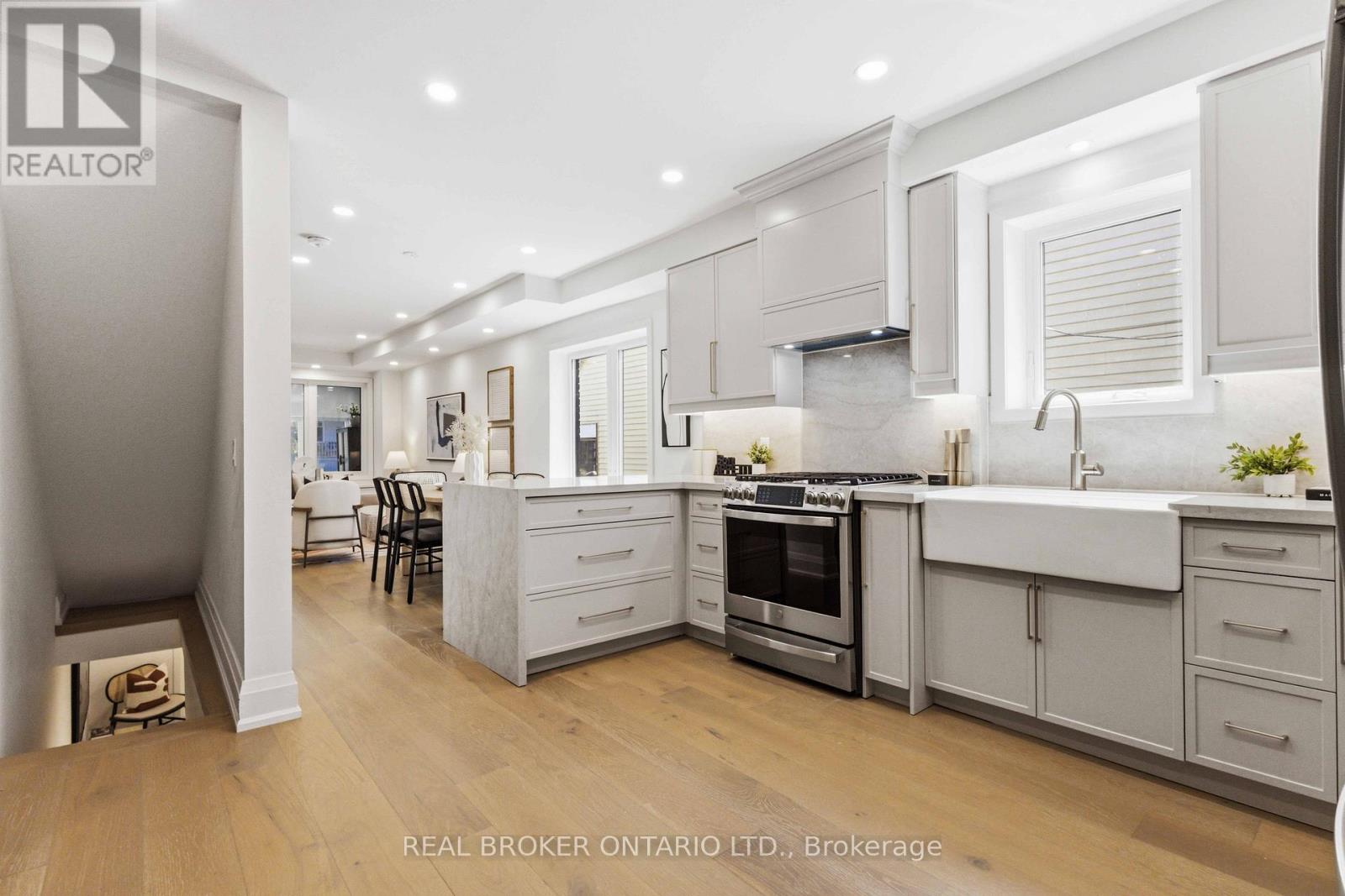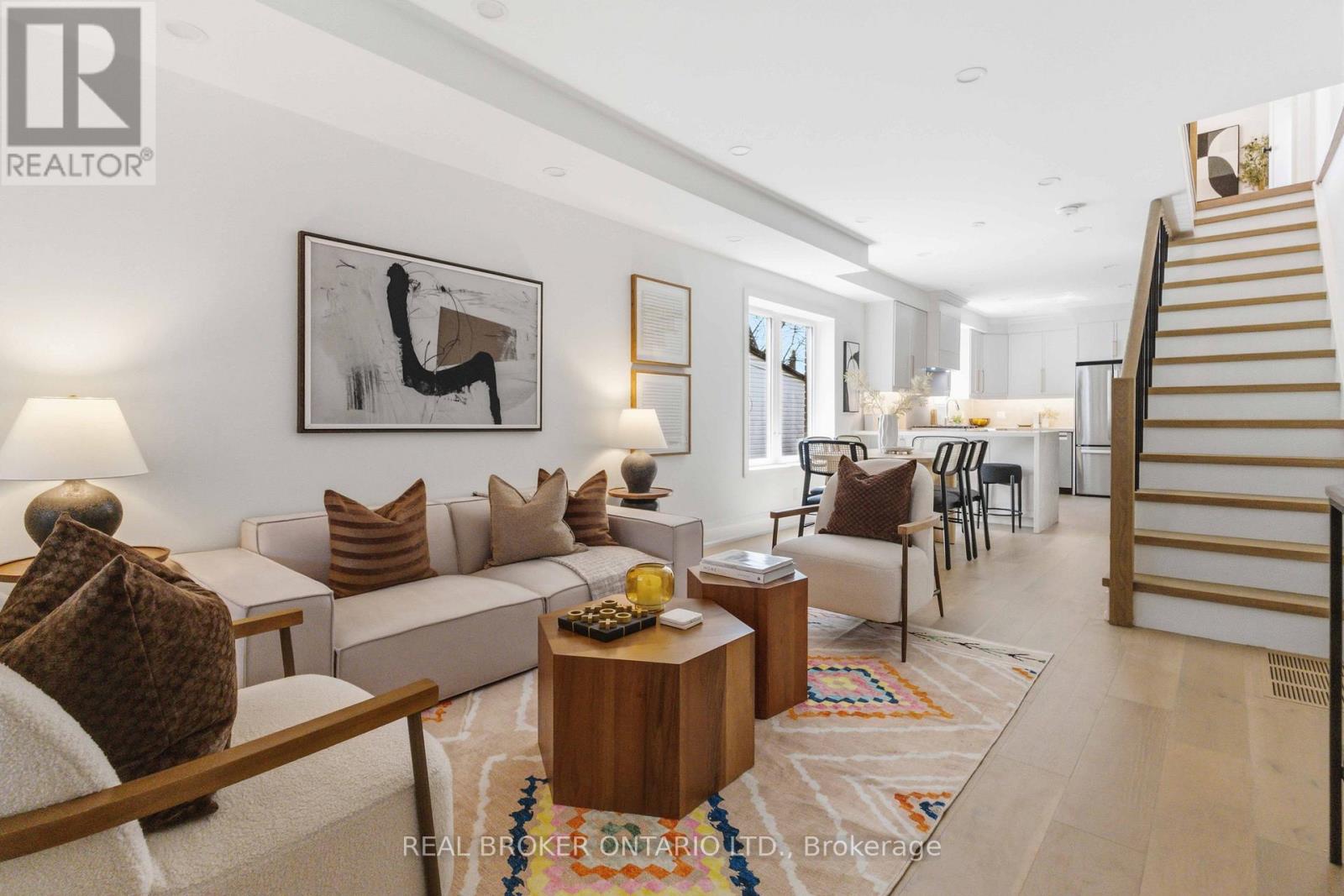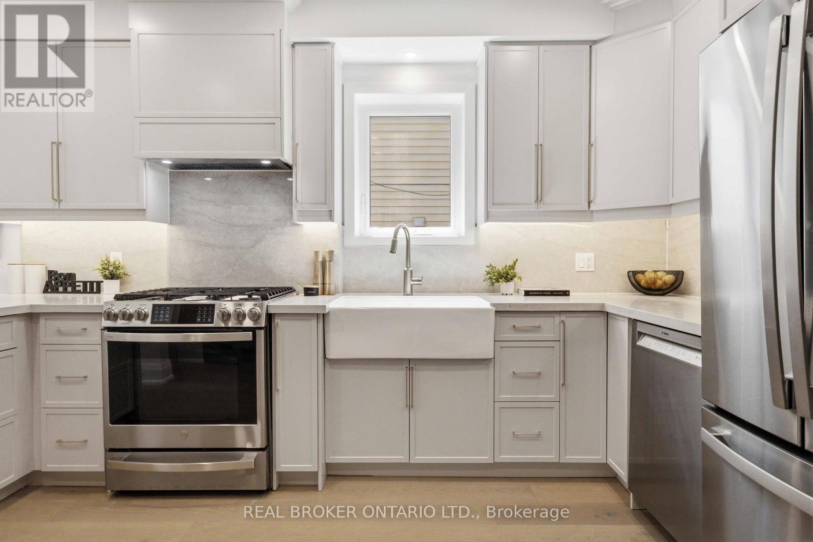 A fully renovated semi in the heart of East York, steps from East Lynn Park. From the enclosed front porch to the sun-filled open-concept main floor, 54 Moberly has been thoughtfully rebuilt to pair original character with modern comfort. The custom kitchen anchors the home with warm Taj Mahal quartz countertops, custom cabinetry, a deep farmhouse sink, gas range, and a French-door stainless fridge set against the exposed "Windy City" reclaimed brick wall. A breakfast bar with seating for three opens to a dining area for six, with oversized windows pulling natural light through the heart of the home. The adjacent living room wraps around an oak & metal picket staircase that's as much sculpture as function, and a tucked-away main-floor powder/main floor laundry room for modern day convenience. Upstairs, three well-proportioned bedrooms sit under a bright dormer roofline. The primary offers a serene, vaulted retreat with a custom built-in wardrobe wall and a quiet desk nook - ideal for working or getting ready for a night on the town. The main bath is a standout in hand-glazed emerald tile, matte black fixtures, and a deep soaker tub with rainfall shower. The lower level extends the living space with a comfortable family room, a play area for the kids, and a true spa-inspired bath - freestanding soaker, glass-enclosed shower, and warm wood-look tile throughout. A landscaped front garden, and a fully updated exterior complete the package. Life here is easy. East Lynn Park and its Thursday farmers' market sit at the end of the block, the Danforth's cafés, restaurants, and shops are moments away, and close subway access keep the downtown commute quick. Move-in ready in one of East York's most connected, community-minded pockets - come experience it in person. **RENOVATED WITH PERMITS*** for your peace of mind! (id:50787)