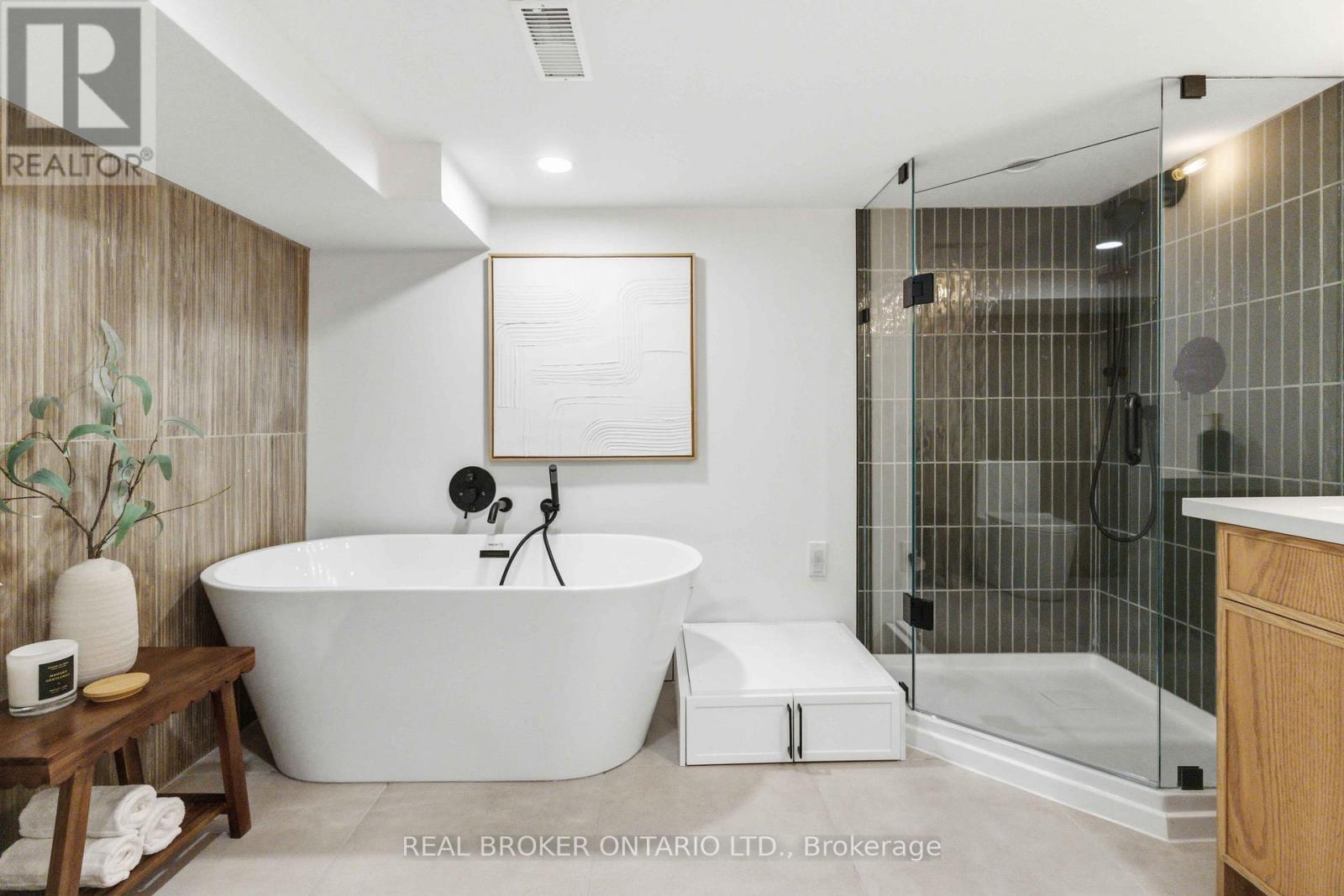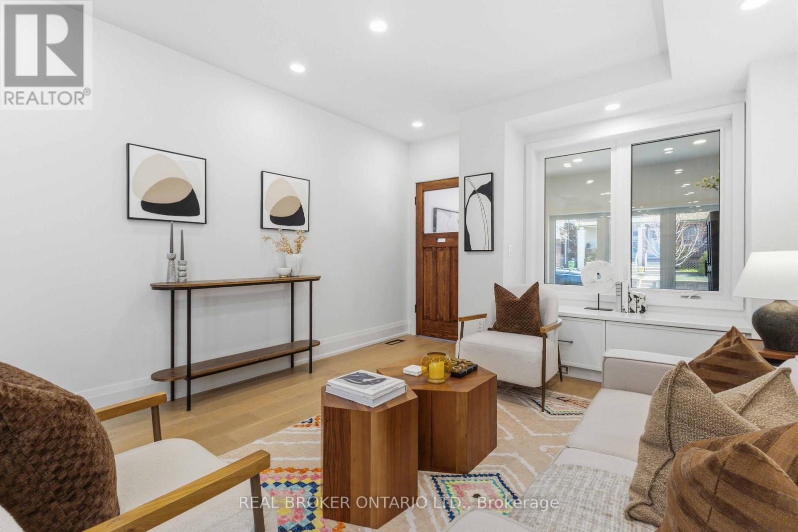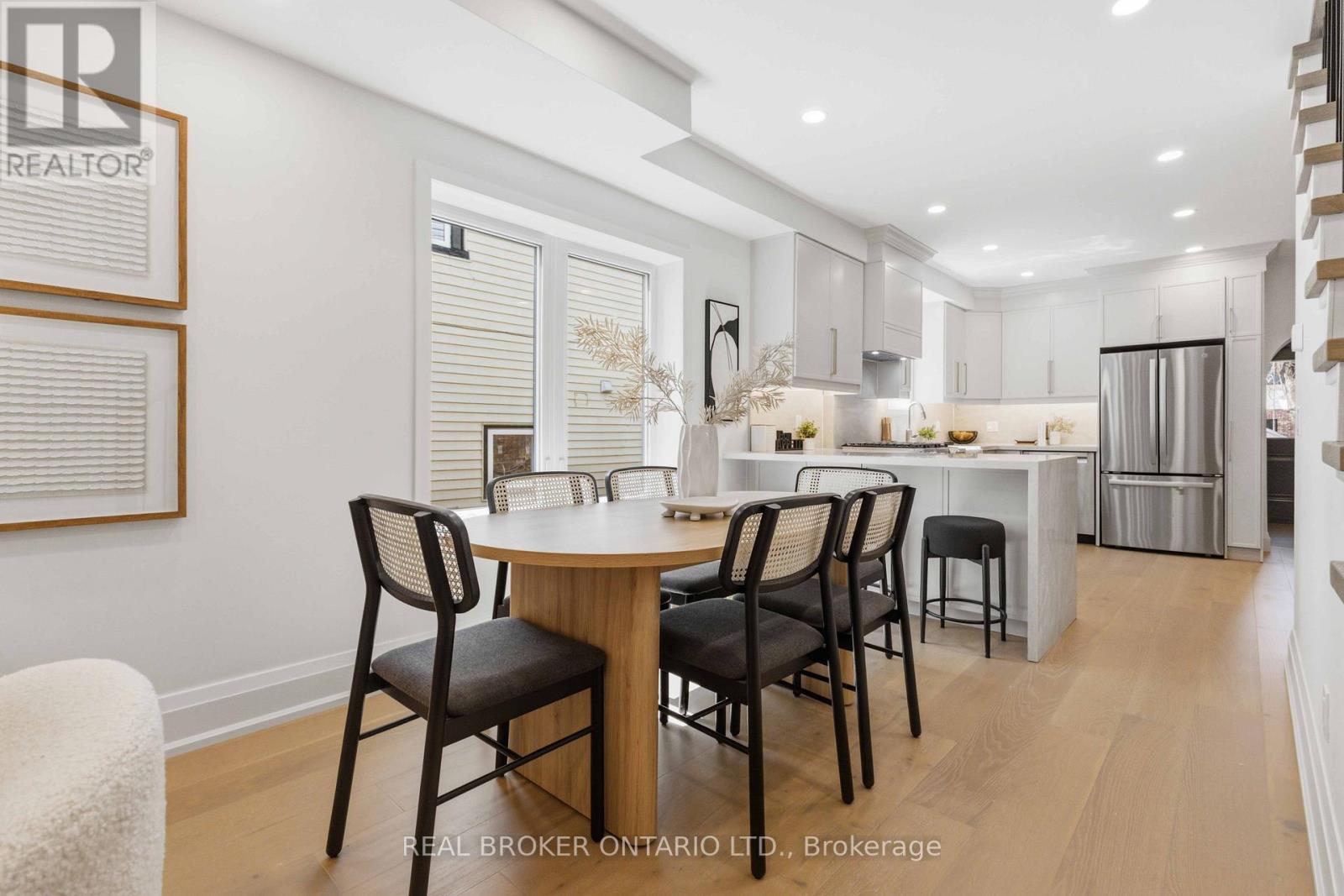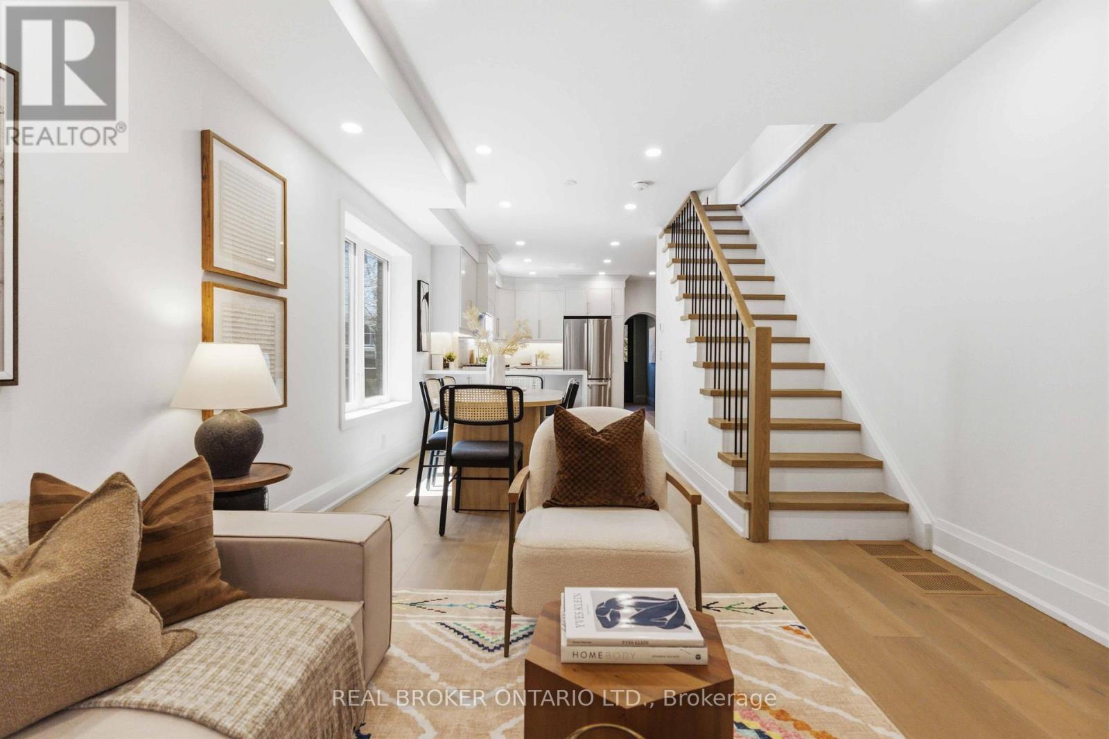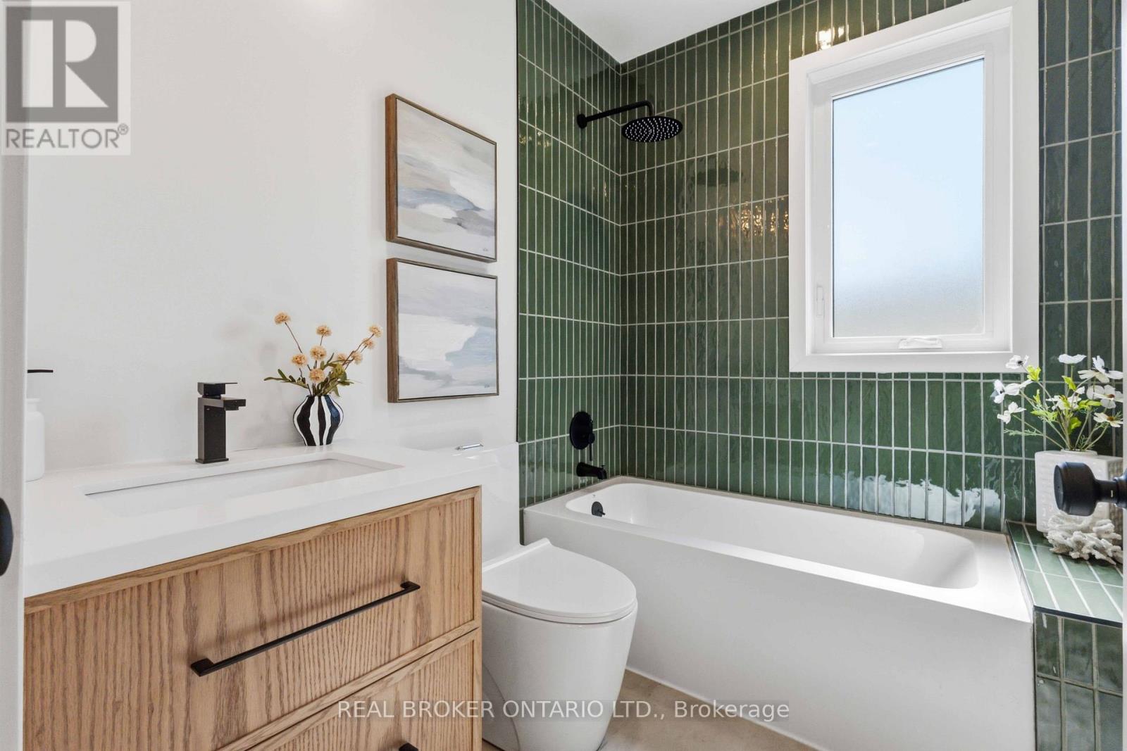 A fully renovated semi in the heart of East York, steps from East Lynn Park. From the enclosed front porch to the sun-filled open-concept main floor, 54 Moberly has been thoughtfully rebuilt to pair original character with modern comfort. The custom kitchen anchors the home with warm Taj Mahal quartz countertops, custom cabinetry, a deep farmhouse sink, gas range, and a French-door stainless fridge set against the exposed "Windy City" reclaimed brick wall. A breakfast bar with seating for three opens to a dining area for six, with oversized windows pulling natural light through the heart of the home. The adjacent living room wraps around an oak & metal picket staircase that's as much sculpture as function, and a tucked-away main-floor powder/main floor laundry room for modern day convenience. Upstairs, three well-proportioned bedrooms sit under a bright dormer roofline. The primary offers a serene, vaulted retreat with a custom built-in wardrobe wall and a quiet desk nook - ideal for working or getting ready for a night on the town. The main bath is a standout in hand-glazed emerald tile, matte black fixtures, and a deep soaker tub with rainfall shower. The lower level extends the living space with a comfortable family room, a play area for the kids, and a true spa-inspired bath - freestanding soaker, glass-enclosed shower, and warm wood-look tile throughout. A landscaped front garden, and a fully updated exterior complete the package. Life here is easy. East Lynn Park and its Thursday farmers' market sit at the end of the block, the Danforth's cafés, restaurants, and shops are moments away, and close subway access keep the downtown commute quick. Move-in ready in one of East York's most connected, community-minded pockets - come experience it in person. **RENOVATED WITH PERMITS*** for your peace of mind! (id:50787)