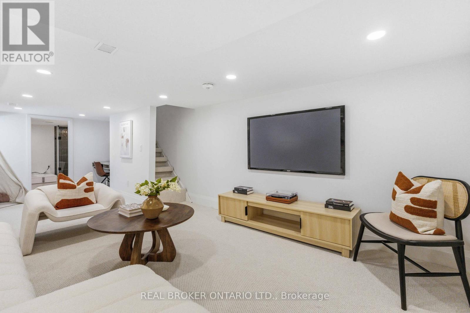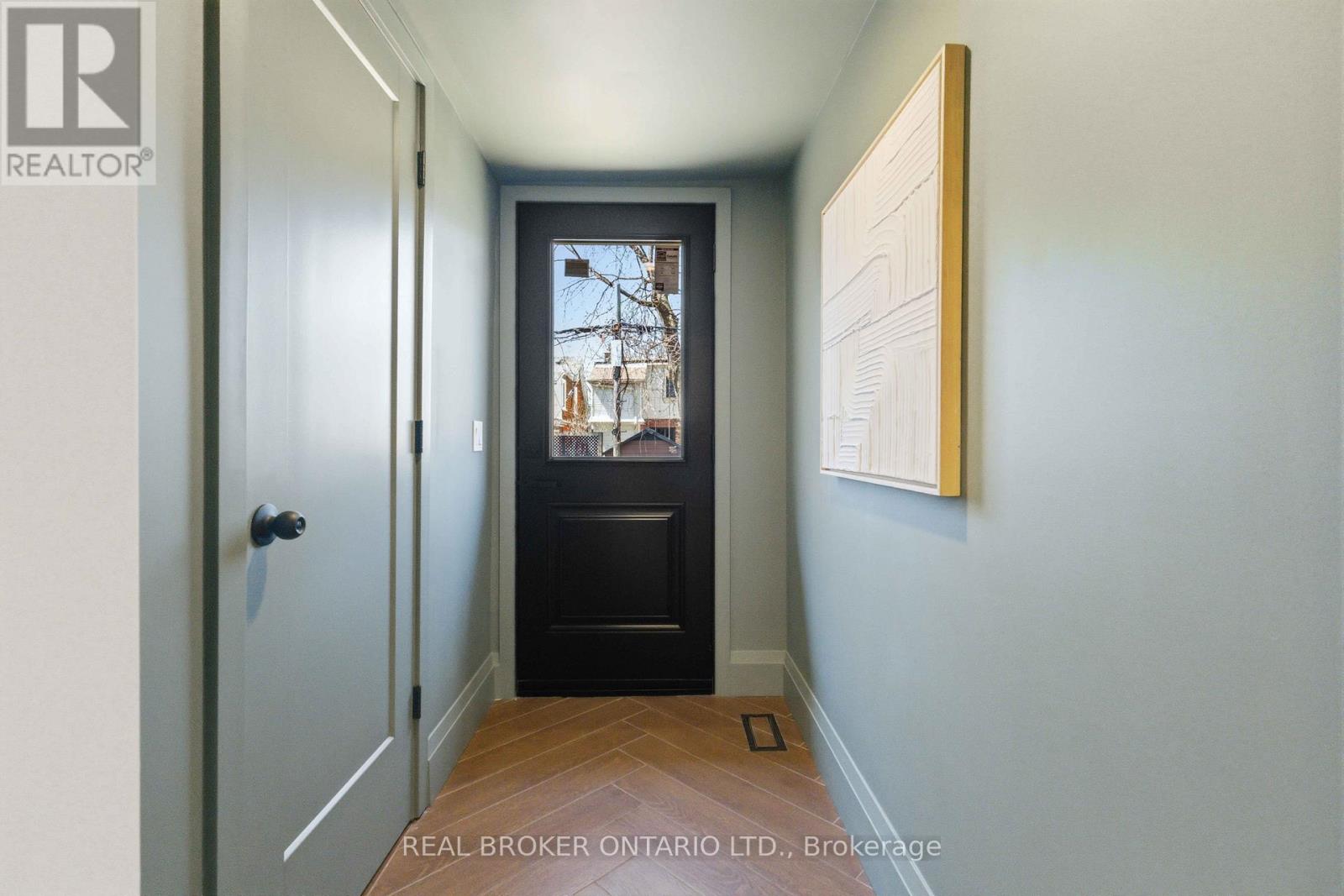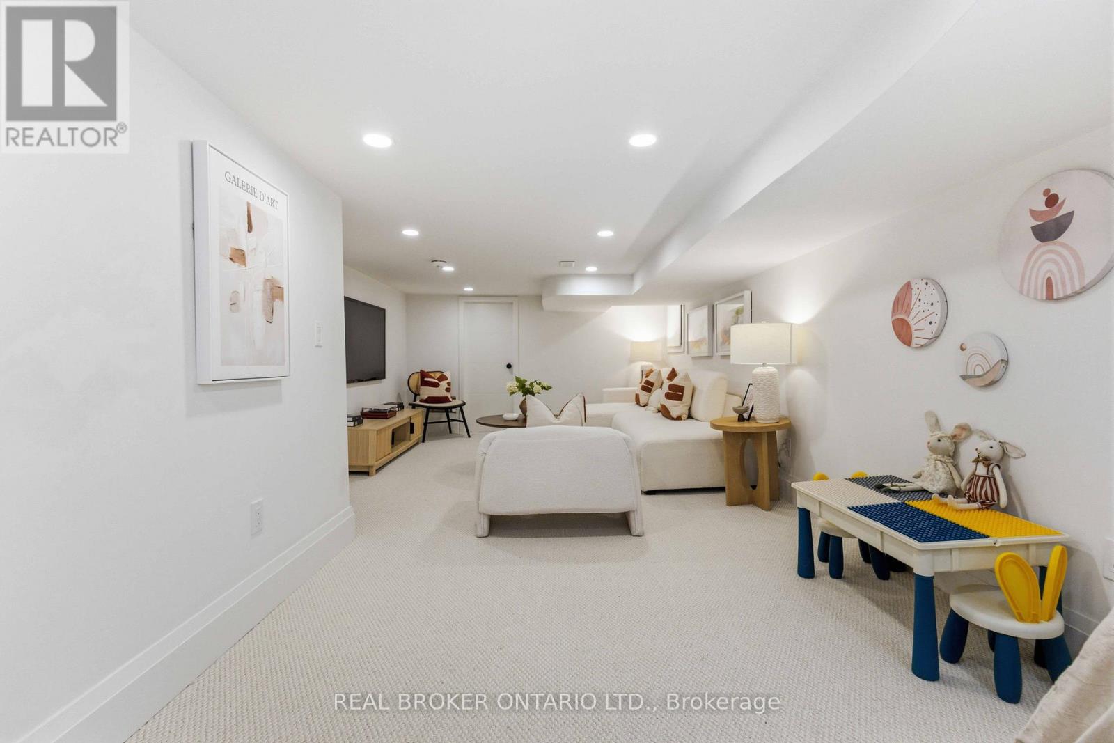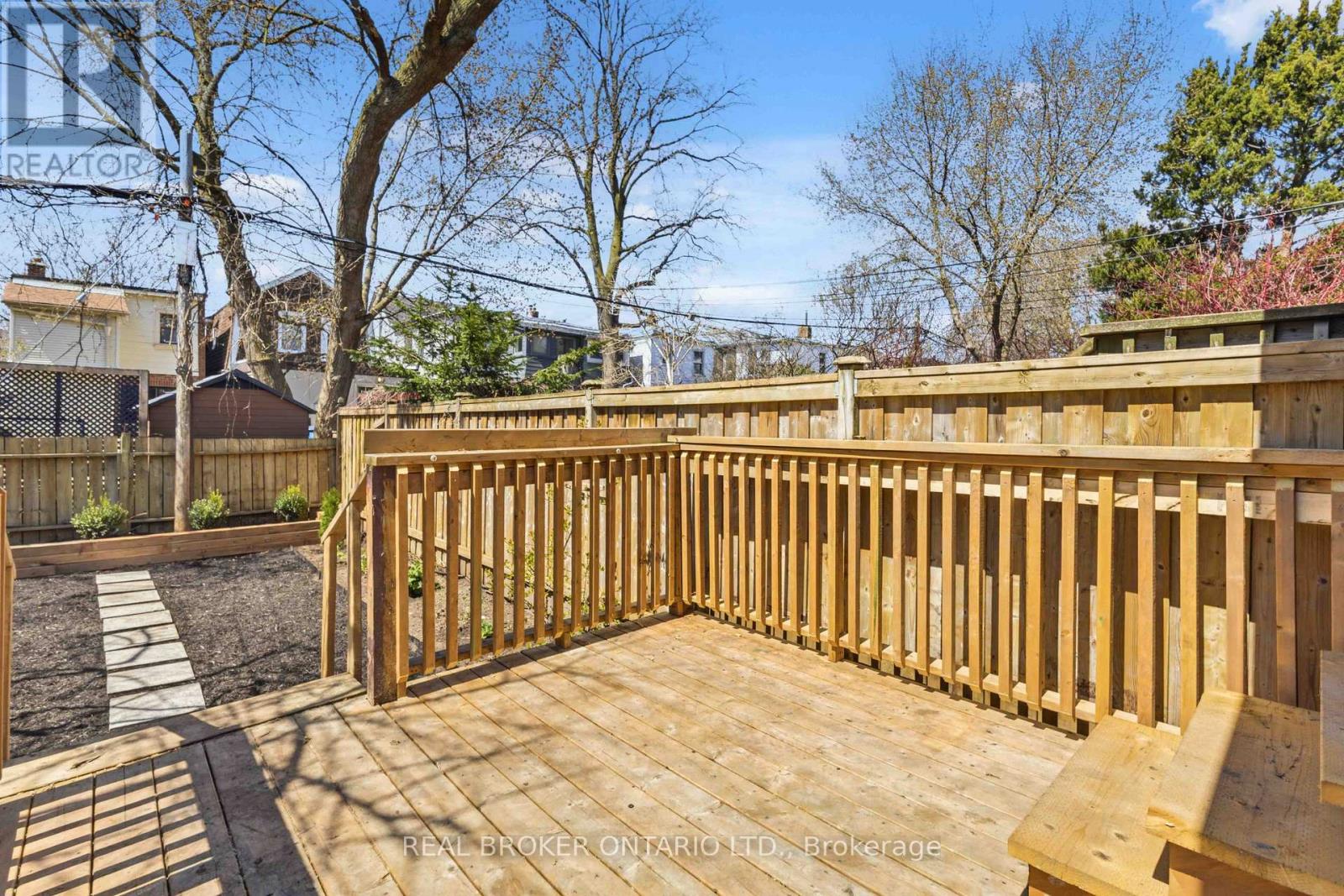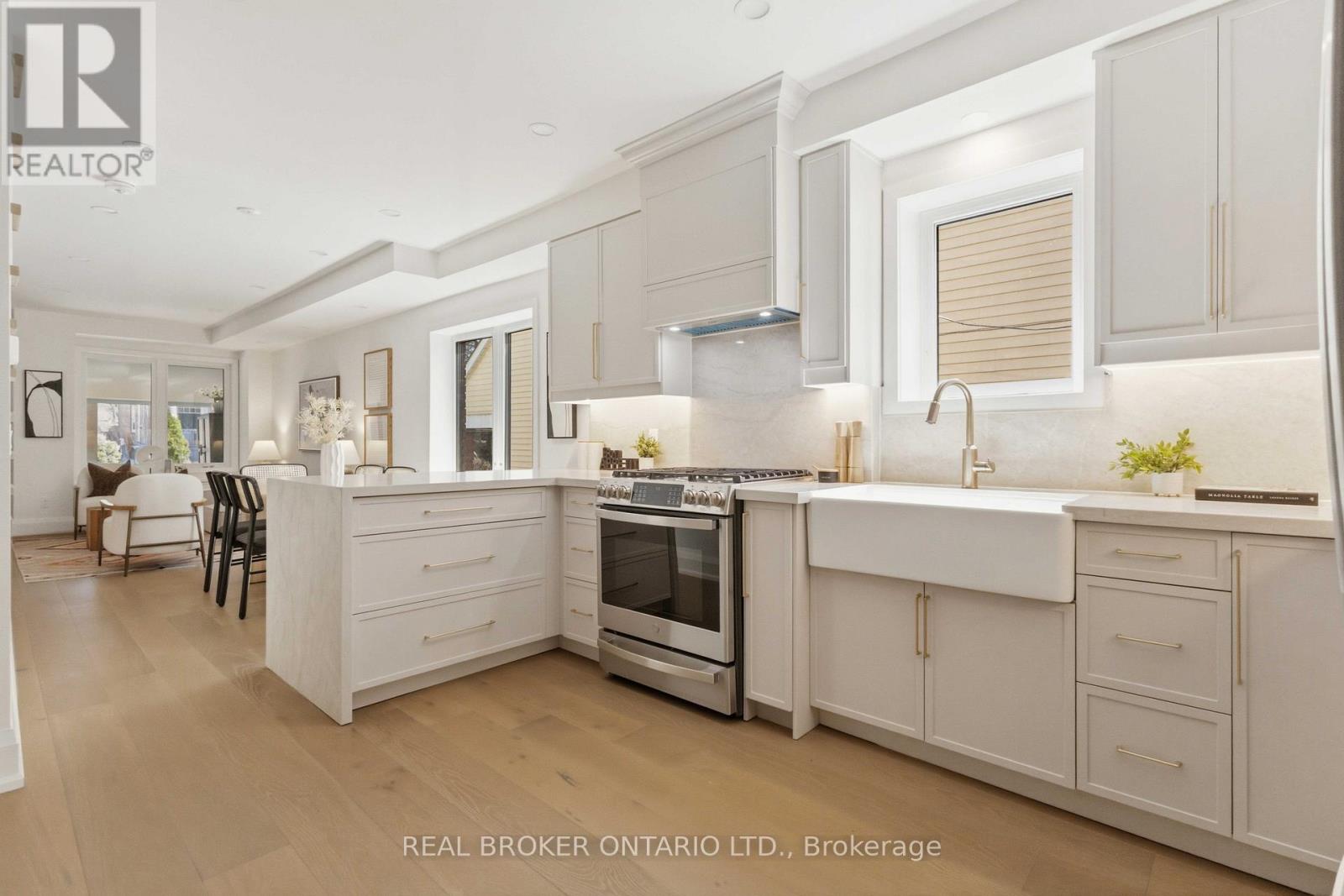 A fully renovated semi in the heart of East York, steps from East Lynn Park. From the enclosed front porch to the sun-filled open-concept main floor, 54 Moberly has been thoughtfully rebuilt to pair original character with modern comfort. The custom kitchen anchors the home with warm Taj Mahal quartz countertops, custom cabinetry, a deep farmhouse sink, gas range, and a French-door stainless fridge set against the exposed "Windy City" reclaimed brick wall. A breakfast bar with seating for three opens to a dining area for six, with oversized windows pulling natural light through the heart of the home. The adjacent living room wraps around an oak & metal picket staircase that's as much sculpture as function, and a tucked-away main-floor powder/main floor laundry room for modern day convenience. Upstairs, three well-proportioned bedrooms sit under a bright dormer roofline. The primary offers a serene, vaulted retreat with a custom built-in wardrobe wall and a quiet desk nook - ideal for working or getting ready for a night on the town. The main bath is a standout in hand-glazed emerald tile, matte black fixtures, and a deep soaker tub with rainfall shower. The lower level extends the living space with a comfortable family room, a play area for the kids, and a true spa-inspired bath - freestanding soaker, glass-enclosed shower, and warm wood-look tile throughout. A landscaped front garden, and a fully updated exterior complete the package. Life here is easy. East Lynn Park and its Thursday farmers' market sit at the end of the block, the Danforth's cafés, restaurants, and shops are moments away, and close subway access keep the downtown commute quick. Move-in ready in one of East York's most connected, community-minded pockets - come experience it in person. **RENOVATED WITH PERMITS*** for your peace of mind! (id:50787)