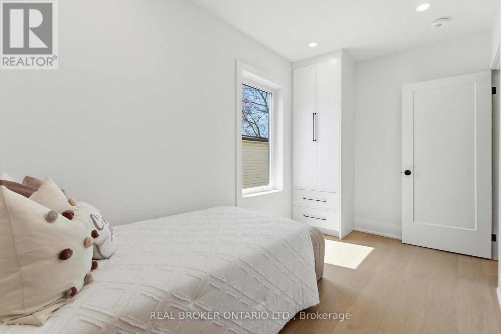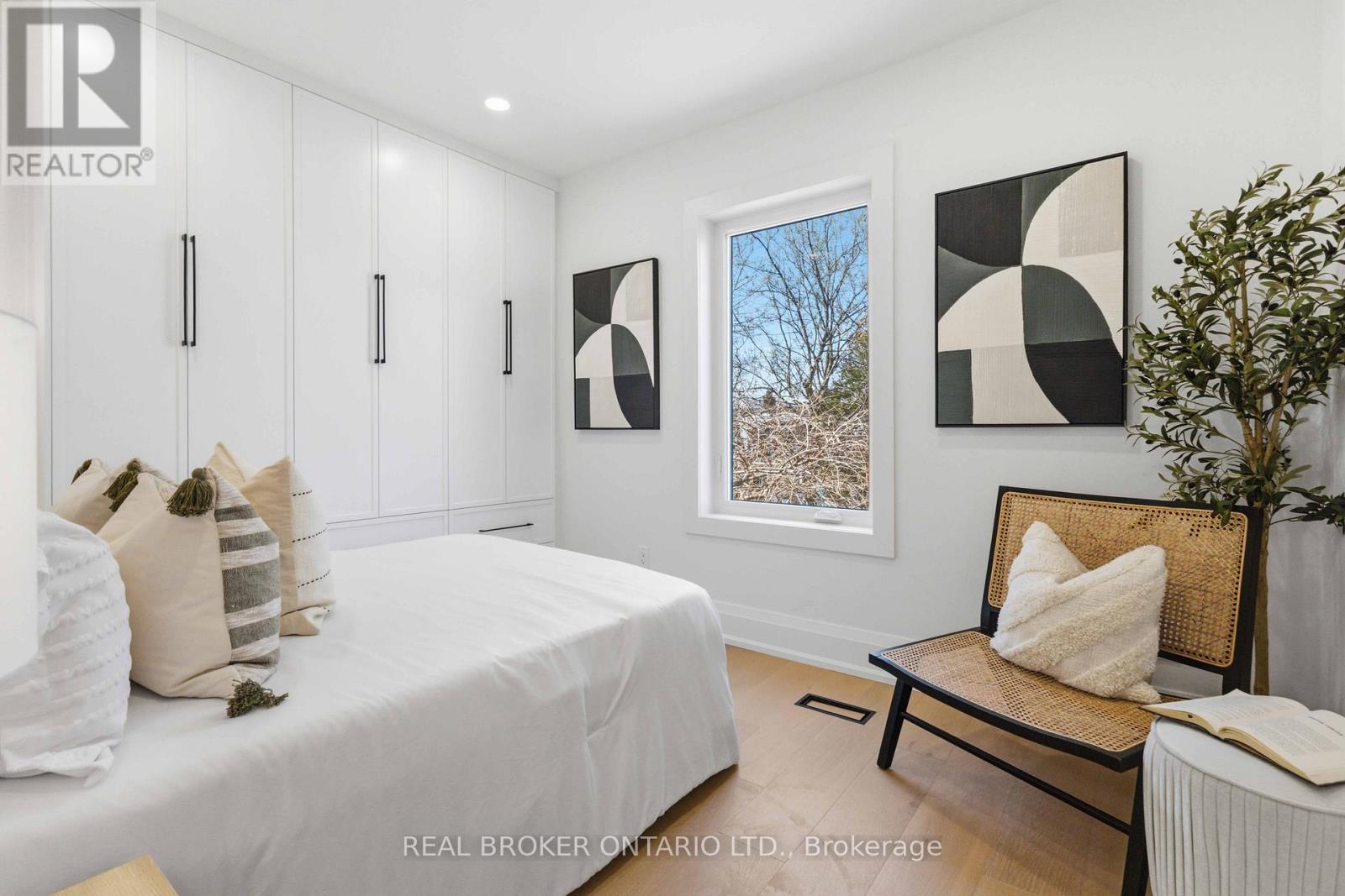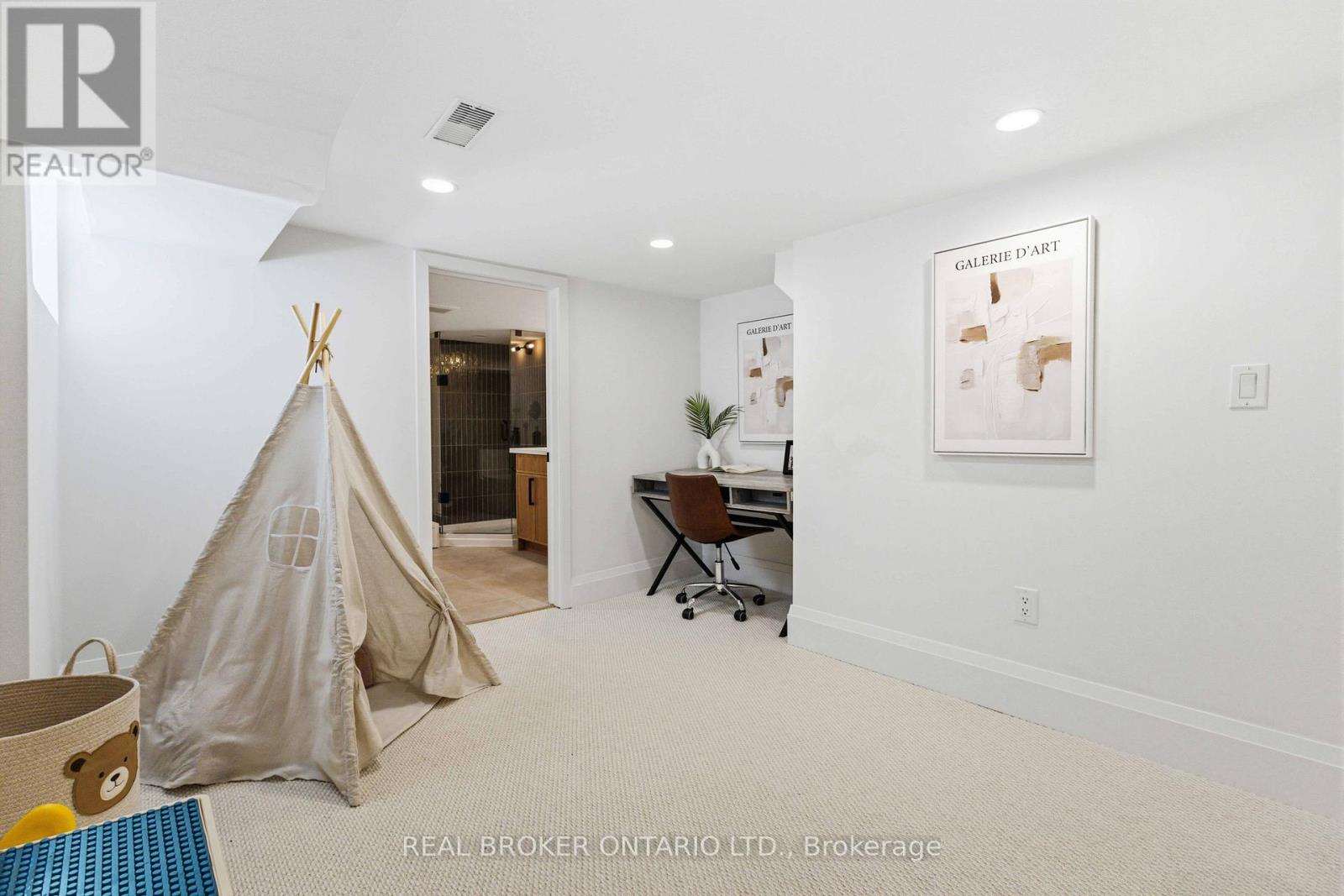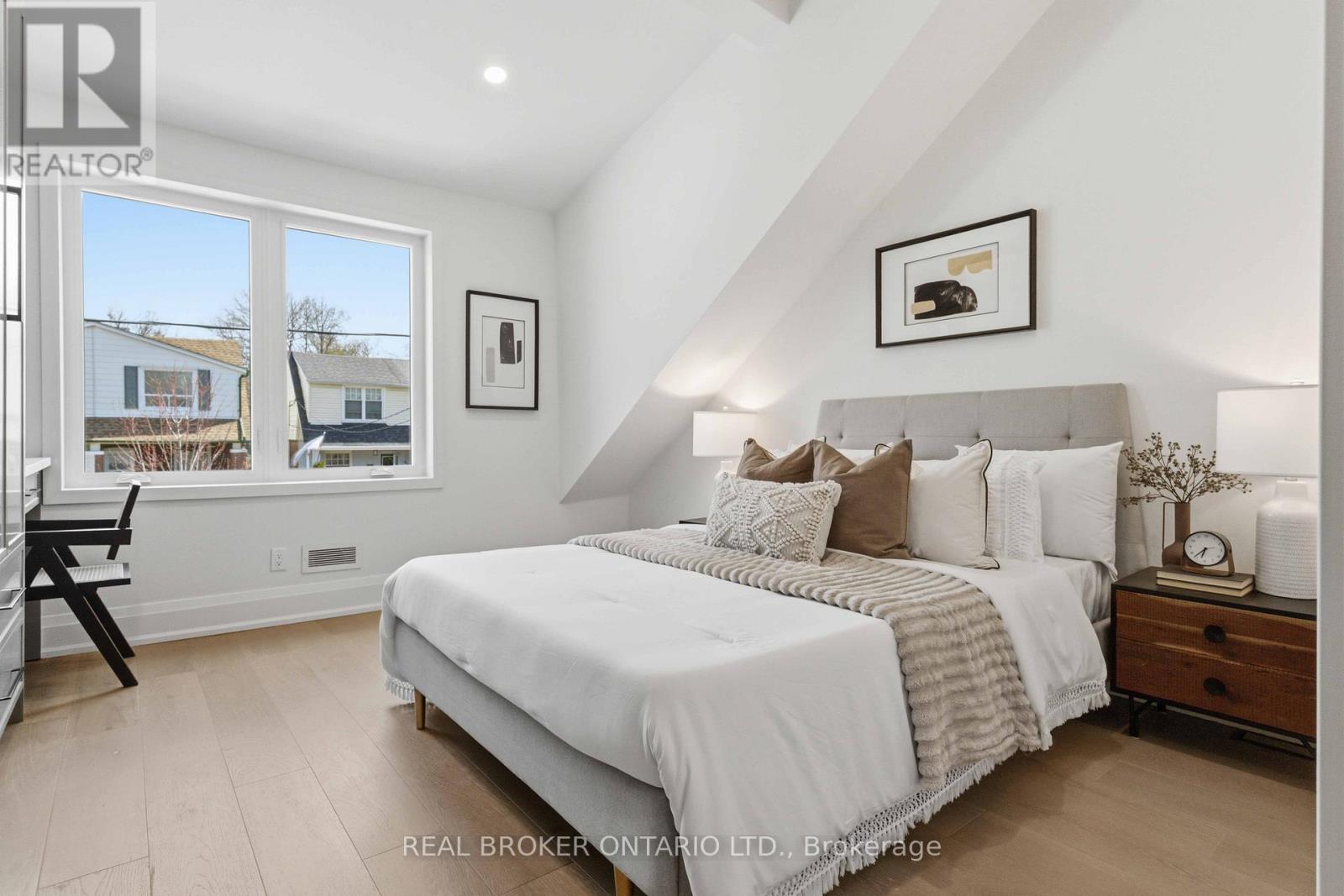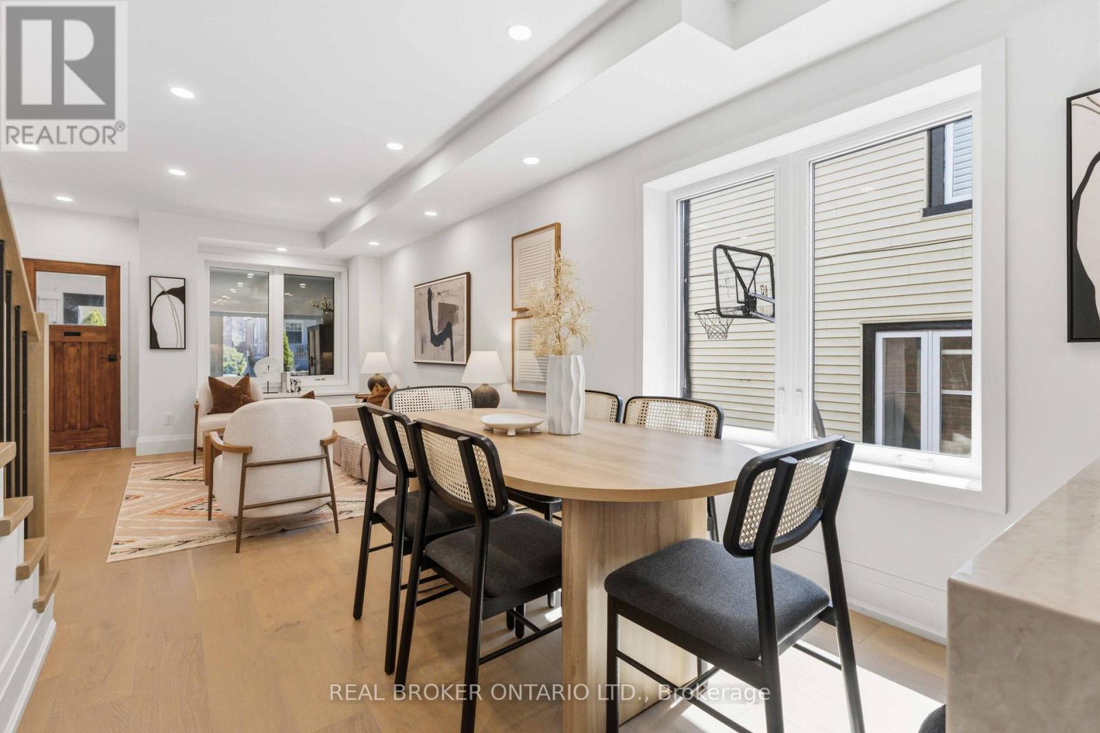 A fully renovated semi in the heart of East York, steps from East Lynn Park. From the enclosed front porch to the sun-filled open-concept main floor, 54 Moberly has been thoughtfully rebuilt to pair original character with modern comfort. The custom kitchen anchors the home with warm Taj Mahal quartz countertops, custom cabinetry, a deep farmhouse sink, gas range, and a French-door stainless fridge set against the exposed "Windy City" reclaimed brick wall. A breakfast bar with seating for three opens to a dining area for six, with oversized windows pulling natural light through the heart of the home. The adjacent living room wraps around an oak & metal picket staircase that's as much sculpture as function, and a tucked-away main-floor powder/main floor laundry room for modern day convenience. Upstairs, three well-proportioned bedrooms sit under a bright dormer roofline. The primary offers a serene, vaulted retreat with a custom built-in wardrobe wall and a quiet desk nook - ideal for working or getting ready for a night on the town. The main bath is a standout in hand-glazed emerald tile, matte black fixtures, and a deep soaker tub with rainfall shower. The lower level extends the living space with a comfortable family room, a play area for the kids, and a true spa-inspired bath - freestanding soaker, glass-enclosed shower, and warm wood-look tile throughout. A landscaped front garden, and a fully updated exterior complete the package. Life here is easy. East Lynn Park and its Thursday farmers' market sit at the end of the block, the Danforth's cafés, restaurants, and shops are moments away, and close subway access keep the downtown commute quick. Move-in ready in one of East York's most connected, community-minded pockets - come experience it in person. **RENOVATED WITH PERMITS*** for your peace of mind! (id:50787)