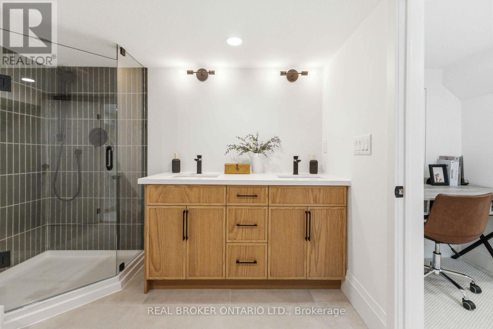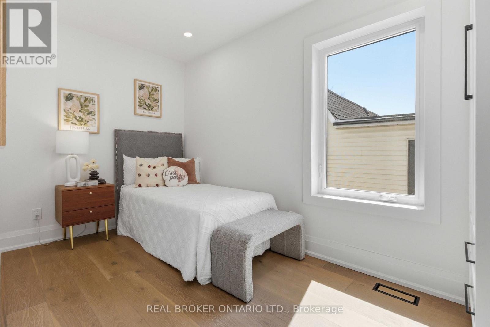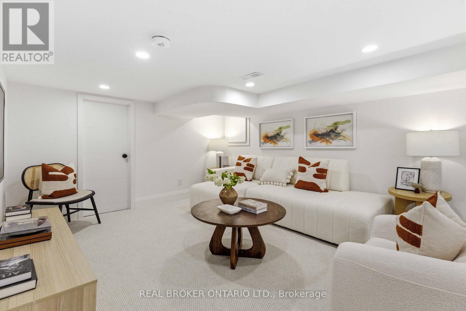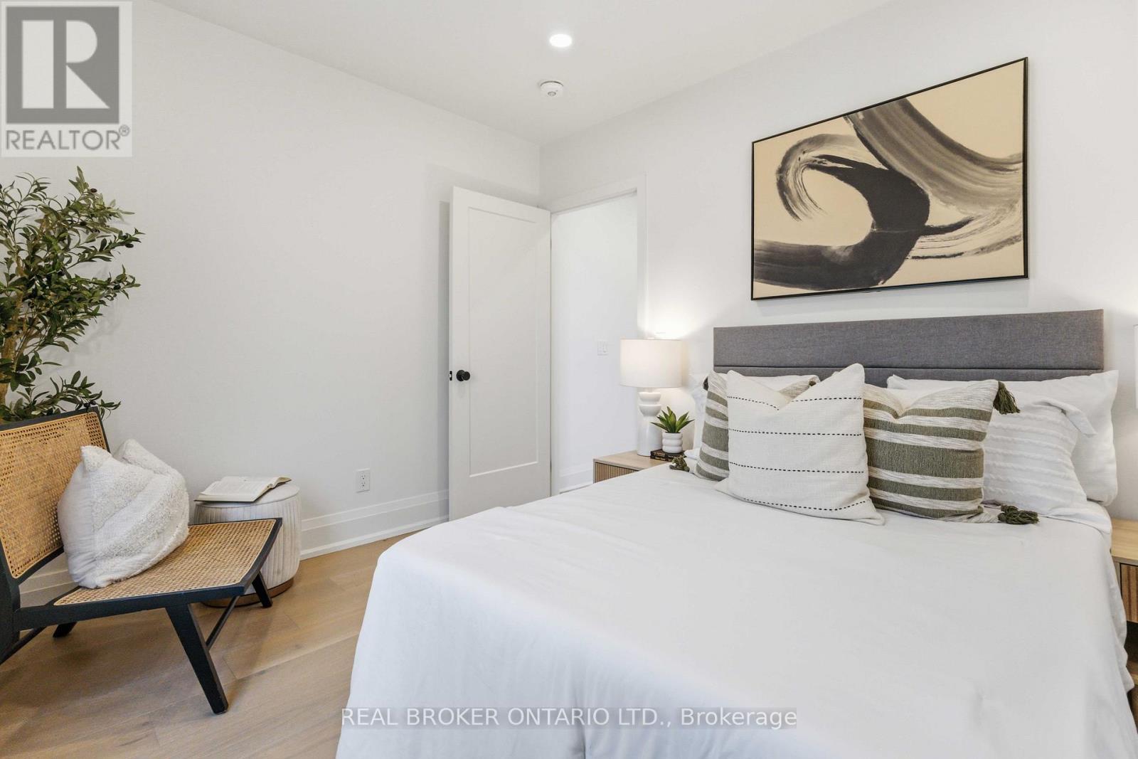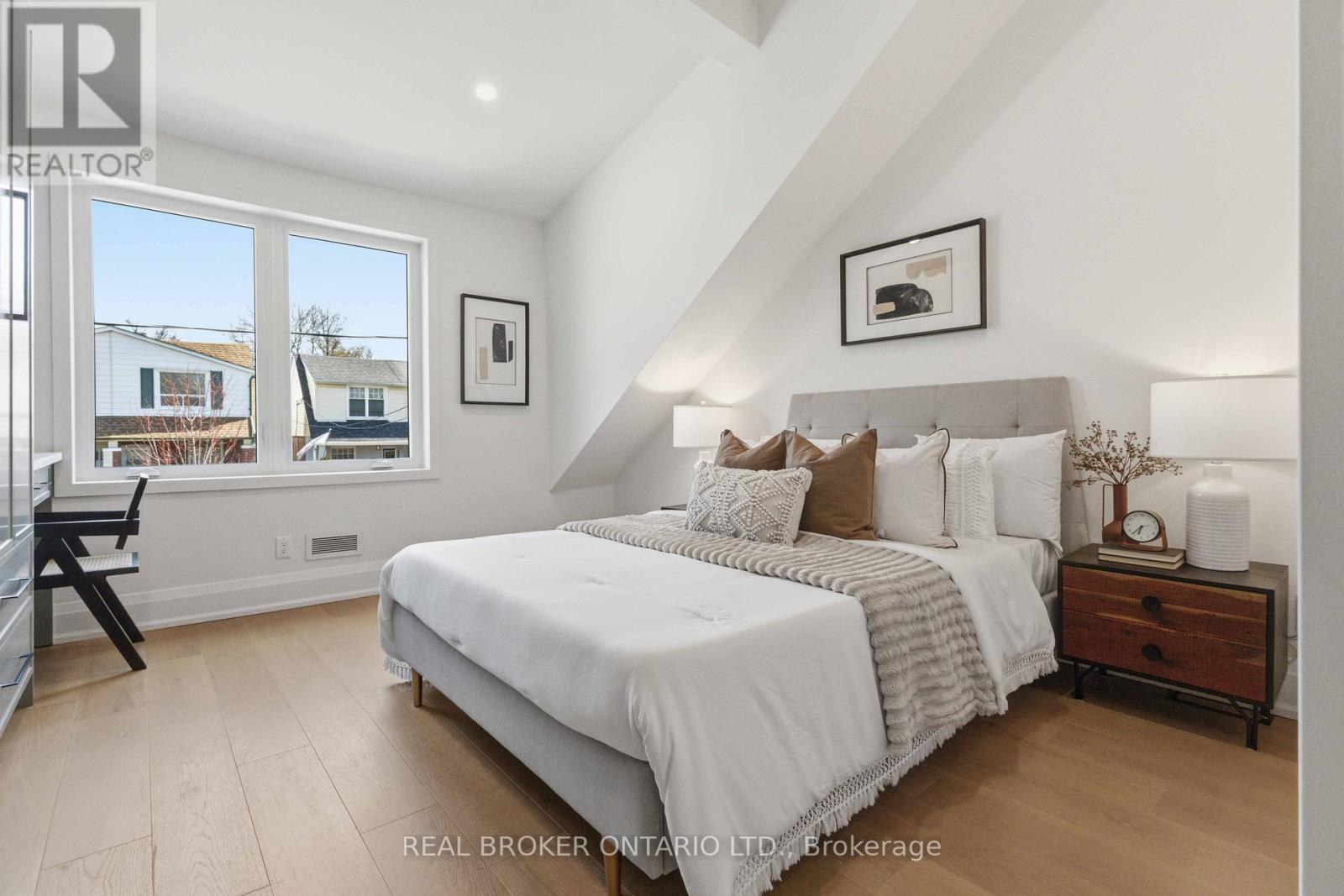 A fully renovated semi in the heart of East York, steps from East Lynn Park. From the enclosed front porch to the sun-filled open-concept main floor, 54 Moberly has been thoughtfully rebuilt to pair original character with modern comfort. The custom kitchen anchors the home with warm Taj Mahal quartz countertops, custom cabinetry, a deep farmhouse sink, gas range, and a French-door stainless fridge set against the exposed "Windy City" reclaimed brick wall. A breakfast bar with seating for three opens to a dining area for six, with oversized windows pulling natural light through the heart of the home. The adjacent living room wraps around an oak & metal picket staircase that's as much sculpture as function, and a tucked-away main-floor powder/main floor laundry room for modern day convenience. Upstairs, three well-proportioned bedrooms sit under a bright dormer roofline. The primary offers a serene, vaulted retreat with a custom built-in wardrobe wall and a quiet desk nook - ideal for working or getting ready for a night on the town. The main bath is a standout in hand-glazed emerald tile, matte black fixtures, and a deep soaker tub with rainfall shower. The lower level extends the living space with a comfortable family room, a play area for the kids, and a true spa-inspired bath - freestanding soaker, glass-enclosed shower, and warm wood-look tile throughout. A landscaped front garden, and a fully updated exterior complete the package. Life here is easy. East Lynn Park and its Thursday farmers' market sit at the end of the block, the Danforth's cafés, restaurants, and shops are moments away, and close subway access keep the downtown commute quick. Move-in ready in one of East York's most connected, community-minded pockets - come experience it in person. **RENOVATED WITH PERMITS*** for your peace of mind! (id:50787)