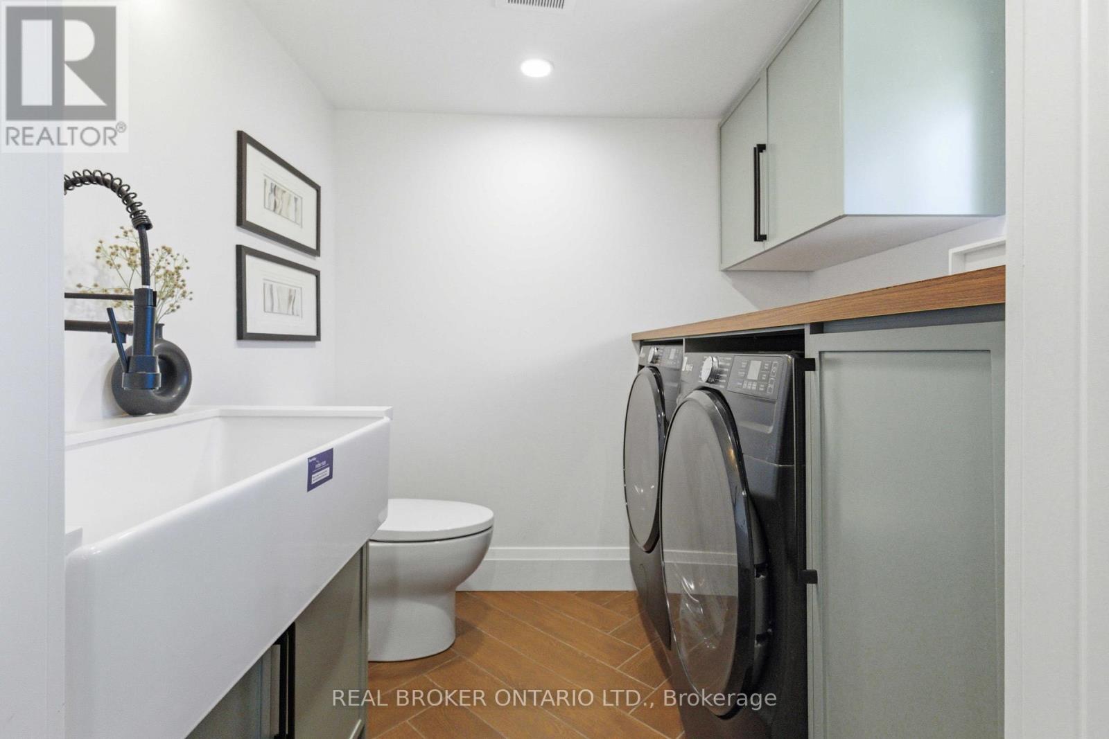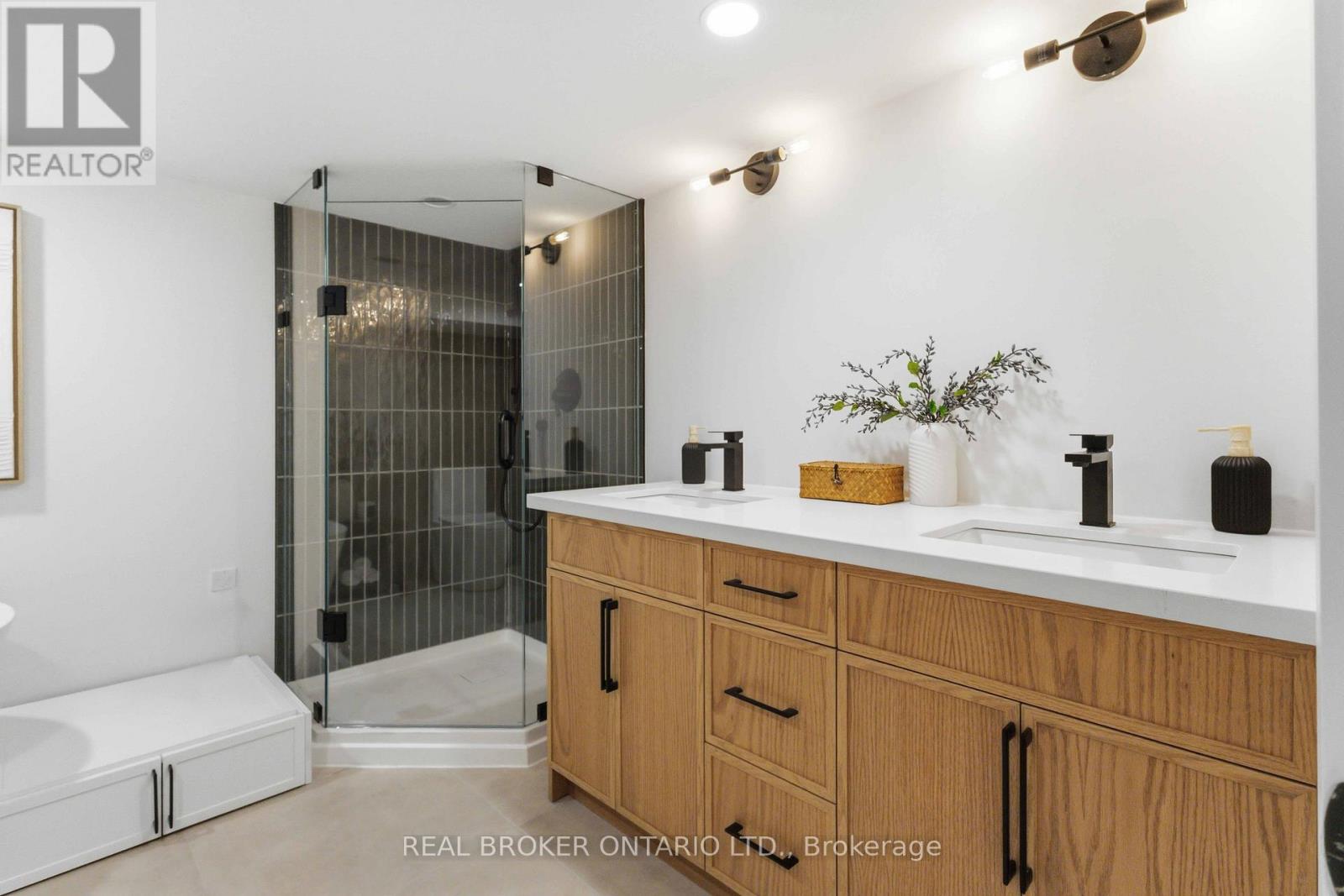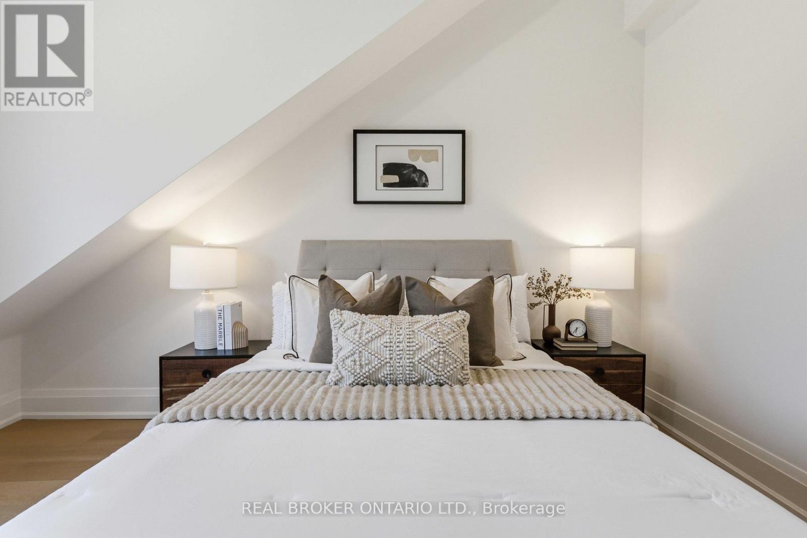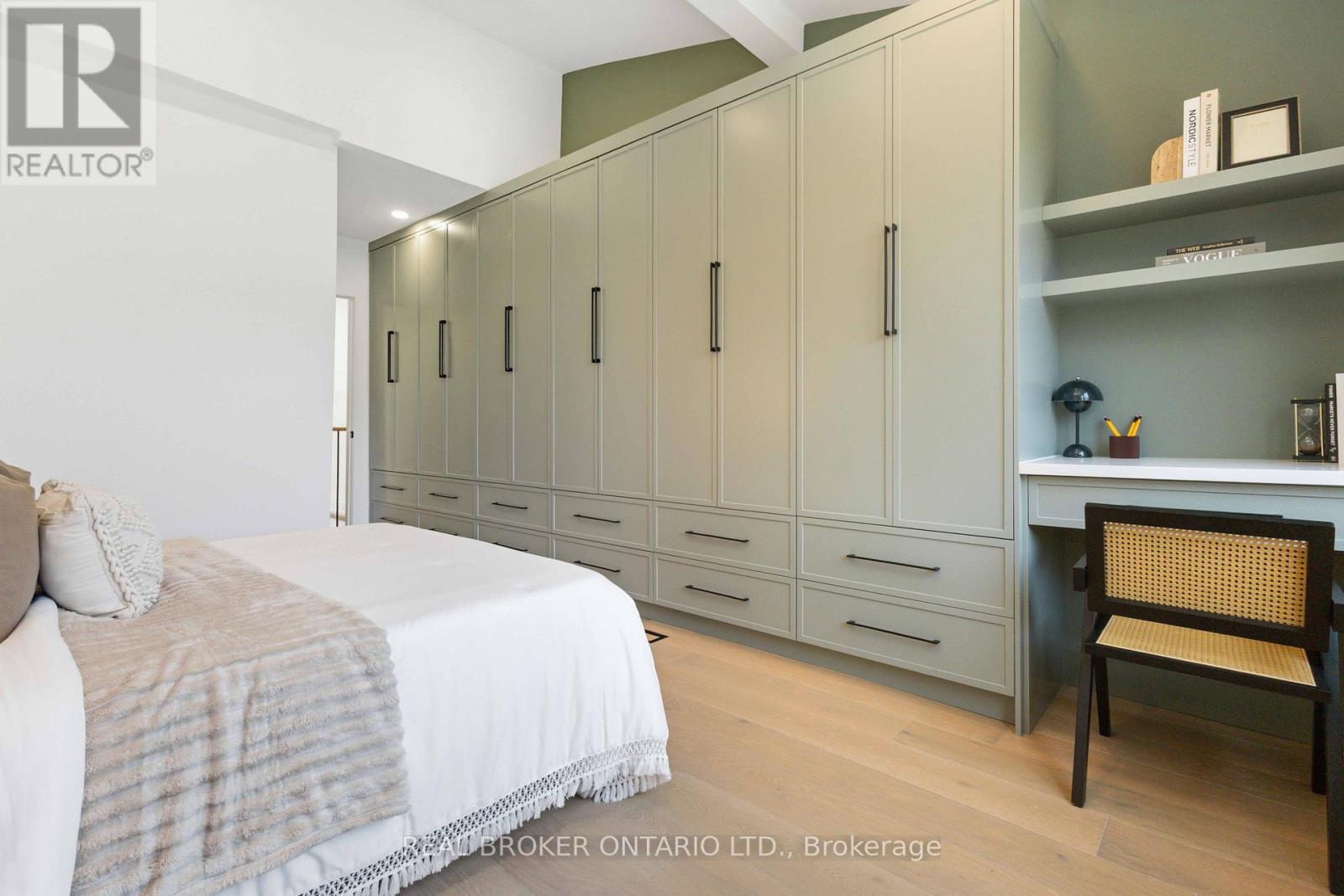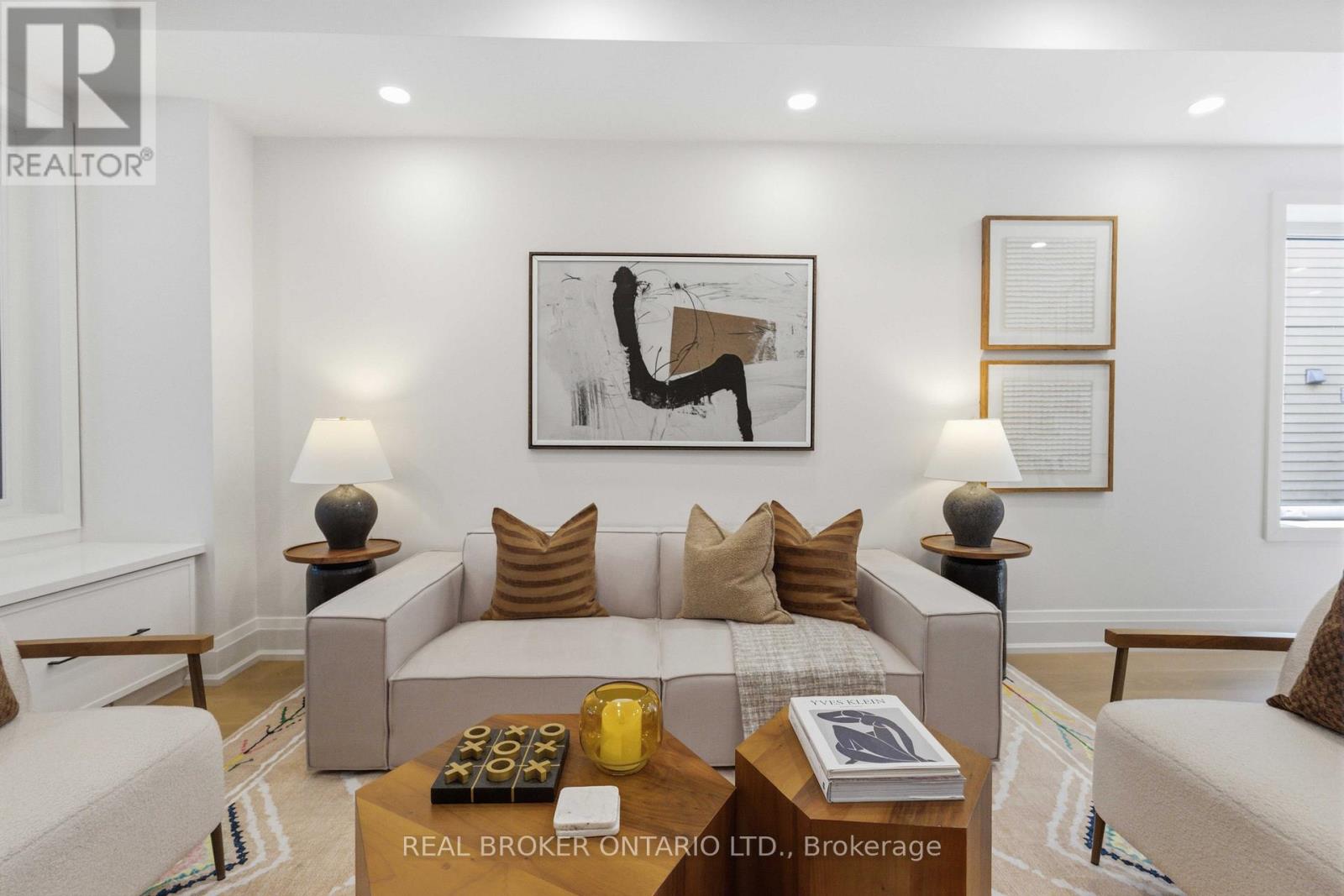 A fully renovated semi in the heart of East York, steps from East Lynn Park. From the enclosed front porch to the sun-filled open-concept main floor, 54 Moberly has been thoughtfully rebuilt to pair original character with modern comfort. The custom kitchen anchors the home with warm Taj Mahal quartz countertops, custom cabinetry, a deep farmhouse sink, gas range, and a French-door stainless fridge set against the exposed "Windy City" reclaimed brick wall. A breakfast bar with seating for three opens to a dining area for six, with oversized windows pulling natural light through the heart of the home. The adjacent living room wraps around an oak & metal picket staircase that's as much sculpture as function, and a tucked-away main-floor powder/main floor laundry room for modern day convenience. Upstairs, three well-proportioned bedrooms sit under a bright dormer roofline. The primary offers a serene, vaulted retreat with a custom built-in wardrobe wall and a quiet desk nook - ideal for working or getting ready for a night on the town. The main bath is a standout in hand-glazed emerald tile, matte black fixtures, and a deep soaker tub with rainfall shower. The lower level extends the living space with a comfortable family room, a play area for the kids, and a true spa-inspired bath - freestanding soaker, glass-enclosed shower, and warm wood-look tile throughout. A landscaped front garden, and a fully updated exterior complete the package. Life here is easy. East Lynn Park and its Thursday farmers' market sit at the end of the block, the Danforth's cafés, restaurants, and shops are moments away, and close subway access keep the downtown commute quick. Move-in ready in one of East York's most connected, community-minded pockets - come experience it in person. **RENOVATED WITH PERMITS*** for your peace of mind! (id:50787)