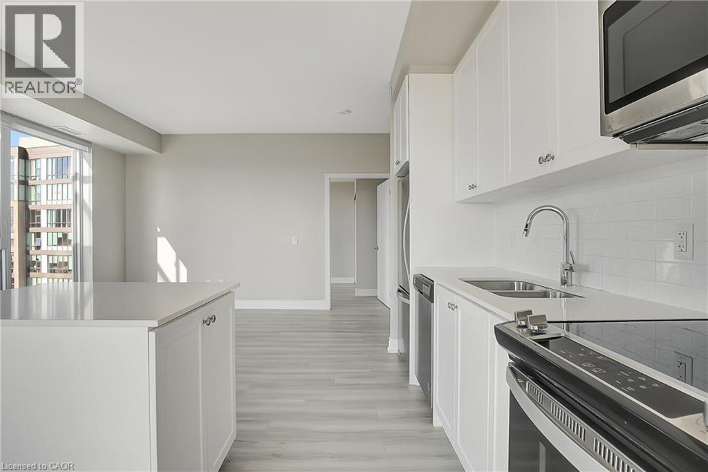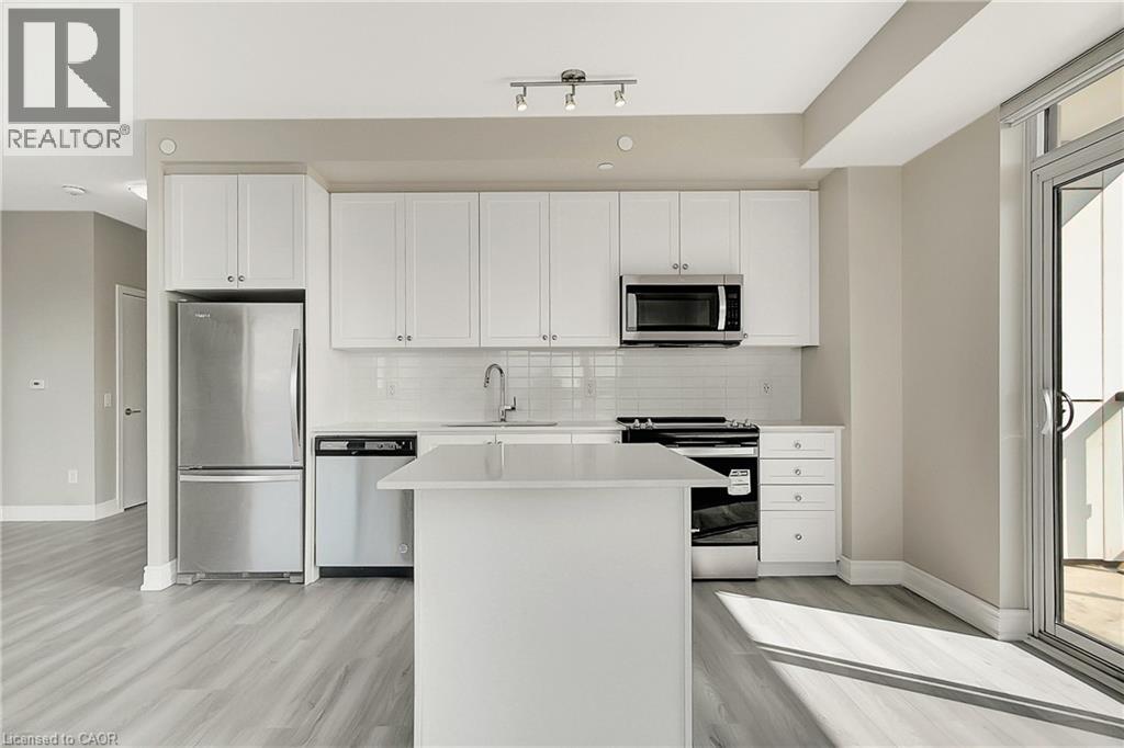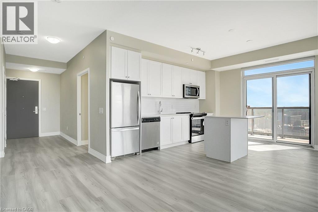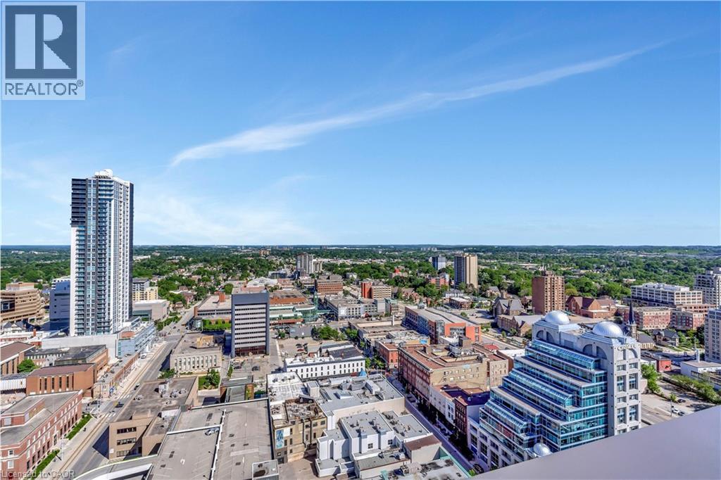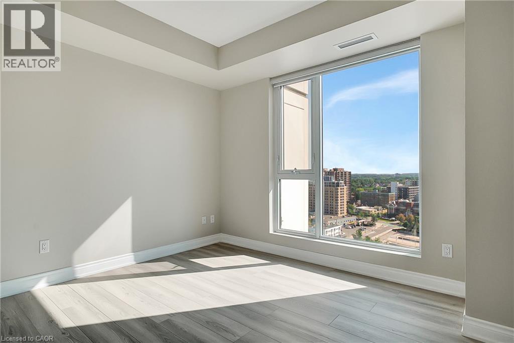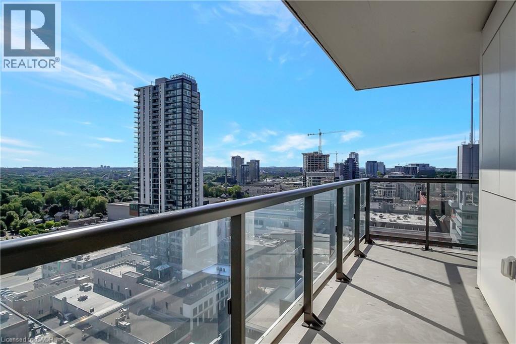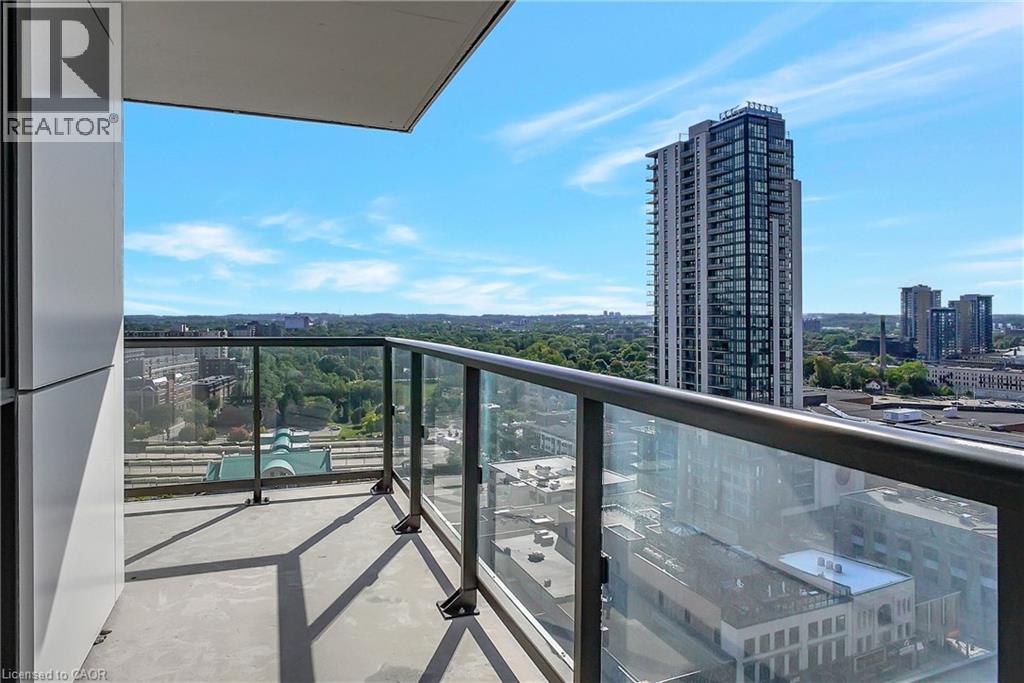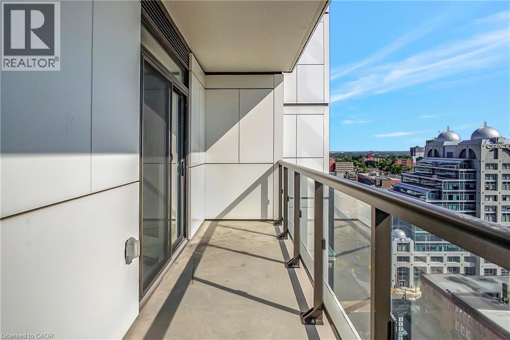 Experience elevated downtown living in this beautifully designed 2-bedroom, 2-bathroom condo in the heart of Kitchener. Offering 1,163 sq. ft. of bright, thoughtfully planned living space, this spacious unit features large windows that fill the home with natural light and showcase sweeping city views. The modern kitchen is both stylish and functional with quartz countertops, ample cabinetry, and a layout that flows seamlessly into the open living and dining areas, creating a comfortable space for everyday living or entertaining. Step outside to the impressive wrap-around balcony, providing plenty of room to relax and enjoy the skyline from multiple vantage points. Inside, upgraded flooring adds a polished feel throughout the unit, while the primary bedroom offers a well-appointed ensuite with a spacious walk-in shower. Ensuite laundry and a dedicated parking space add to the convenience. Located in one of Kitchener’s most connected neighbourhoods, this home places you just steps from the LRT, City Hall, Google, and the region’s thriving tech hub, along with an incredible selection of restaurants, cafés, and shops. Victoria Park is also nearby, offering beautiful green space and year-round events. Residents enjoy a wide range of amenities including a rooftop jogging track, fully equipped exercise room with spin bikes, outdoor yoga space, dog wash station, third-floor sun terrace, and a shared BBQ area. A fantastic opportunity to enjoy modern condo living in the centre of it all. (id:50787)