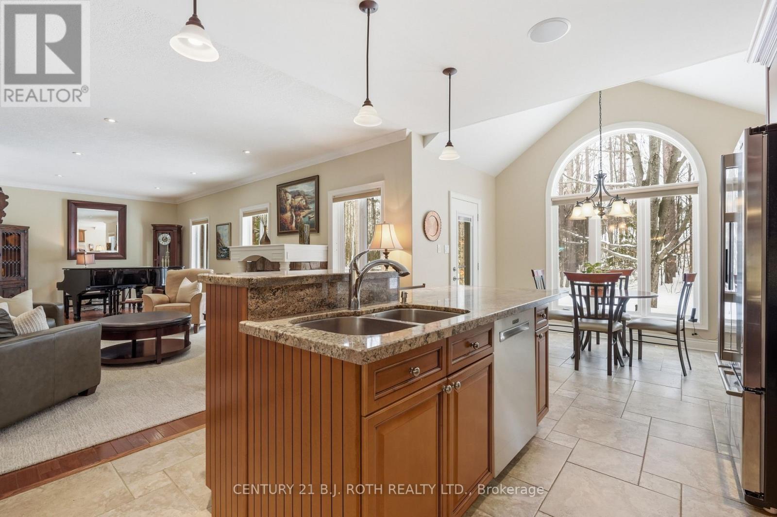 Timeless Estate Living in One of Simcoe County's Most Prestigious Enclaves. Gracefully poised on a private, fully landscaped estate lot framed by towering mature trees, this former model home by esteemed builder S.L. Witty is a masterclass in timeless architecture and enduring craftsmanship. A grand stone walkway and impeccably manicured grounds create a striking arrival, setting the tone for the elegance within. Inside, a thoughtfully designed split-bedroom layout offers 3 bedrooms, 4 bathrooms, and an impressive loft, blending refined privacy with exceptional functionality. The open-concept main level is illuminated by expansive windows that flood the home with natural light. Rich hardwood floors, crown moulding, California knockdown ceilings, and a gas fireplace create a warm yet sophisticated ambiance. At the heart of the residence, the gourmet kitchen showcases stainless steel appliances, gleaming granite countertops, and seamless flow into the living and dining areas, perfectly suited for elegant entertaining and elevated everyday living. The primary suite is a private sanctuary, complete with a walk-in closet, luxurious 5-pc. ensuite, and walkout to the serene backyard retreat. Above, the expansive loft with its own 2-pc. bath offers exceptional versatility, ideal as an executive office, guest suite, or media lounge. The fully finished lower level extends the living space with an additional bedroom, full 3-pc. bath, fully equipped wet bar, spacious recreation & games area, and abundant storage, designed for entertaining and multigenerational comfort. Outdoors, a stone patio anchors the professionally landscaped grounds, offering rare privacy and tranquility. Perfectly positioned to enjoy the best of the region, this distinguished residence is moments from prestigious golf courses, the fresh harvests of Barrie Hill Farms, and premier ski resorts, offering four-season recreation and an exceptional lifestyle in one of Simcoe County's most coveted neighbourhoods. (id:50787)