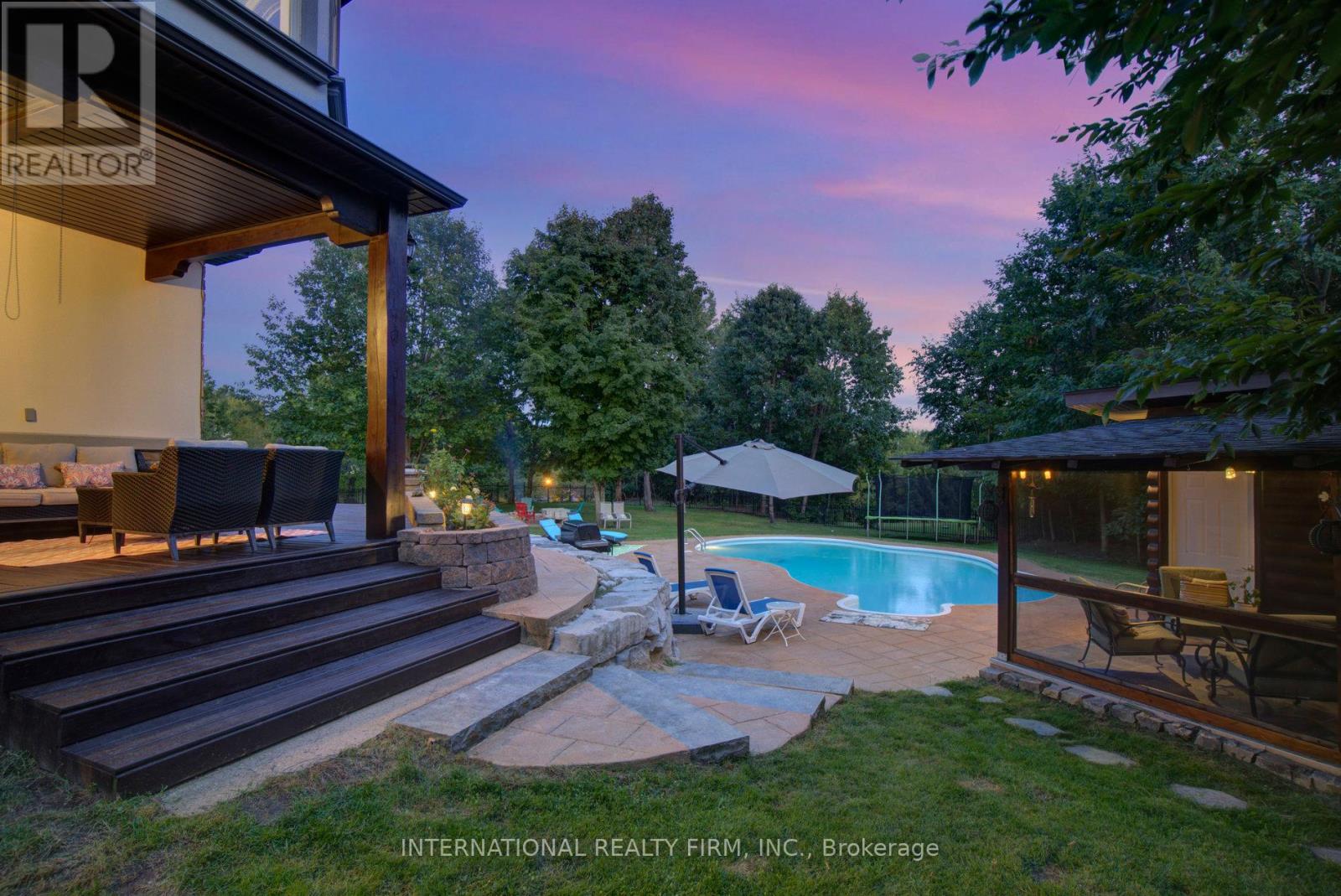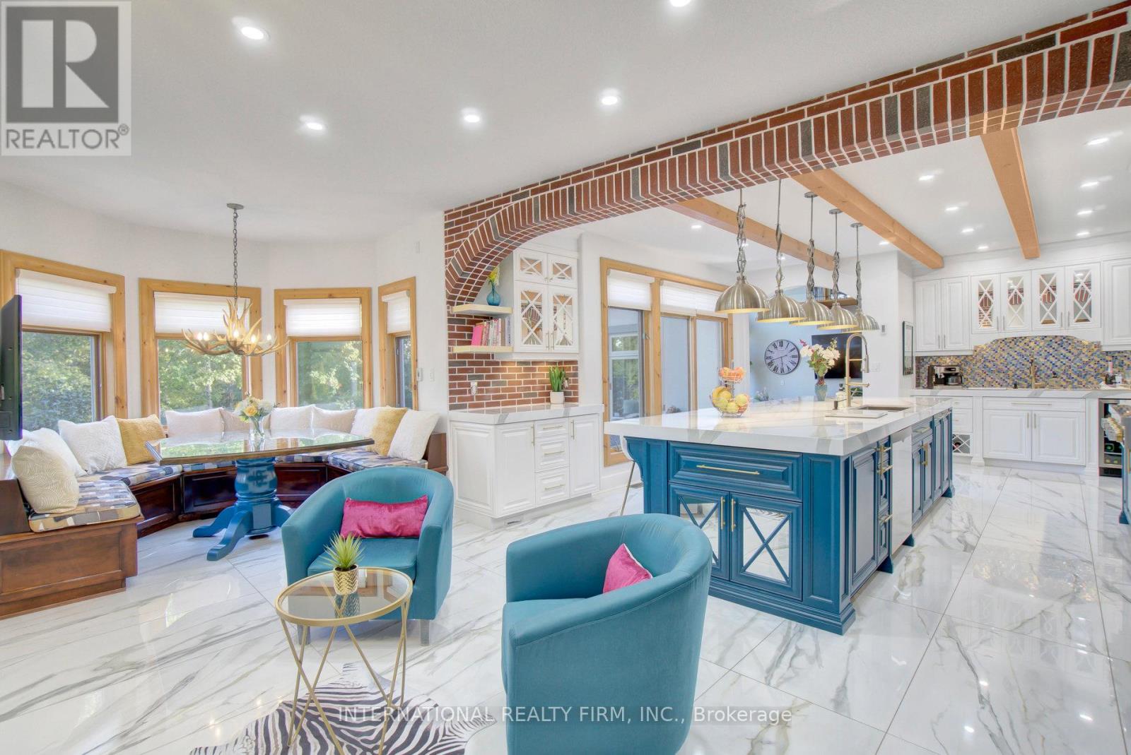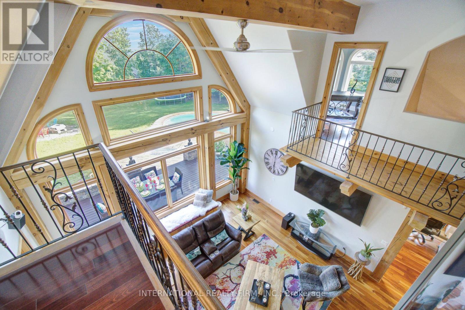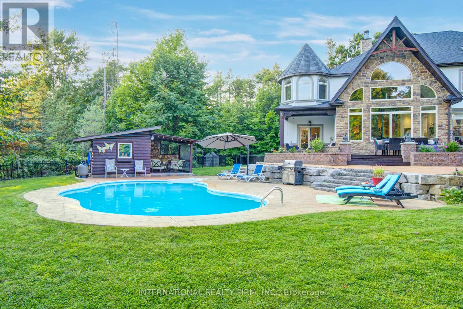 Experience the ultimate retreat in this stunning custom-built estate, perfectly positioned on a private 1.62-acre lot just minutes from Barrie. Designed for the move-up buyer seeking space and sophistication, this residence offers over 7,000 square ft of high-end living space that functions as both a grand entertaining venue and a private family sanctuary. Step into a breathtaking two-storey foyer, where polished porcelain floors meet a signature chandelier. The heart of the home is the massive Great Room, where 24-ft cathedral ceilings and a double-sided stone fireplace meet a wall of panoramic windows overlooking your private "Pool Paradise"-a spectacular backyard oasis featuring a saltwater pool, pool house, and lush professional landscaping. The chef's kitchen is a showstopper, anchored by a 12x5 Ft quartz island and top-of-the-line stainless appliances. Detailed with brick arches, pine beams, and a dedicated butler's bar and baking station, it is a dream space for hosting. An elegant dining room awaits your next dinner party, paired with a "Zen-like" family room perfect for quiet evenings. The primary suite is a true luxury retreat, featuring its own fireplace, a private Juliette balcony, and a spa-style ensuite with heated floors and a deep-soaking Jacuzzi. The home's unique character continues to the second floor with an elevator lift, a built-in library, and a spectacular octagonal room featuring soaring cathedral ceilings. Designed for versatility, the property includes an ultra-convenient 2nd-floor laundry, a contemporary guest suite with its own kitchenette and ensuite, plus a massive lower level featuring a gym, dance studio, and billiards room. Outside, the 1.64-acre grounds are fully fenced for privacy, featuring a circular driveway with parking for 13 cars and a 3-car garage with 14-ft ceilings. Nestled on a quiet cul-de-sac only 10 minutes from Barrie and 25 minutes from Wasaga Beach, this is the definitive 4-season estate for the discerning buye (id:50787)