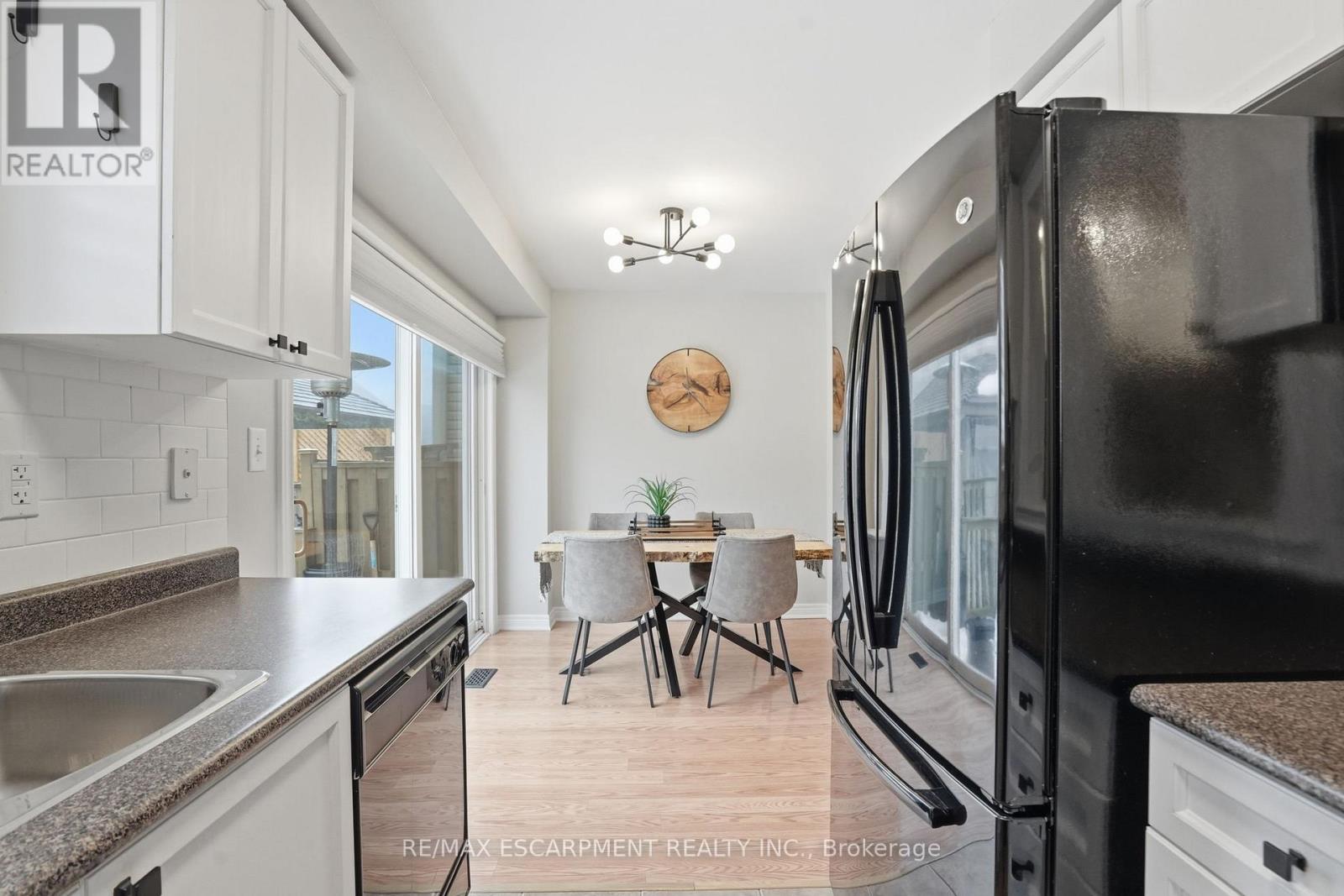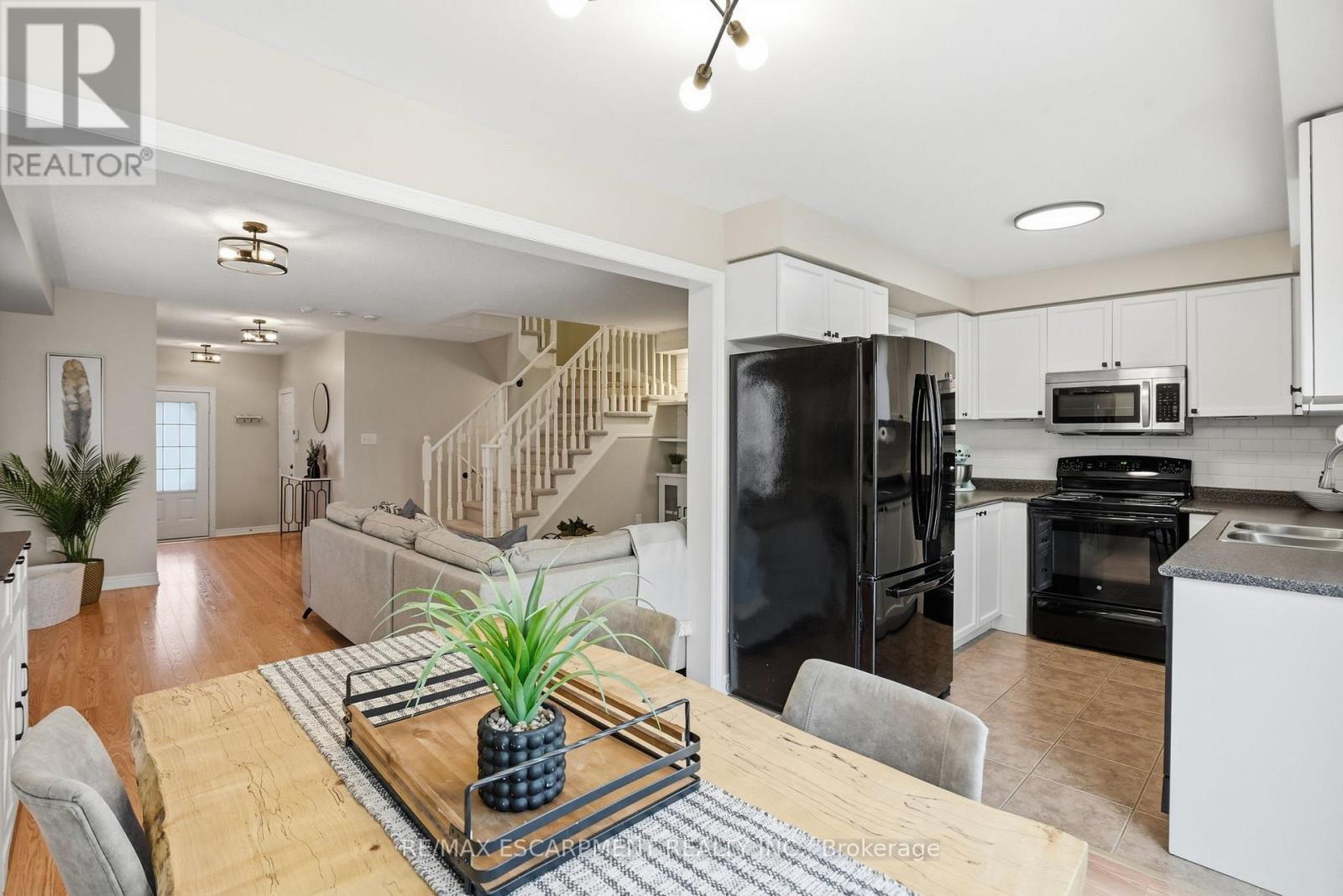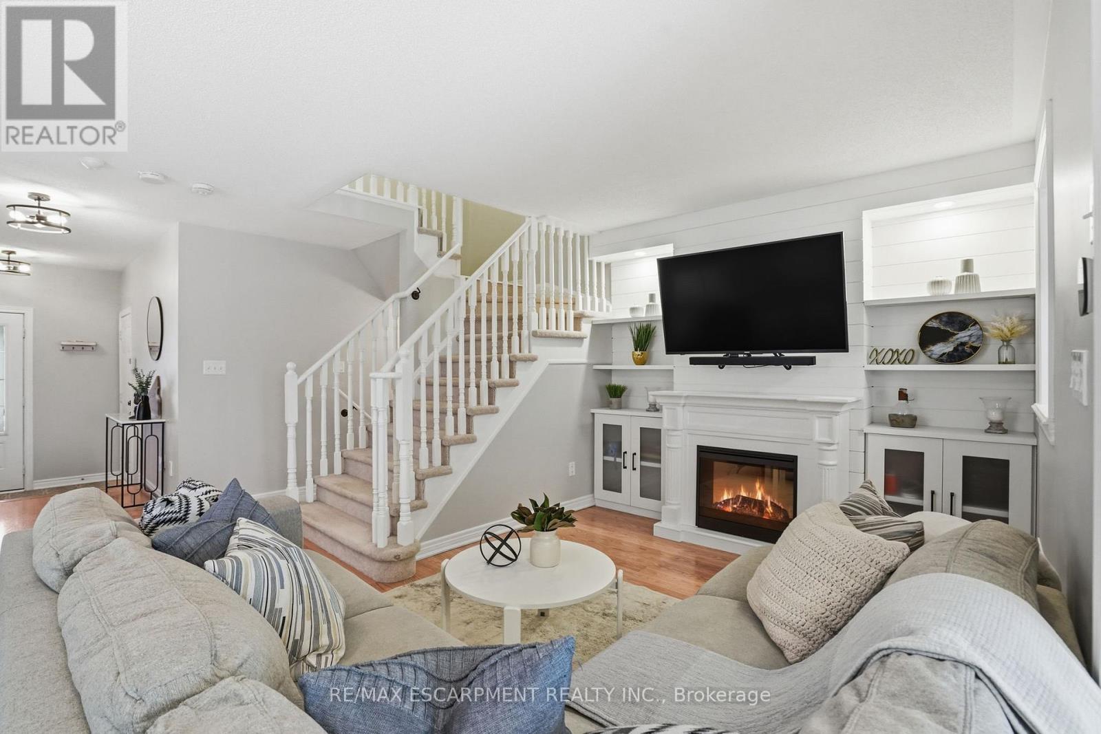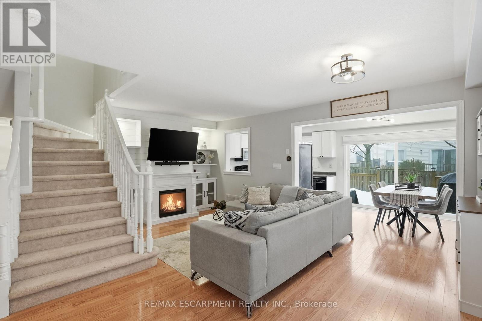 Discover incredible value in East Waterdown with nearly 2,000 square feet of living space across three beautifully finished levels! Welcome to 66 Blue Sky Trail, an end-unit townhome where extra windows and only one shared wall mean natural light and privacy throughout. The main level features an open-concept living and dining area with custom shiplap built-ins and a cozy fireplace, plus a kitchen that opens to the backyard with a spacious deck - perfect for summer entertaining. A convenient two-piece powder room completes this level. Upstairs, you'll find three well-sized bedrooms, a full-size laundry room and a primary suite with a walk-in closet and beautifully upgraded ensuite featuring reglazed tile, a new vanity and modern fixtures. The fully finished lower level offers a fourth bedroom, a full bathroom and a generous recreation room - ideal for a playroom, home gym or media space. Freshly painted top to bottom with a new garage door and opener. Steps to parks, schools, shopping and downtown Waterdown with quick access to the QEW, 403, 407 and both Aldershot and Burlington GO stations. RSA. (id:50787)