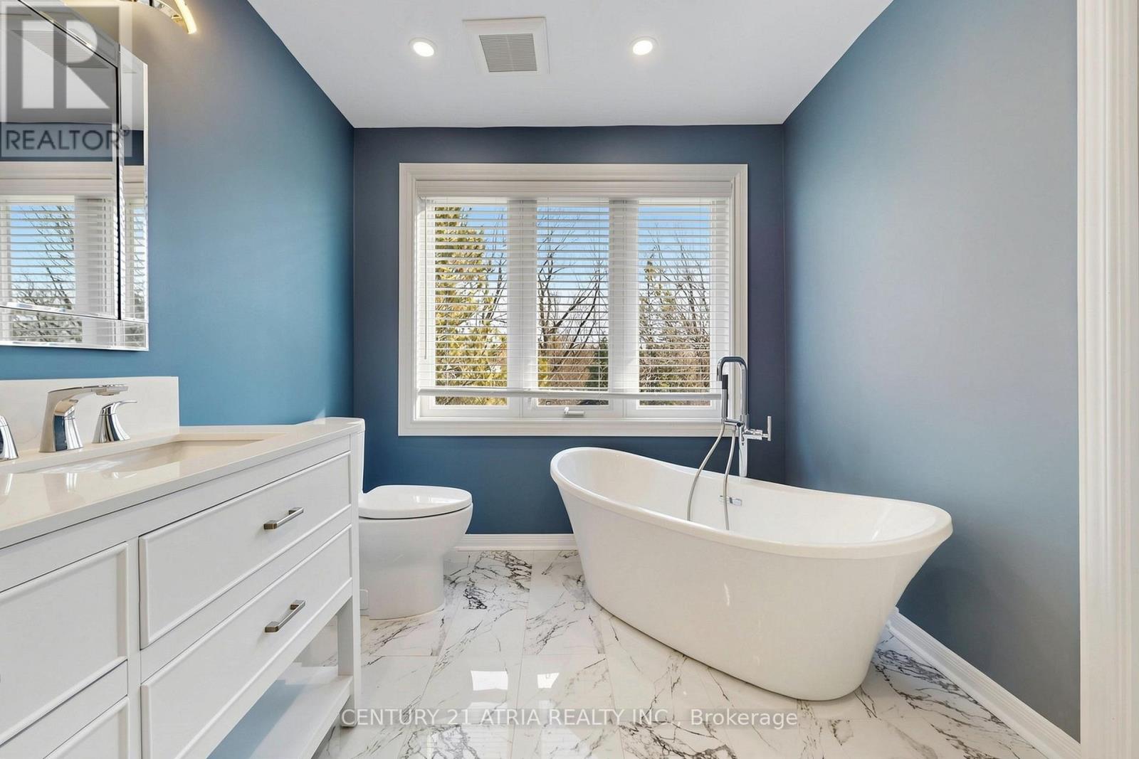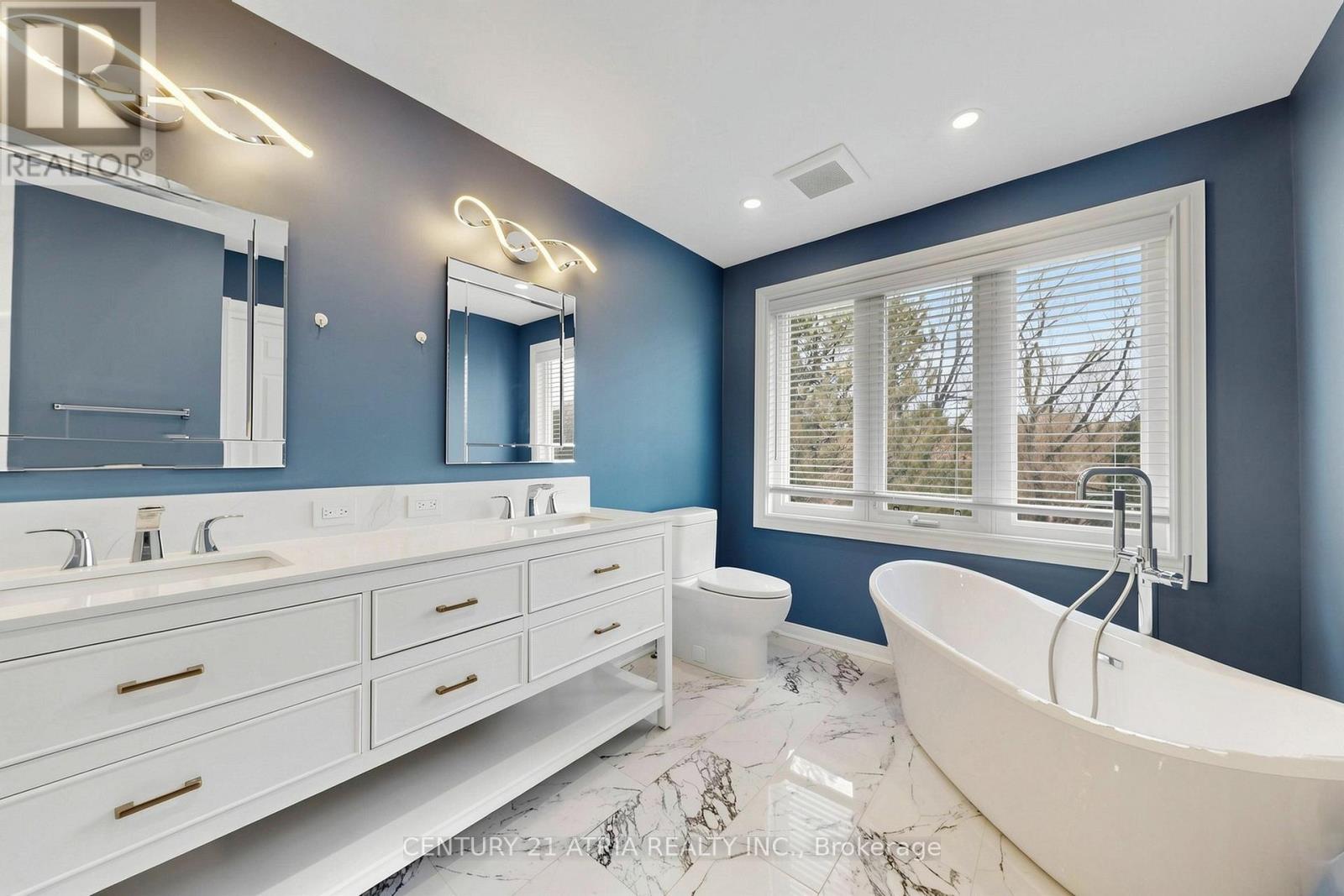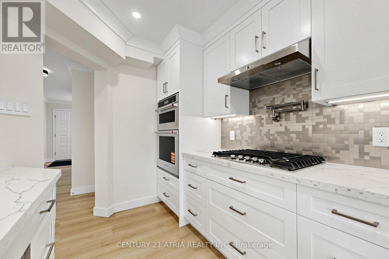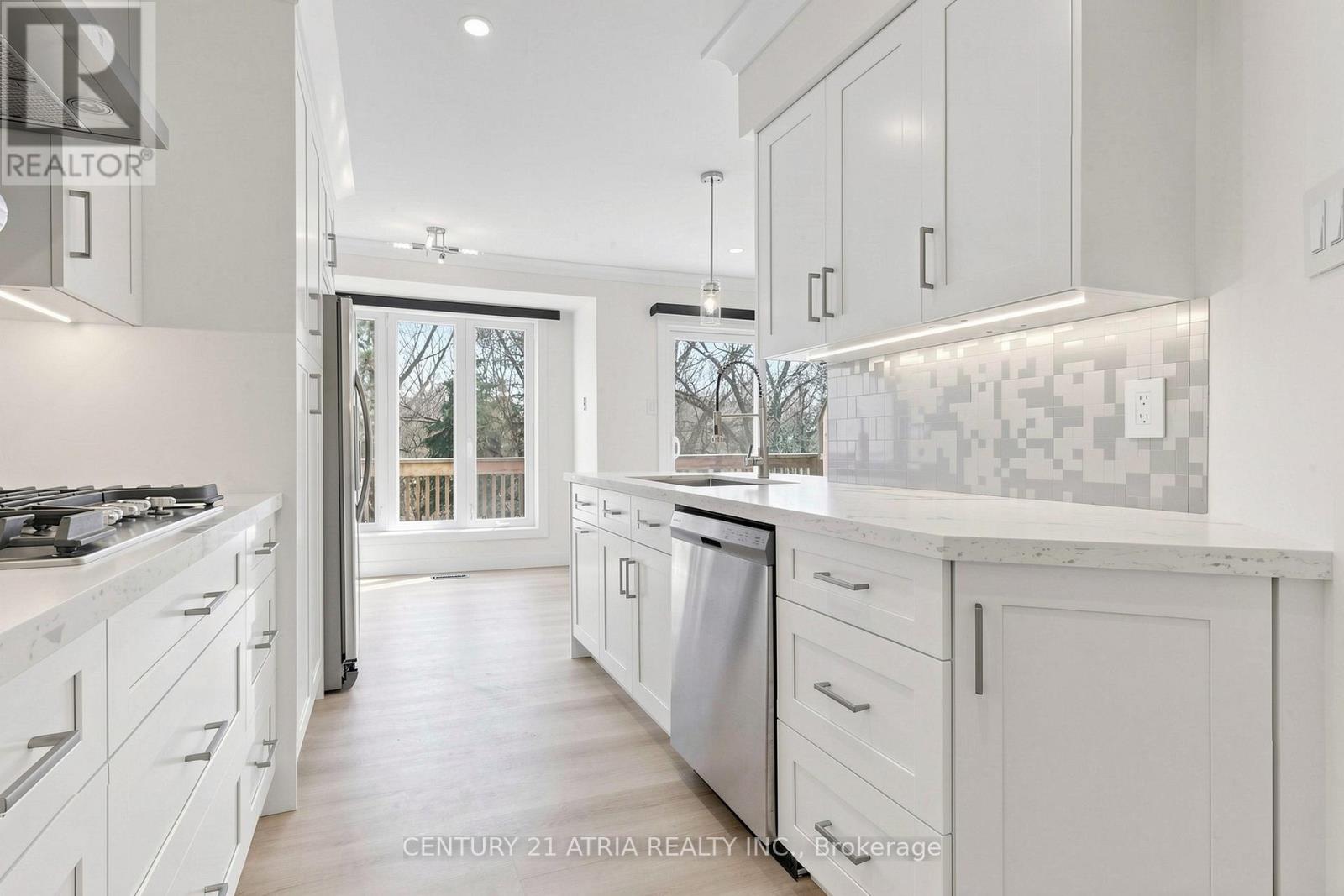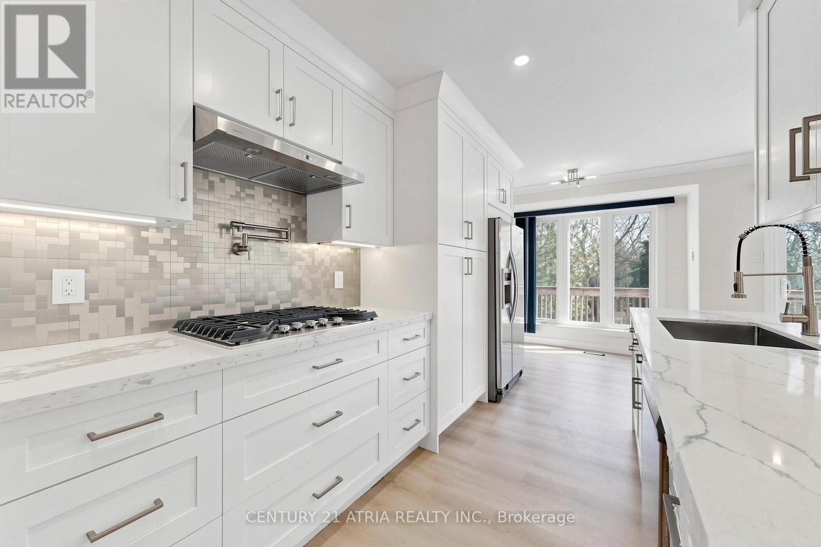 Tucked away in an exceptionally rare, quiet, and picturesque enclave, this home is a total hidden gem. The interior has just been completely renovated and updated with sleek, high-quality modern designer finishes, be the very first to enjoy them! The south-facing views of the forest and ravine are truly incredible, creating a seamless indoor-outdoor feel from every level. Imagine enjoying your morning coffee or evening sunsets with nature as your backdrop from every level. The open concept main floor is a spacious, bright and airy space with plenty of natural light, anchored by a brand-new, magazine-worthy designer kitchen. You'll love the custom cabinetry, KitchenAid built-in oven, gas stovetop, sleek modern backsplash, pot filler and quartz countertops. It even has a walkout to the deck overlooking the trees and ravine! Upstairs, the expansive primary bedroom and ensuite frame peaceful forest views. Luxuries include a large walk-in closet with custom built-ins, and a lavish SIX-piece spa-inspired ensuite complete with dual vanities, a large dual shower, and high-end modern fixtures. Relax in the freestanding soaker tub overlooking the forest views. All four bathrooms have been completely overhauled to this exact standard. Timeless designer quality defines the entire home: all new flooring, custom railings, new hardware, fresh paint, new window coverings, and smooth ceilings accented by designer lighting, pot lights, and ceiling fans. The lower level adds even more space with a large recreation room filled with natural light from the direct walkout to green space, and features a stone fireplace accent wall. Located steps from Summerhill Market, top schools, and parks, this home combines seclusion with convenience. (id:50787)
