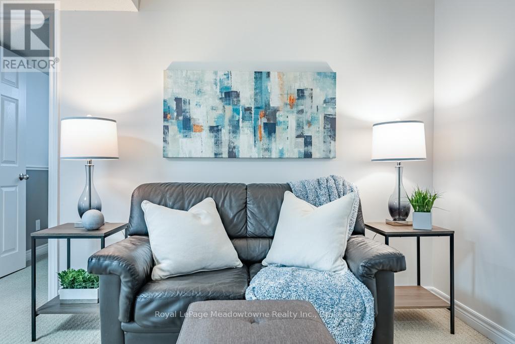 Lowest condo fees in Milton + 2 parking spaces! Step into this bright and well cared for lower level end unit stacked townhouse where you'll immediately notice how easy life feels here. With approx 1441 sq ft of thoughtfully designed living space, this home offers the perfect blend of comfort, function, and low-maintenance living in a convenient Milton location. The open-concept main level is filled with natural light, thanks to large windows that make the space feel airy and welcoming. Whether you're unwinding by the electric fireplace or cooking for friends, the upgraded kitchen is a true highlight, featuring new quartz countertops, a stylish backsplash, plenty of cabinetry, and a pantry to keep everything neatly tucked away. One of the standout features is the main floor primary bedroom complete with a large walk-in closet and a private upgraded 3pc ensuite, offering a quiet retreat at the end of the day. Heading down the stairs, the finished lower level continues to impress with two additional bedrooms, a full bathroom, laundry room and a versatile rec room. We can't forget the amount of storage built into this unit, whether it's in the closets, garage or secret space behind the fireplace, there's room for all your belongings. Outside, enjoy your own front patio spanning the width of the unit and conveniently facing green space. **PERKS** This unit comes with TWO parking spaces. Not only is there a garage with interior access to the home, there is also an extra surface level parking spot! This is a fantastic opportunity for buyers looking for a well-maintained, move-in-ready home with low condo fees and convenient access to parks, schools and major routes. (id:50787)