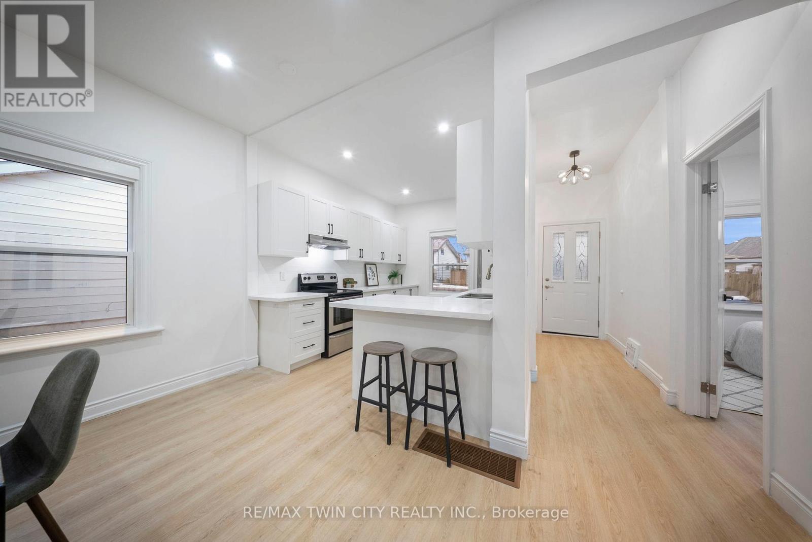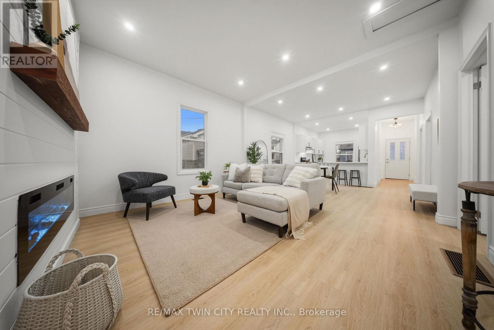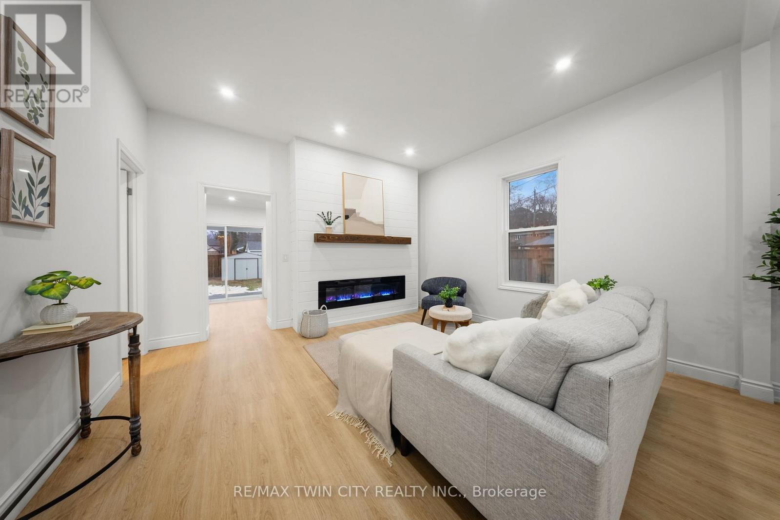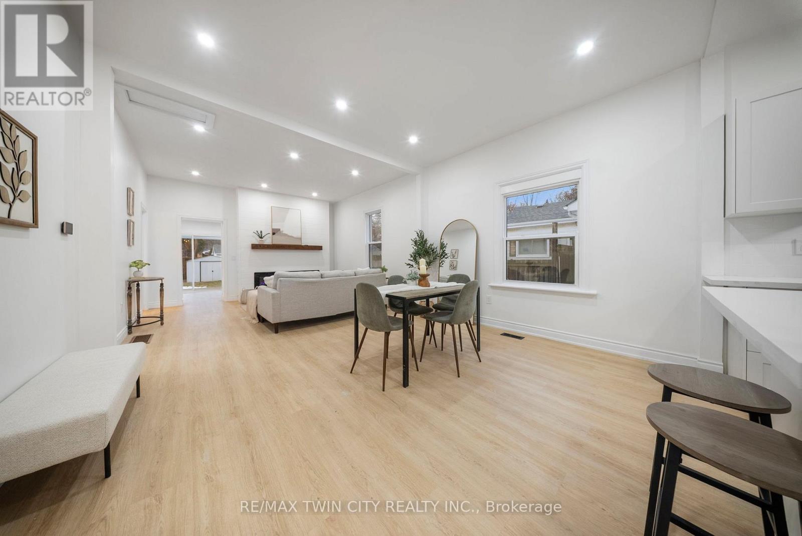 Welcome to 8 Main Street in the City of Brantford. This spacious, fully renovated bungalow offers over 1,300 sq ft of move-in-ready living space, ideal for families or those seeking both comfort and functionality. The home features 3 well-appointed bedrooms (all with closets) and 2 bathrooms, along with a bright open-concept main floor designed for modern living. Enjoy a separate dining area and a large living room highlighted by a stylish accent wall with a built-in fireplace. The updated kitchen is equipped with quartz countertops, a convenient breakfast peninsula, and ample cabinetry. High ceilings and large windows provide an abundance of natural light throughout. Main floor laundry adds everyday convenience. A versatile second main-floor living area or rec room offers additional space for relaxing or entertaining, complete with a patio door providing direct access to the rear deck. Recent updates include luxury vinyl plank flooring throughout, LED lighting, updated windows and doors, a 100-amp breaker panel, furnace, central air conditioning, and more. The unfinished basement presents excellent potential for up to 1,000 sq ft of additional living space-perfect for extra bedrooms, an in-law setup, recreation area, or ample storage. Step outside to a large stamped concrete patio overlooking the expansive, private fenced backyard-ideal for entertaining. The outdoor space also features a garden area to grow your own veggies, a small pond previously used for koi fish, and a steel shed situated on a new concrete pad. A truly turn-key property offering space, updates, and versatility. Schedule your viewing today! (id:50787)