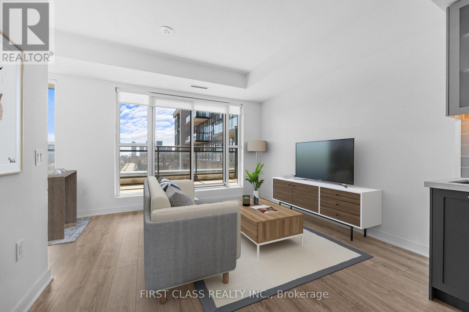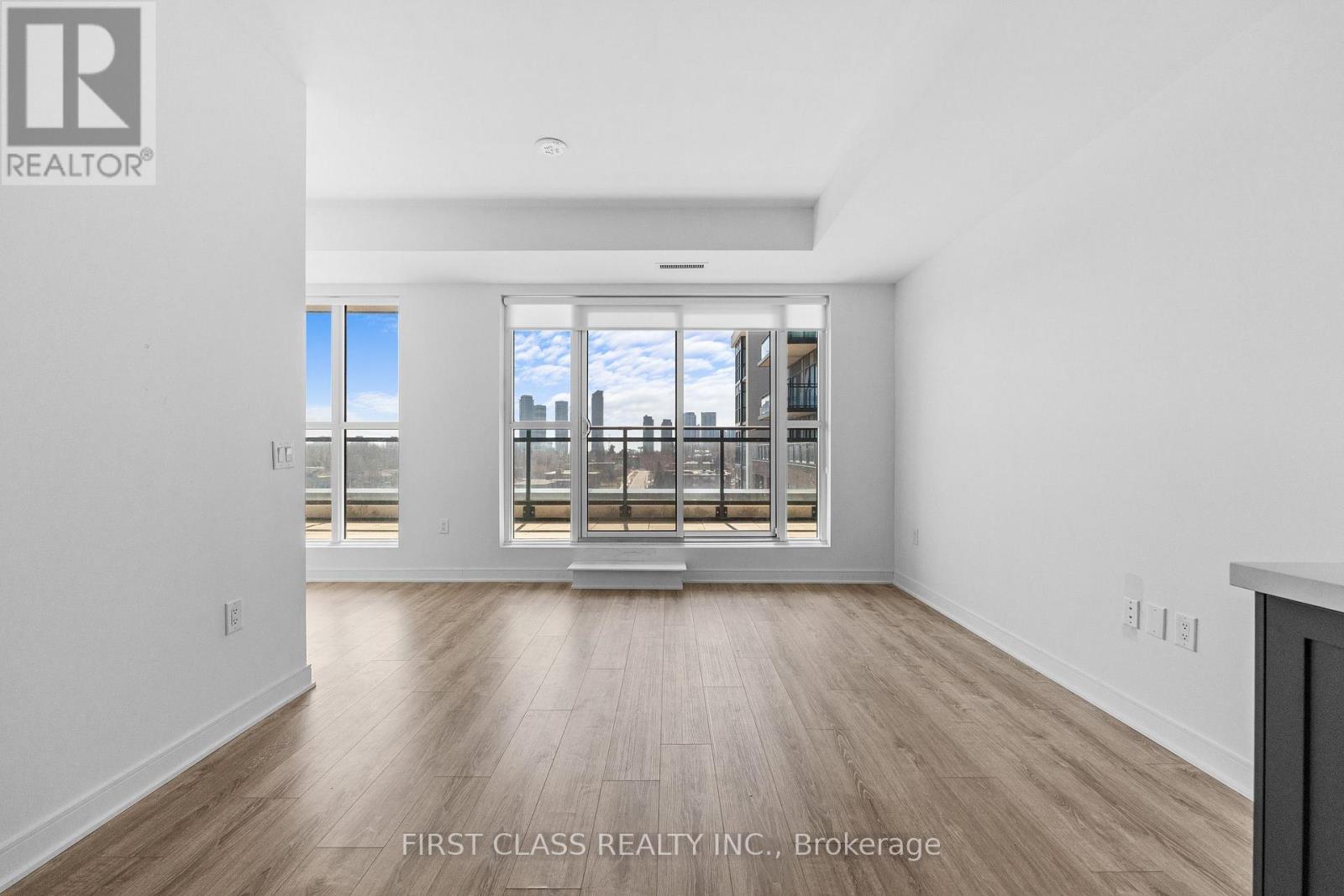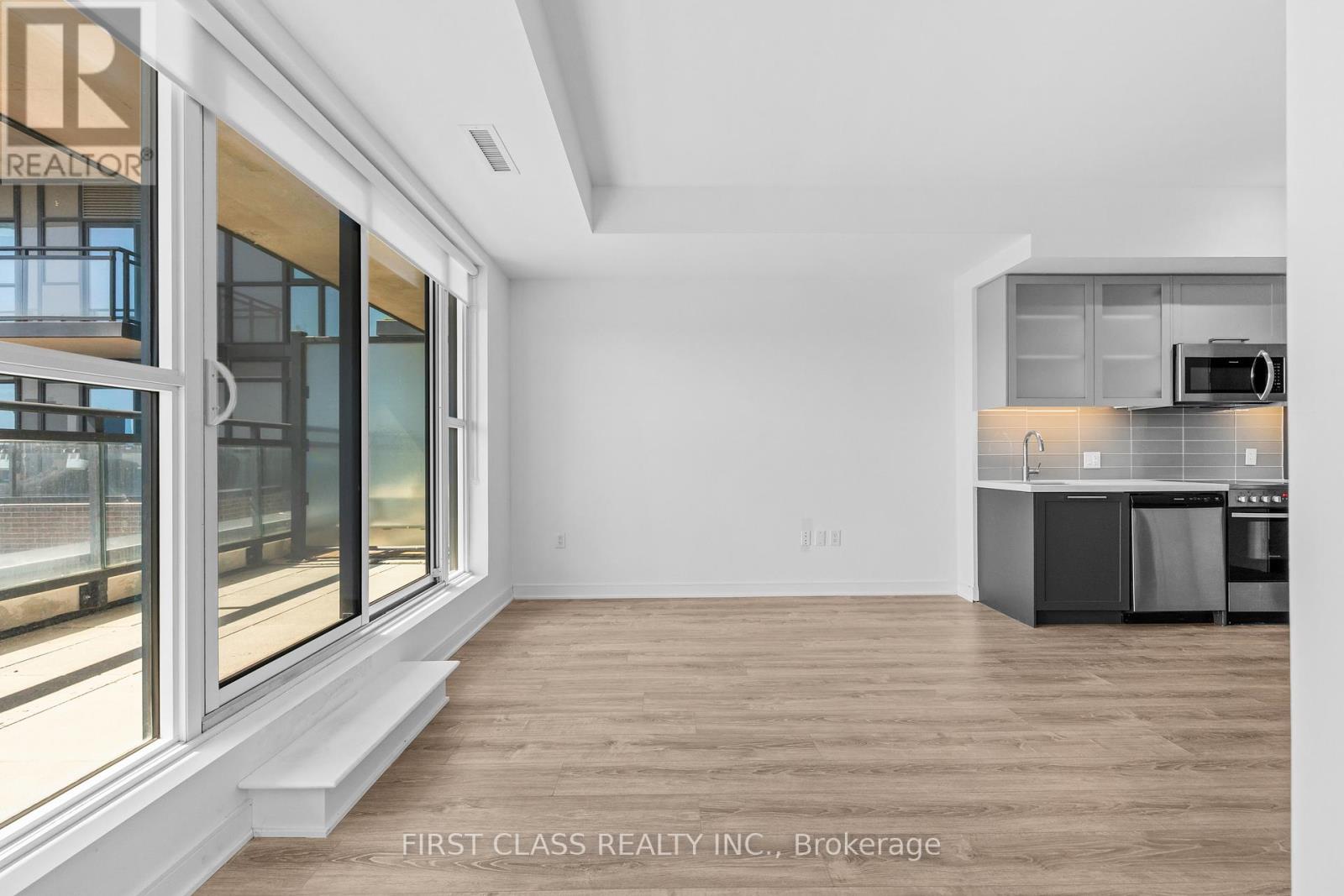 Stunning Corner Suite In One Of Etobicoke's Most Exciting New Buildings. Perched On A Higher Floor, This Thoughtfully Designed Unit Offers Sweeping Unobstructed Southwest Views Of The CN Tower And Lake Ontario - Visible Right From Your Open-Concept Living Space. The Contemporary Kitchen Features Sleek Grey Cabinetry With Glossy Uppers, Stainless Steel Frigidaire Appliances Including A Full-Size Range, Built-In Dishwasher, And Fridge - Ideal For Those Who Love To Cook And Entertain. Wide-Plank Laminate Flooring Flows Throughout The Sun-Drenched Living And Dining Area, Anchored By Floor-To-Ceiling Windows And A Walk-Out To An Oversized Wrap-Around Terrace - A Rare Outdoor Space That Truly Sets This Unit Apart. Located Steps From Transit, Parks, And The Humber River Trail System, With Quick Access To The Gardiner, 427, And Sherway Gardens! (id:50787)