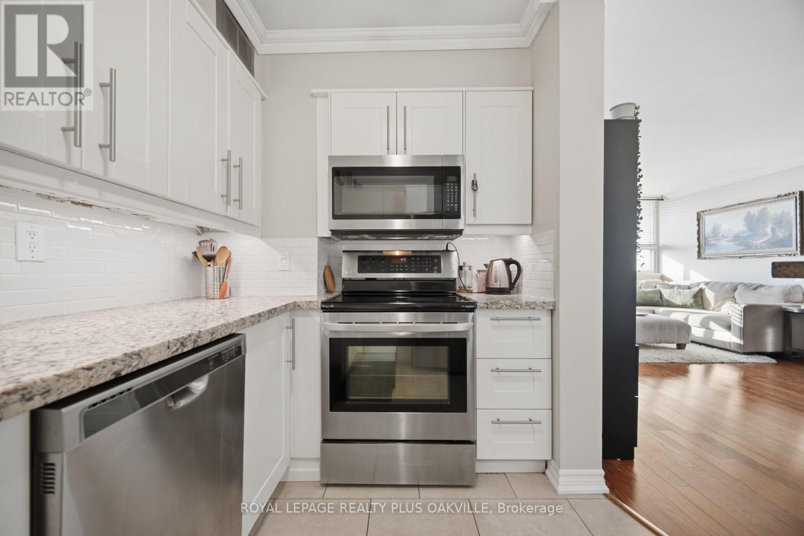 Beautifully renovated 2 bedroom with open concept layout and unobstructed sunset views! Renovated kitchen with stainless steel appliances and granite counters. Renovated bathroom. Strip Hardwood Flooring throughout (carpet free)!! Large living room with electric fireplace and walk out to Balcony. Sunset Unobstructed NW views! Shows beautifully! Air conditioning wall unit, all utilities included in rent (except internet & phone). 2 parking underground!! Conveniently located in Kerr St Village walk to shops, restaurant, rink, lake, walk to downtown Oakville! Transit at your doorstep and Art centre nearby. So many place to enjoy only steps away!! Shows 10/10. (id:50787)