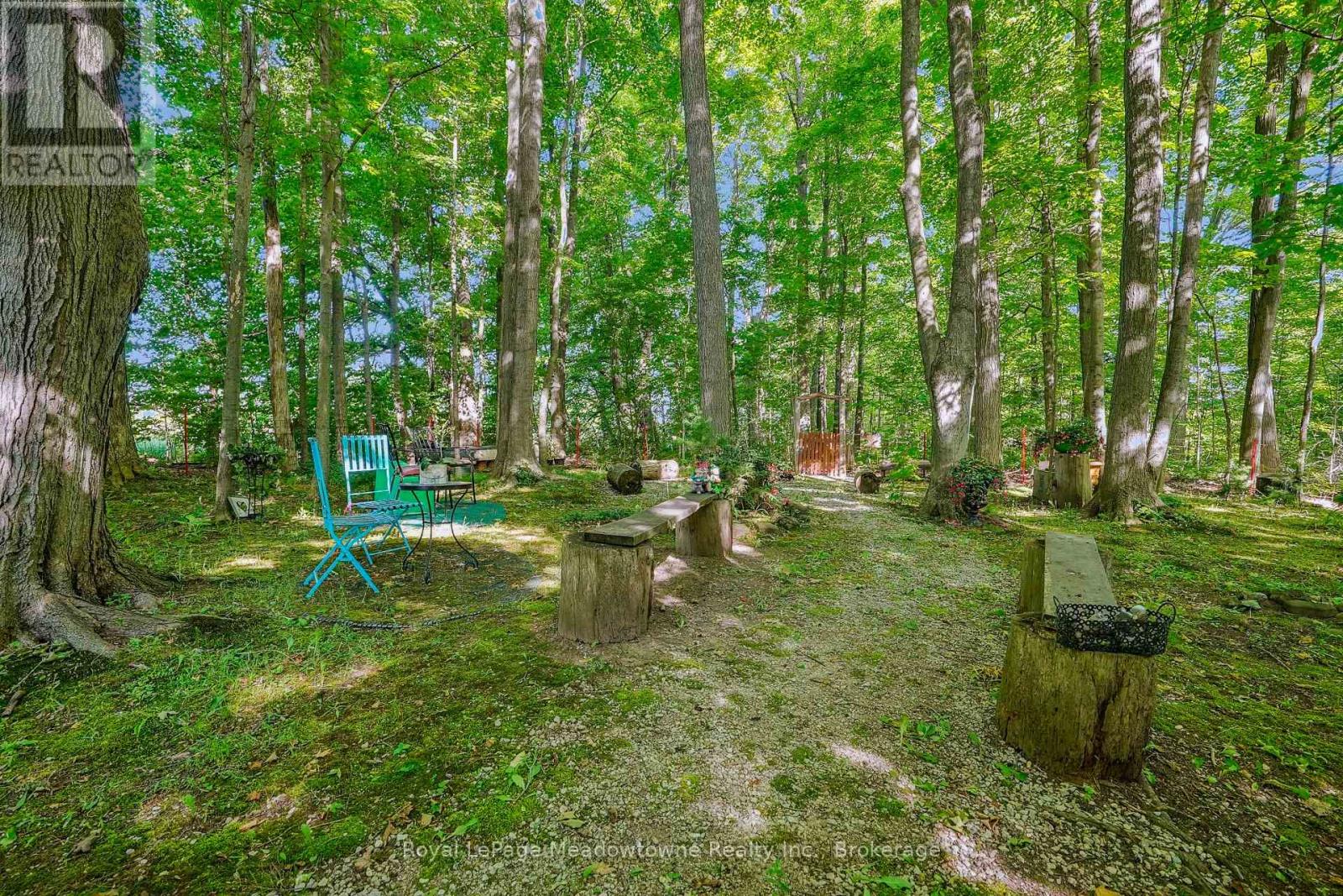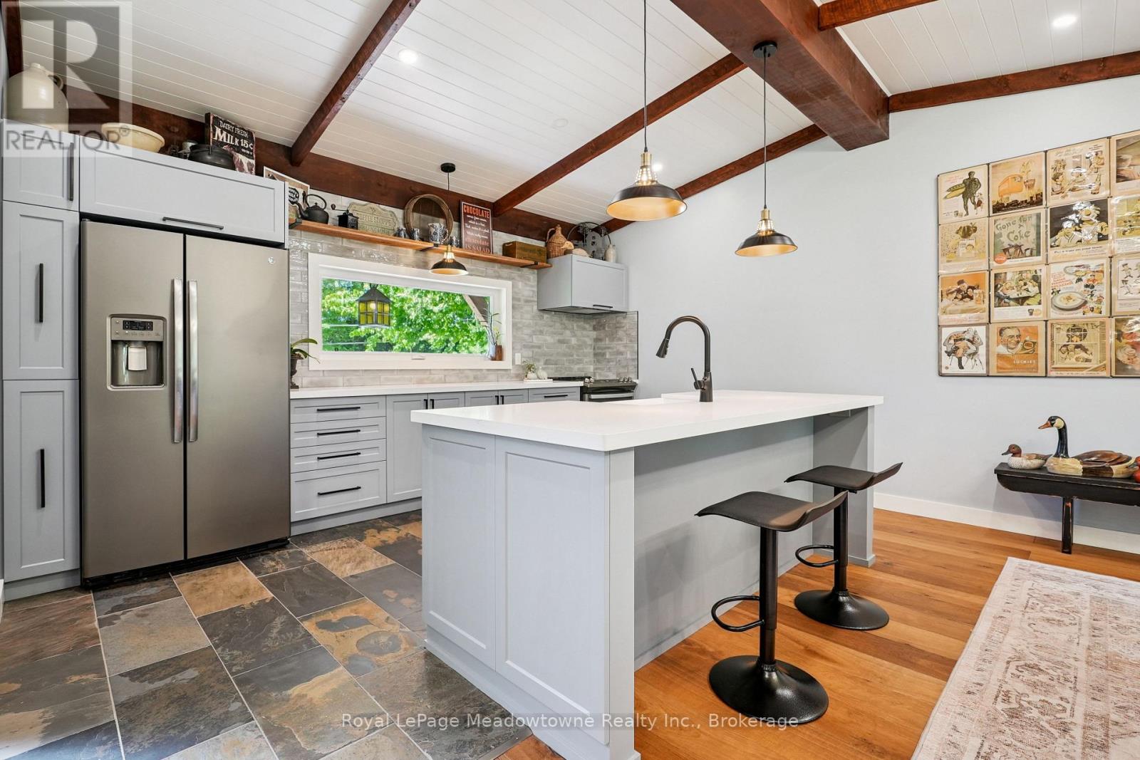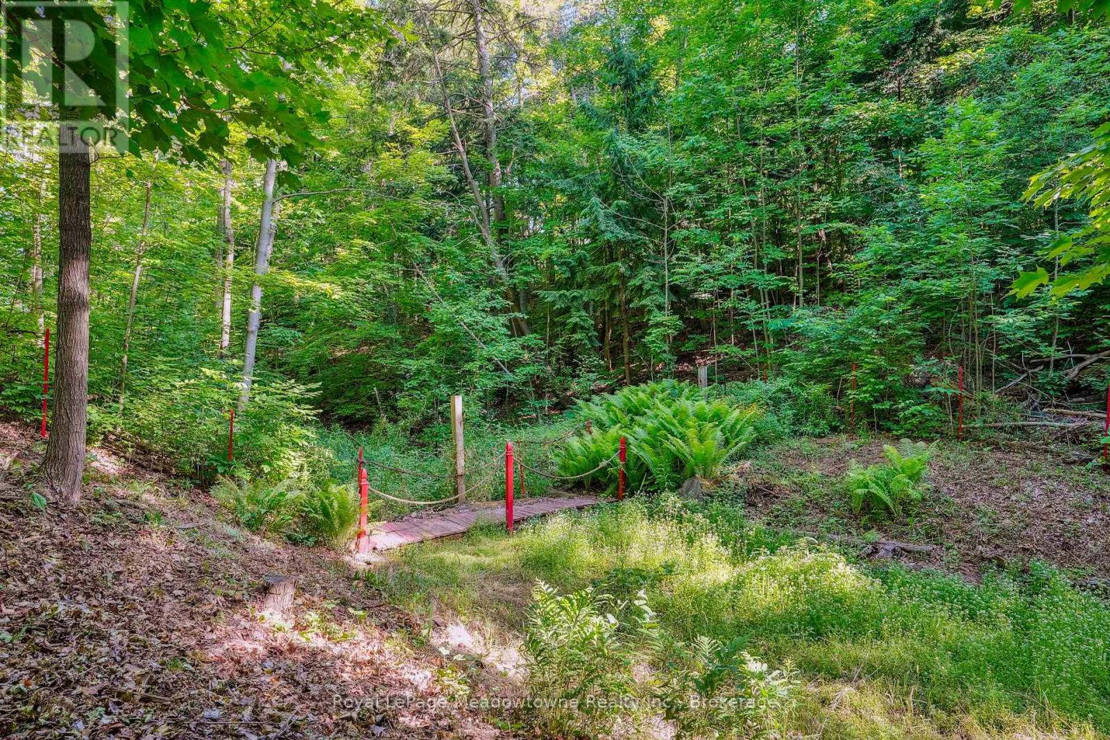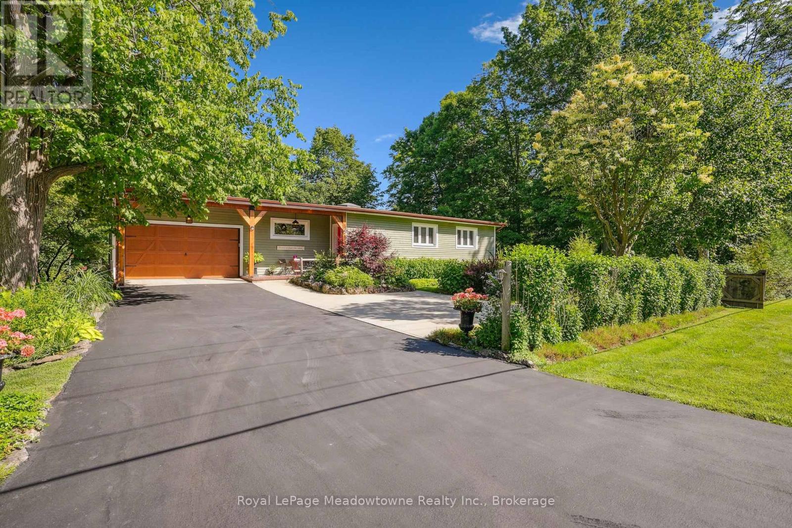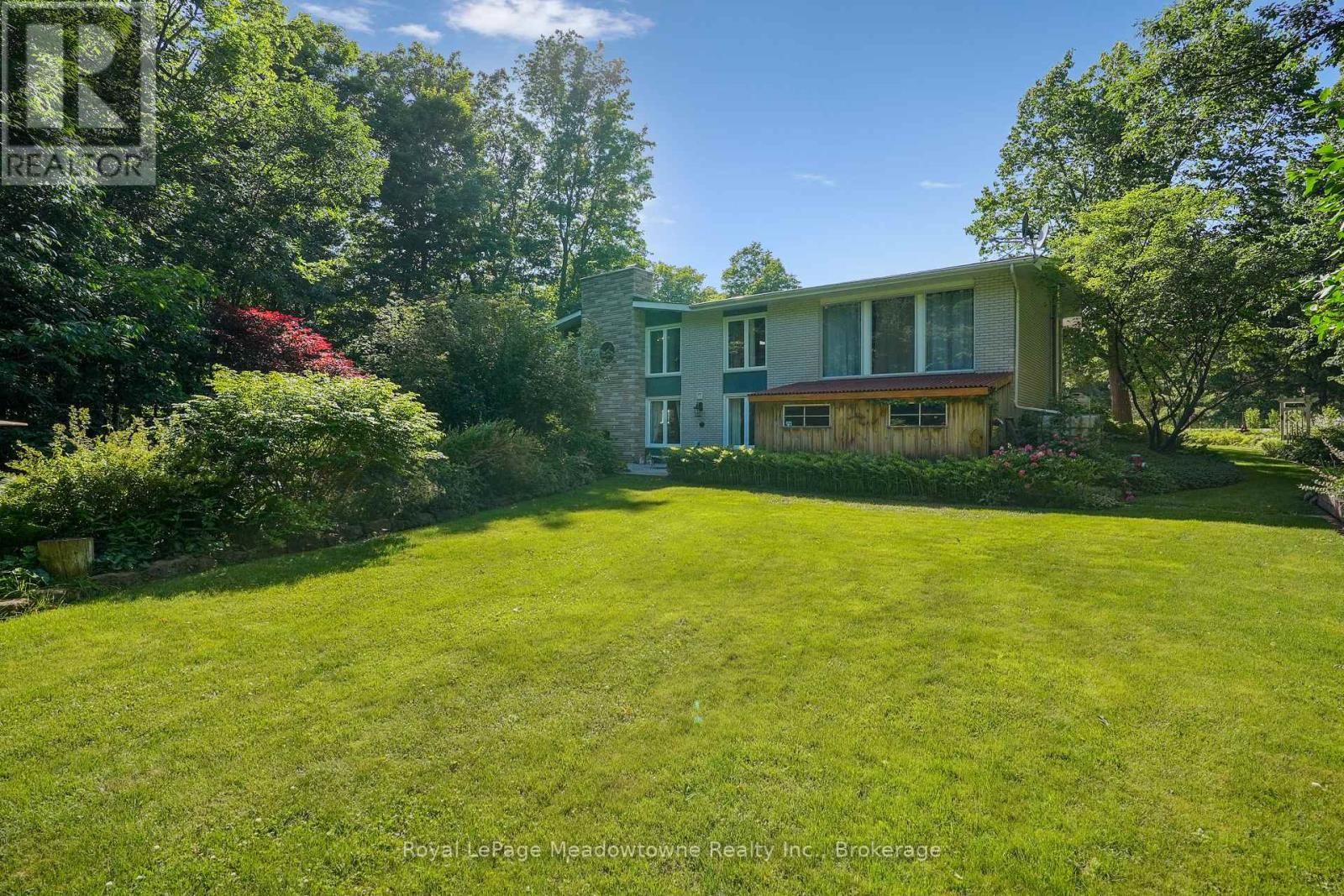 Escape the City; Embrace Country Living. Sitting proudly on a peaceful country road in East Speyside, just minutes north of Milton, this beautifully renovated country retreat invites you to slow down and enjoy the good life. Set on a pristine, park-like acre backing onto a serene ravine, this 3-bedroom raised bungalow is a gardeners dream and a hobbyists haven. Step inside to a fully renovated open-concept main floor with a sun-filled kitchen, vaulted ceilings, and a cozy propane fireplace in the living room. Enjoy sweeping views of lush perennial gardens from every window. The walkout lower level adds incredible versatility with a second kitchen, rec room warmed by a wood fireplace, a spacious laundry/sewing room, guest bedroom, and 3-piece bath. Outside, you'll fall in love with the maple forest, tranquil trails, fire pit, and storybook bridge over a gentle stream. A breathtaking wisteria-covered pergola creates the perfect backdrop for summer evenings, while a workshop is ready for your creative projects. With great schools, nearby hiking, and an easy commute to the city, this is the countryside escape you've been waiting for. Properties like this are rarely offered don't miss your chance to make it yours. (id:50787)