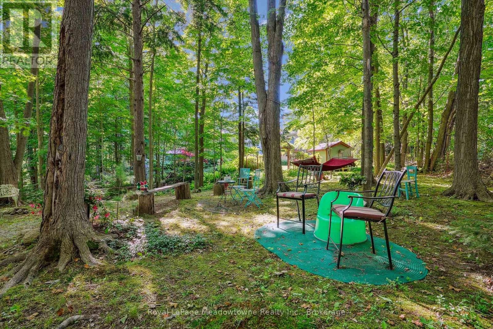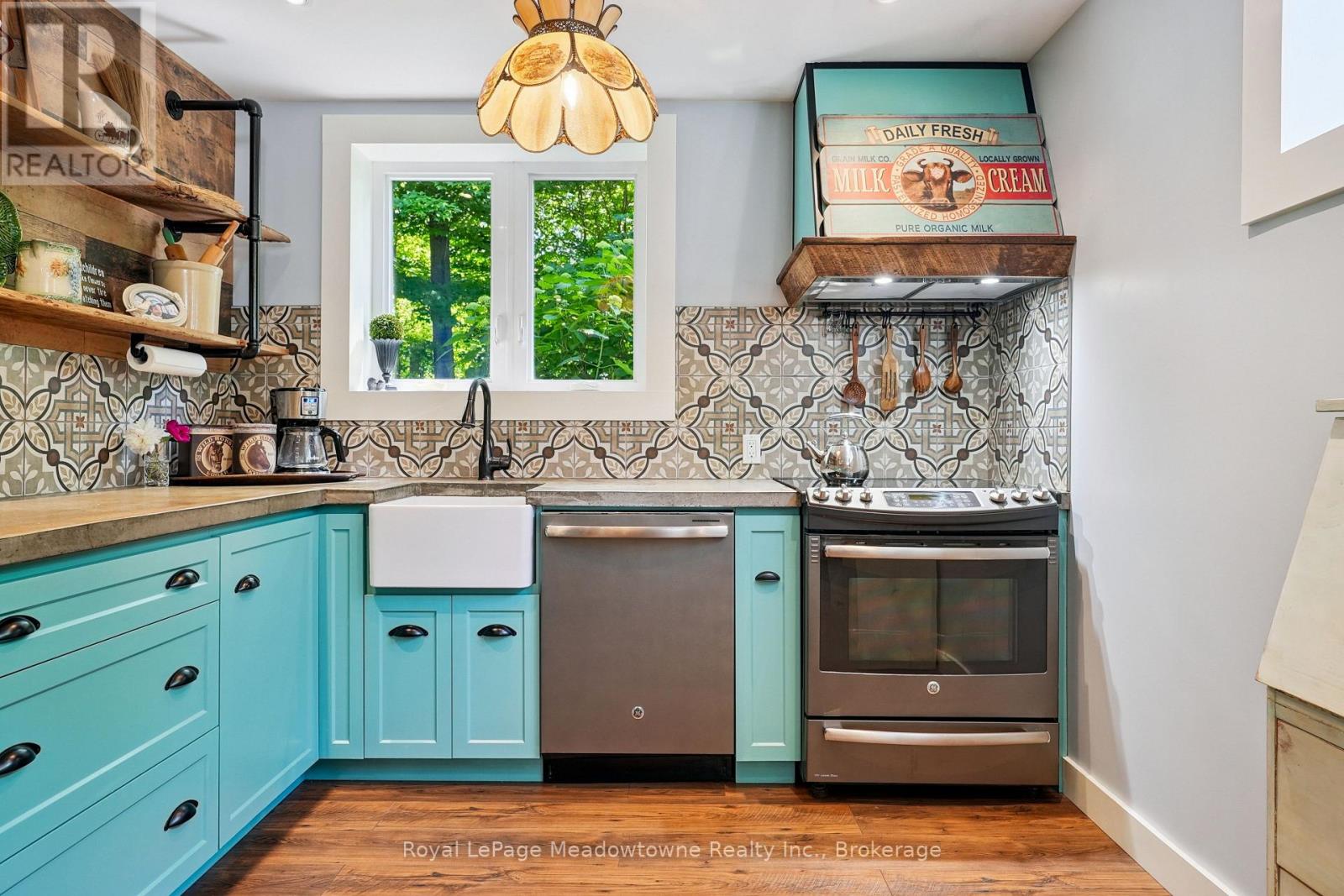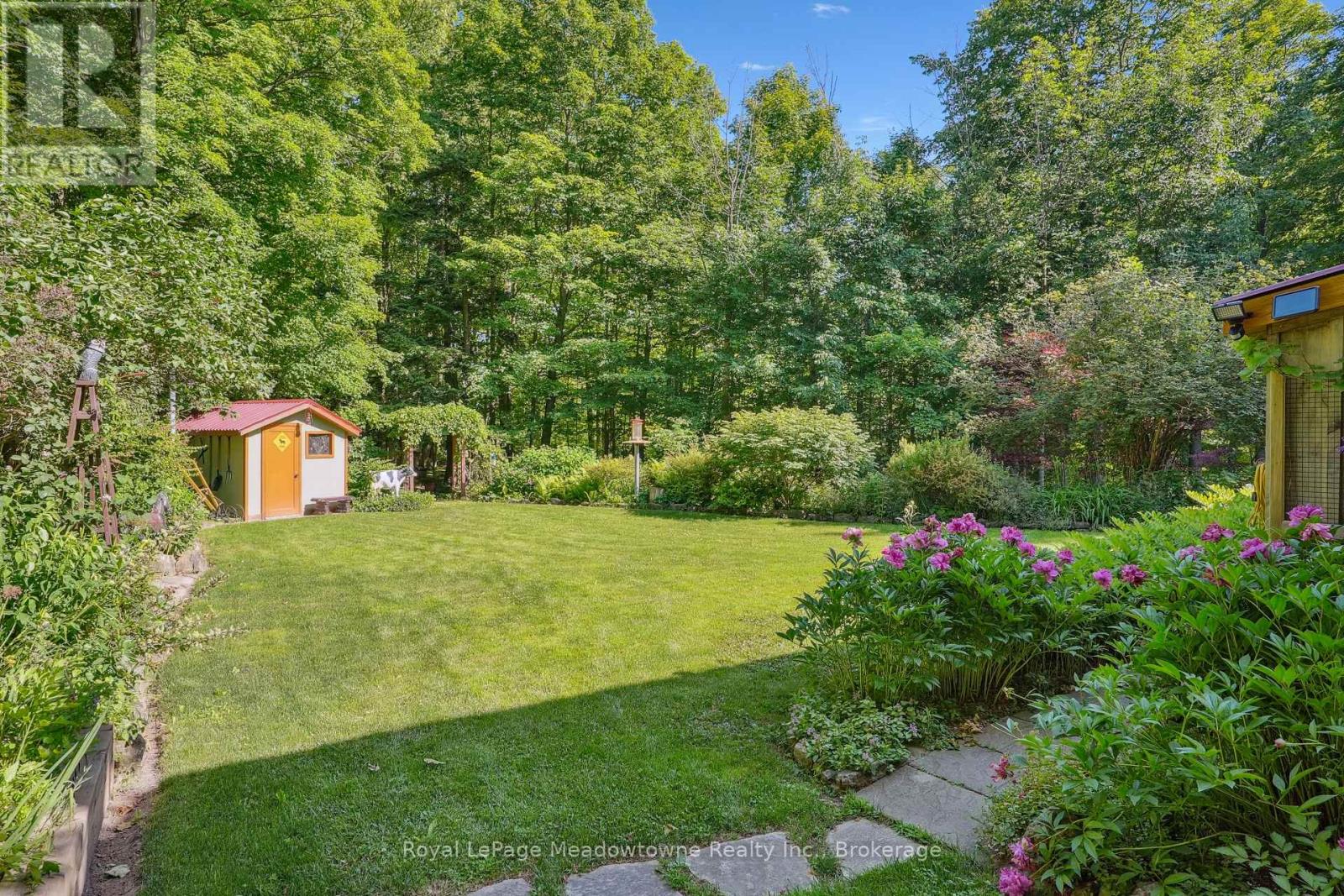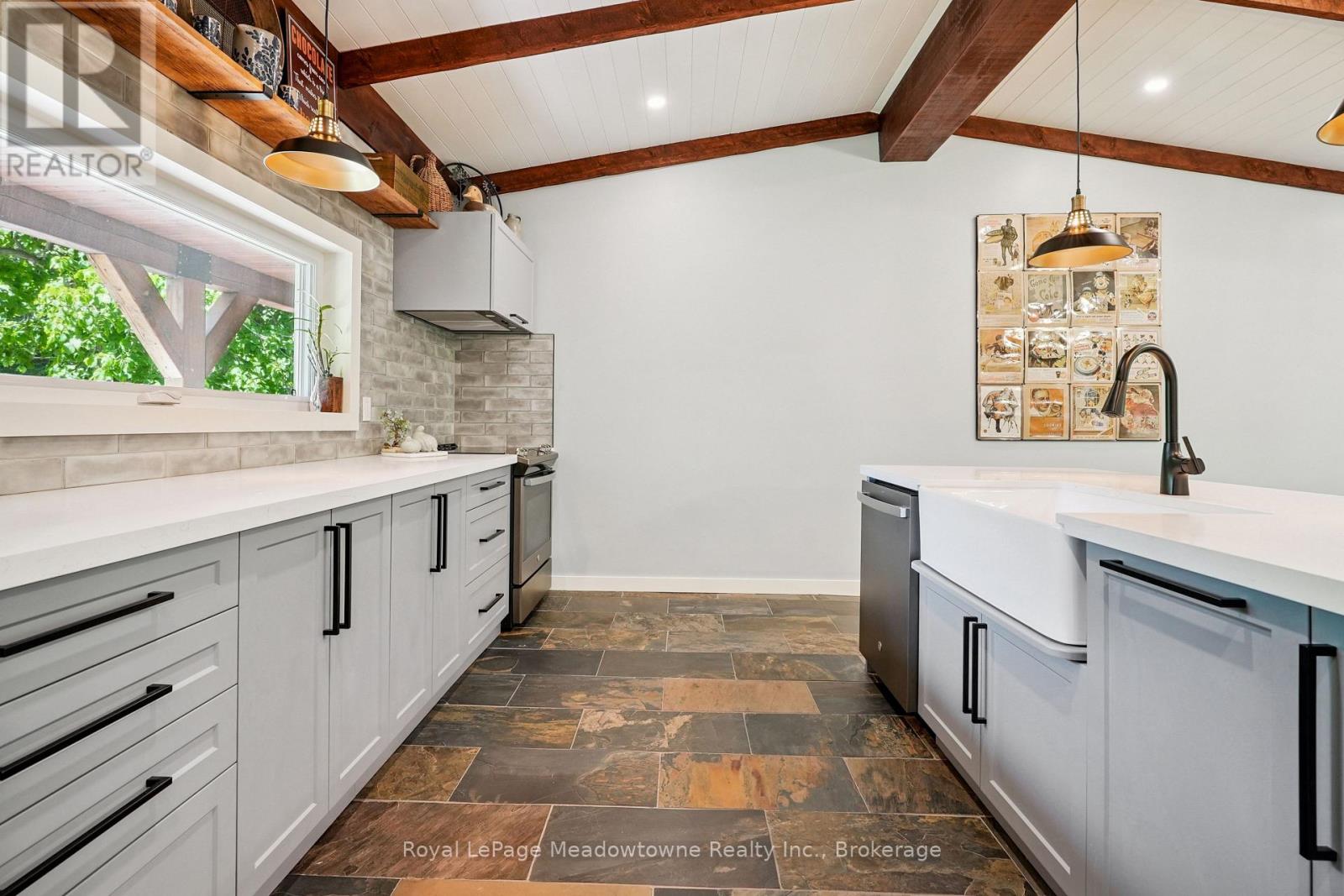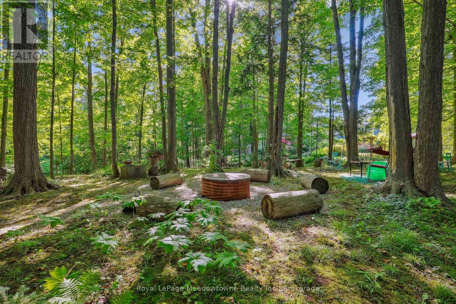 Escape the City; Embrace Country Living. Sitting proudly on a peaceful country road in East Speyside, just minutes north of Milton, this beautifully renovated country retreat invites you to slow down and enjoy the good life. Set on a pristine, park-like acre backing onto a serene ravine, this 3-bedroom raised bungalow is a gardeners dream and a hobbyists haven. Step inside to a fully renovated open-concept main floor with a sun-filled kitchen, vaulted ceilings, and a cozy propane fireplace in the living room. Enjoy sweeping views of lush perennial gardens from every window. The walkout lower level adds incredible versatility with a second kitchen, rec room warmed by a wood fireplace, a spacious laundry/sewing room, guest bedroom, and 3-piece bath. Outside, you'll fall in love with the maple forest, tranquil trails, fire pit, and storybook bridge over a gentle stream. A breathtaking wisteria-covered pergola creates the perfect backdrop for summer evenings, while a workshop is ready for your creative projects. With great schools, nearby hiking, and an easy commute to the city, this is the countryside escape you've been waiting for. Properties like this are rarely offered don't miss your chance to make it yours. (id:50787)