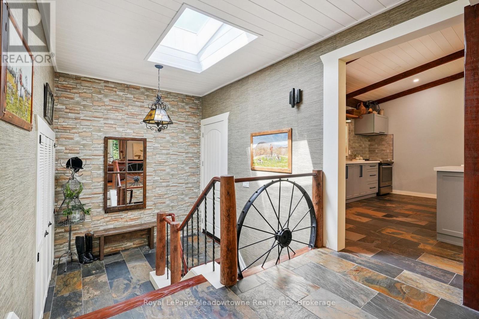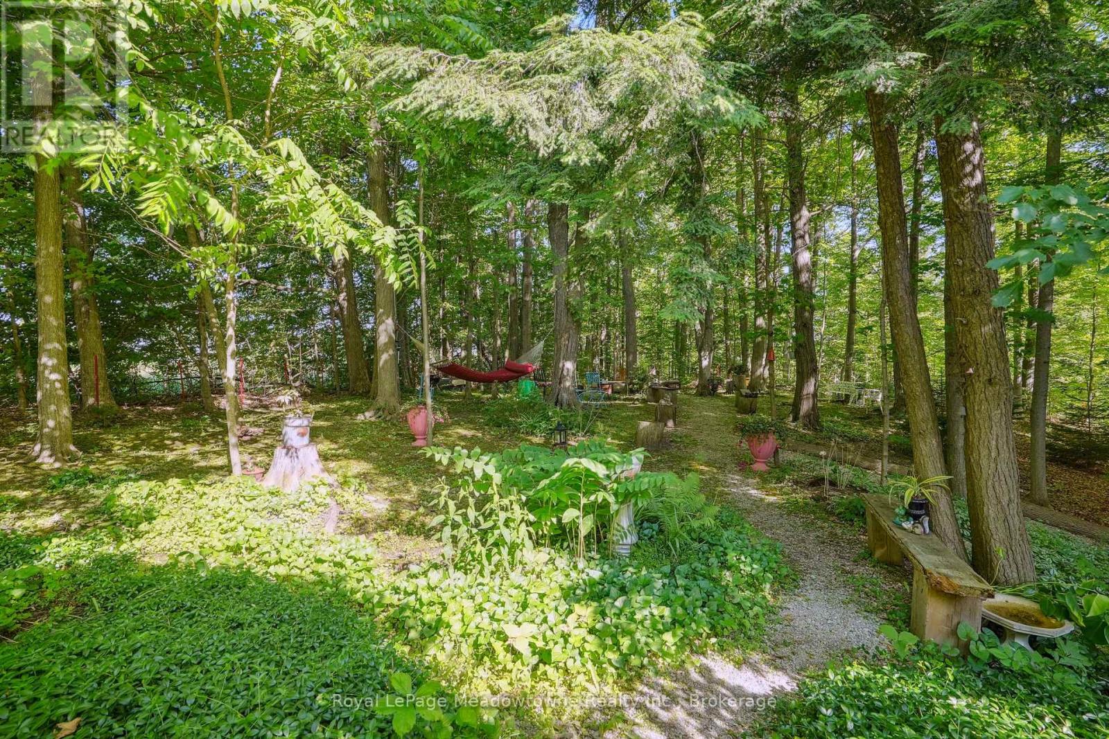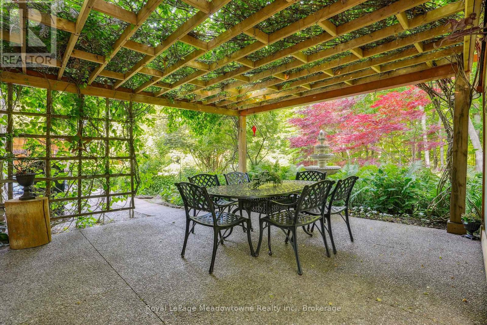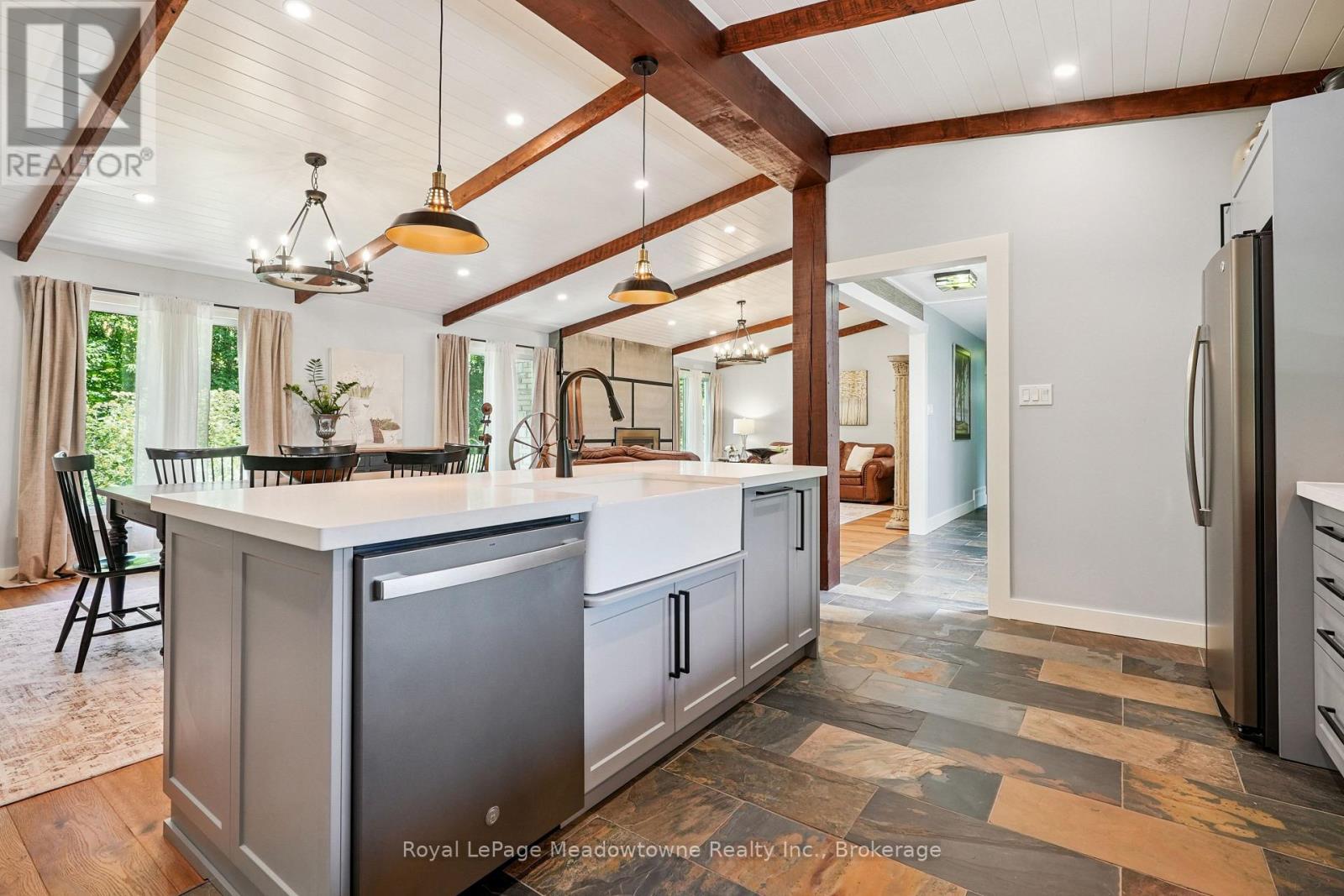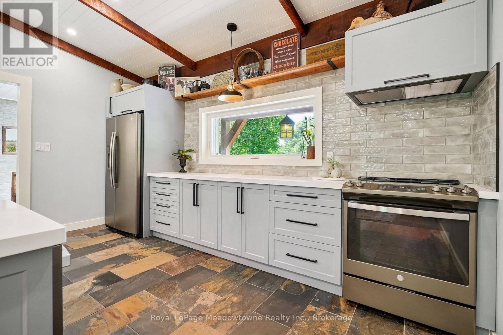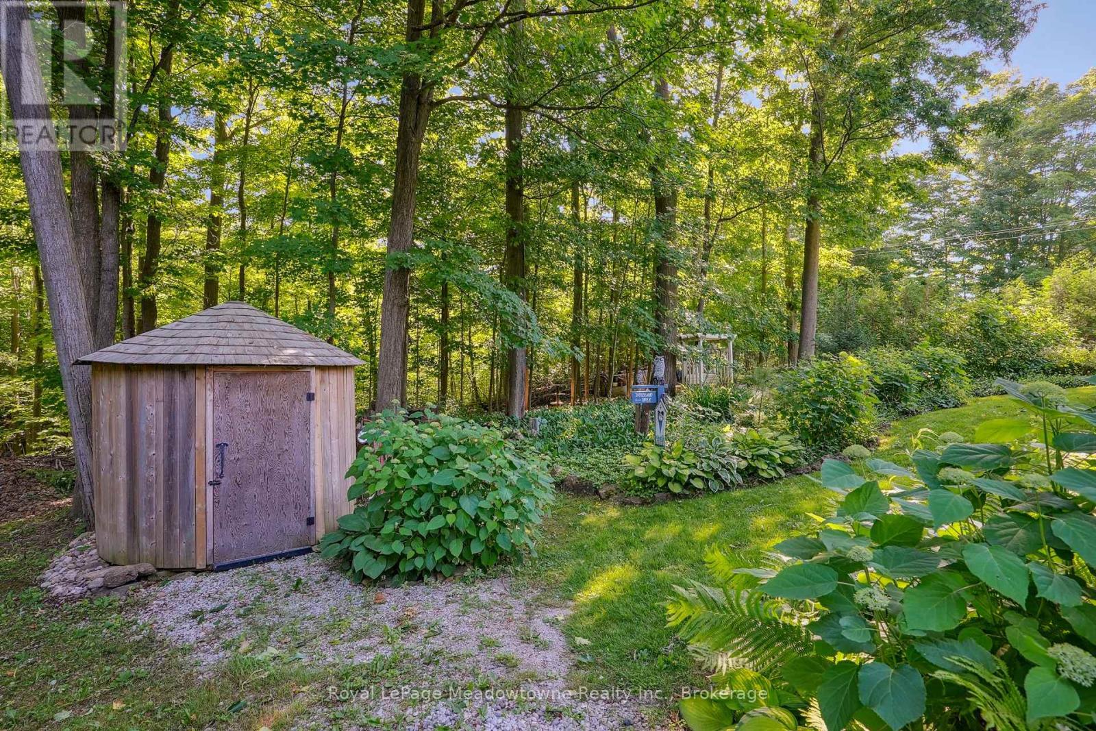 Escape the City; Embrace Country Living. Sitting proudly on a peaceful country road in East Speyside, just minutes north of Milton, this beautifully renovated country retreat invites you to slow down and enjoy the good life. Set on a pristine, park-like acre backing onto a serene ravine, this 3-bedroom raised bungalow is a gardeners dream and a hobbyists haven. Step inside to a fully renovated open-concept main floor with a sun-filled kitchen, vaulted ceilings, and a cozy propane fireplace in the living room. Enjoy sweeping views of lush perennial gardens from every window. The walkout lower level adds incredible versatility with a second kitchen, rec room warmed by a wood fireplace, a spacious laundry/sewing room, guest bedroom, and 3-piece bath. Outside, you'll fall in love with the maple forest, tranquil trails, fire pit, and storybook bridge over a gentle stream. A breathtaking wisteria-covered pergola creates the perfect backdrop for summer evenings, while a workshop is ready for your creative projects. With great schools, nearby hiking, and an easy commute to the city, this is the countryside escape you've been waiting for. Properties like this are rarely offered don't miss your chance to make it yours. (id:50787)