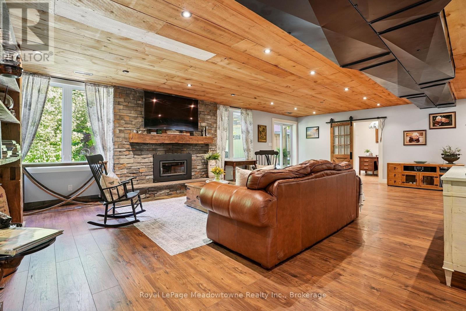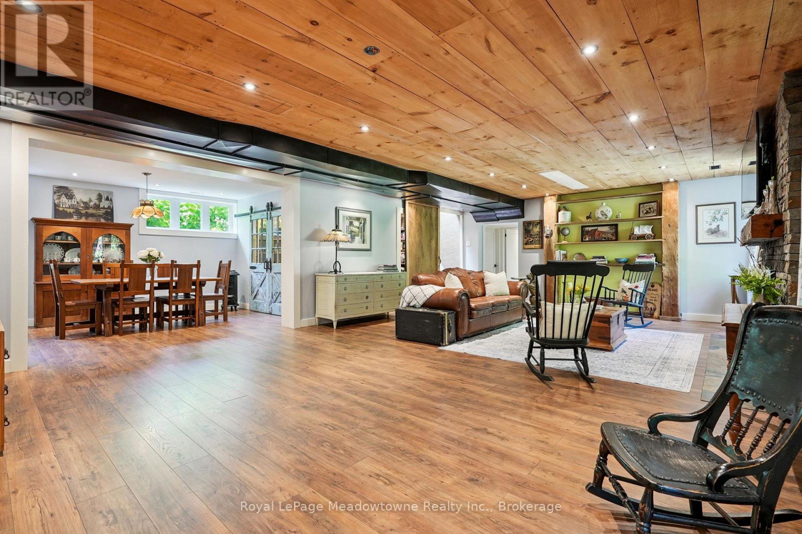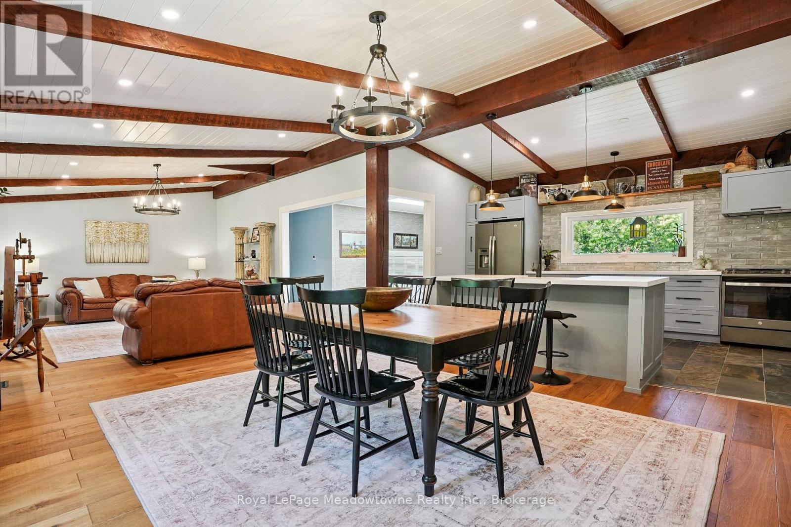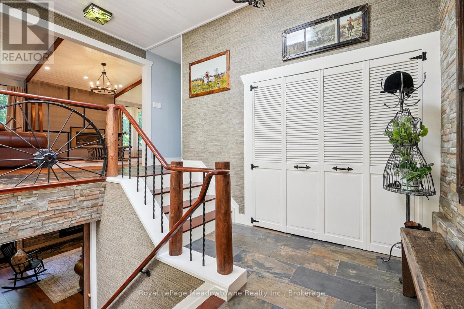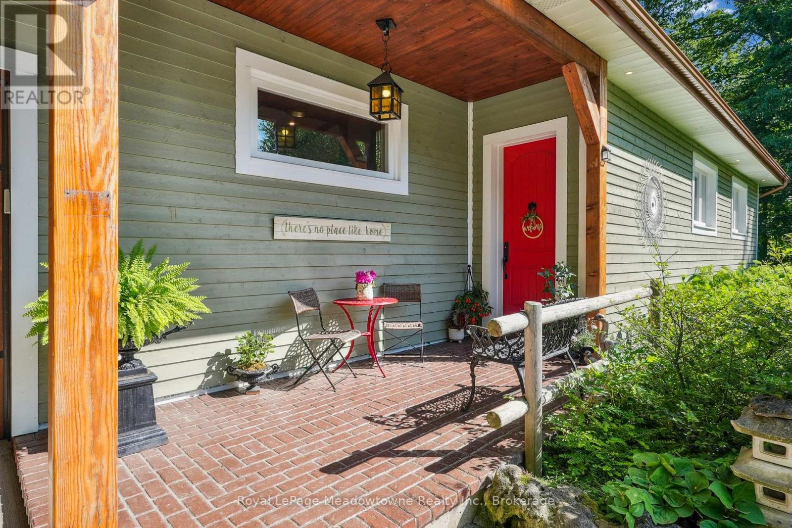 Escape the City; Embrace Country Living. Sitting proudly on a peaceful country road in East Speyside, just minutes north of Milton, this beautifully renovated country retreat invites you to slow down and enjoy the good life. Set on a pristine, park-like acre backing onto a serene ravine, this 3-bedroom raised bungalow is a gardeners dream and a hobbyists haven. Step inside to a fully renovated open-concept main floor with a sun-filled kitchen, vaulted ceilings, and a cozy propane fireplace in the living room. Enjoy sweeping views of lush perennial gardens from every window. The walkout lower level adds incredible versatility with a second kitchen, rec room warmed by a wood fireplace, a spacious laundry/sewing room, guest bedroom, and 3-piece bath. Outside, you'll fall in love with the maple forest, tranquil trails, fire pit, and storybook bridge over a gentle stream. A breathtaking wisteria-covered pergola creates the perfect backdrop for summer evenings, while a workshop is ready for your creative projects. With great schools, nearby hiking, and an easy commute to the city, this is the countryside escape you've been waiting for. Properties like this are rarely offered don't miss your chance to make it yours. (id:50787)