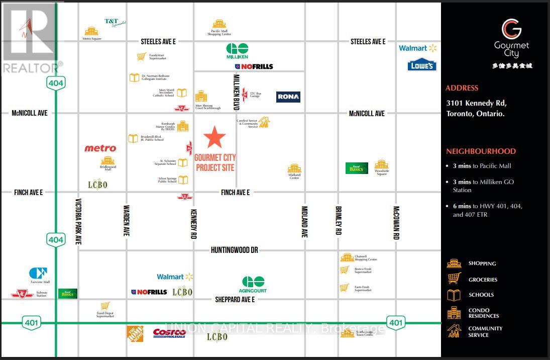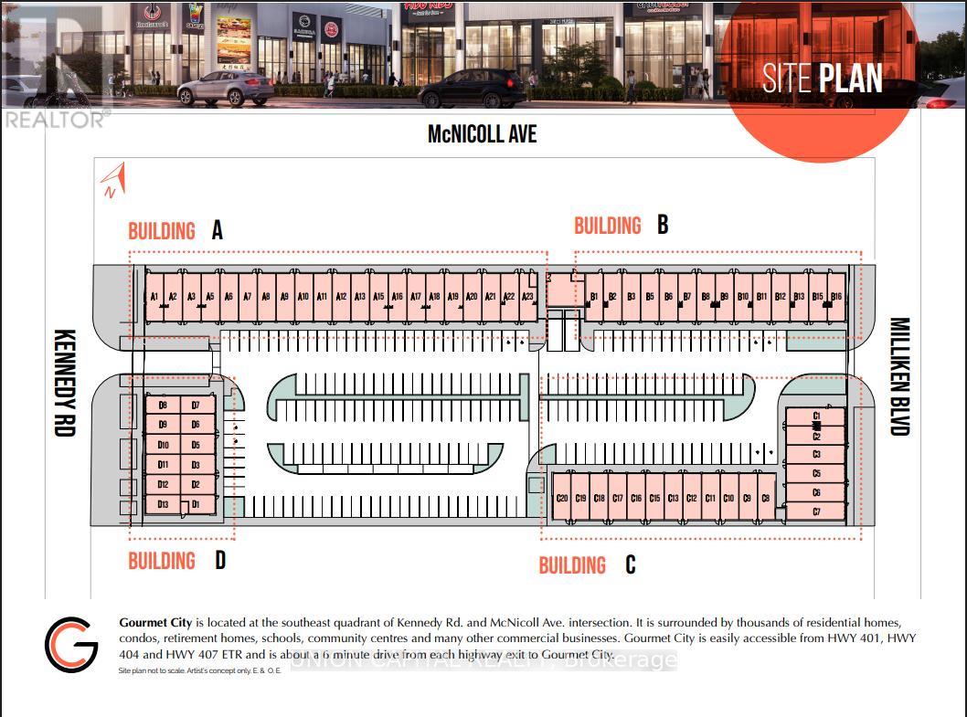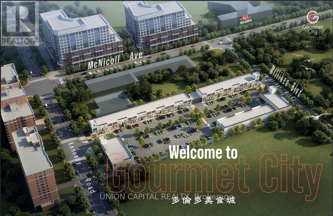 Gourmet City Commercial Condos offers an exciting opportunity to own a brand-new commercial space in one of Scarborough's busiest and fastest-growing areas. Conveniently located at the southeast corner of Kennedy Rd and McNicoll Ave, this high-traffic plaza has great visibility and easy access from both Kennedy Rd and Milliken Blvd. This unit features soaring 20-foot ceilings and a mezzanine in raw condition-perfect for customizing the space to fit your business needs. Built by H & H Group, the development features modern design and high-quality finishes throughout. Whether you're opening a café, bubble tea shop, bakery, medical or dental office, or retail store, this space is zoned for a variety of uses and ideal for serving Scarborough's diverse community. Just minutes from Highways 404 and 407, it's a prime location for growing your business in a vibrant, well-connected area. (id:50787)