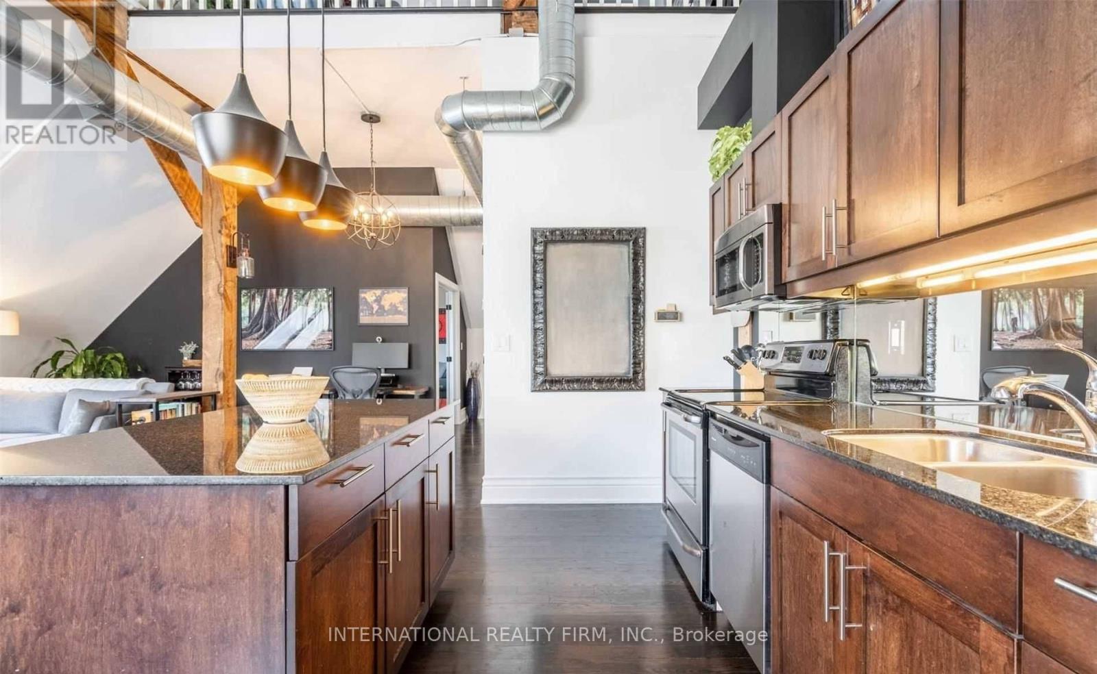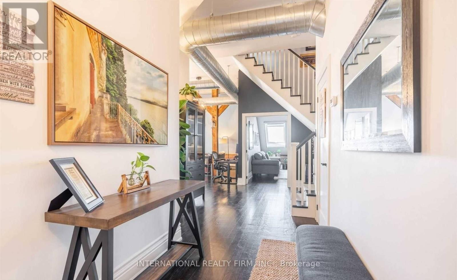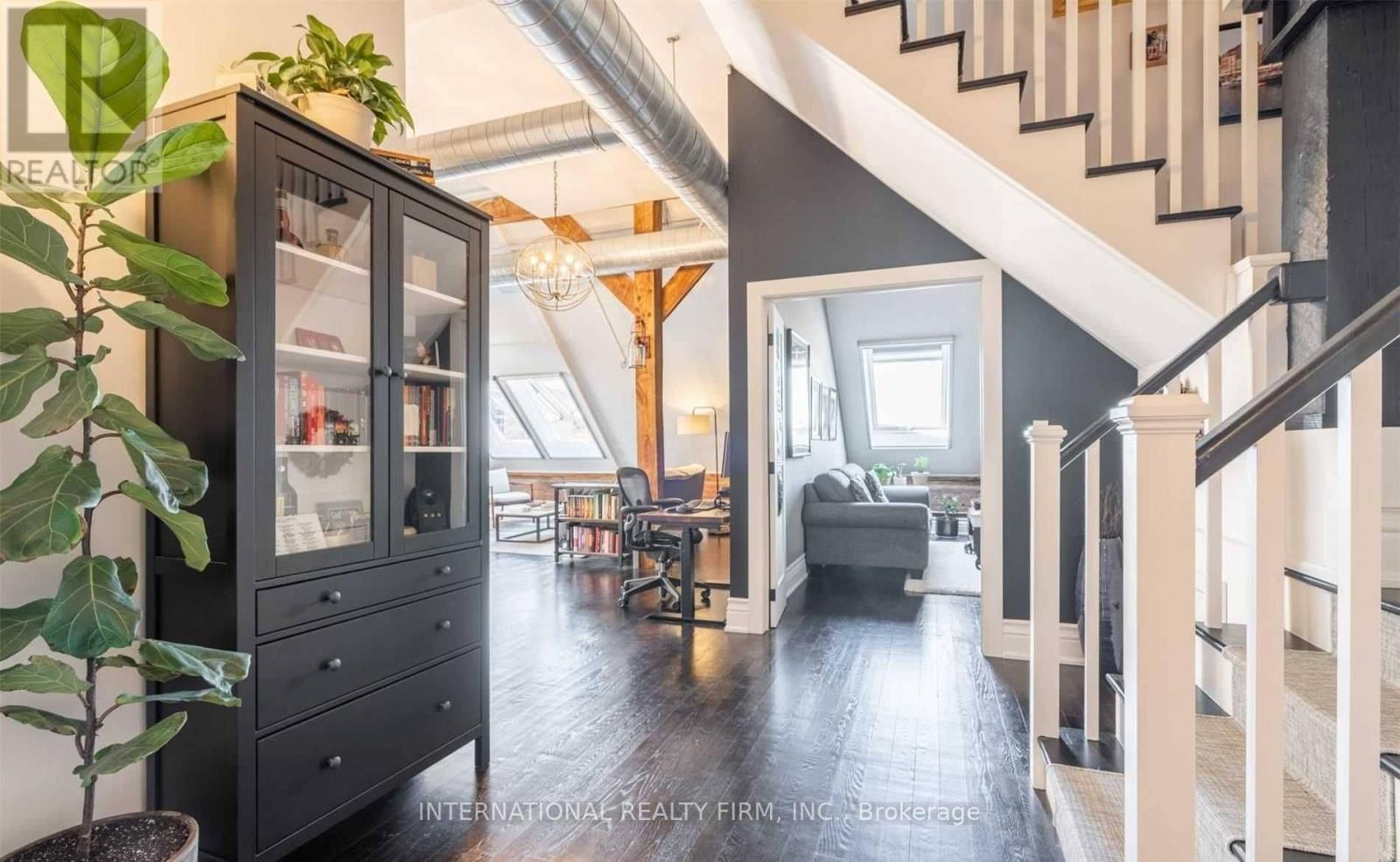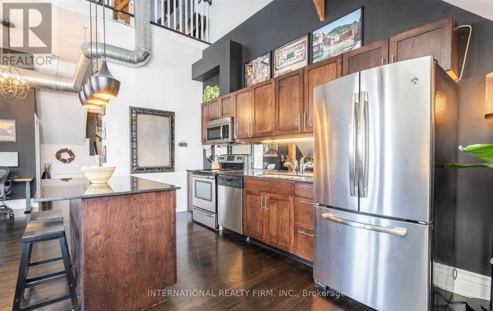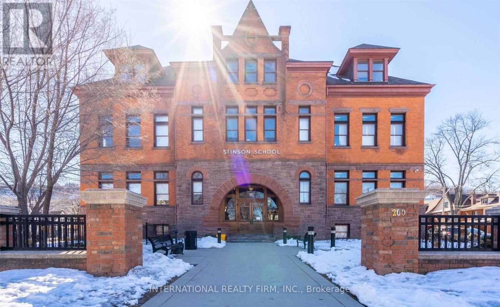 Experience the drama of true hard-loft living in PH16 at the iconic Stinson School. This isn't just a condo; it is 1,688 sq ft of architectural history. You are immediately greeted by soaring 20-foot ceilings, original exposed brick, and massive skylights that flood the space with natural light. The main floor is an entertainer's dream with rustic timber beams and warm hardwood floors. Upstairs, the layout separates "living" from "resting" with a dedicated executive den featuring a cozy fireplace-perfect for a home office. The primary retreat offers a massive walk-in closet and a spa-inspired 5pc ensuite. South-west facing, you get breathtaking sunset views over the Escarpment and city skyline. Walkable to the GO Centre and hospitals. This is a trophy property-don't miss it. (id:50787)