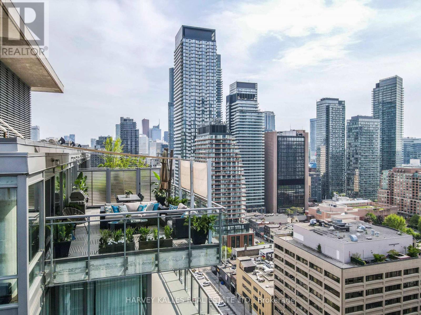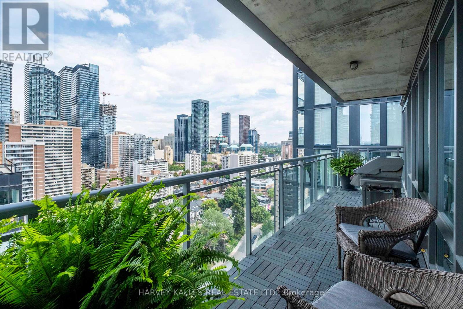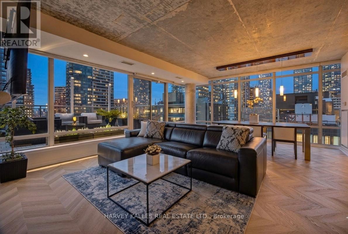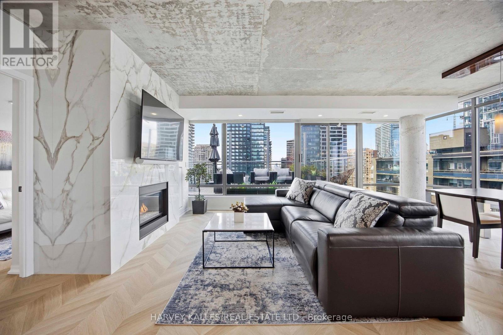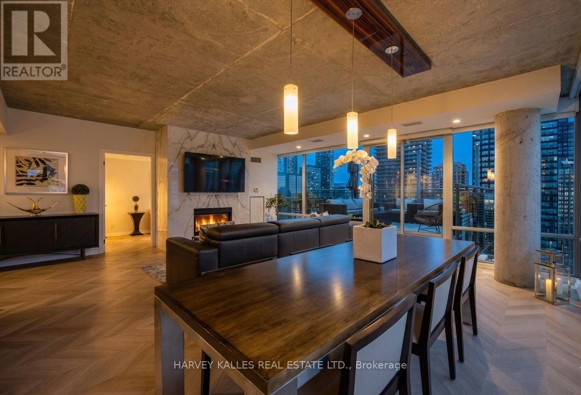 Elevated above the city on a penthouse level shared by just two residences, this extraordinary suite delivers a true sense of exclusivity and sophistication in the heart of downtown. Spanning over 1,600 sq ft indoors and complemented by more than 500 sq ft of private outdoor spaces. Every detail has been thoughtfully curated, with over $200K in high-end upgrades throughout: brand new luxury herringbone flooring, a completely rebuilt designer kitchen, updated lighting and pot lights, and a striking fireplace feature wall clad in Italian porcelain. The expansive sundeck terrace is a true showpiece, designed to function as an extension of the home. Featuring custom sunshades for comfort and privacy, composite decking, bbq w/ gas line & a water connection for gardening, creating a rare, fully equipped outdoor retreat in the sky. Expansive floor-to-ceiling windows frame captivating skyline views that transition beautifully from day to night. The open-concept living and dining area is perfect for hosting intimate dinners and larger gatherings. The stunning, fully reimagined kitchen blends style and function, clad in Clovelly quartz, with premium smart AI/Wifi appliances, two breakfast bars, and a walkout to a separate balcony with a gas line & bbq for seamless indoor-outdoor living. The primary bedroom is its own retreat, complete with access to the covered balcony, a walk-in closet, and a luxurious 5-piece ensuite. Tucked down the hall, the second bedroom enjoys easy access to a stylish 4-piece bath. A separate third bedroom, complete with a walk-in closet/storage room, offers exceptional flexibility ideal for guests, a home office, or growing needs. Premium parking space near the elevator with double bike rack. 2 side-by-side lockers. Courteous concierge, a gym with sauna and outdoor hot tub. Line 1 Subway service at your door and minutes from the Financial District, U of T, TMU, Eaton Centre, and Yorkville. This is where luxury, lifestyle, and location come together. (id:50787)