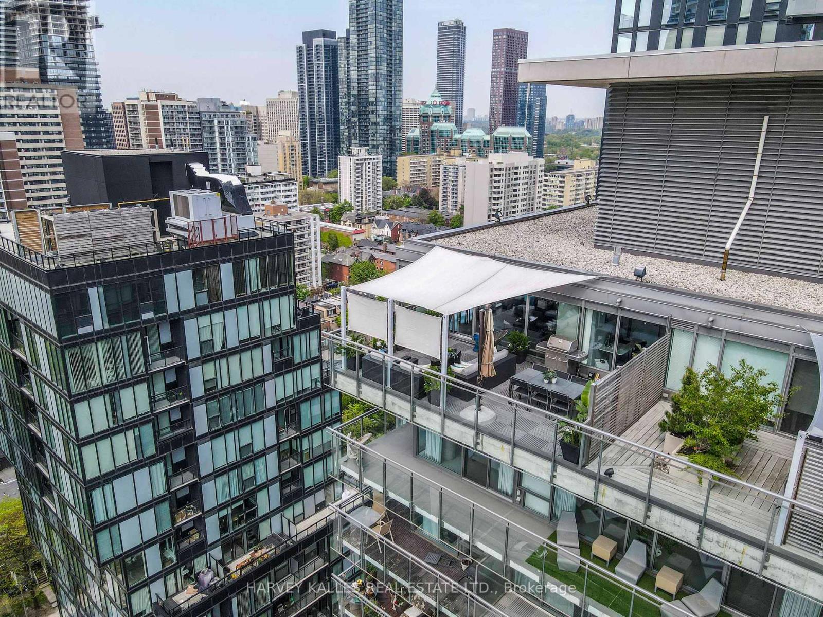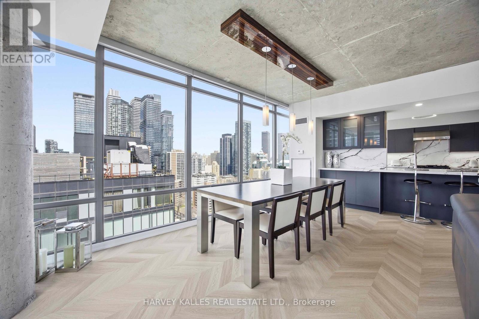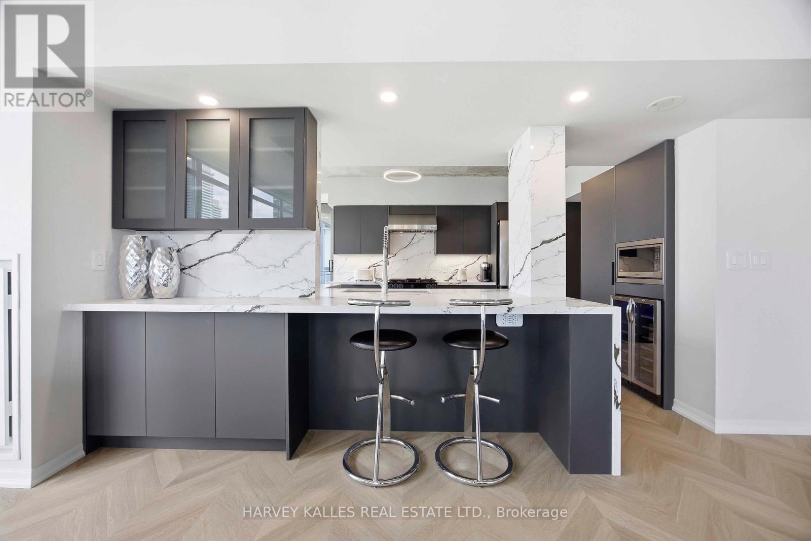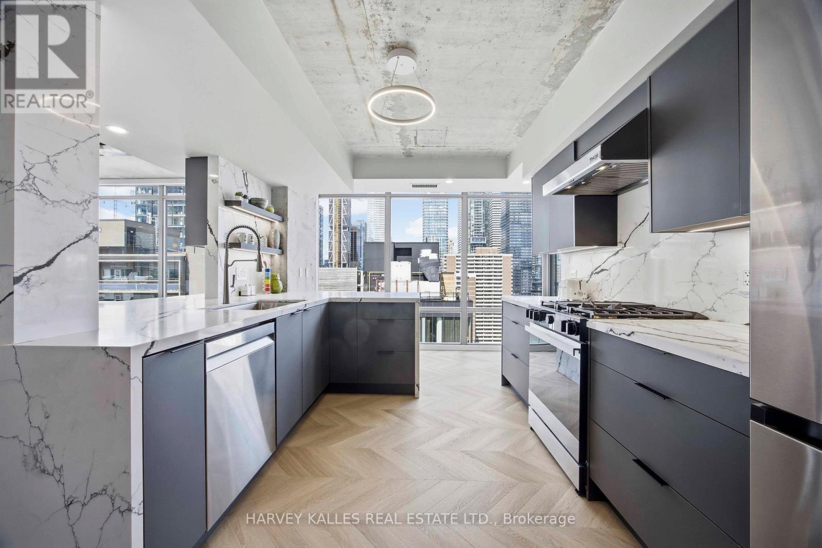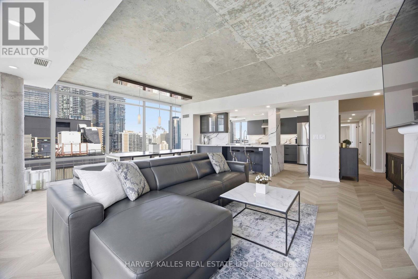 Elevated above the city on a penthouse level shared by just two residences, this extraordinary suite delivers a true sense of exclusivity and sophistication in the heart of downtown. Spanning over 1,600 sq ft indoors and complemented by more than 500 sq ft of private outdoor spaces. Every detail has been thoughtfully curated, with over $200K in high-end upgrades throughout: brand new luxury herringbone flooring, a completely rebuilt designer kitchen, updated lighting and pot lights, and a striking fireplace feature wall clad in Italian porcelain. The expansive sundeck terrace is a true showpiece, designed to function as an extension of the home. Featuring custom sunshades for comfort and privacy, composite decking, bbq w/ gas line & a water connection for gardening, creating a rare, fully equipped outdoor retreat in the sky. Expansive floor-to-ceiling windows frame captivating skyline views that transition beautifully from day to night. The open-concept living and dining area is perfect for hosting intimate dinners and larger gatherings. The stunning, fully reimagined kitchen blends style and function, clad in Clovelly quartz, with premium smart AI/Wifi appliances, two breakfast bars, and a walkout to a separate balcony with a gas line & bbq for seamless indoor-outdoor living. The primary bedroom is its own retreat, complete with access to the covered balcony, a walk-in closet, and a luxurious 5-piece ensuite. Tucked down the hall, the second bedroom enjoys easy access to a stylish 4-piece bath. A separate third bedroom, complete with a walk-in closet/storage room, offers exceptional flexibility ideal for guests, a home office, or growing needs. Premium parking space near the elevator with double bike rack. 2 side-by-side lockers. Courteous concierge, a gym with sauna and outdoor hot tub. Line 1 Subway service at your door and minutes from the Financial District, U of T, TMU, Eaton Centre, and Yorkville. This is where luxury, lifestyle, and location come together. (id:50787)