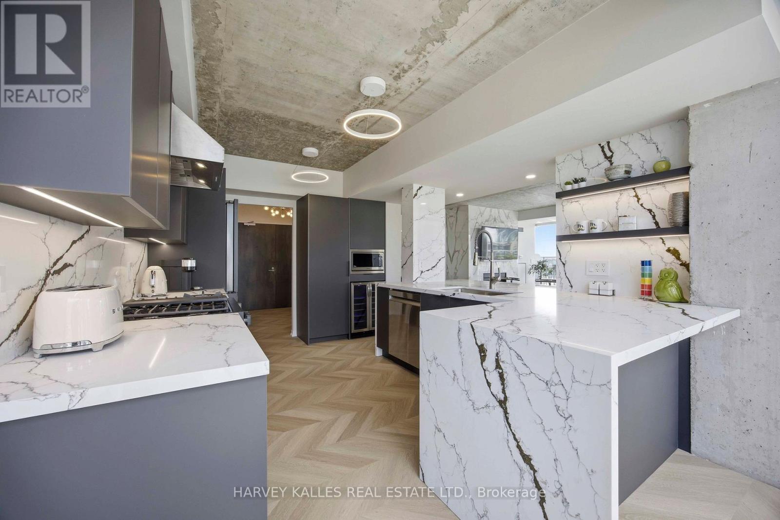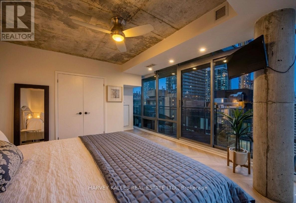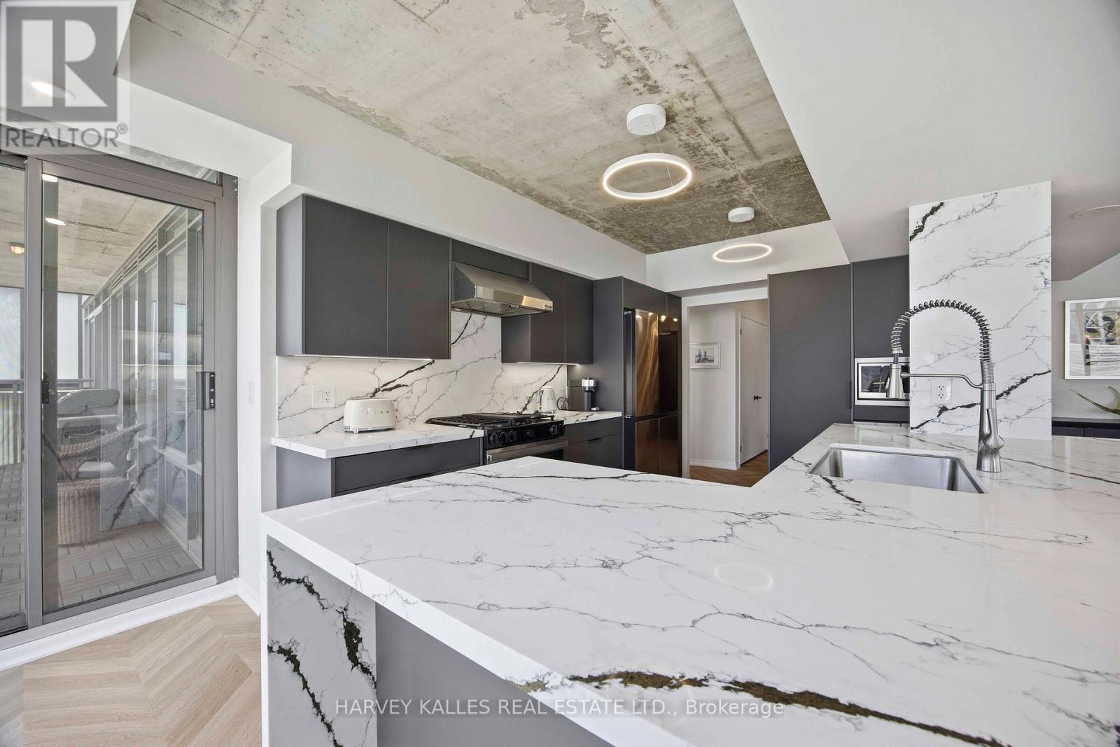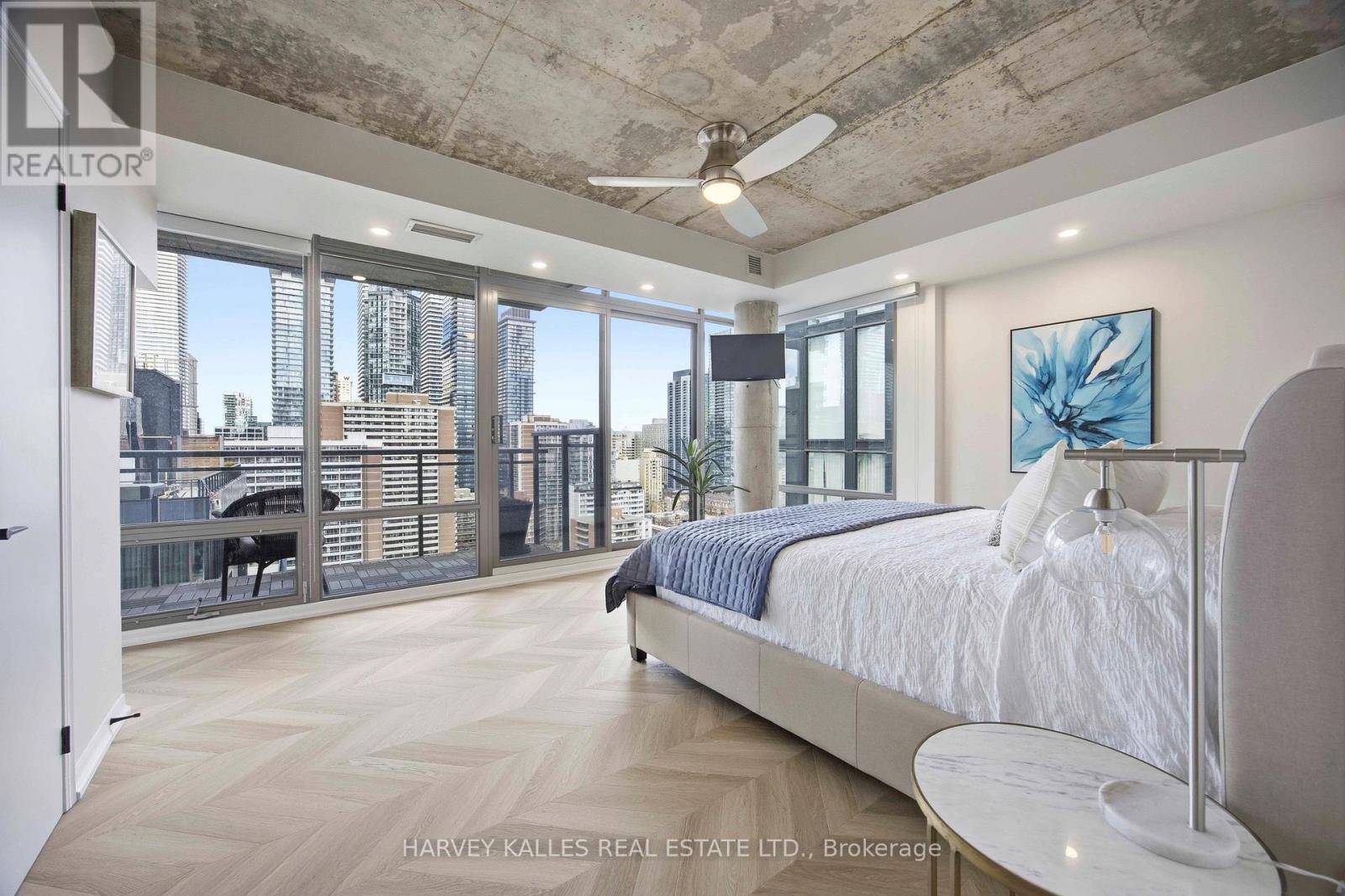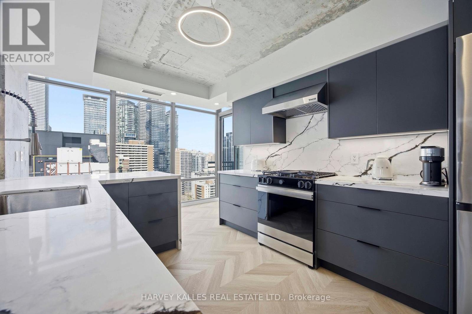 Elevated above the city on a penthouse level shared by just two residences, this extraordinary suite delivers a true sense of exclusivity and sophistication in the heart of downtown. Spanning over 1,600 sq ft indoors and complemented by more than 500 sq ft of private outdoor spaces. Every detail has been thoughtfully curated, with over $200K in high-end upgrades throughout: brand new luxury herringbone flooring, a completely rebuilt designer kitchen, updated lighting and pot lights, and a striking fireplace feature wall clad in Italian porcelain. The expansive sundeck terrace is a true showpiece, designed to function as an extension of the home. Featuring custom sunshades for comfort and privacy, composite decking, bbq w/ gas line & a water connection for gardening, creating a rare, fully equipped outdoor retreat in the sky. Expansive floor-to-ceiling windows frame captivating skyline views that transition beautifully from day to night. The open-concept living and dining area is perfect for hosting intimate dinners and larger gatherings. The stunning, fully reimagined kitchen blends style and function, clad in Clovelly quartz, with premium smart AI/Wifi appliances, two breakfast bars, and a walkout to a separate balcony with a gas line & bbq for seamless indoor-outdoor living. The primary bedroom is its own retreat, complete with access to the covered balcony, a walk-in closet, and a luxurious 5-piece ensuite. Tucked down the hall, the second bedroom enjoys easy access to a stylish 4-piece bath. A separate third bedroom, complete with a walk-in closet/storage room, offers exceptional flexibility ideal for guests, a home office, or growing needs. Premium parking space near the elevator with double bike rack. 2 side-by-side lockers. Courteous concierge, a gym with sauna and outdoor hot tub. Line 1 Subway service at your door and minutes from the Financial District, U of T, TMU, Eaton Centre, and Yorkville. This is where luxury, lifestyle, and location come together. (id:50787)